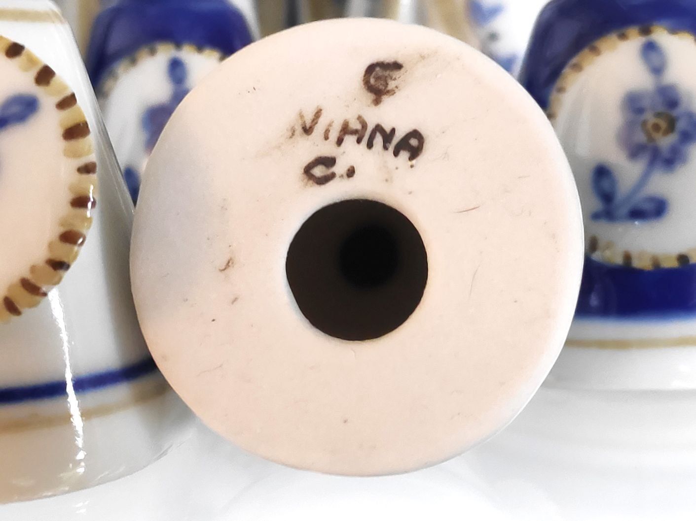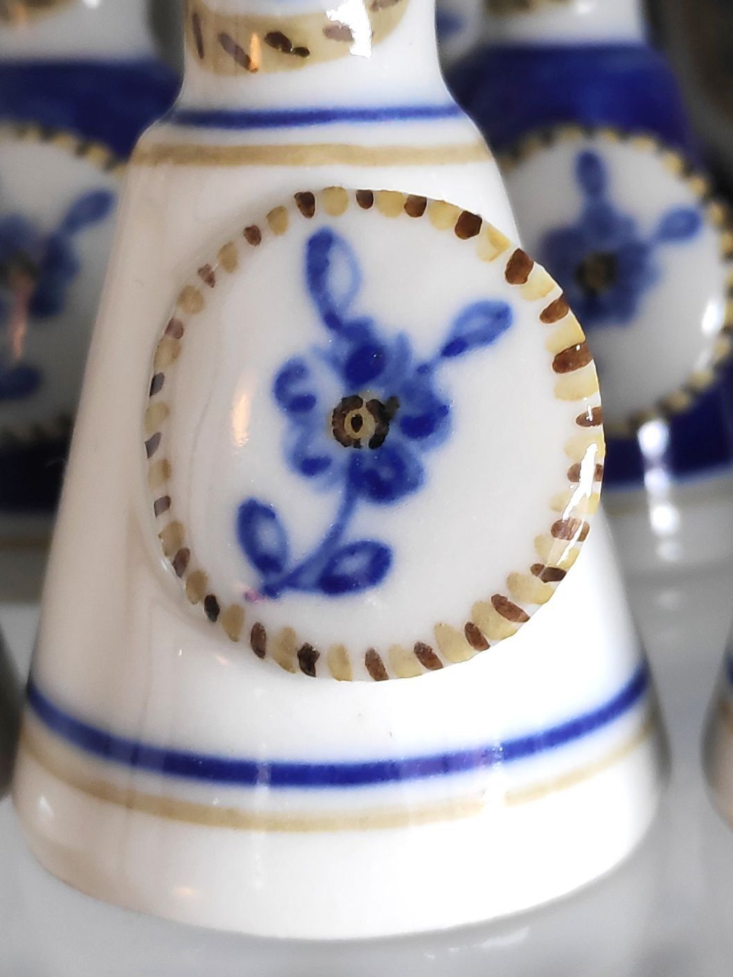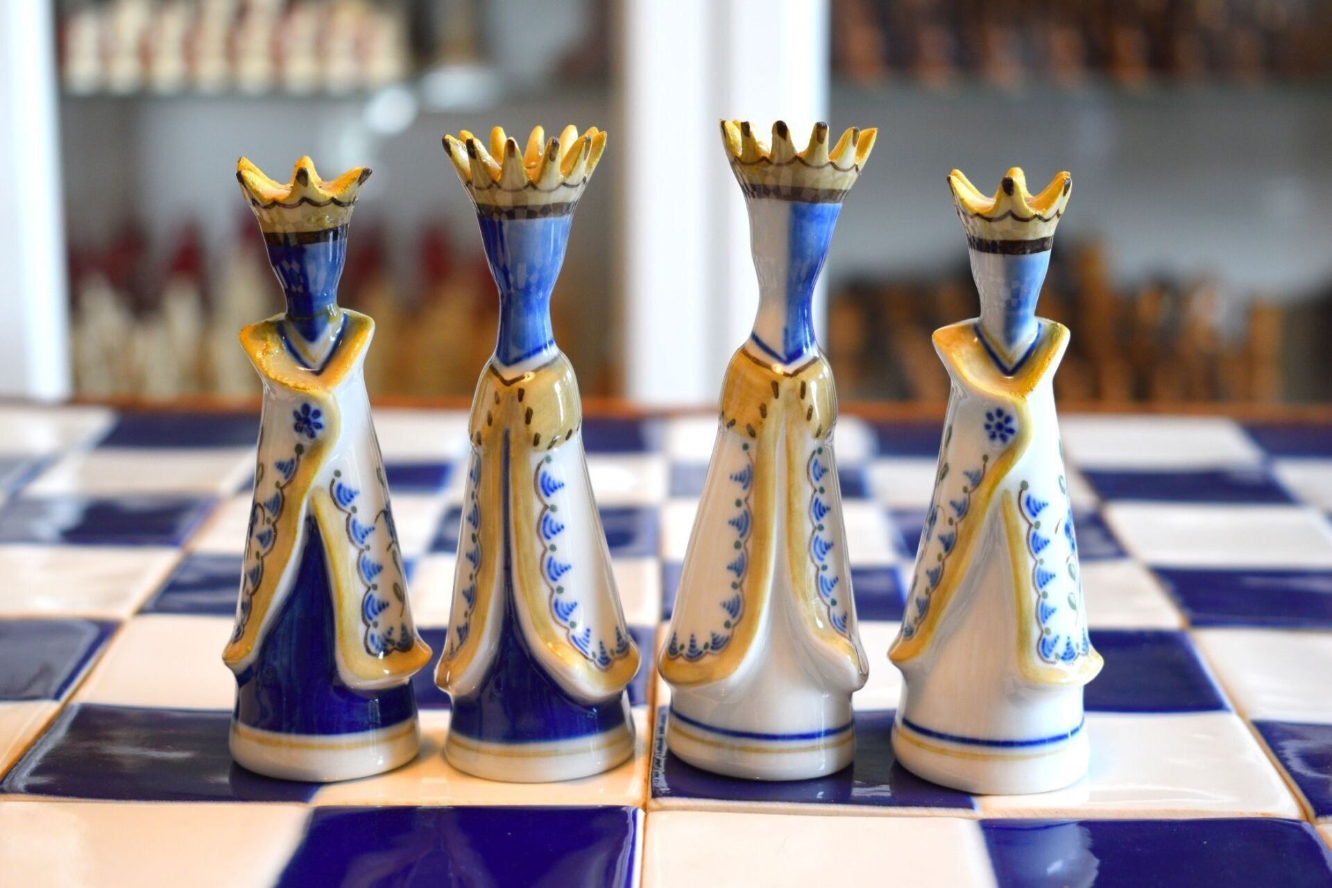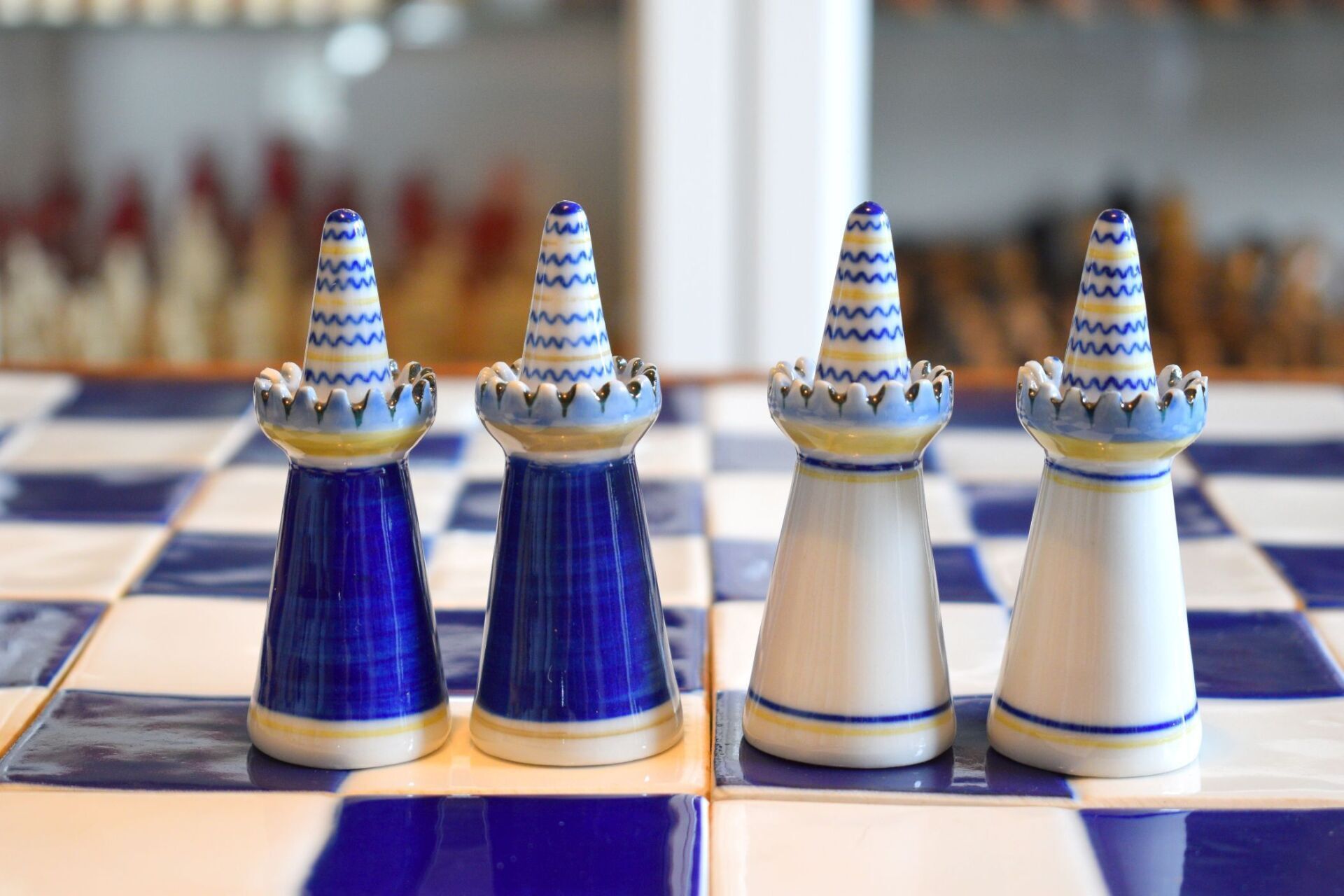 The style of the chessmen is typical for Portuguese ceramics and reminds of "azulejos", the typical Portuguese blue and white ceramic tiles (even though the name does not refer to "azul" (blue), but has its origin in the arabic "az-zulaiǧ", which means "small polished stone" or "tile work"). All pieces are handpainted in the traditional three colors that were also used for the old faience pieces from the 19th century - cobalt blue, ocher and green. Apart from a few spikes missing in the white king's crown the set is in pristine condition. The pieces are interesting as they are designed on the dividing line between abstract and concrete form. A small, but neat detail are the pawns, which are little soldiers bearing shields decorated with a blue flower, one of the three main motives in Viana porcelain (besides religious motives and coats of arms of old-established local families).