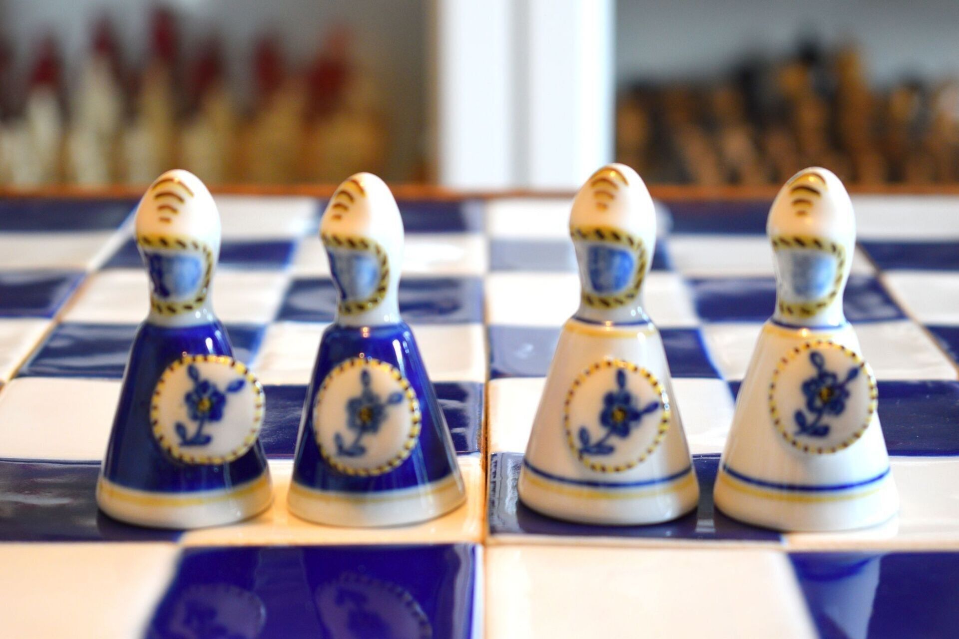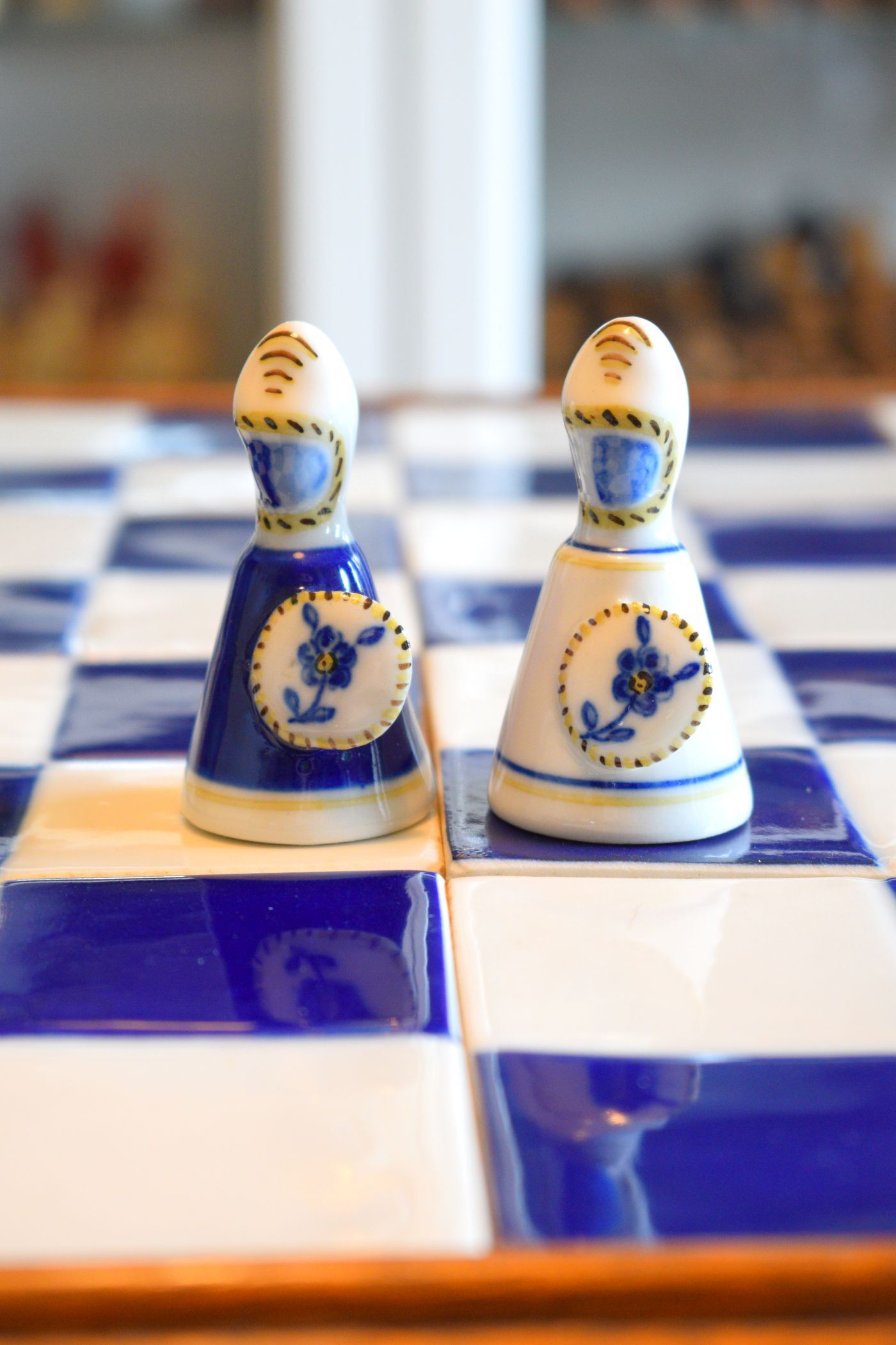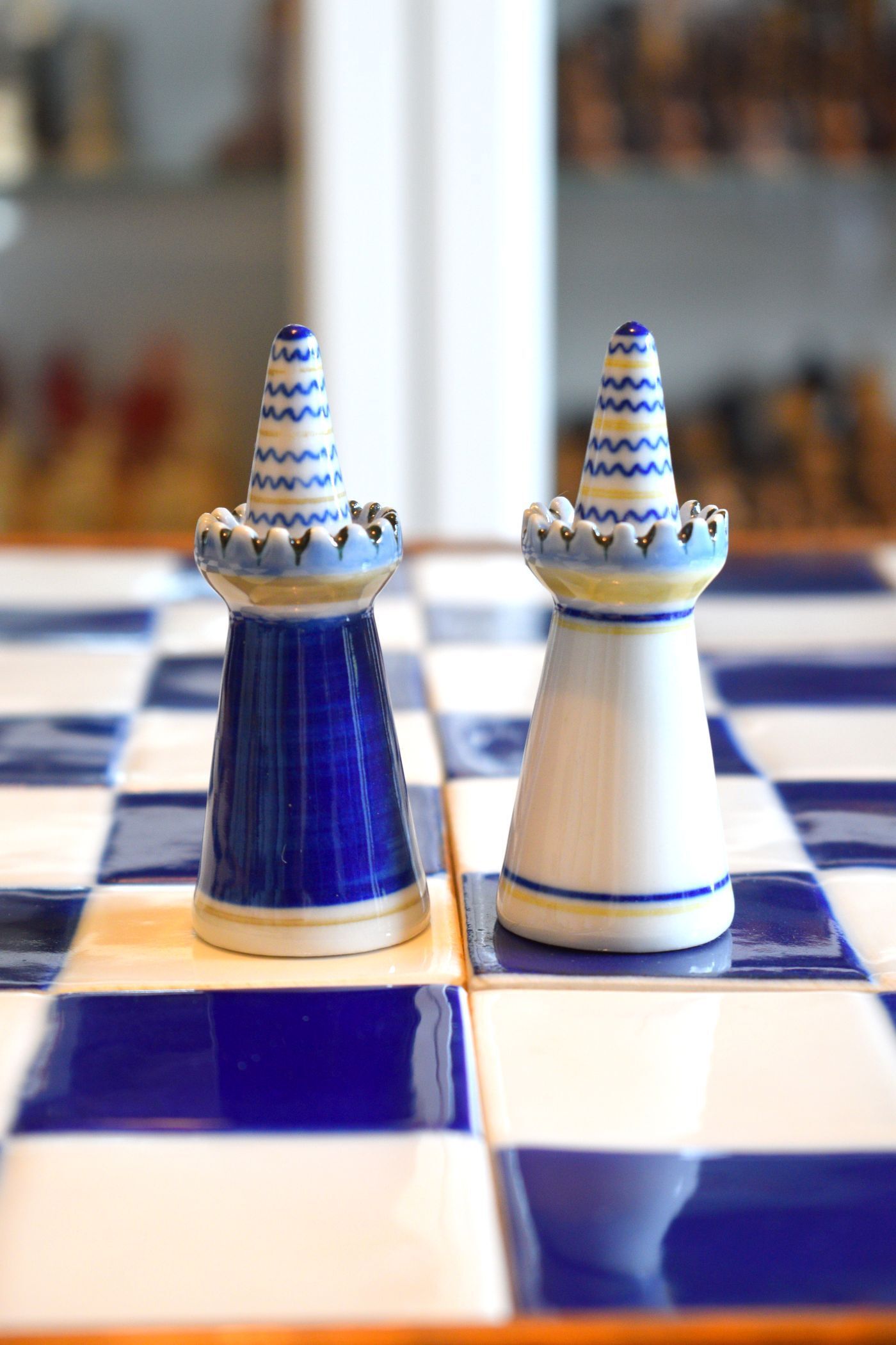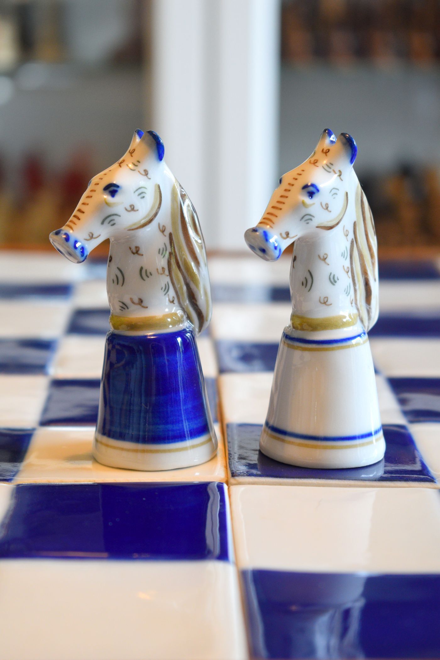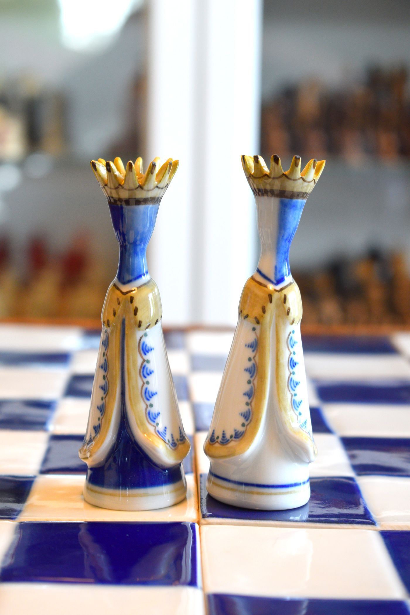 A Portuguese porcelain chess set made in Viana do Castelo in the North of Portugal by the local porcelain factory. These chess sets were made sometime between 1960 and 1980. Nowadays, Viana porcelain chess sets were only produced in small numbers and, thus, are rare and not easy to come by. The king size is 10.3 cm, i.e. slightly bigger than 4".