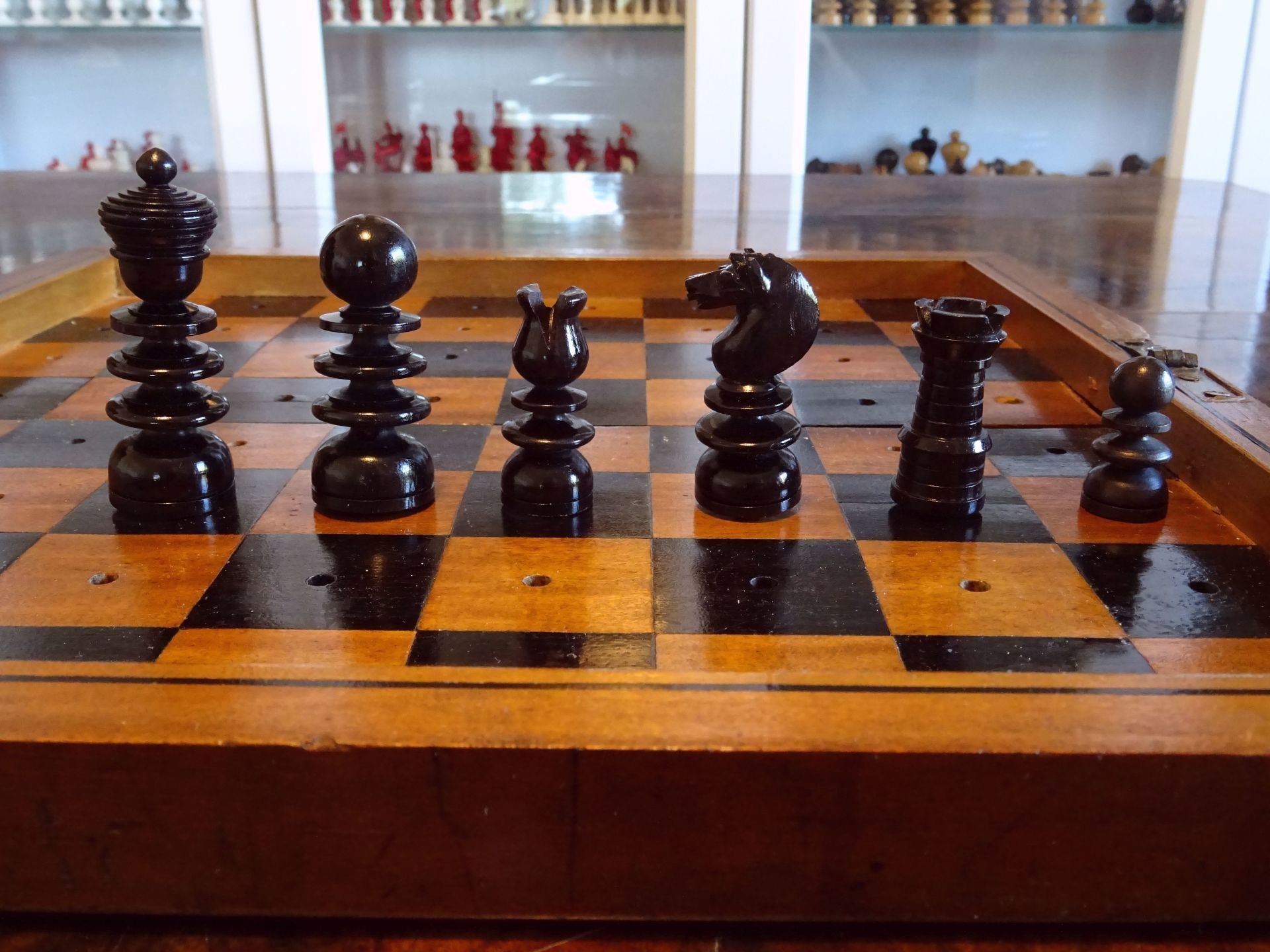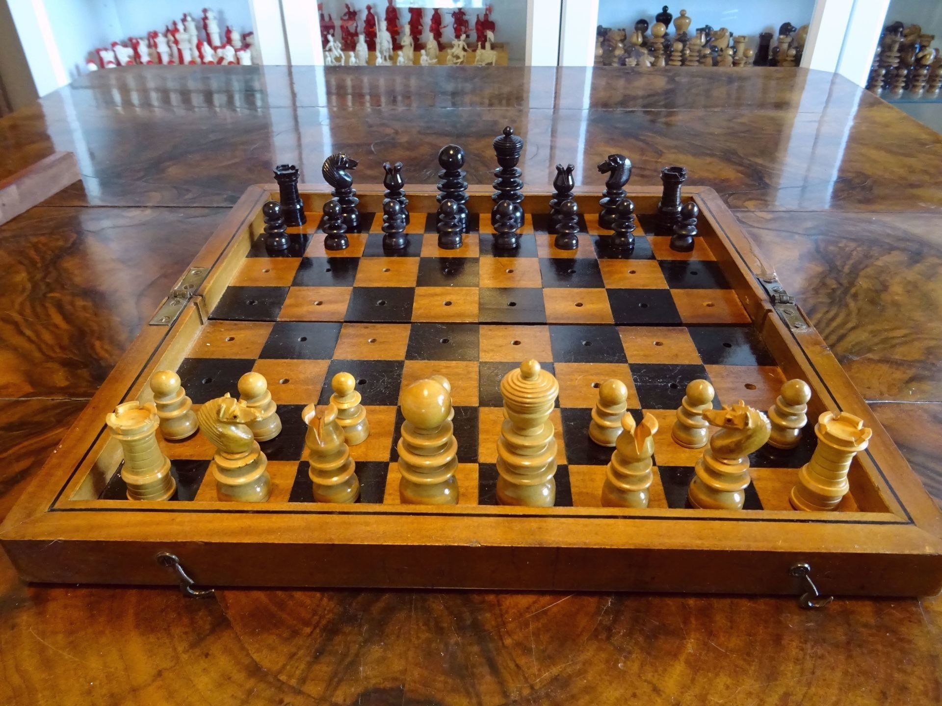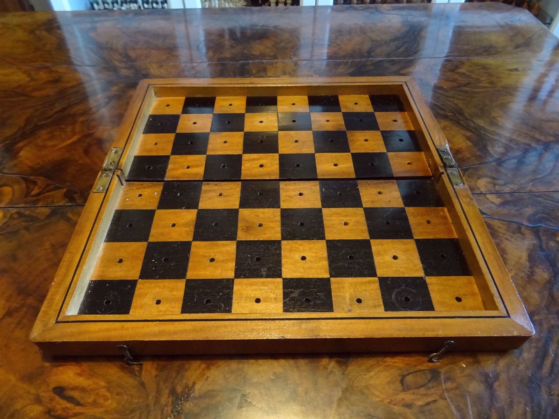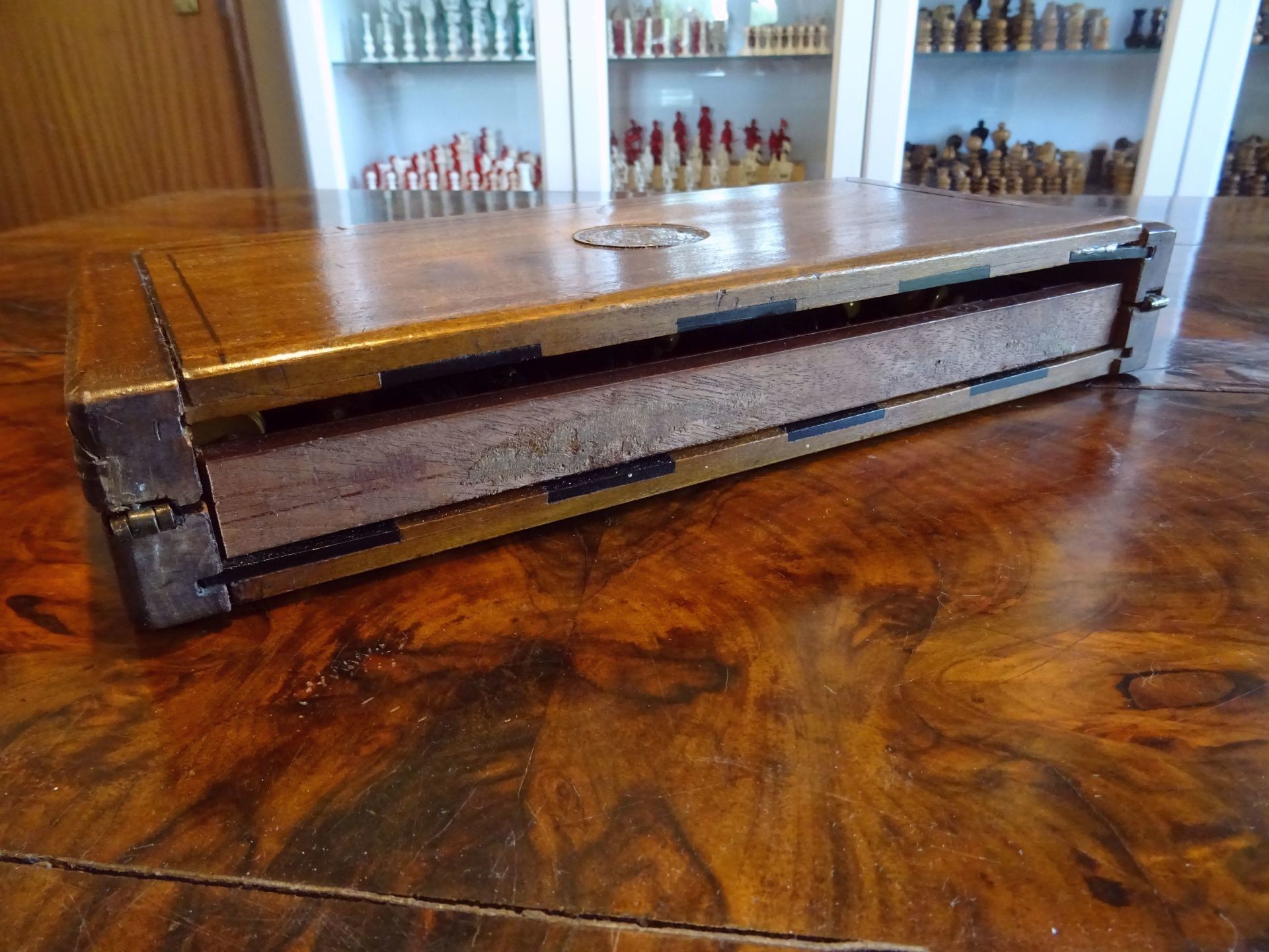 The set comes in a lovely folding chess board from the same period with holes fitting to the pegs of the pieces, holding the pieces in place. The board is made from solid walnut with a decorative plaque on top, probably made of silver. The playing surface is inlaid with birch satin for the white squares and either rosewood or ebony for the dark squares. The board itself also shows a very rich dark patina.