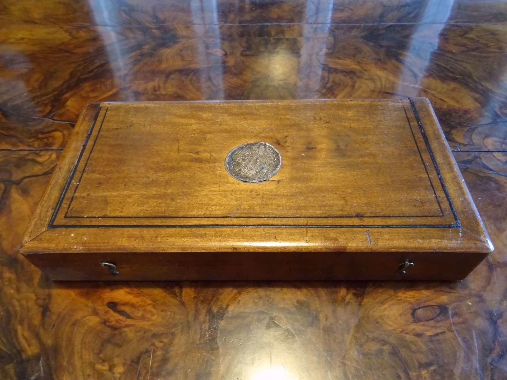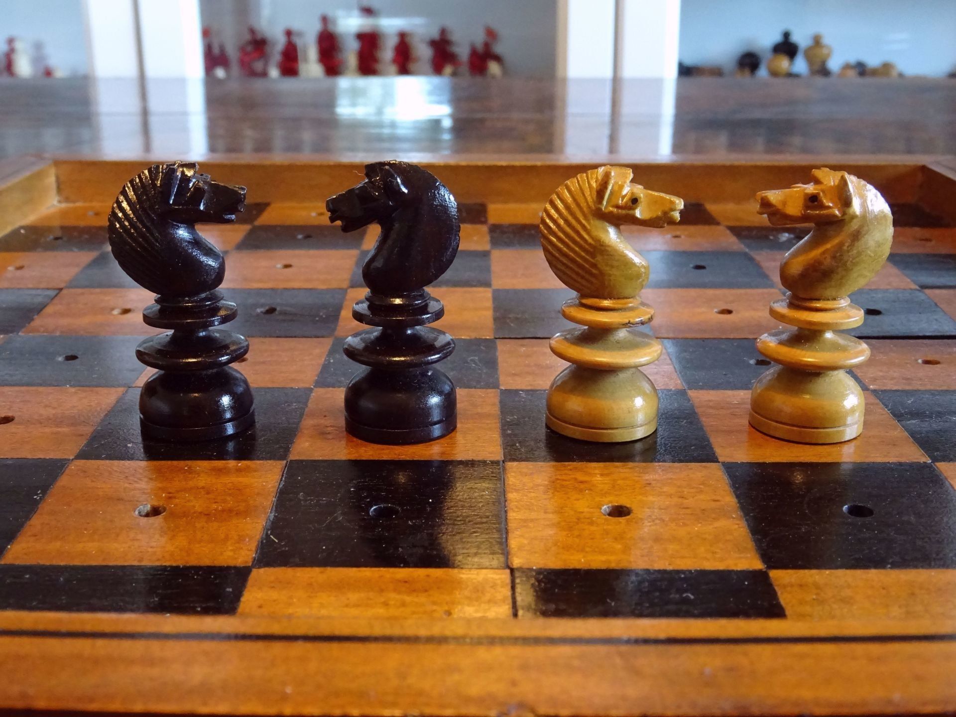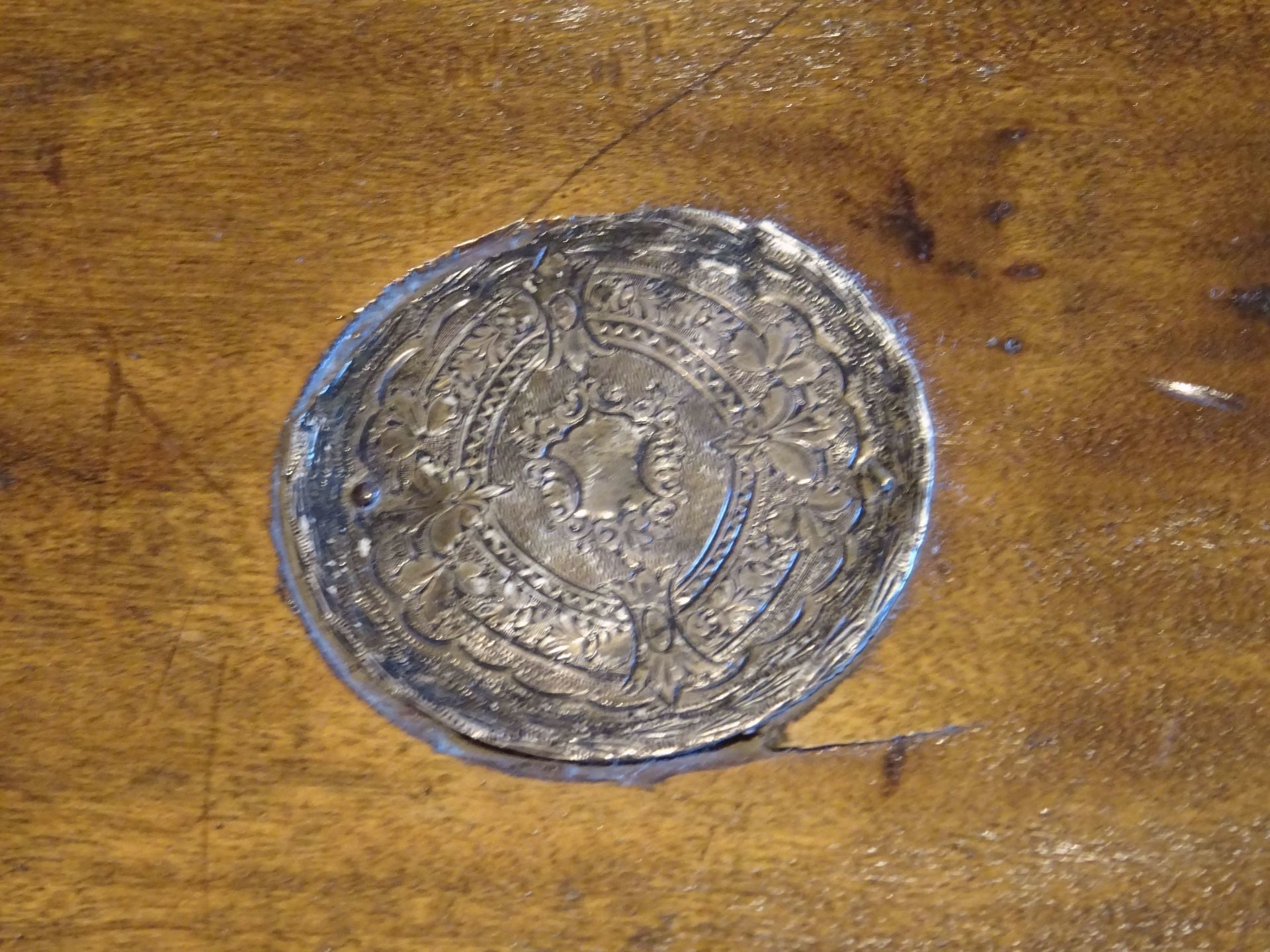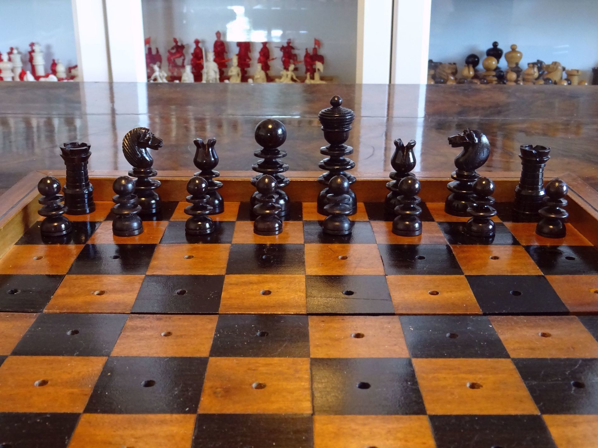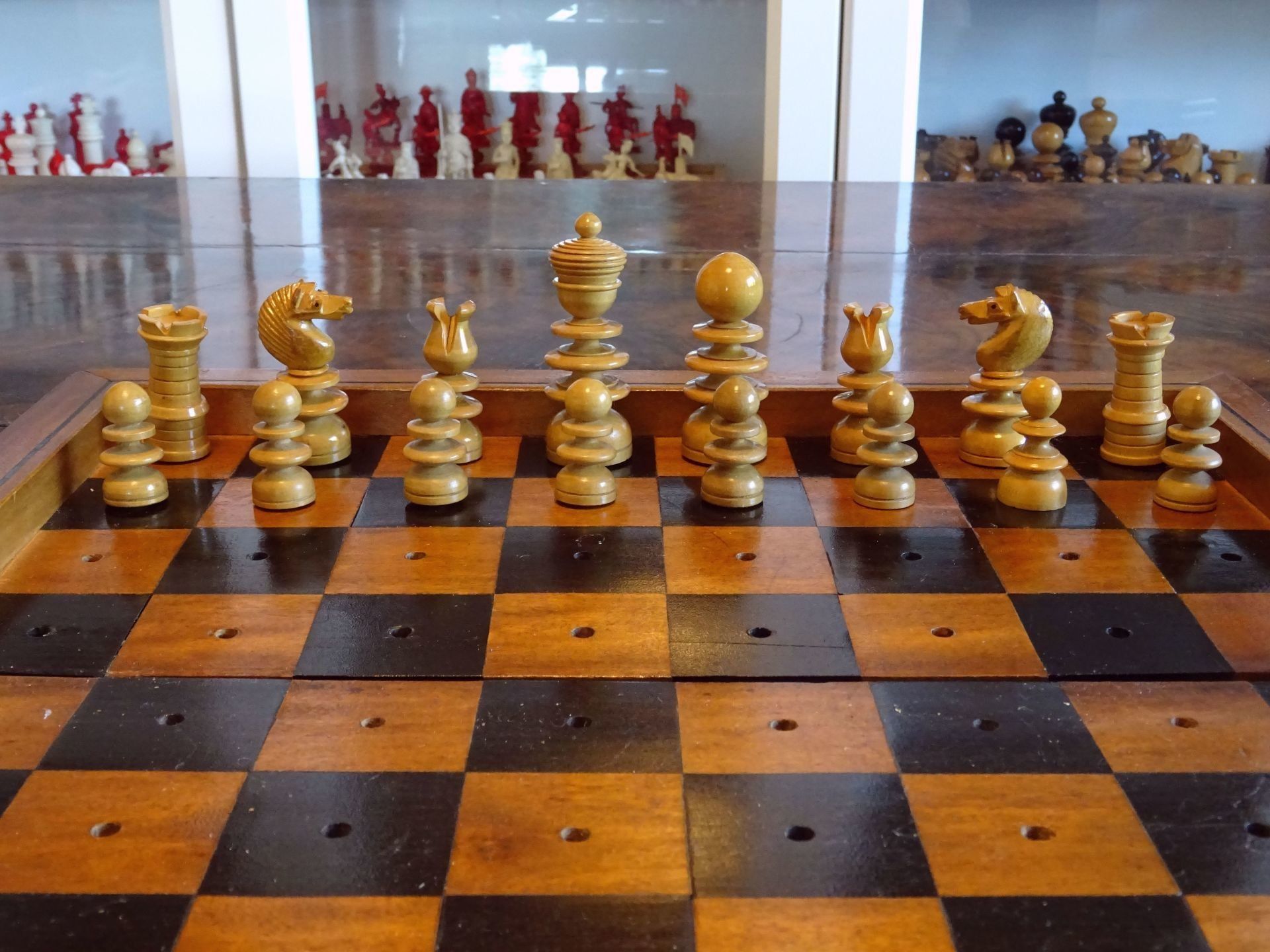 The set comes in a lovely folding chess board from the same period with holes fitting to the pegs of the pieces, holding the pieces in place. The board is made from solid walnut with a decorative plaque on top, probably made of silver. The playing surface is inlaid with birch satin for the white squares and either rosewood or ebony for the dark squares. The board itself also shows a very rich dark patina.