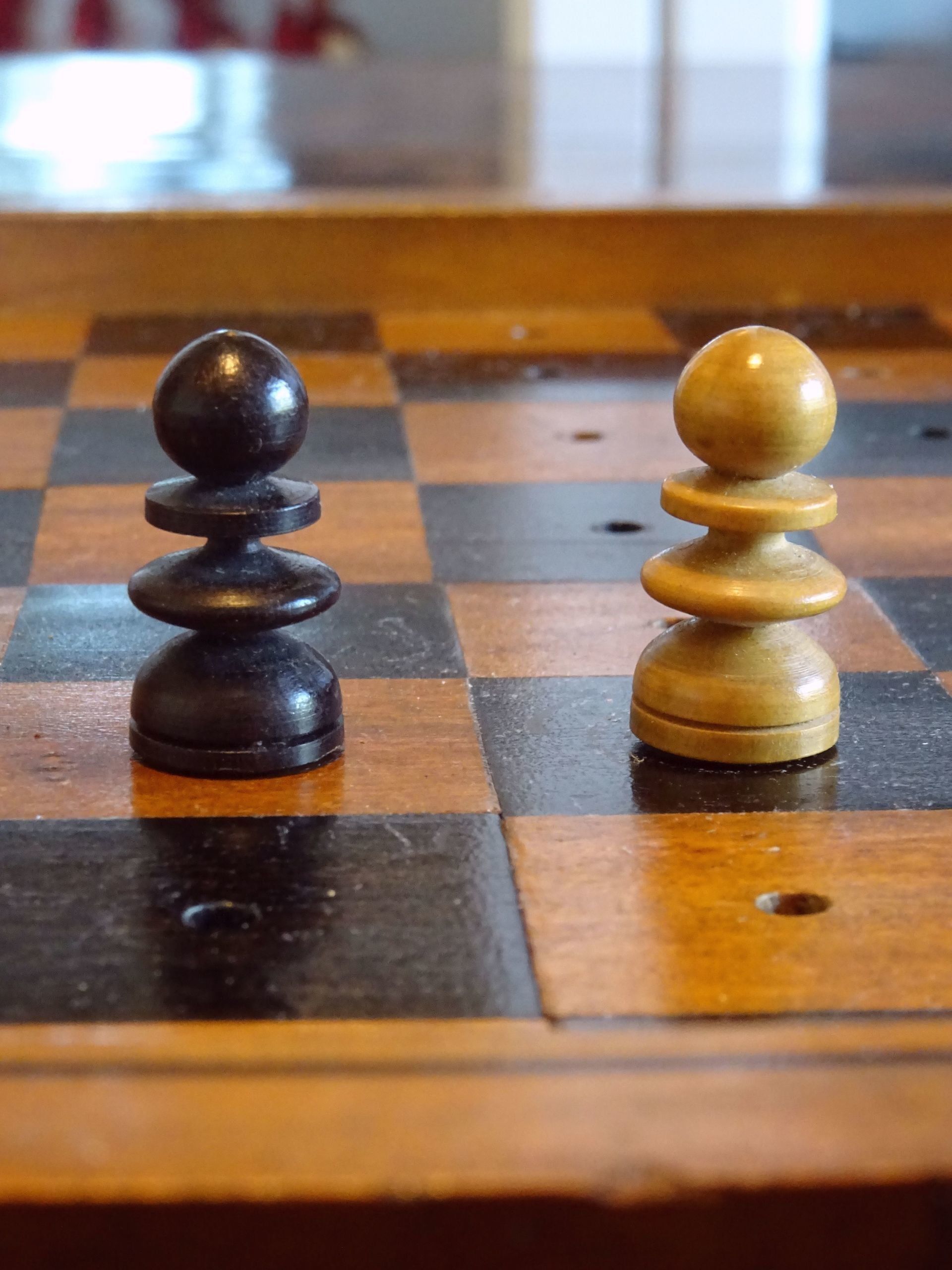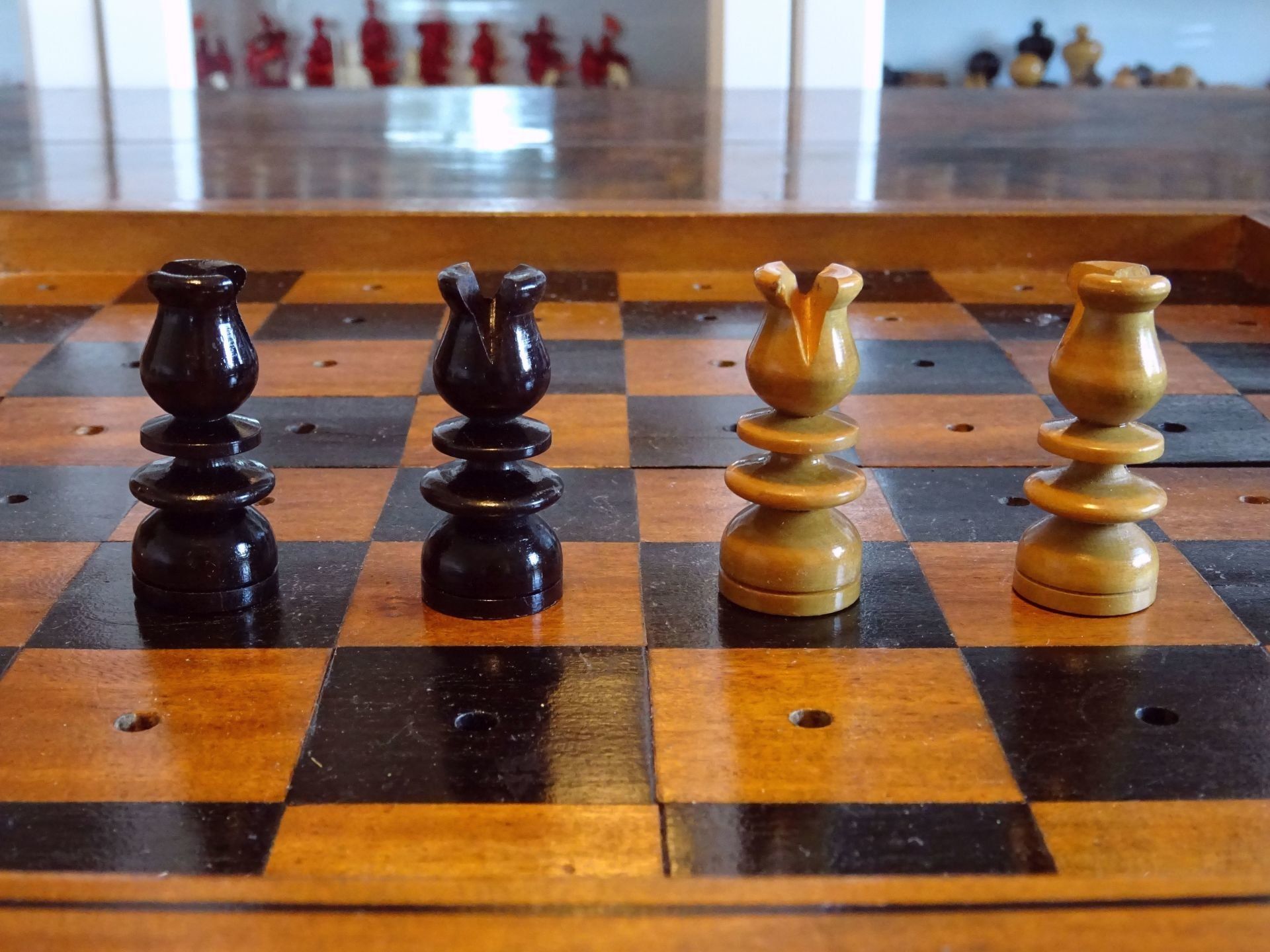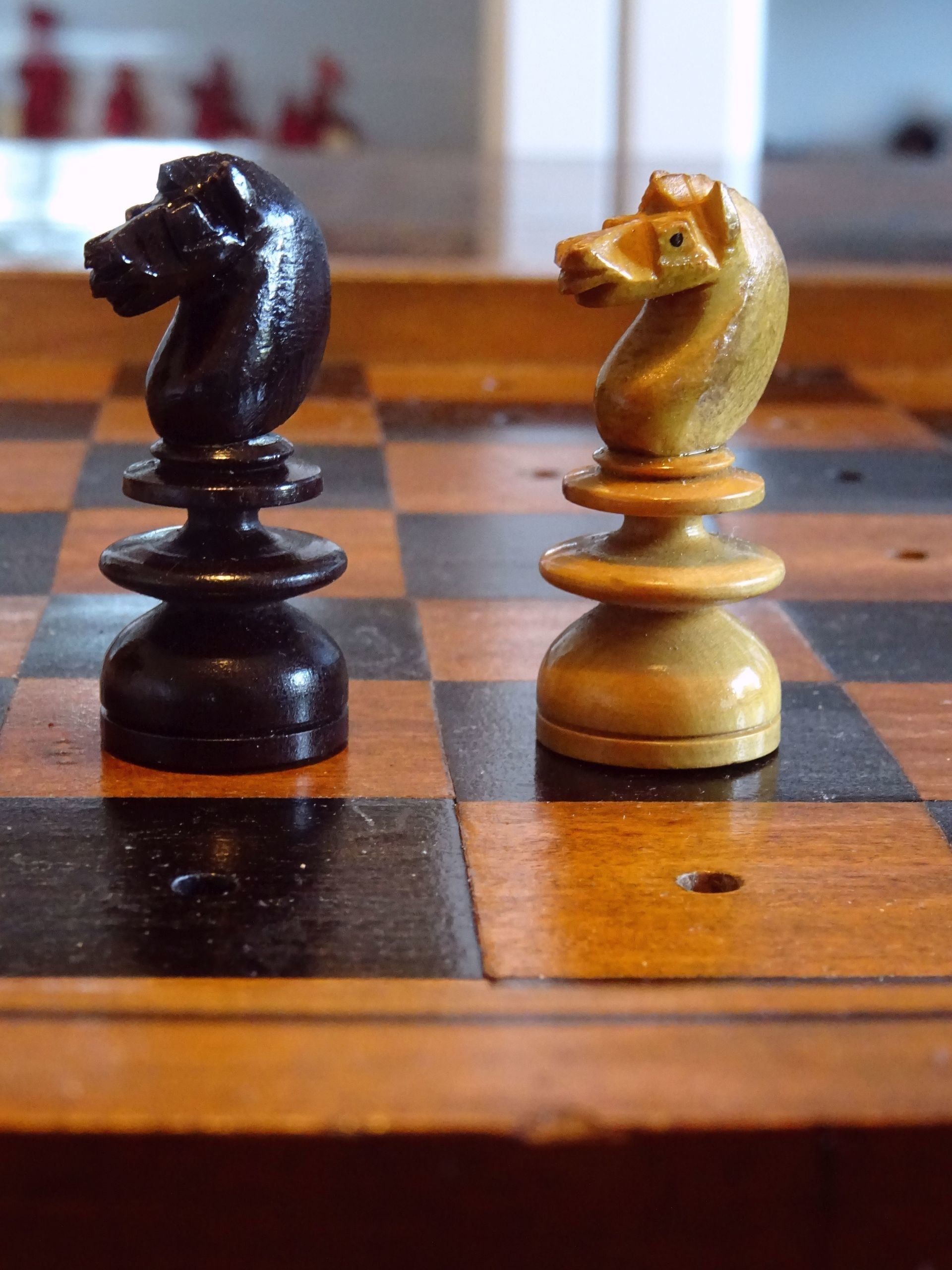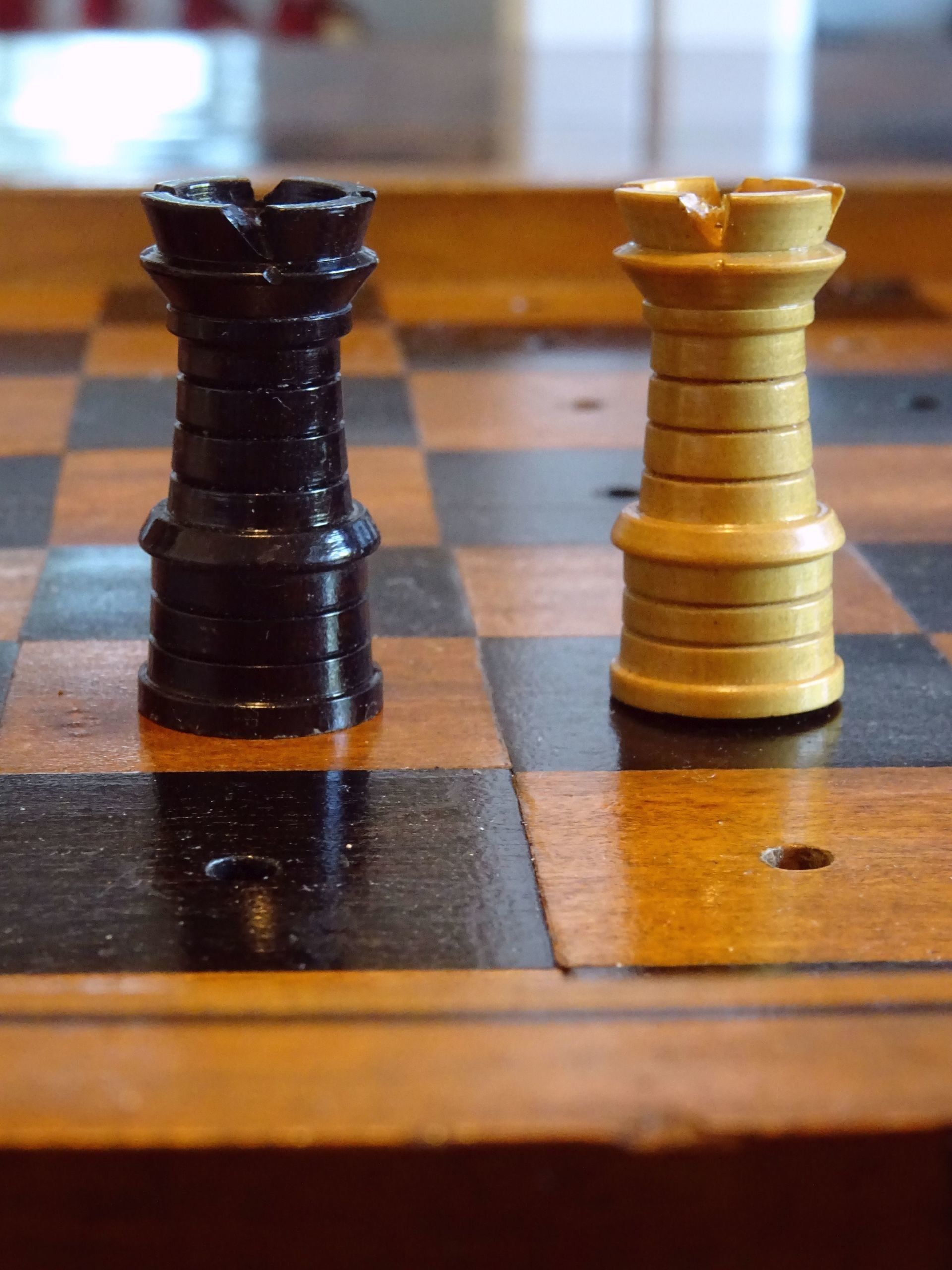 The set comes in a lovely folding chess board from the same period with holes fitting to the pegs of the pieces, holding the pieces in place. The board is made from solid walnut with a decorative plaque on top, probably made of silver. The playing surface is inlaid with birch satin for the white squares and either rosewood or ebony for the dark squares. The board itself also shows a very rich dark patina.