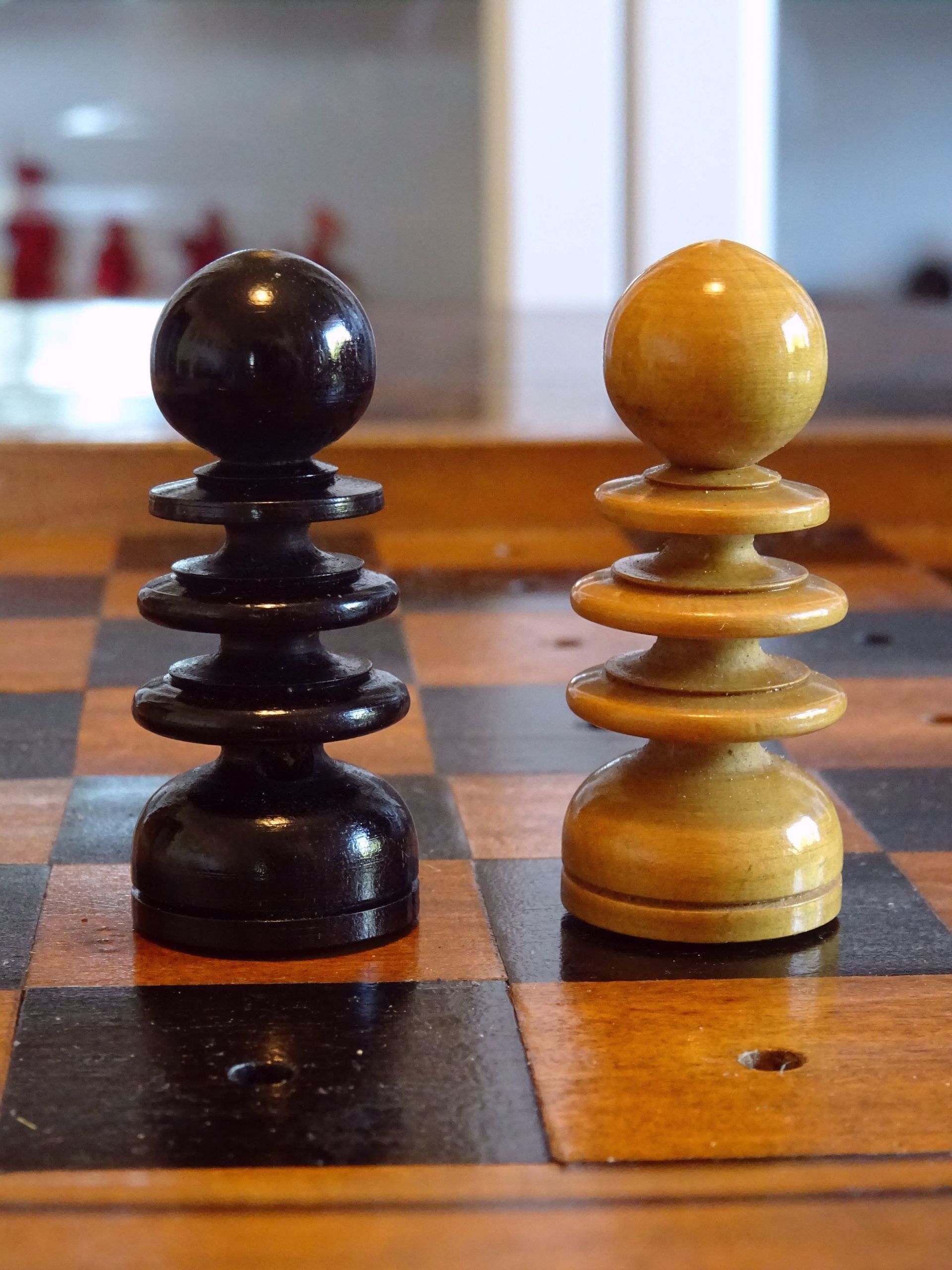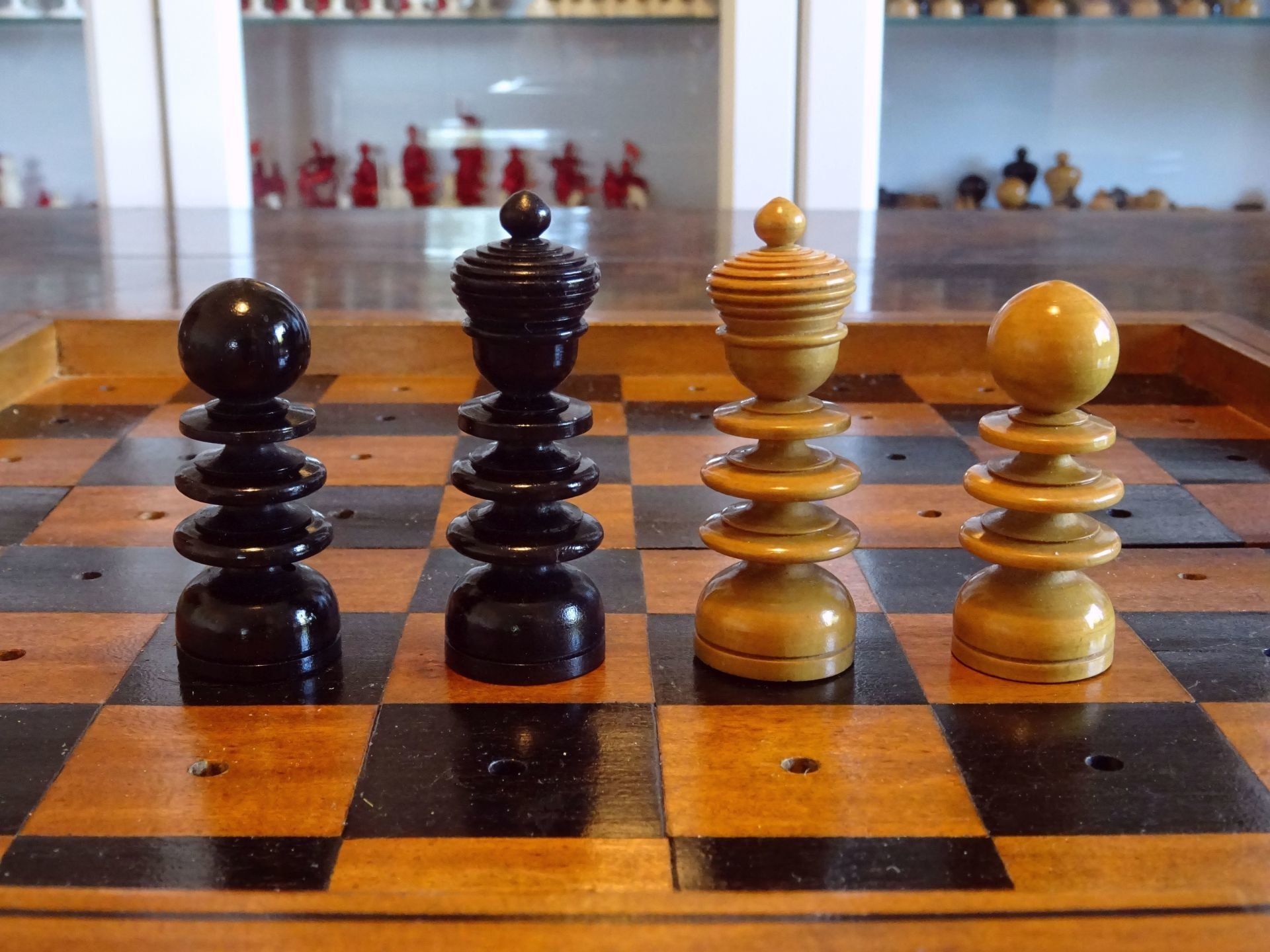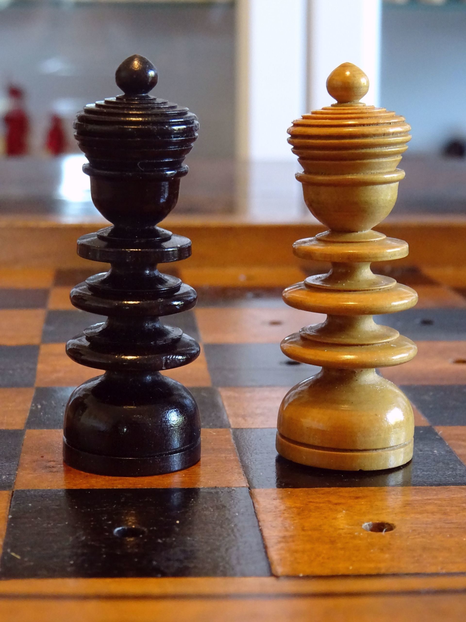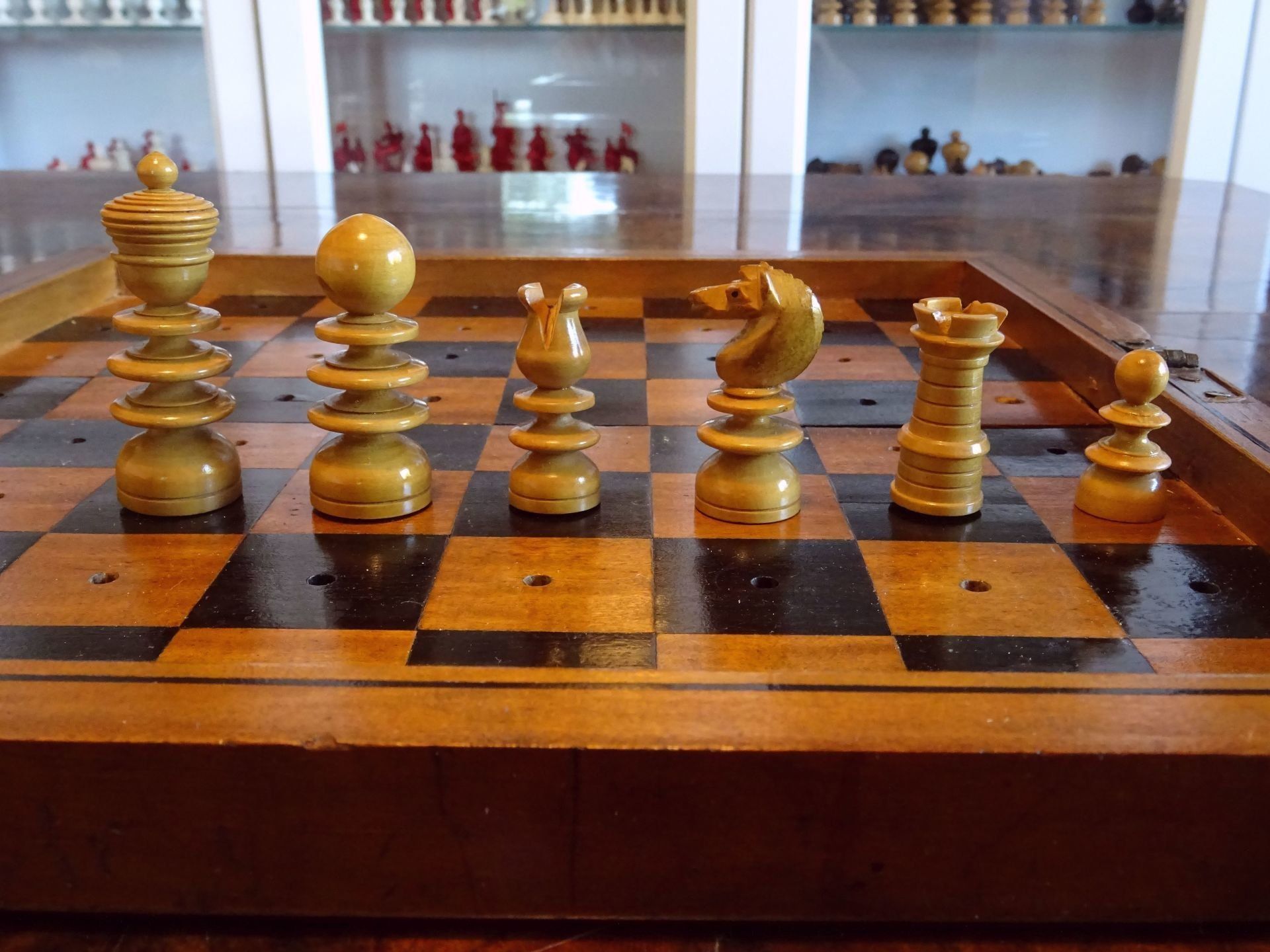 Beautiful English travel chess set with pegged pieces turned from boxwood and rosewood with a beautiful patina. The pieces were made in the St. George pattern most likely from the second half of the 19th century. The Kings with ribbed crowns and ball finials, the Queens with large bulb top finials, the Bishops with split mitres, Knights as carved horses' heads, Rooks with four crenellations, Pawns with bulb top finials. King size is 62 mm.