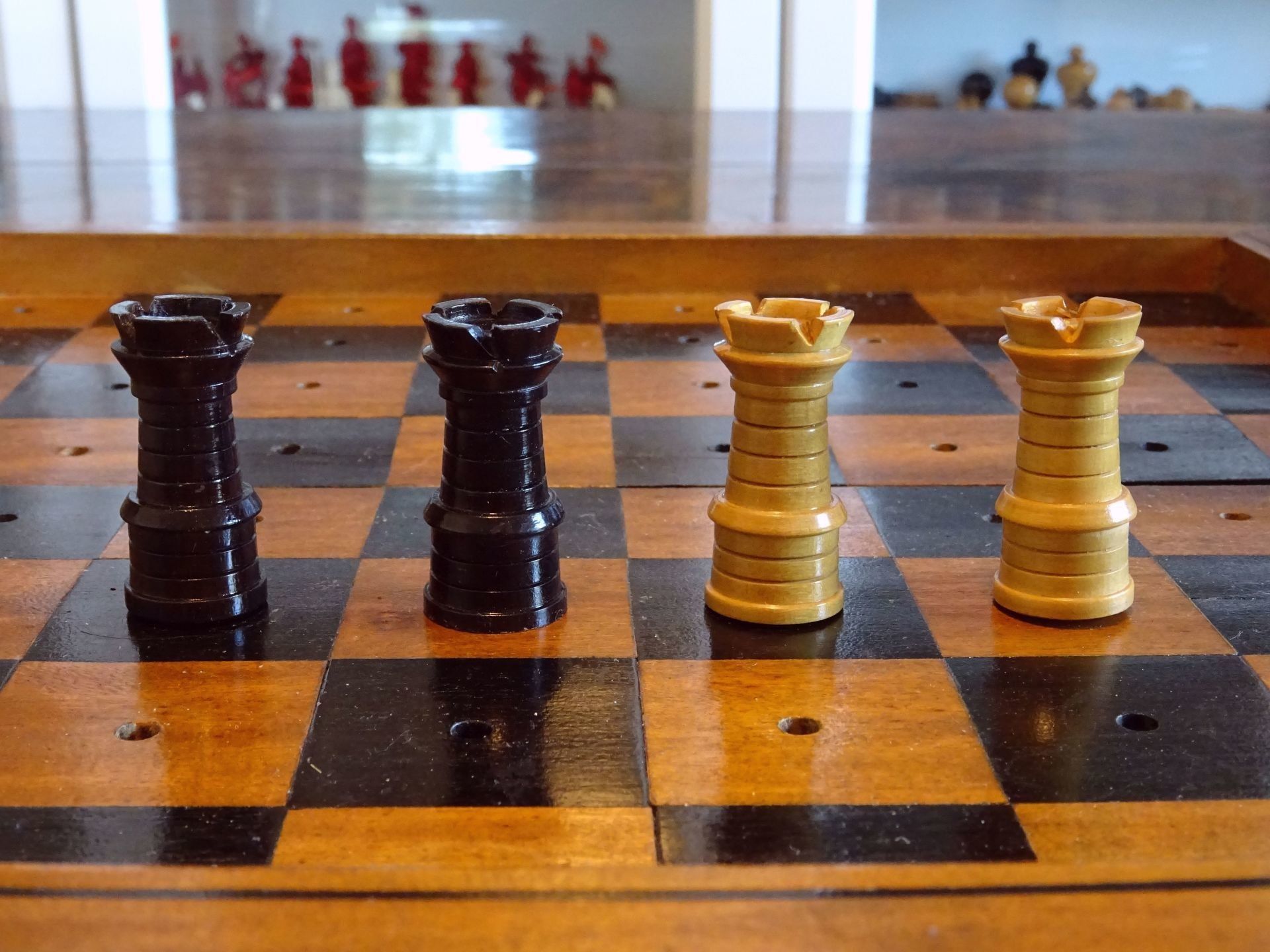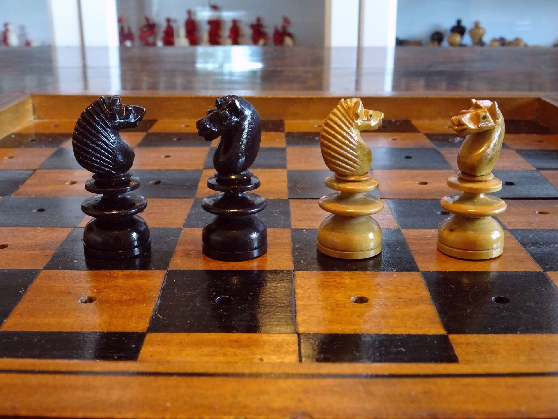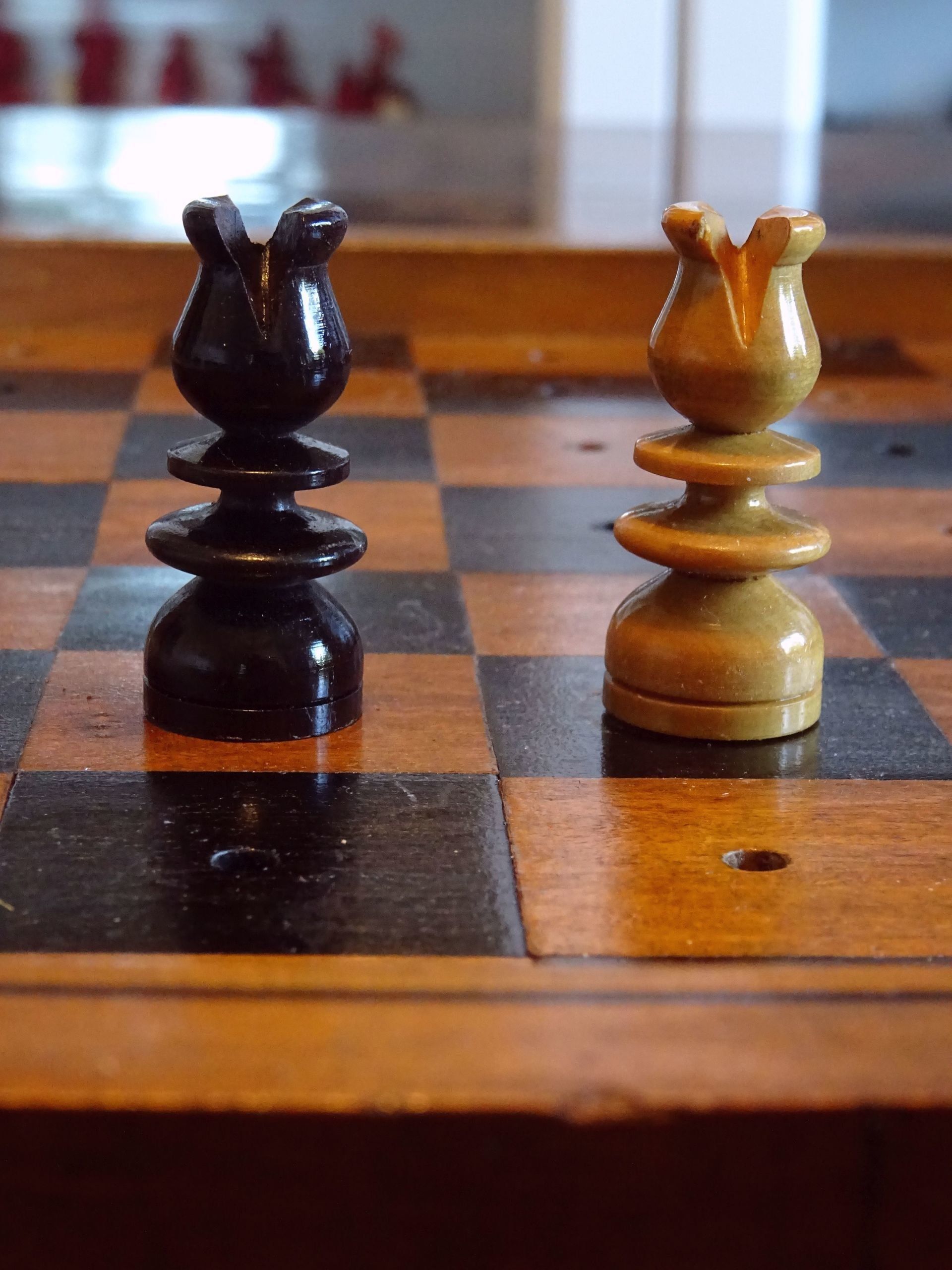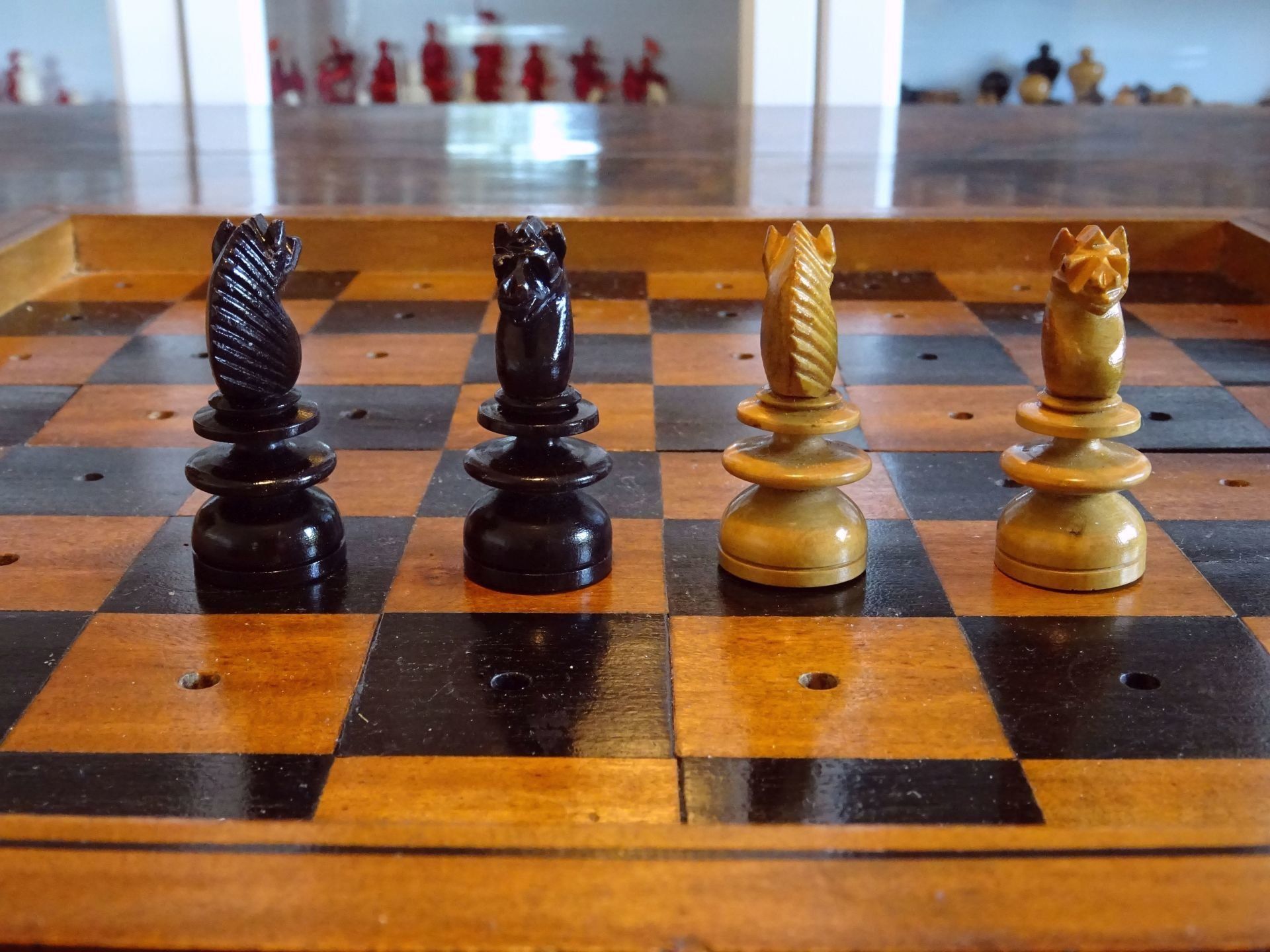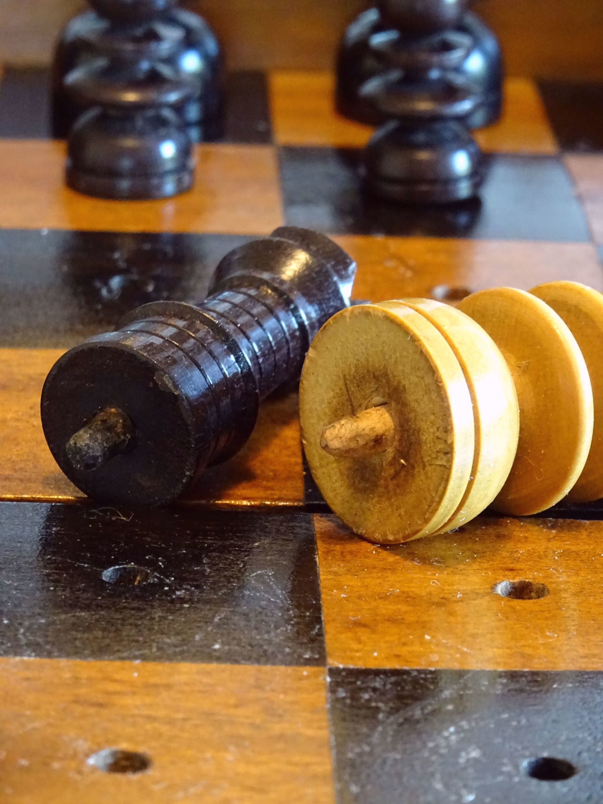 Beautiful English travel chess set with pegged pieces turned from boxwood and rosewood with a beautiful patina. The pieces were made in the St. George pattern most likely from the second half of the 19th century. The Kings with ribbed crowns and ball finials, the Queens with large bulb top finials, the Bishops with split mitres, Knights as carved horses' heads, Rooks with four crenellations, Pawns with bulb top finials. King size is 62 mm.