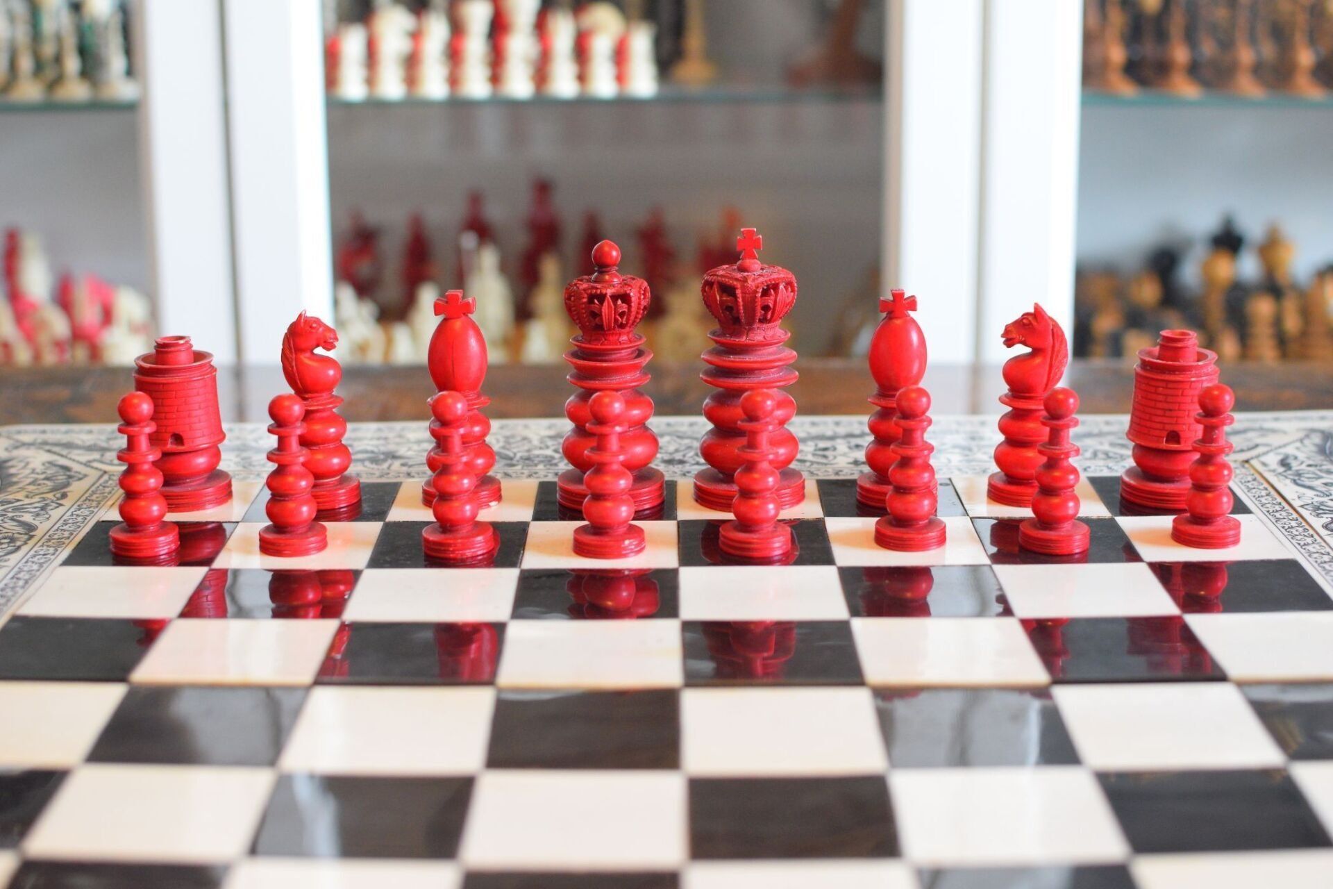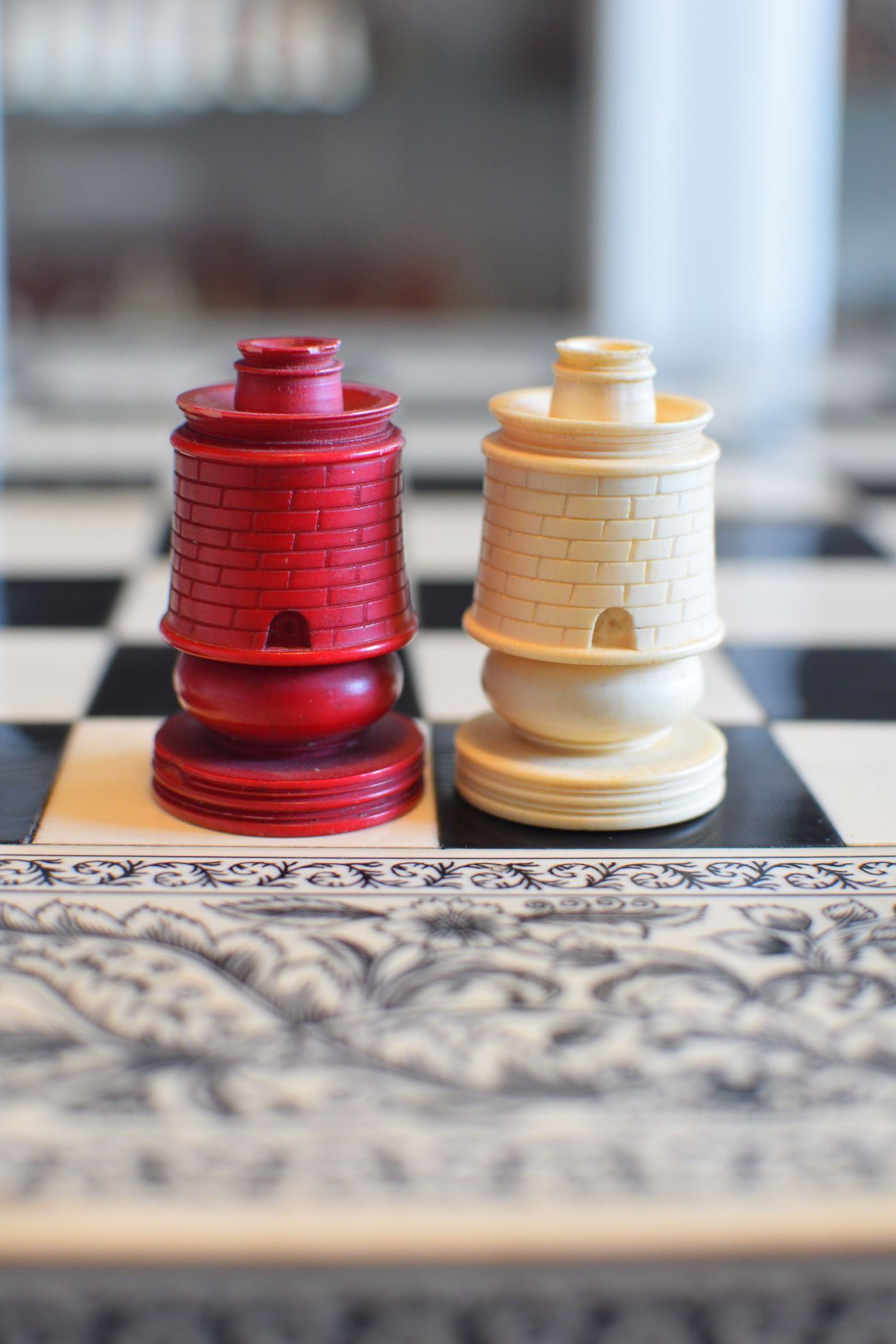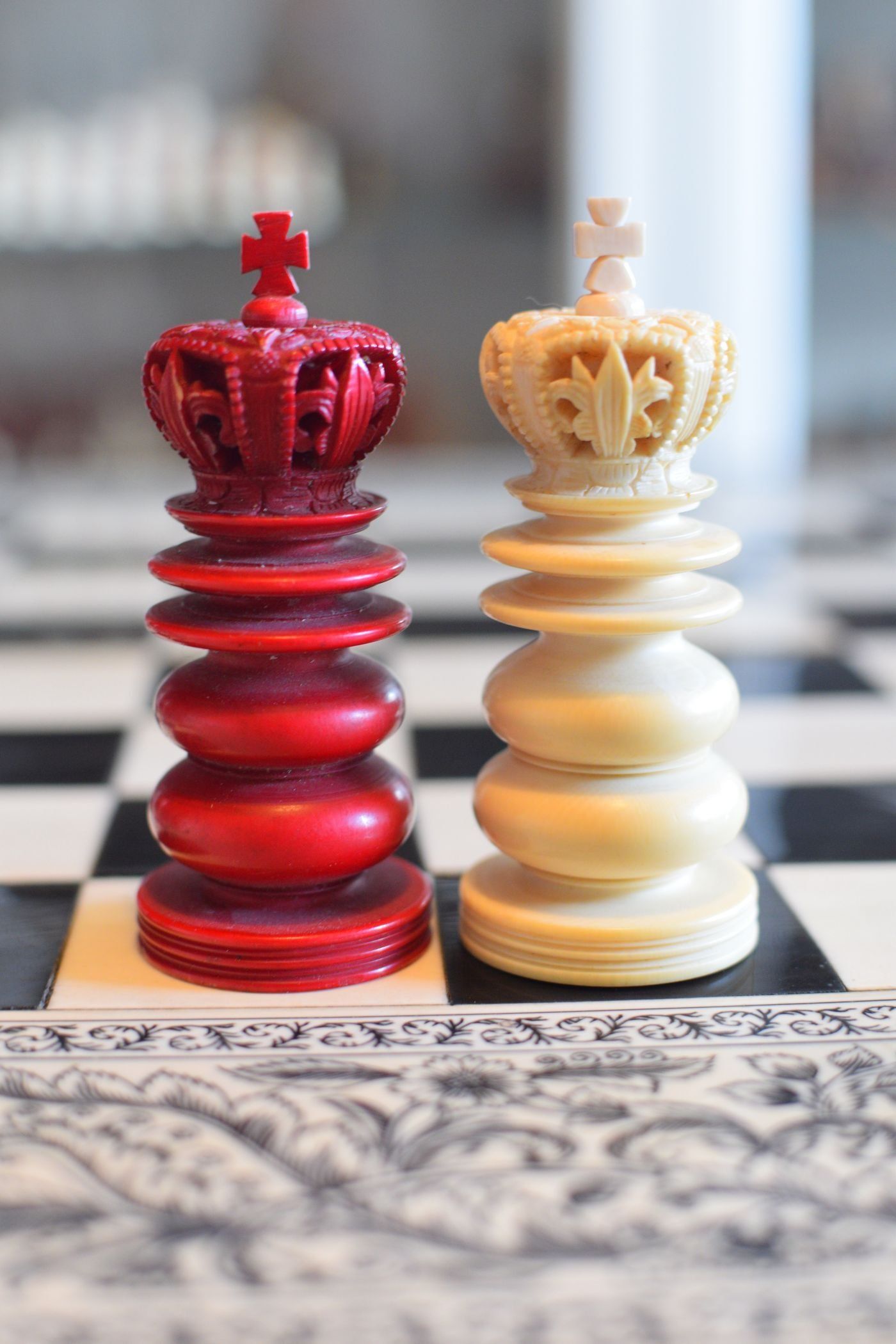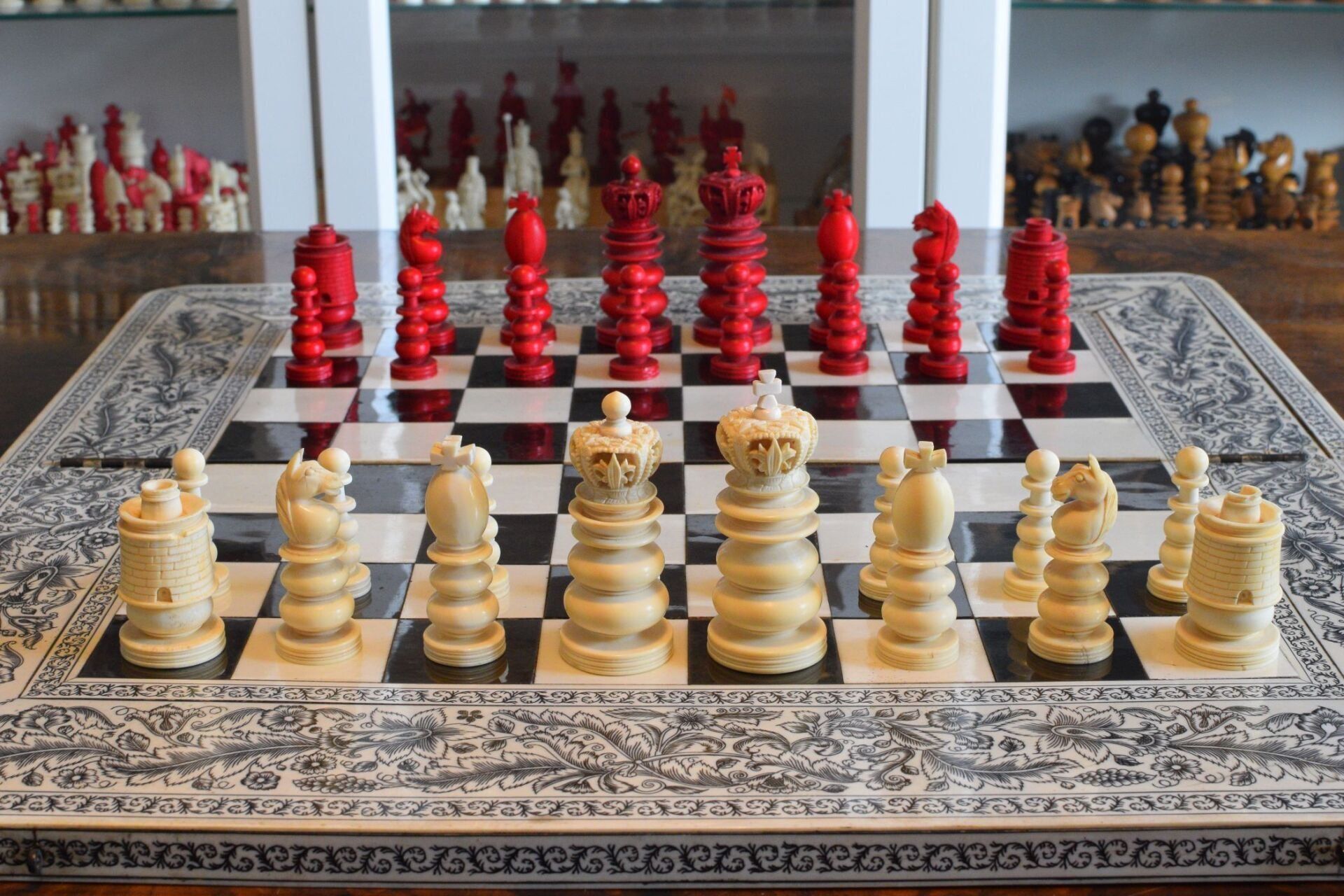 A bit of a break in style, the set is shown on a late 19th century Indian chess board. It is a very beautiful example of Indian marquetry and sgraffito work typical for just a handful of workshops in the Vizagatapam area. The board is based on a solid sandalwood base plate on which ivory veneers for the white squares and horn veneers for the black squares were applied. The broad rim is decorated with flower and foliage ornaments applied as sgraffito work. The pattern is drawn on the ivory and worked into the ivory with small incisions. Then molten lac is poured into the cuts, and when it is dry, scraped off and polished so that only the lac in the pattern incisions remains.
