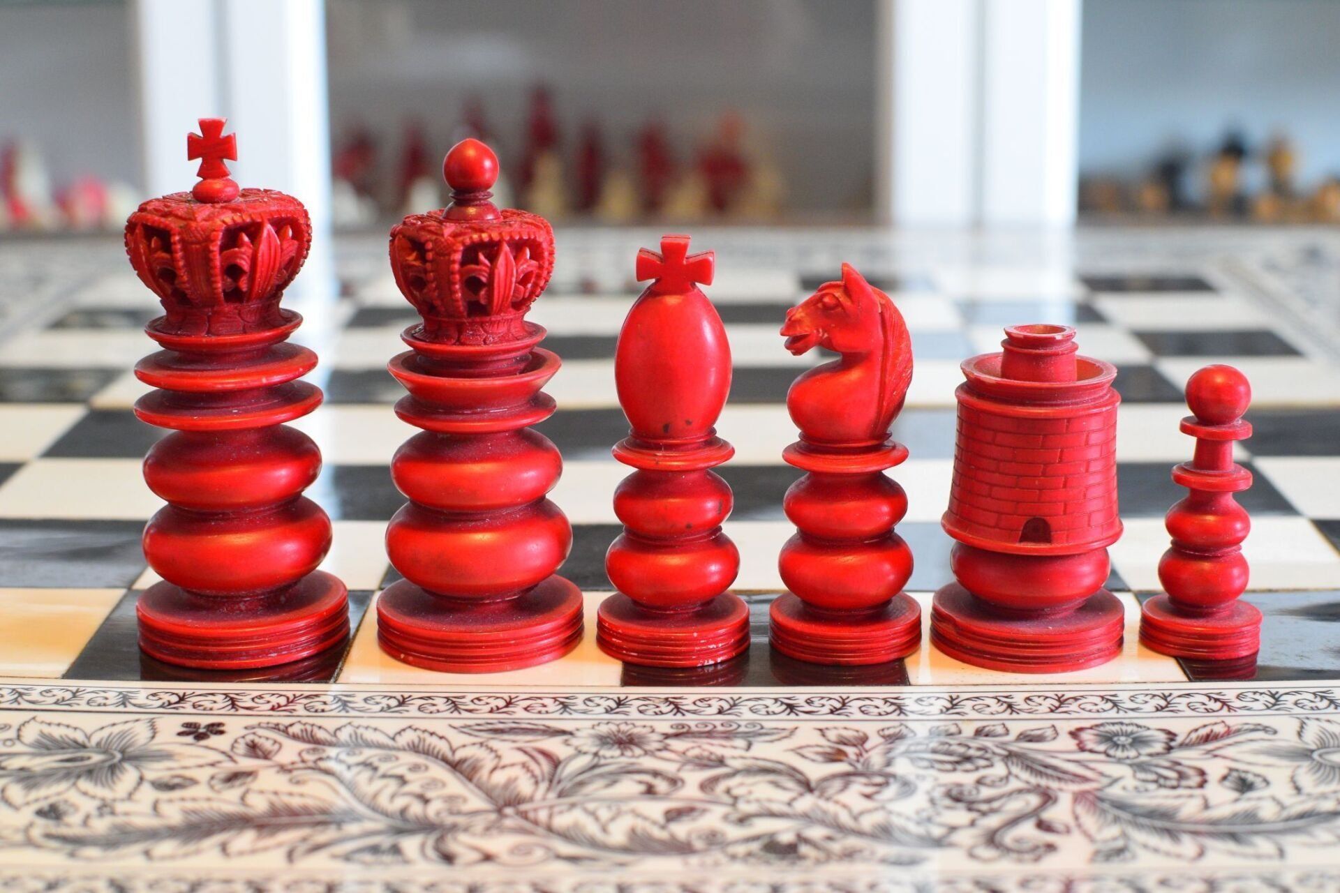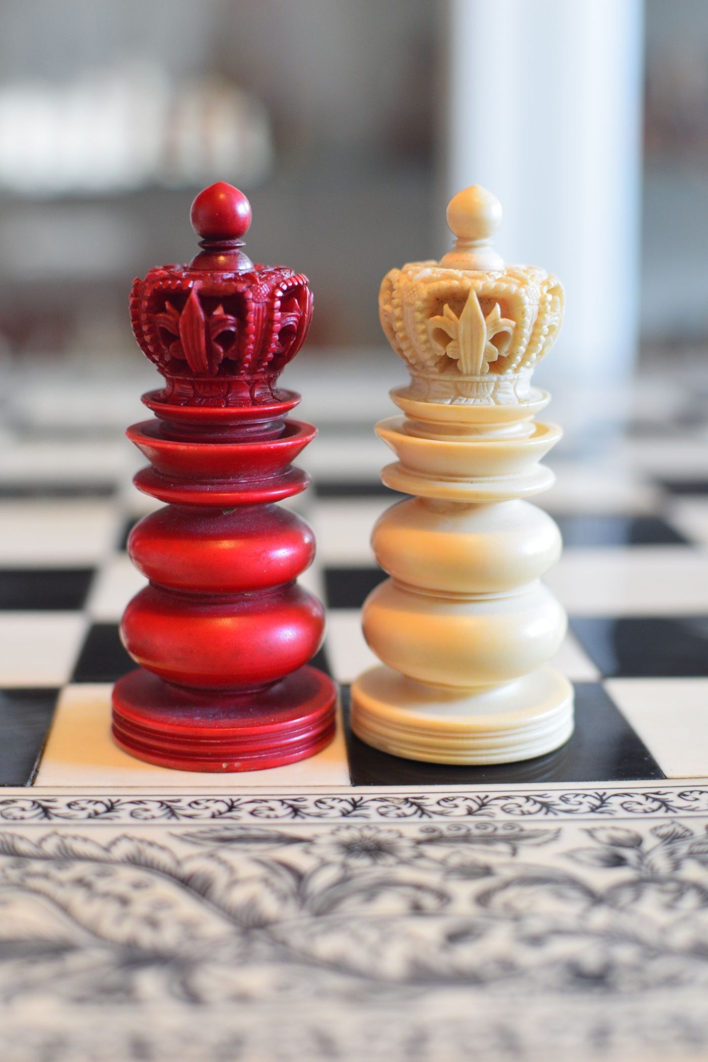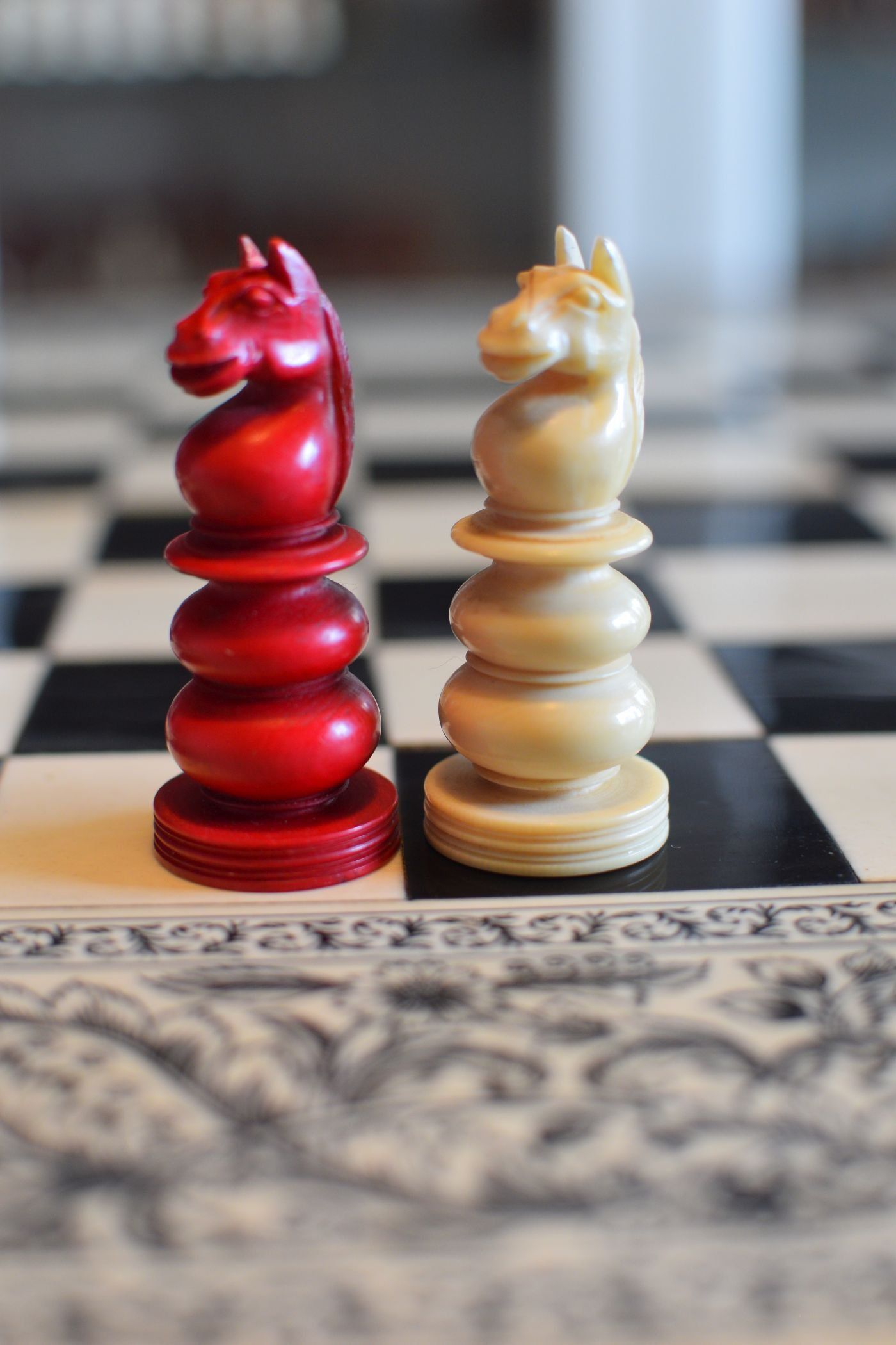 A bit of a break in style, the set is shown on a late 19th century Indian chess board. It is a very beautiful example of Indian marquetry and sgraffito work typical for just a handful of workshops in the Vizagatapam area. The board is based on a solid sandalwood base plate on which ivory veneers for the white squares and horn veneers for the black squares were applied. The broad rim is decorated with flower and foliage ornaments applied as sgraffito work. The pattern is drawn on the ivory and worked into the ivory with small incisions. Then molten lac is poured into the cuts, and when it is dry, scraped off and polished so that only the lac in the pattern incisions remains.