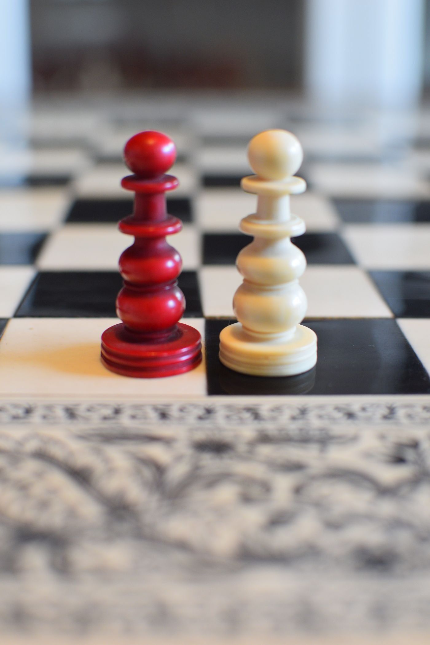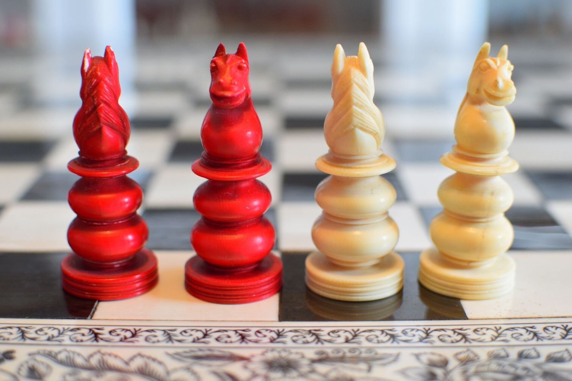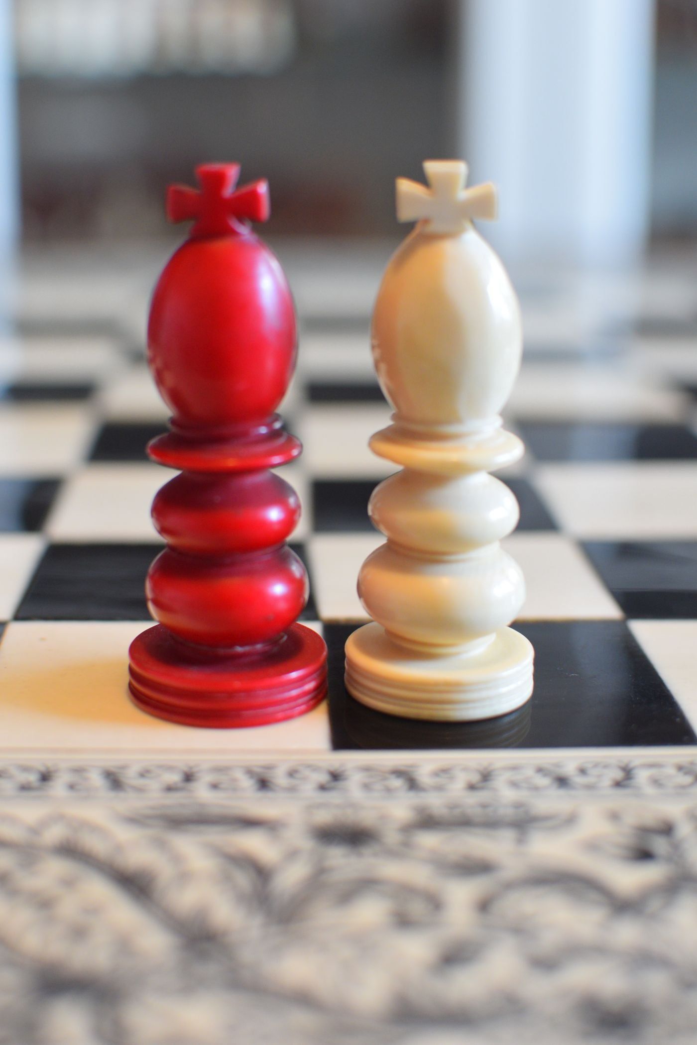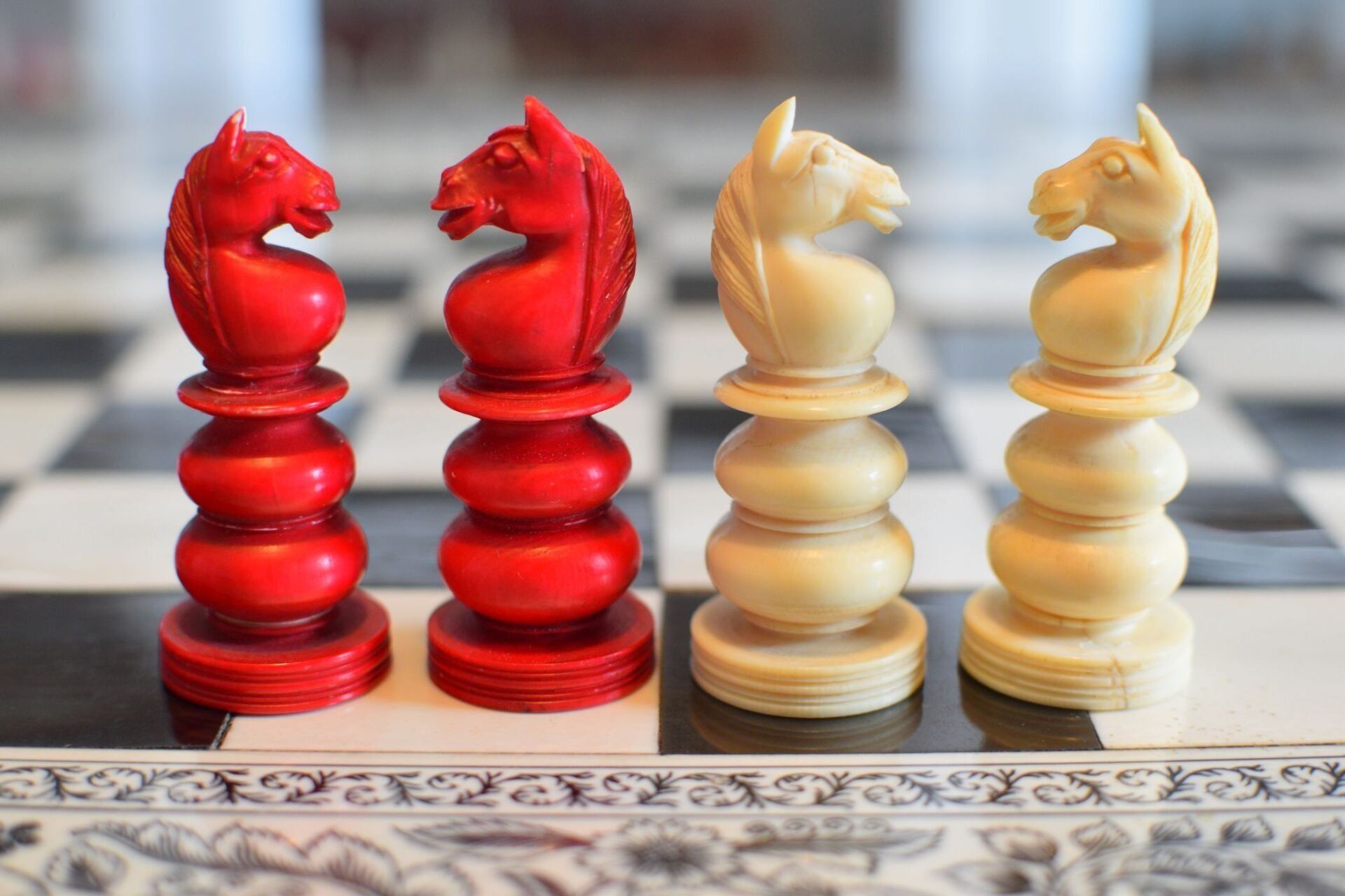 A bit of a break in style, the set is shown on a late 19th century Indian chess board. It is a very beautiful example of Indian marquetry and sgraffito work typical for just a handful of workshops in the Vizagatapam area. The board is based on a solid sandalwood base plate on which ivory veneers for the white squares and horn veneers for the black squares were applied. The broad rim is decorated with flower and foliage ornaments applied as sgraffito work. The pattern is drawn on the ivory and worked into the ivory with small incisions. Then molten lac is poured into the cuts, and when it is dry, scraped off and polished so that only the lac in the pattern incisions remains.