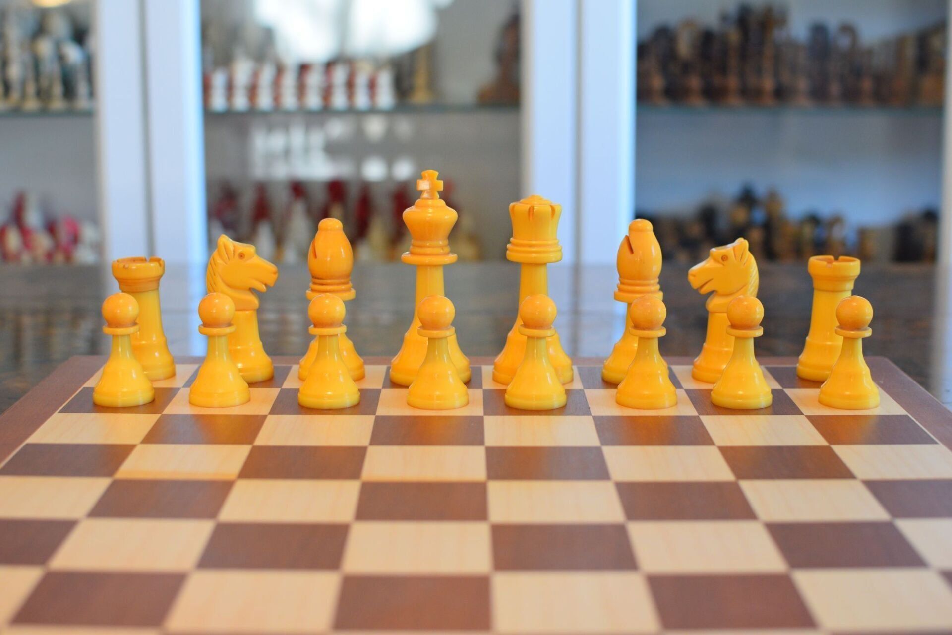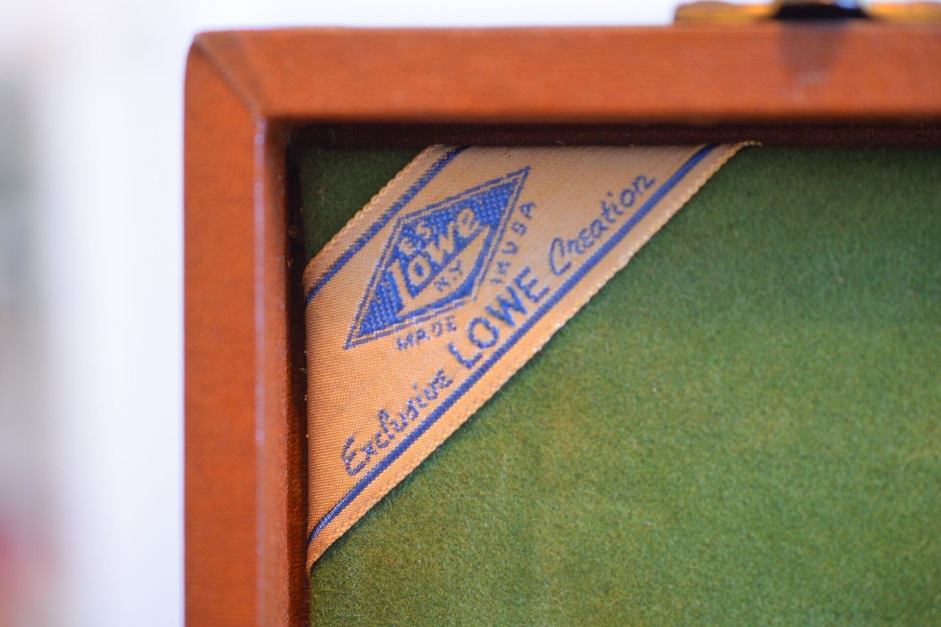 A chess set by E.S.Lowe with a king size of 3.75". The pieces are made of catalin, which was introduced by Lowe in 1946, i.e. right after WWII. The set comes in a velvet-lined felt padded Lowe Presentation Case with an embroidered Lowe logo in the upper left corner. Duncan Pohl provides some valuable insights on this set in his book on American Chess Sets. The colour combination is Ivory & Red, also referred to as Butterscotch & Red.