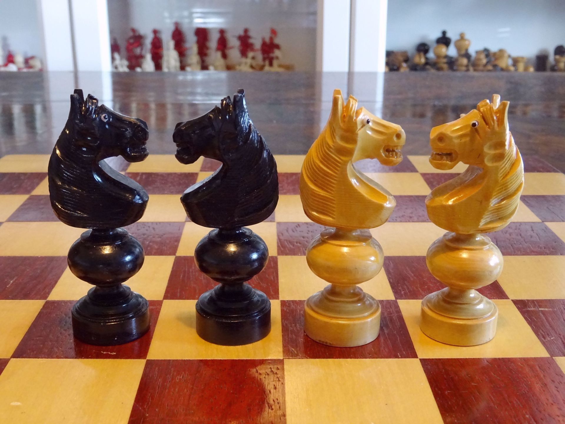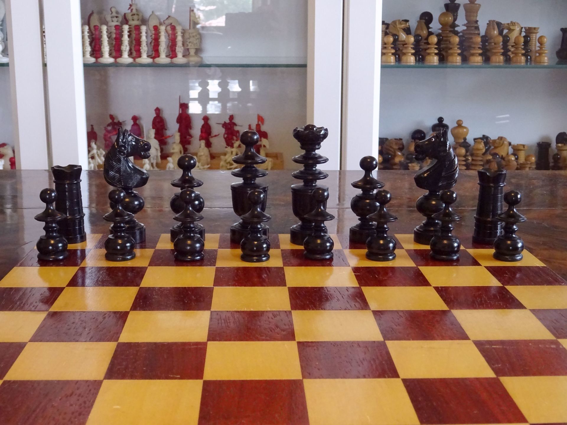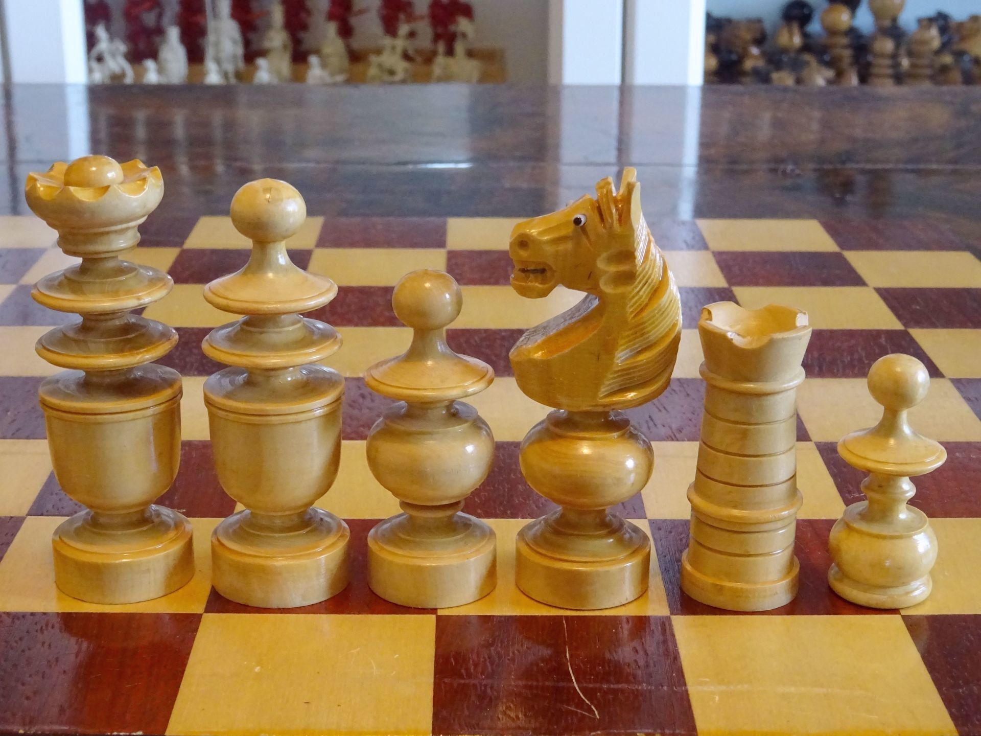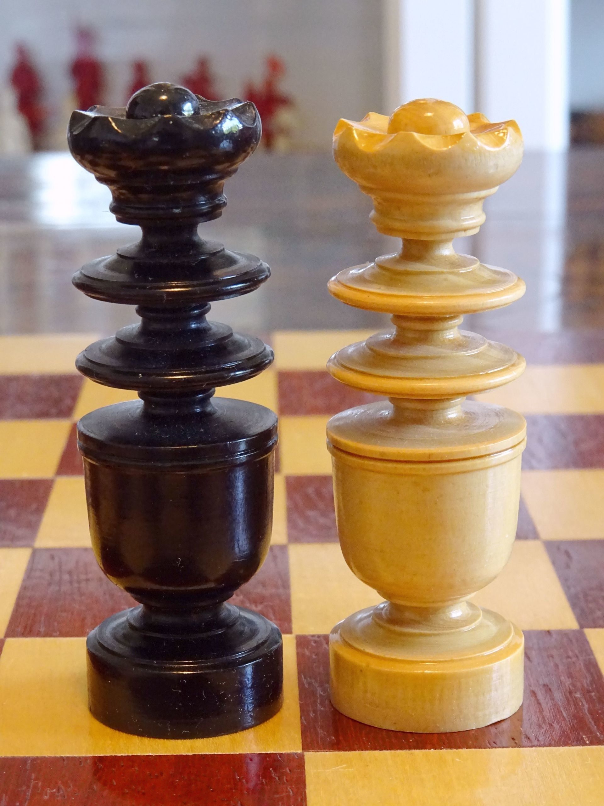 French chess set turned from boxwood and ebony, presumably from the early 20th century. The Kings with "Tulip Crowns" typical for Régence sets. The Knights with glass eyes and of very dominant height. Kings stand at approximately 3", the Knights just a tad shorter. The set is shown on a boxwood and mahogany roll up board of approximately the same period.