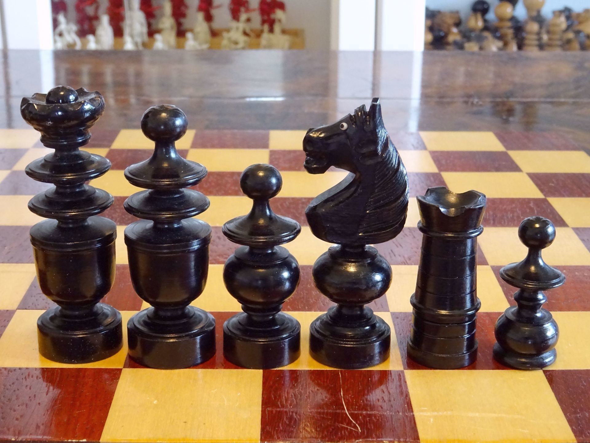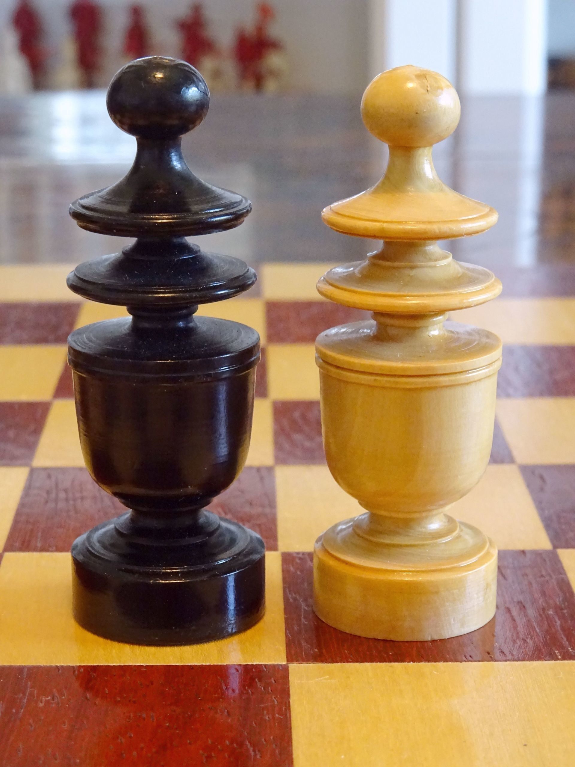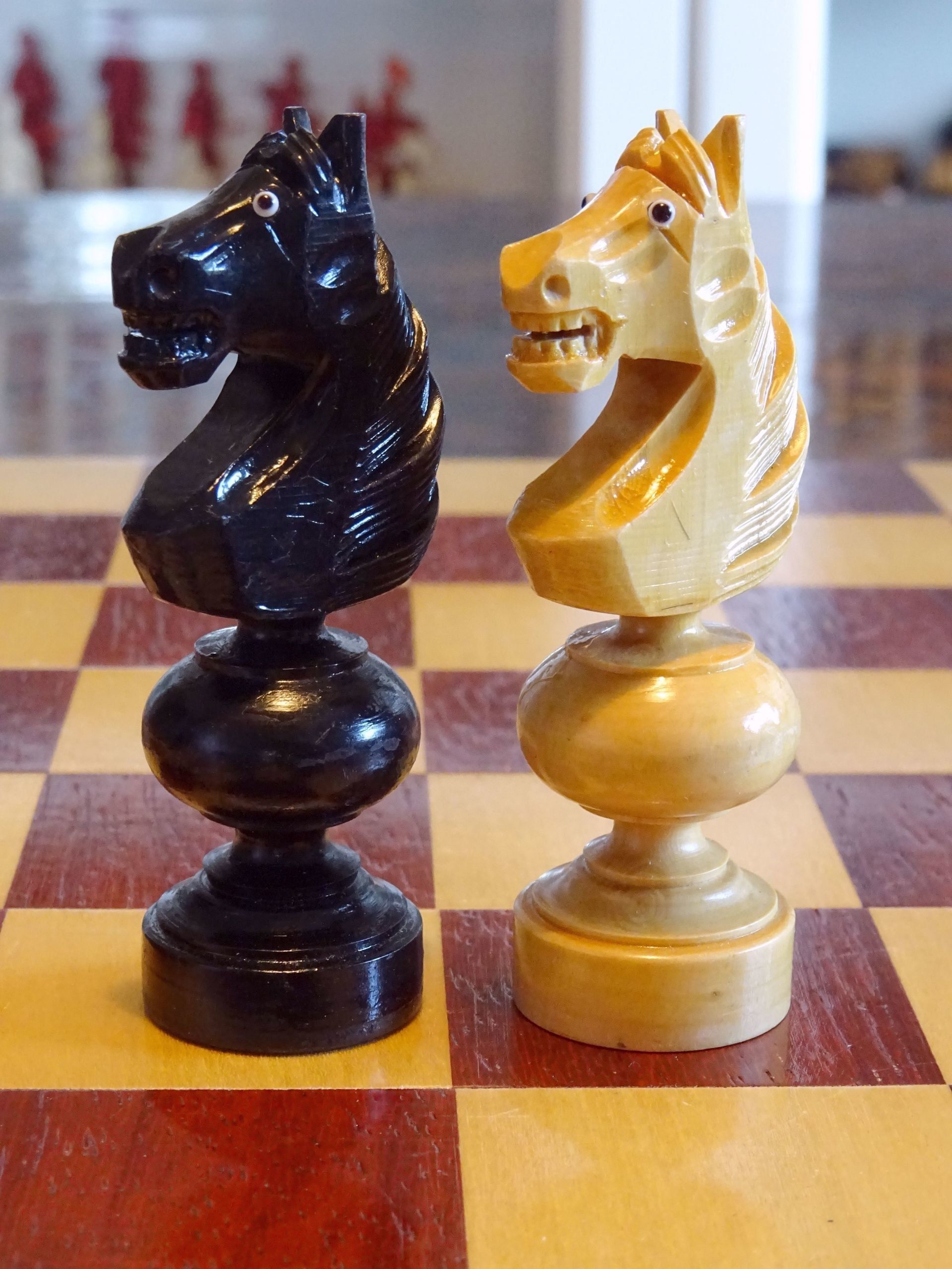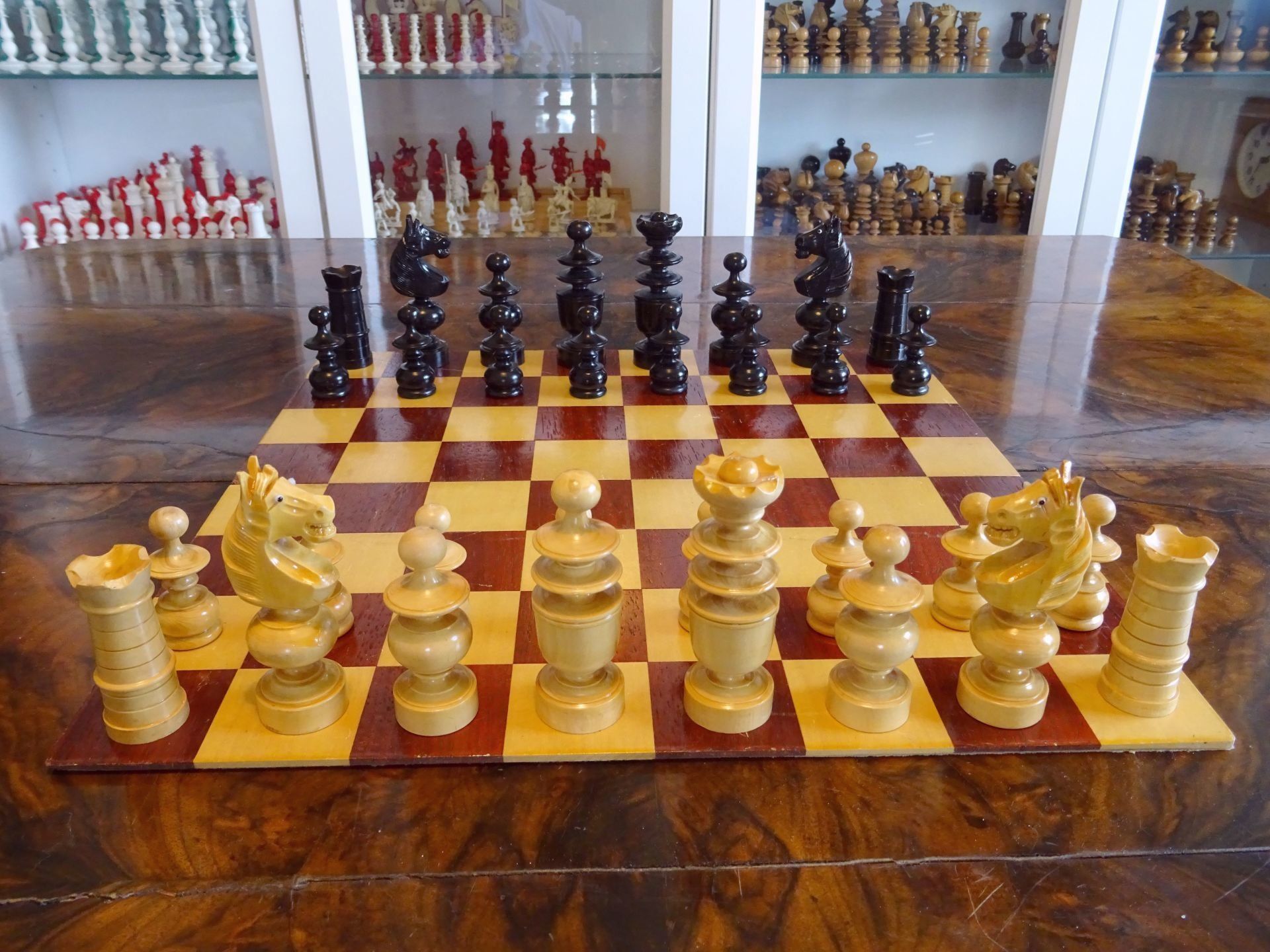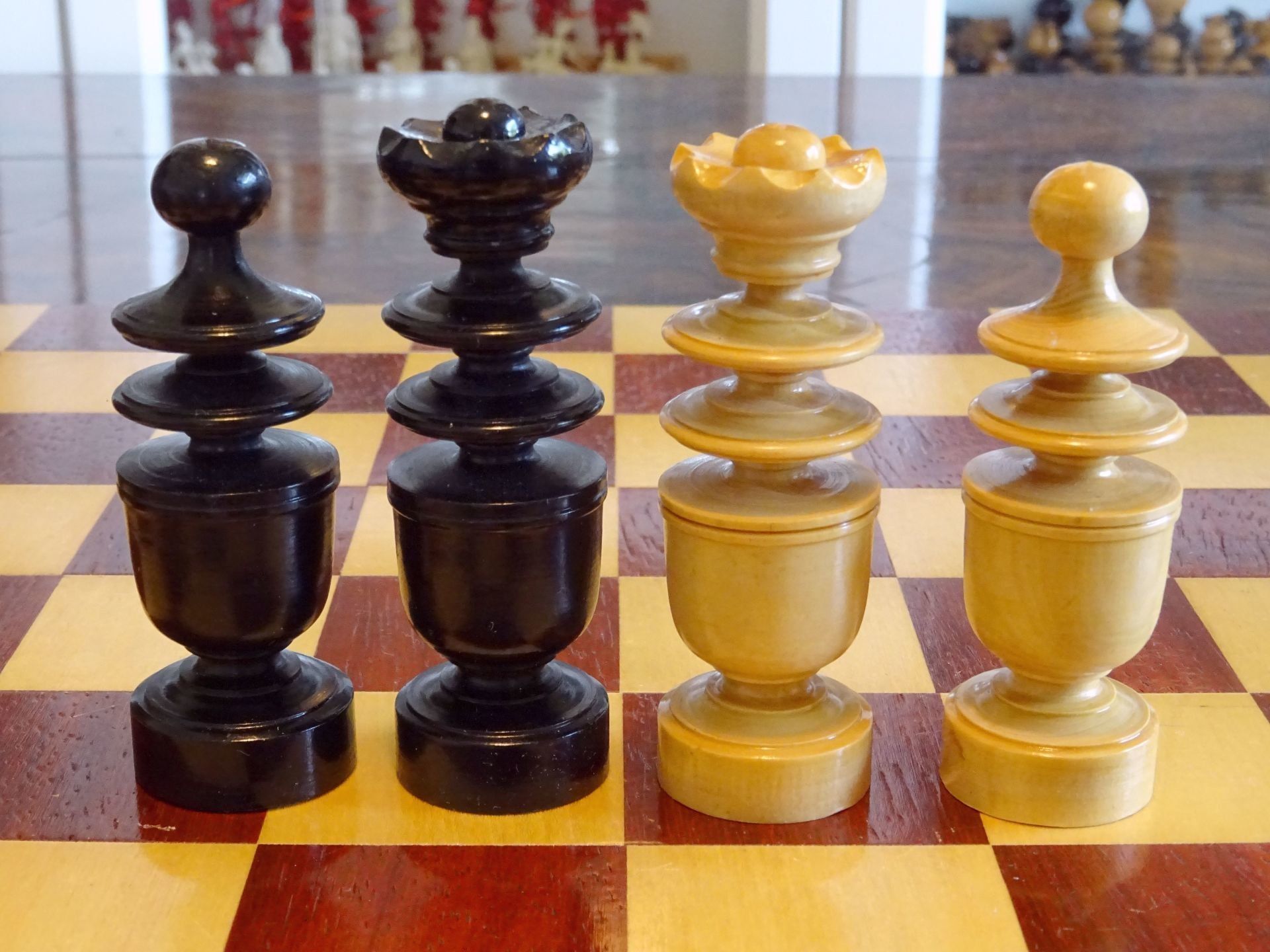 French chess set turned from boxwood and ebony, presumably from the early 20th century. The Kings with "Tulip Crowns" typical for Régence sets. The Knights with glass eyes and of very dominant height. Kings stand at approximately 3", the Knights just a tad shorter. The set is shown on a boxwood and mahogany roll up board of approximately the same period.