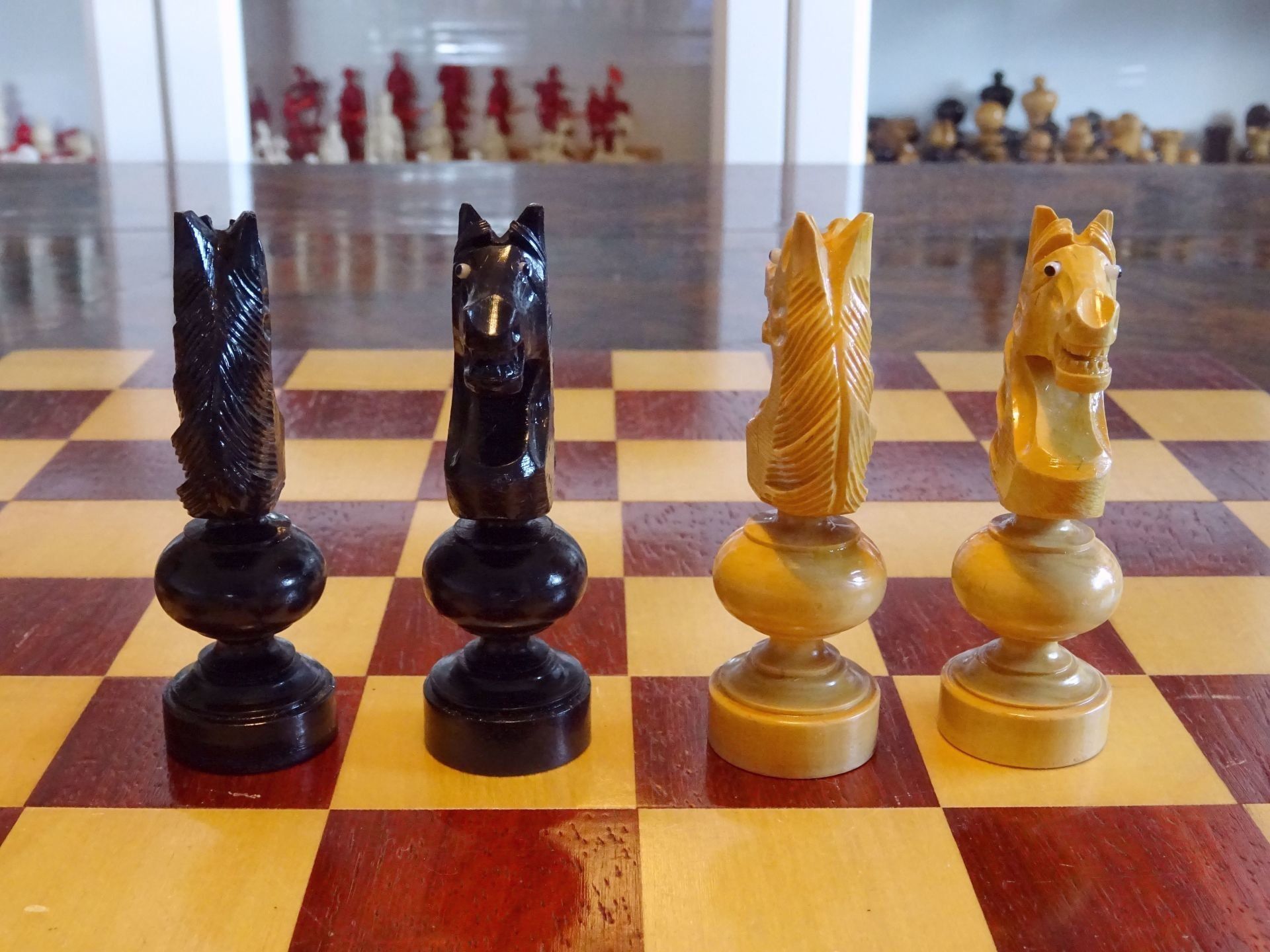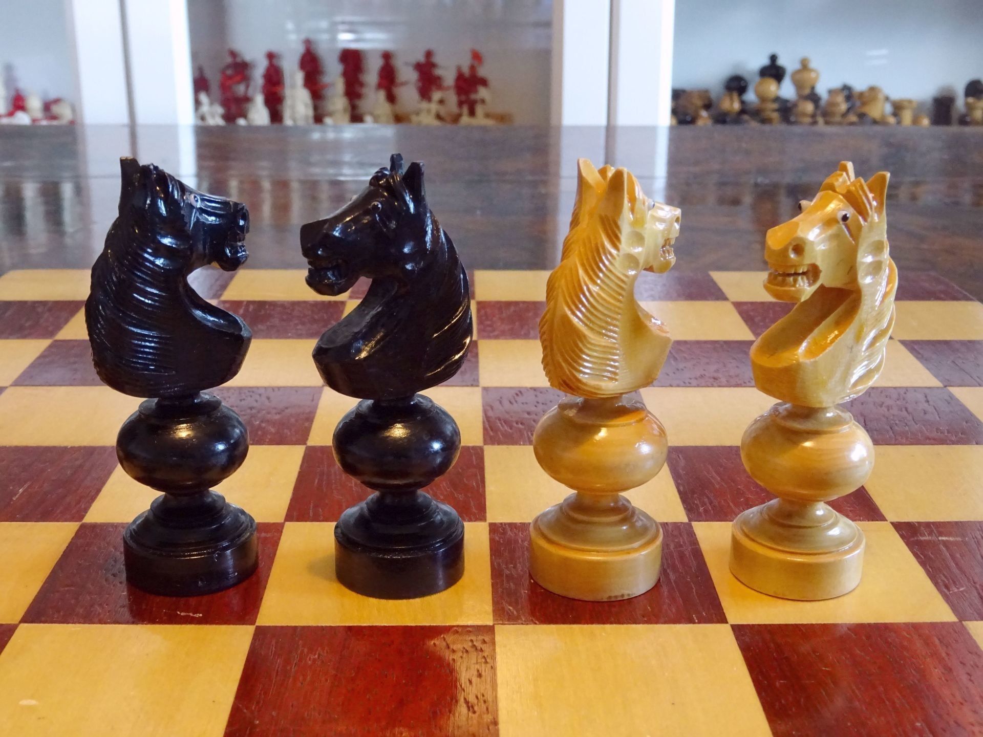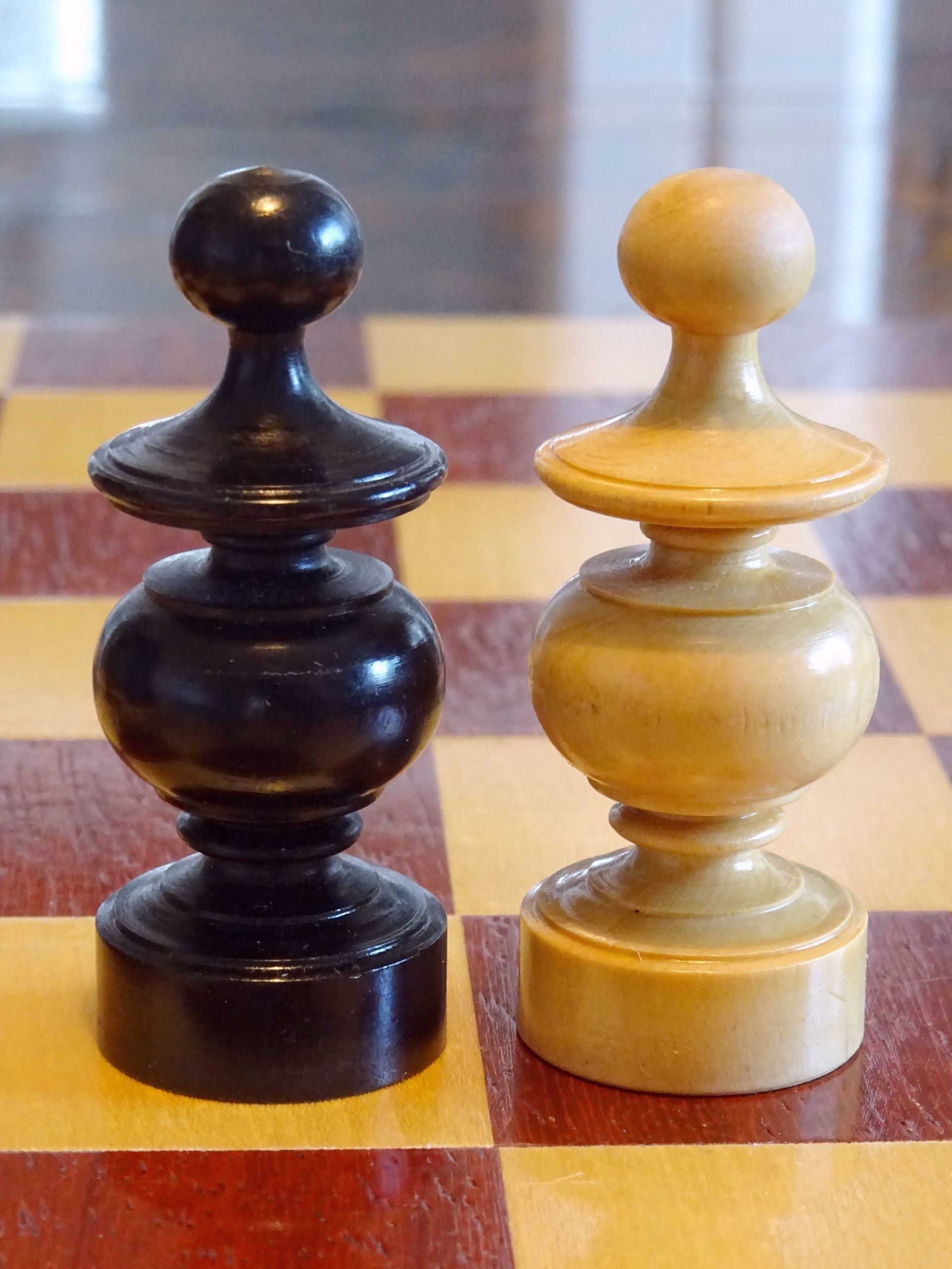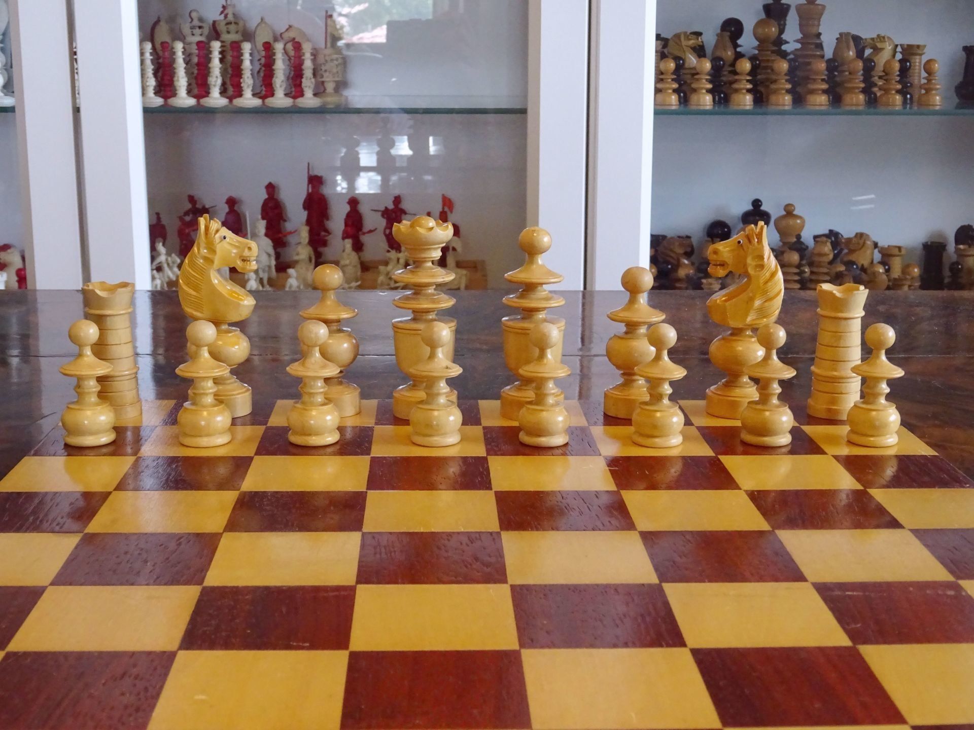 French chess set turned from boxwood and ebony, presumably from the early 20th century. The Kings with "Tulip Crowns" typical for Régence sets. The Knights with glass eyes and of very dominant height. Kings stand at approximately 3", the Knights just a tad shorter. The set is shown on a boxwood and mahogany roll up board of approximately the same period.