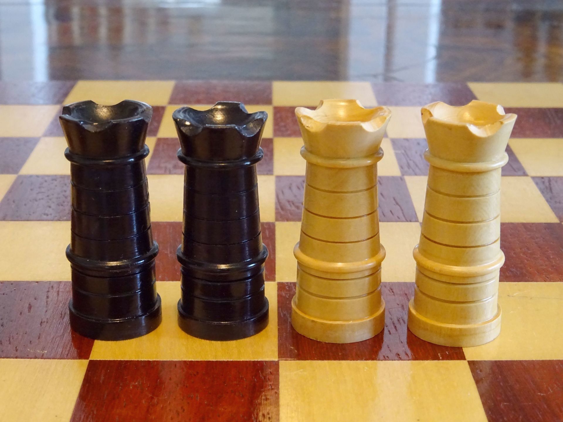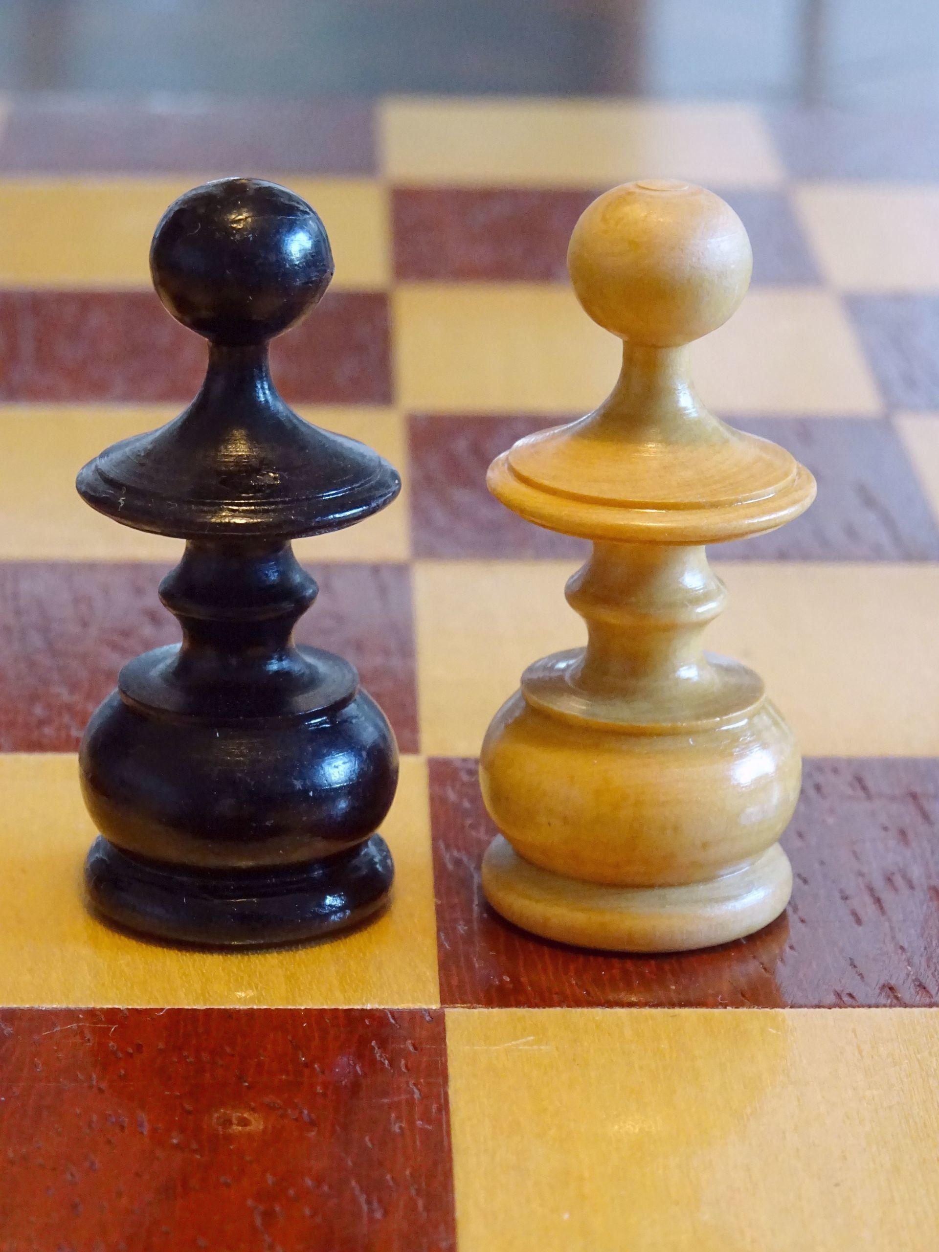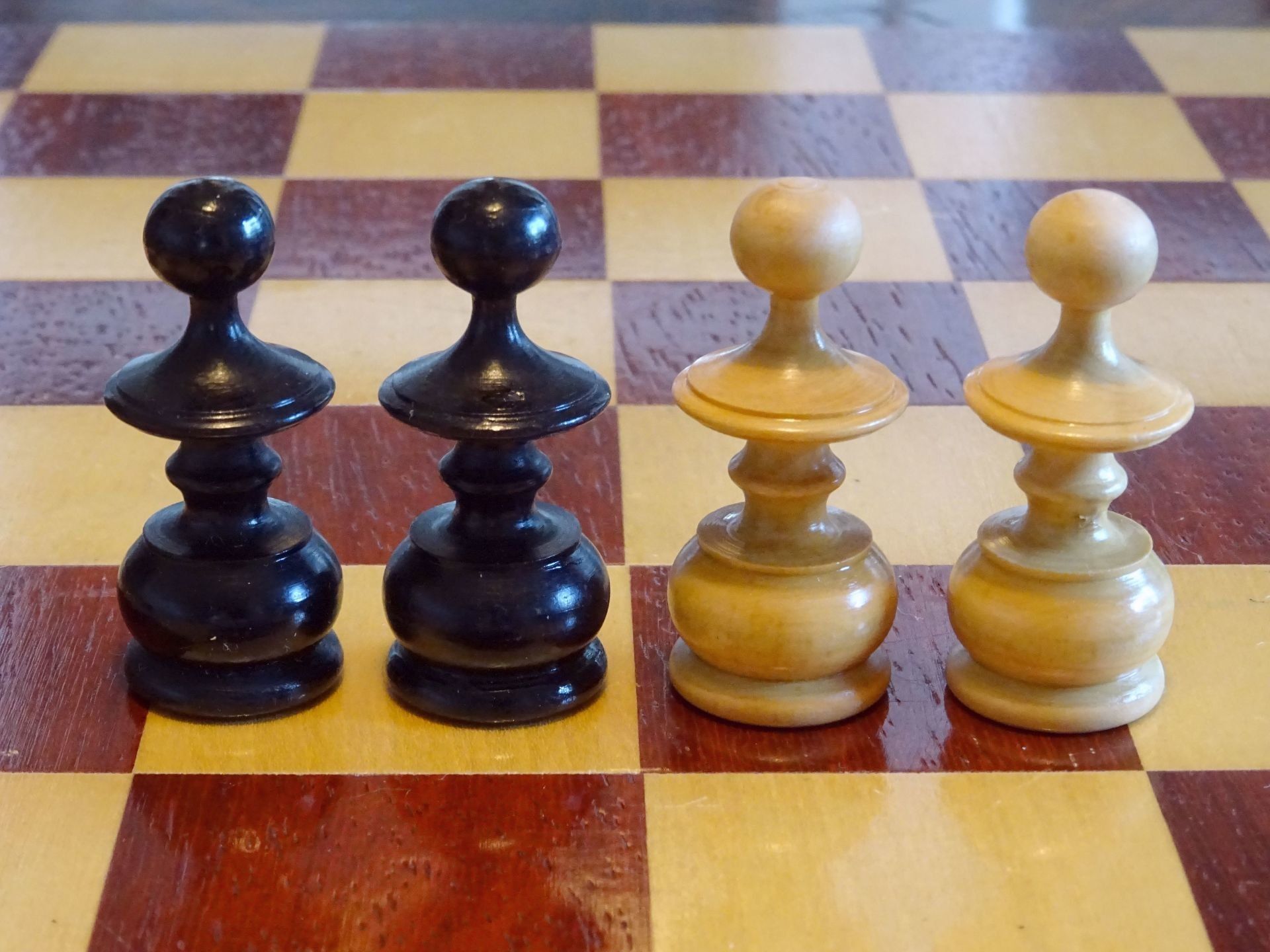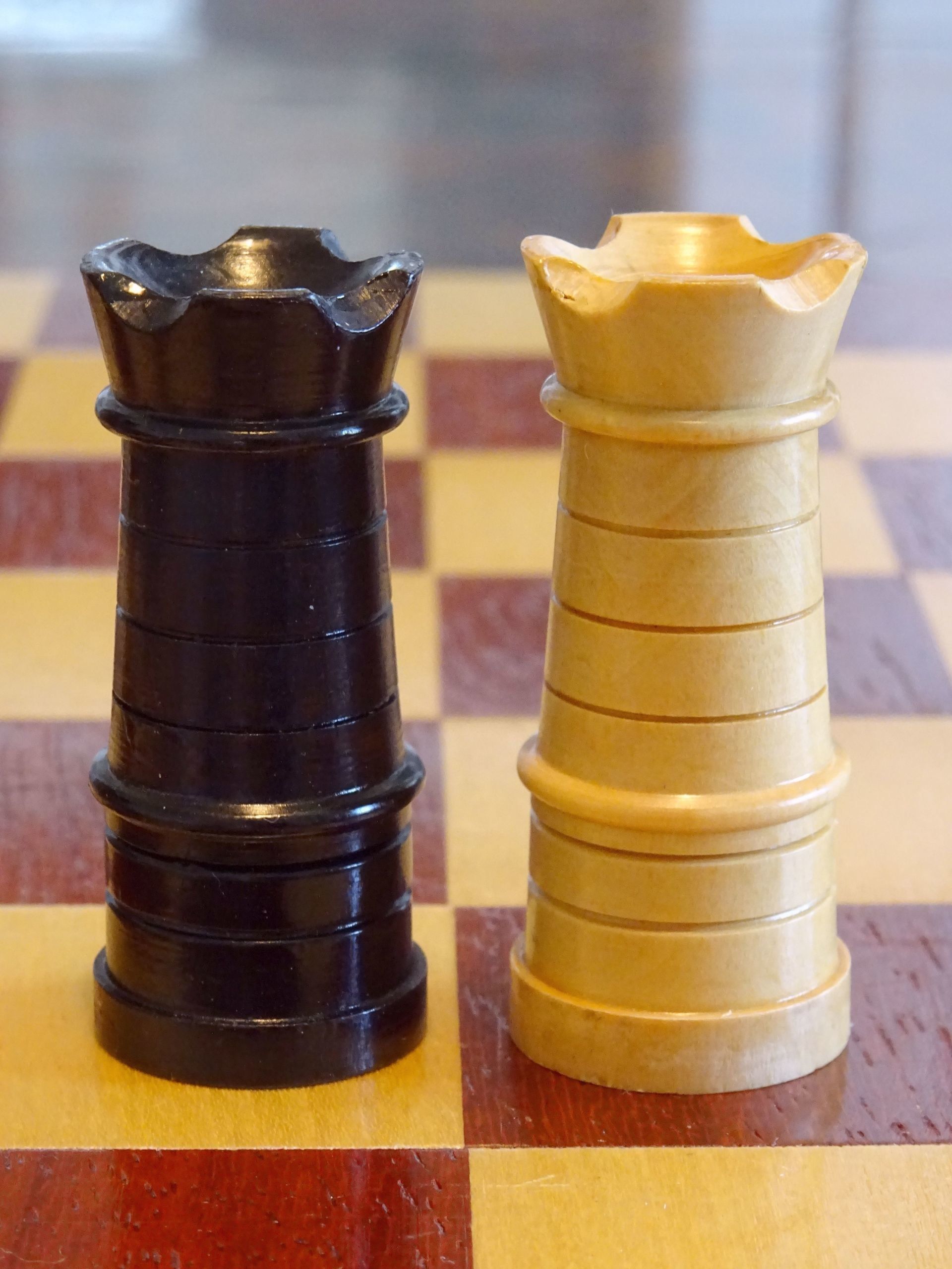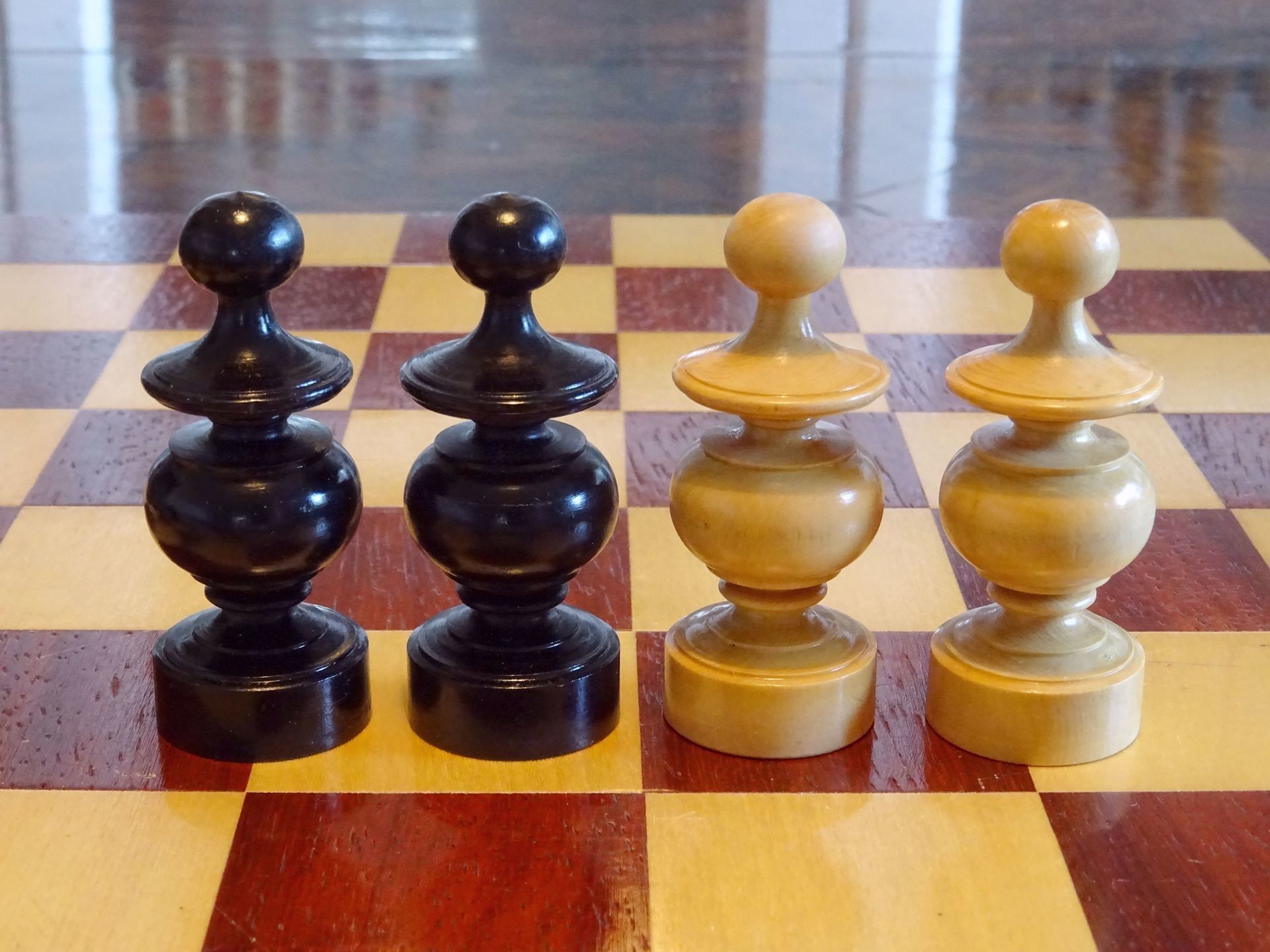 French chess set turned from boxwood and ebony, presumably from the early 20th century. The Kings with "Tulip Crowns" typical for Régence sets. The Knights with glass eyes and of very dominant height. Kings stand at approximately 3", the Knights just a tad shorter. The set is shown on a boxwood and mahogany roll up board of approximately the same period.