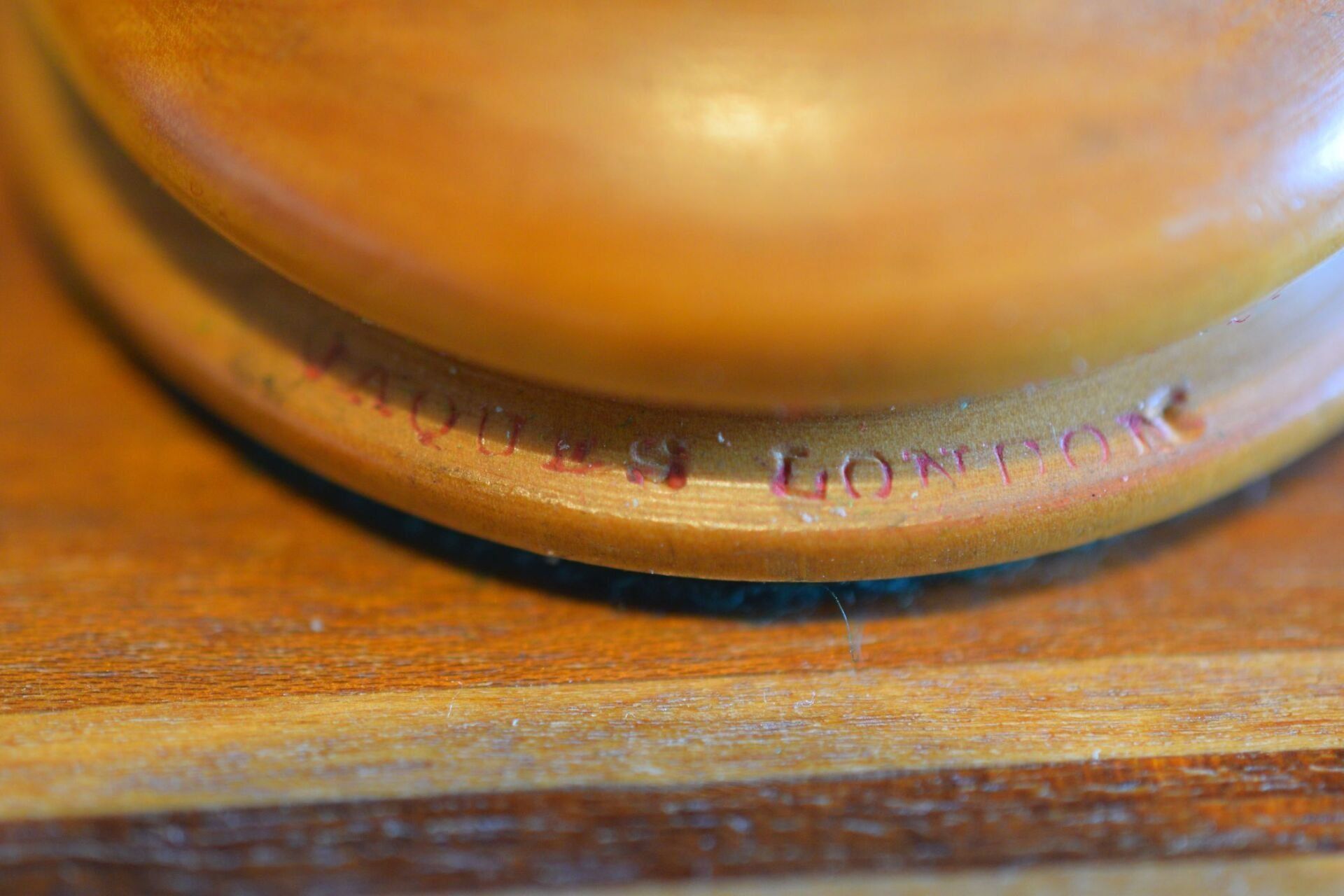 3.5" Jaques Staunton chess set in boxwood and ebony dating to ca. 1885-1890. Both kings stamped "Jaques London" on the side of the base. Rooks and knights with king side stamping. The set is not weighted and, unfortunately, did not come with an original box. It is a lovely set not to be missed nonetheless, in particular as the antique boxwood has developed a beautiful patina over the decades.