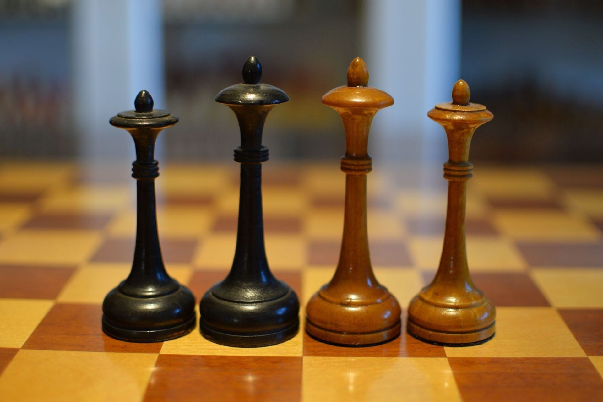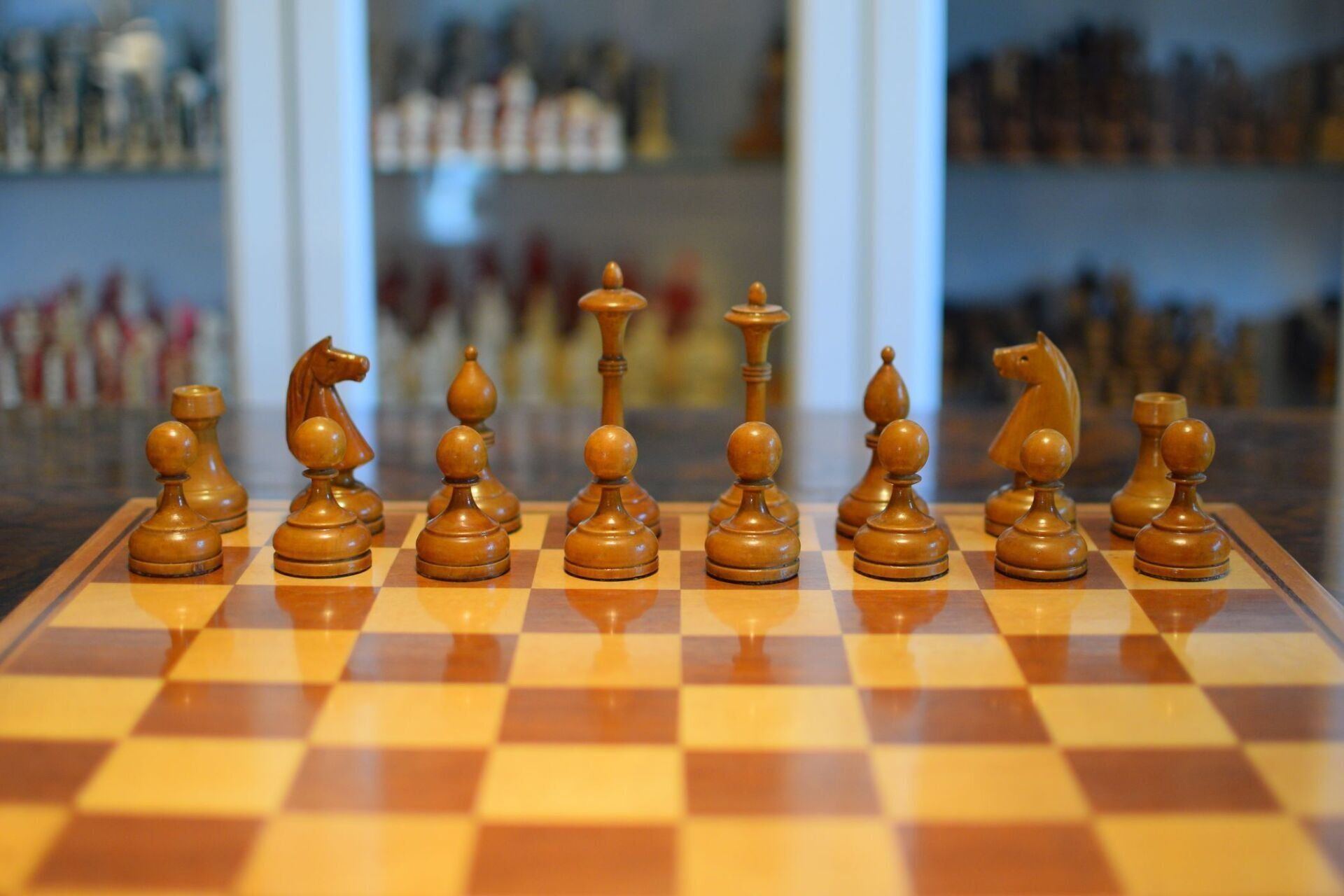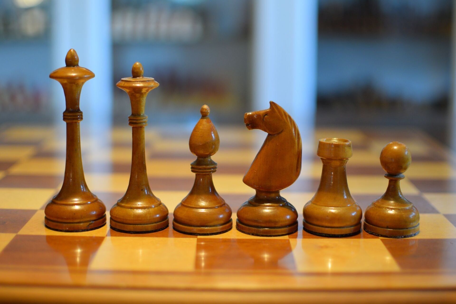 The true origin of this chess set's design seems to be a mystery. Nicholas Lanier called them "Svelte Pieces" and assumed these sets have Baltic-German roots, but it seems there is no conclusive evidence for that. Sometimes these sets are referred to as Soviet mushroom sets. What is certain is that these sets were well known in the Soviet Union. There is a famous picture by Robert Capa showing two boys playing with this type of set in a park in Moscow. The picture dates back to 1947, which makes me believe that the design is older and probably goes back to the 1930's. The set is weighted and has a king size of 10 cm.
