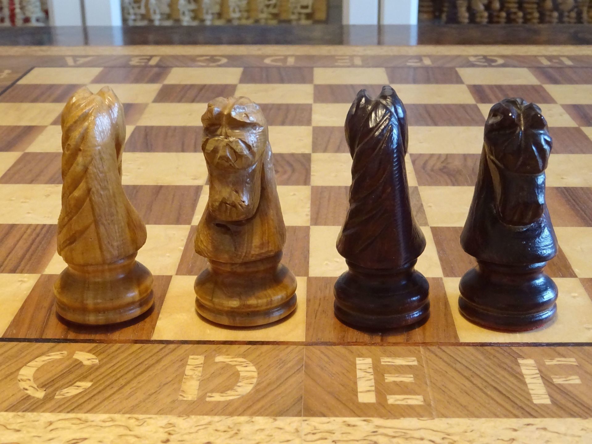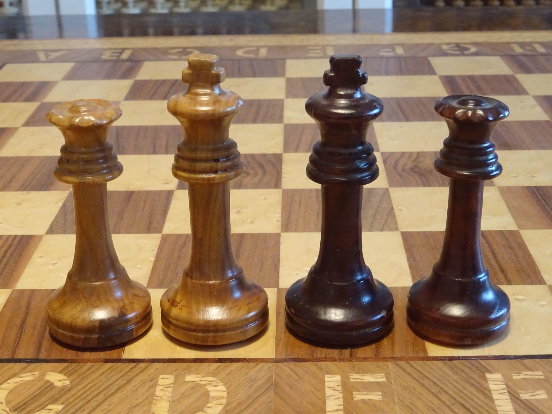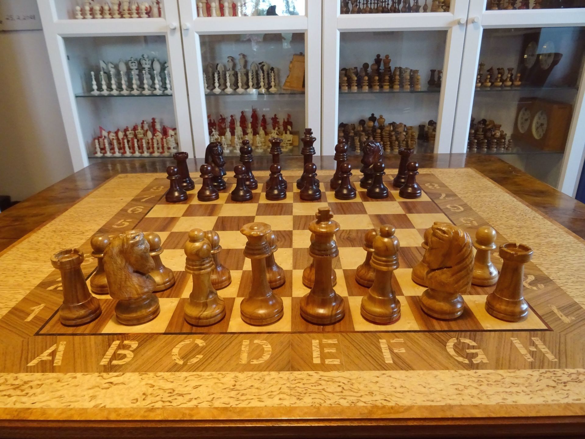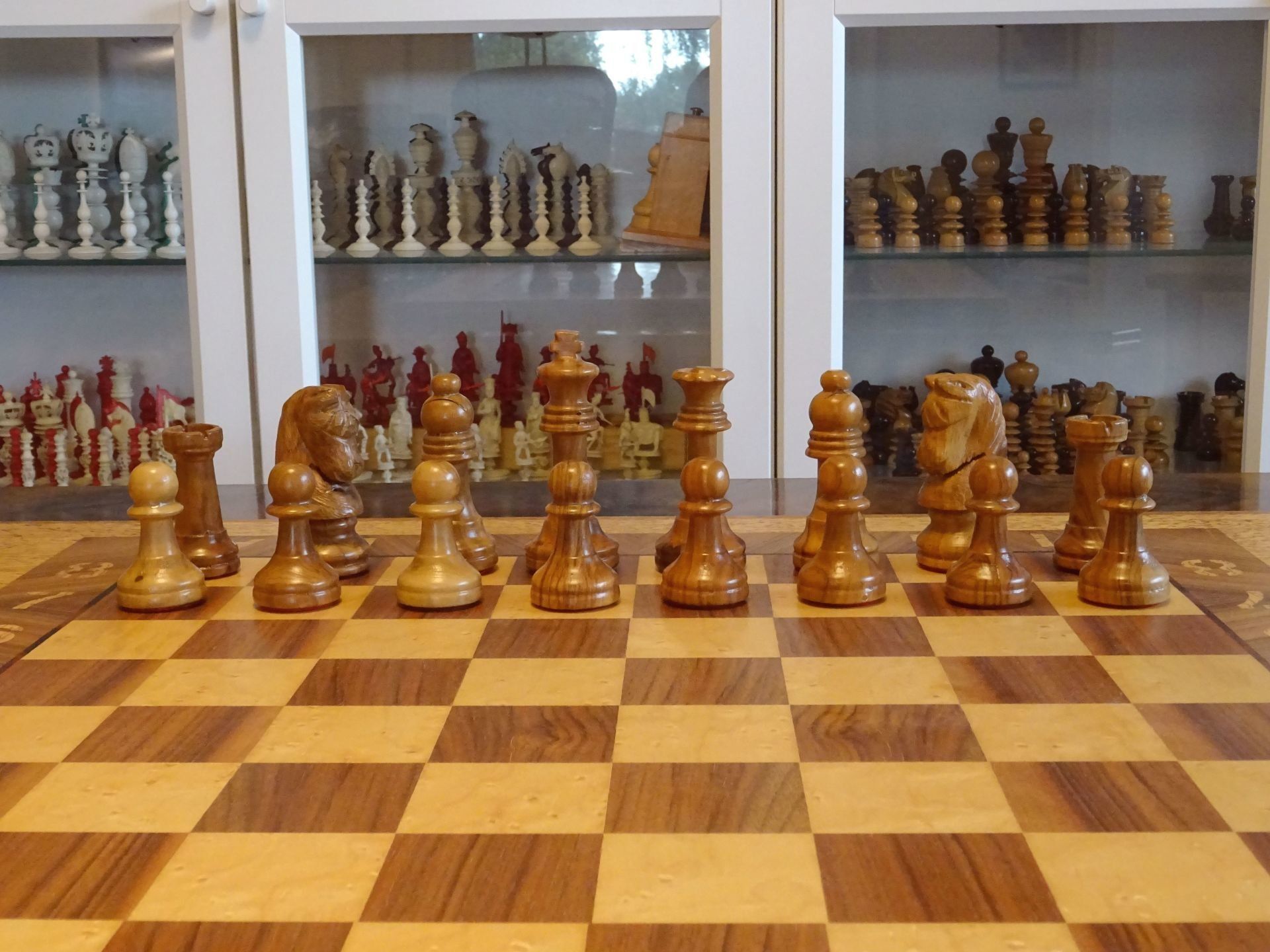 Spanish Staunton Set "Ajedrez Stawton No. 6" from Escardibul, most likely from the 1960's or 1970's. The set came in the usual black box with the golden "Escardibul" sticker. The pieces are made from olive wood, one side covered with a dark brown varnish. Very interesting chunky Knights in this one. King size is 90 mm. The set is not weighted.