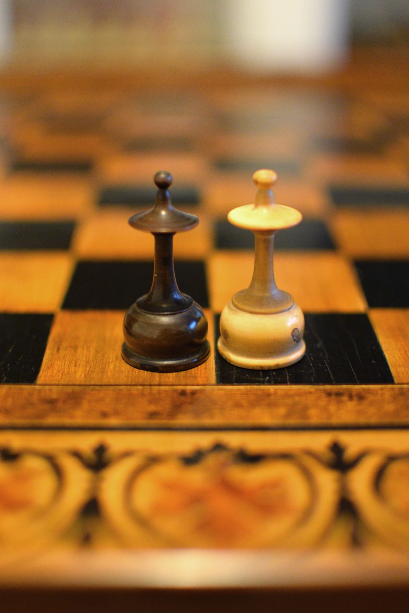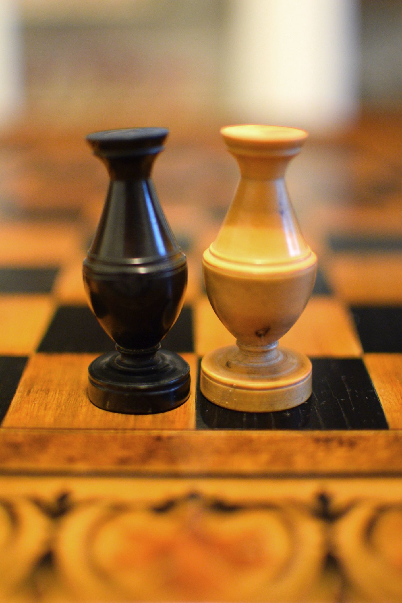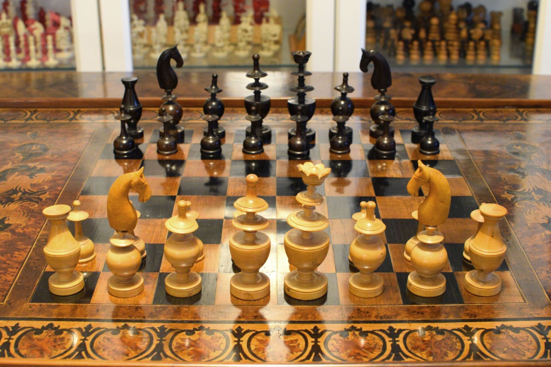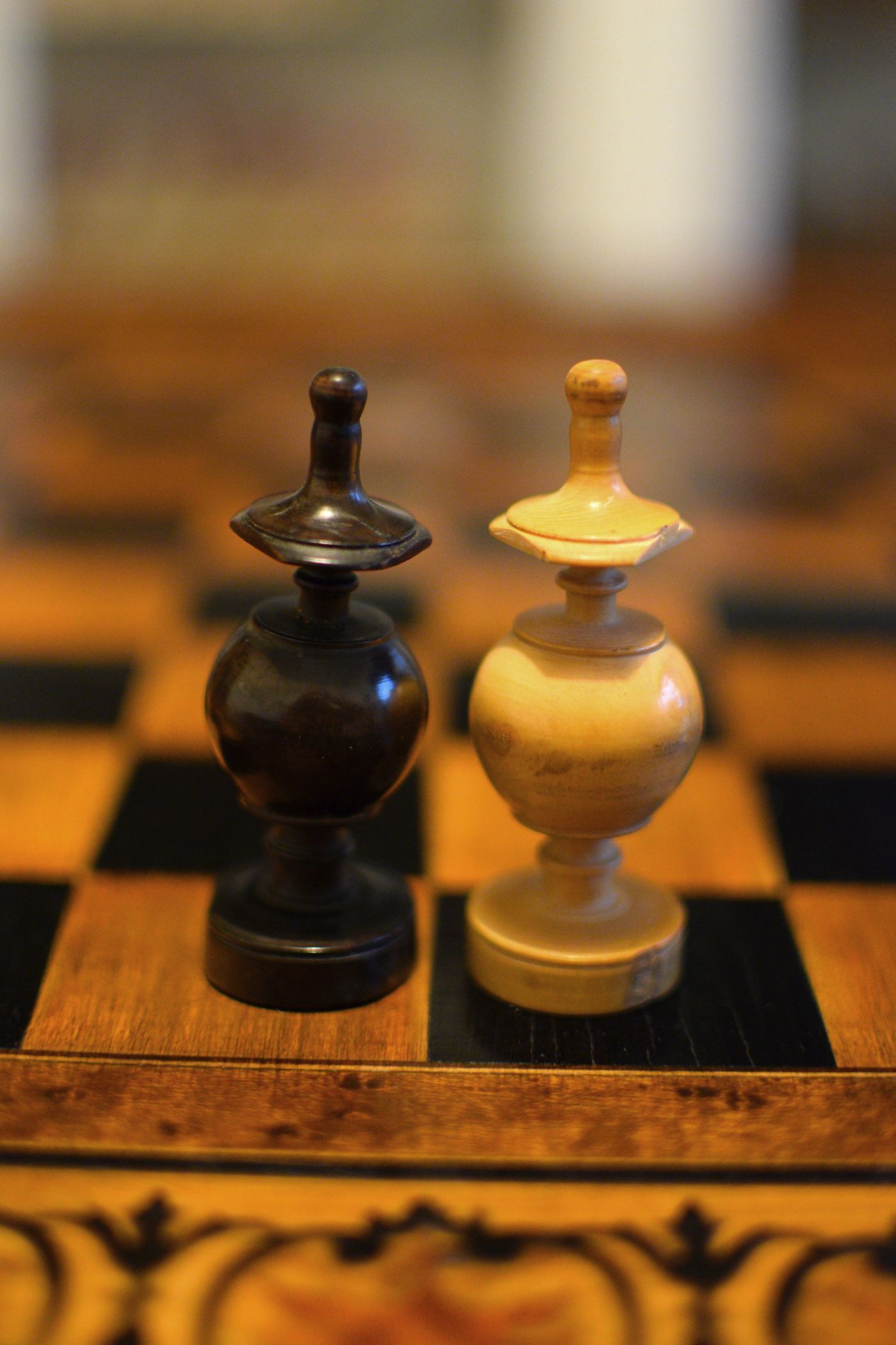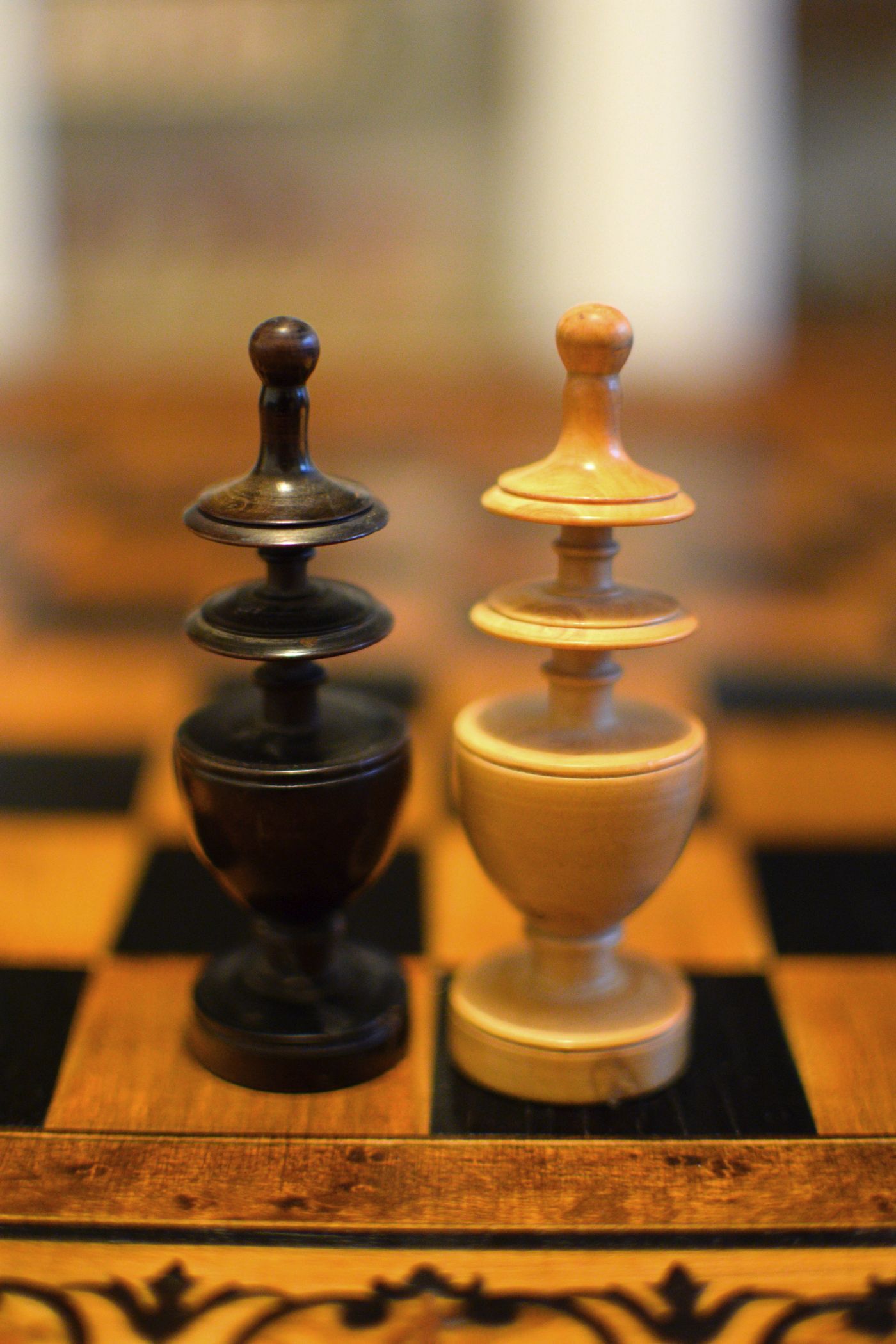 A French chess set made in the "Régence" pattern, named after the famous Café de la Régence in Paris. The pieces are turned from boxwood, one side stained in dark brown, most likely made in the late 18th or early 19th century in the St. Claude region (Jura) in France. Some pieces with the "lean" not untypical for French boxwood pieces. King size is 86 mm. The Kings and Queens with urn shaped bases and circular collars on a slim stem, the Kings with a finely carved "Tulip Crown", typical for this type of set, the Queen with bulb top finials. The Rooks as rather unusual baluster shaped towers on a circular pedestal. The Knights and Bishops with spherical bases on a small circular pedestal. The Knights extremely tall and with a height of 90mm taller than the kings. The Bishops with bulb top finials and circular collars, parts of which were traditionally cut out, allegedly to symbolize the waning influence of the clergy due to the Enlightenment (cf. Kloprogge, Chessmen - Art and History, p. 101). The Pawns with slim stems on broad bases and bulb top finials.