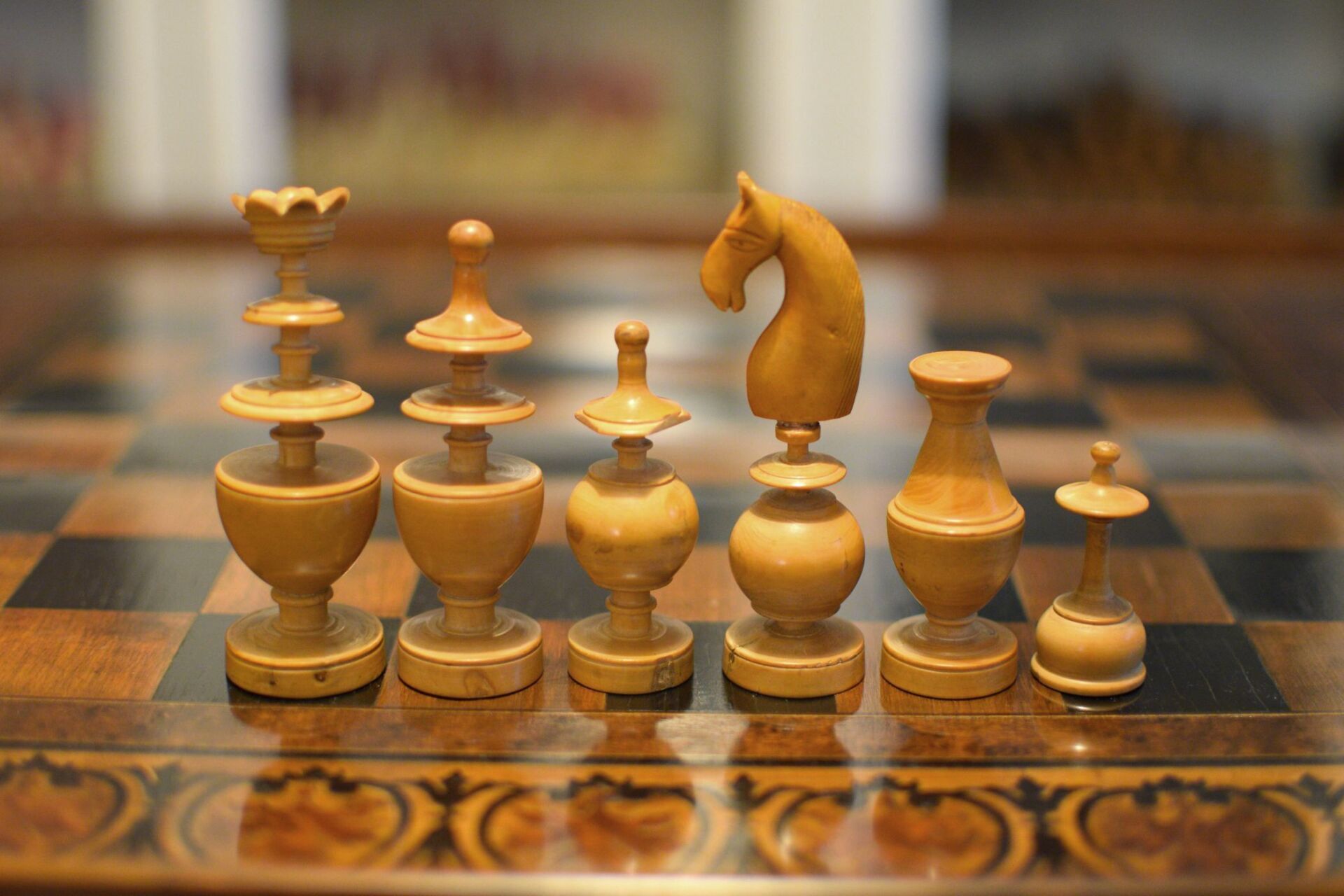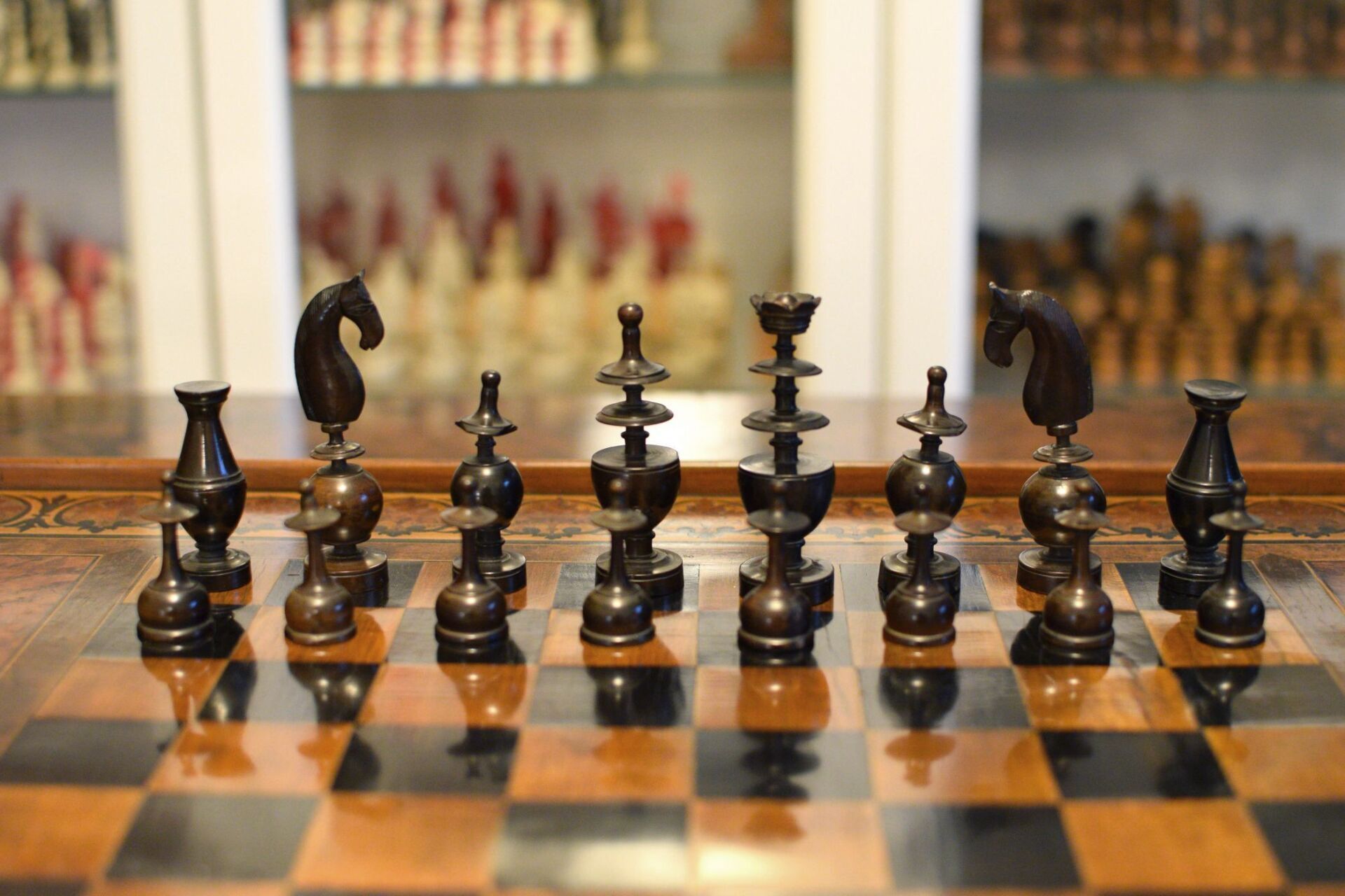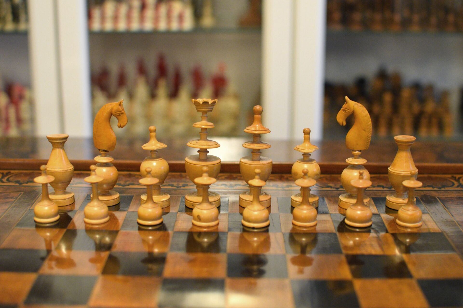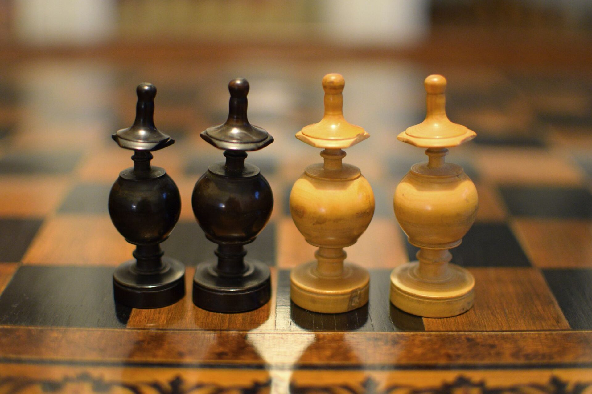 A French chess set made in the "Régence" pattern, named after the famous Café de la Régence in Paris. The pieces are turned from boxwood, one side stained in dark brown, most likely made in the late 18th or early 19th century in the St. Claude region (Jura) in France. Some pieces with the "lean" not untypical for French boxwood pieces. King size is 86 mm. The Kings and Queens with urn shaped bases and circular collars on a slim stem, the Kings with a finely carved "Tulip Crown", typical for this type of set, the Queen with bulb top finials. The Rooks as rather unusual baluster shaped towers on a circular pedestal. The Knights and Bishops with spherical bases on a small circular pedestal. The Knights extremely tall and with a height of 90mm taller than the kings. The Bishops with bulb top finials and circular collars, parts of which were traditionally cut out, allegedly to symbolize the waning influence of the clergy due to the Enlightenment (cf. Kloprogge, Chessmen - Art and History, p. 101). The Pawns with slim stems on broad bases and bulb top finials.