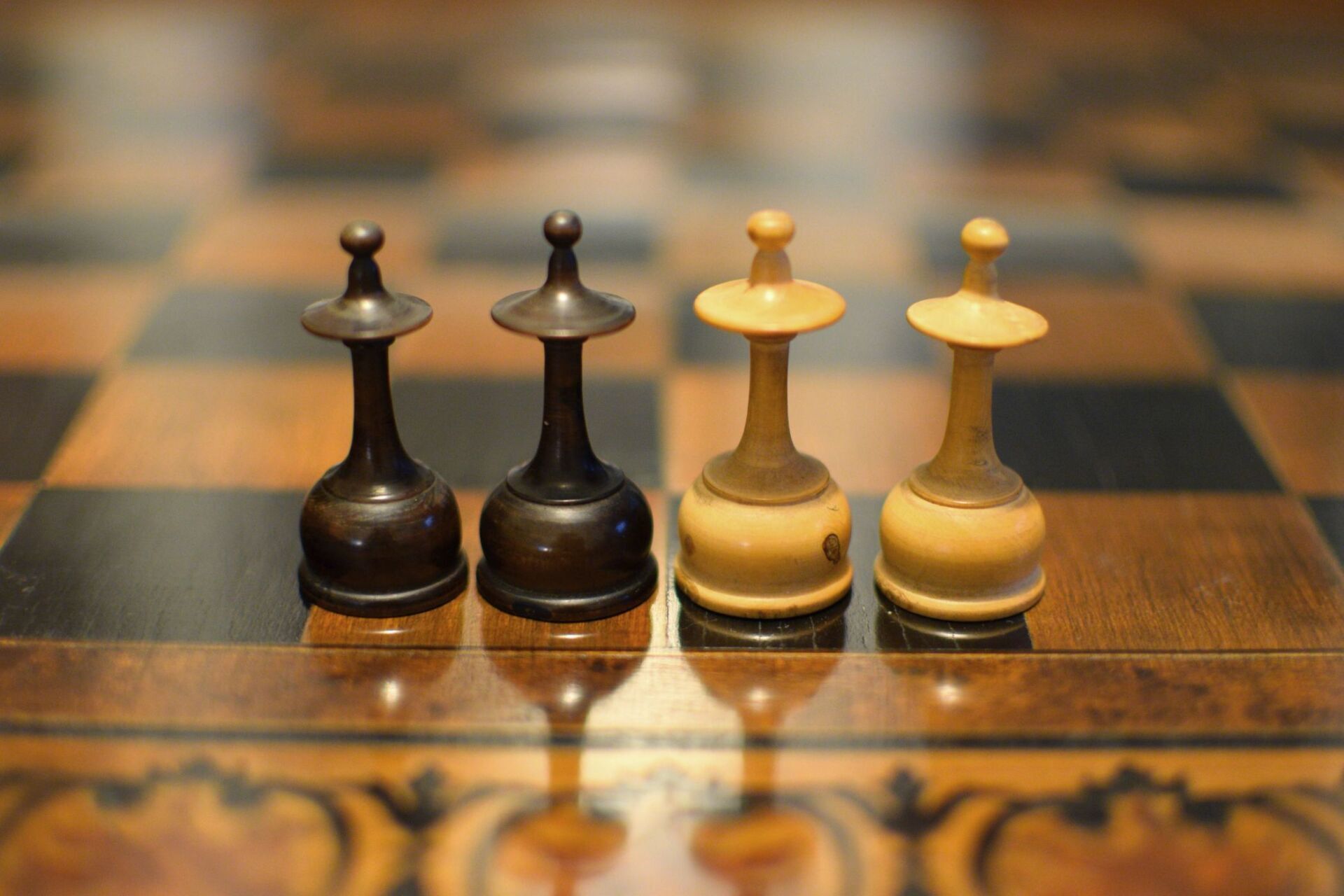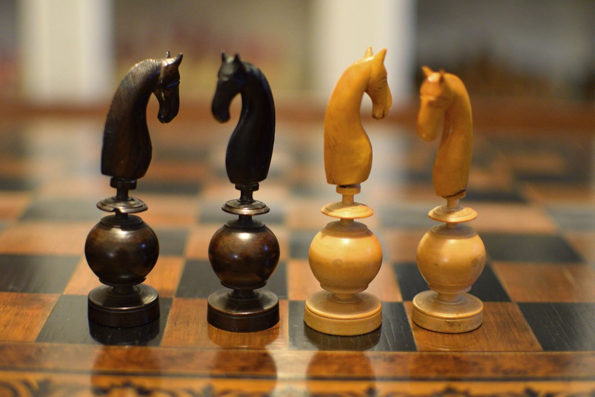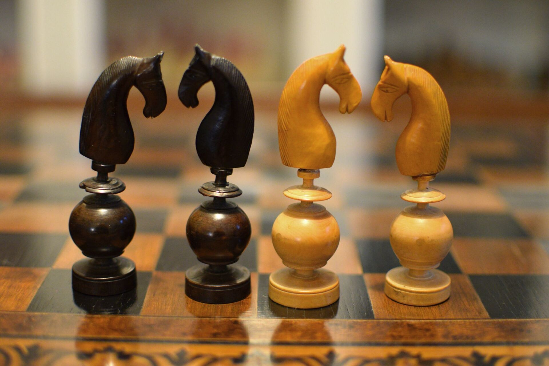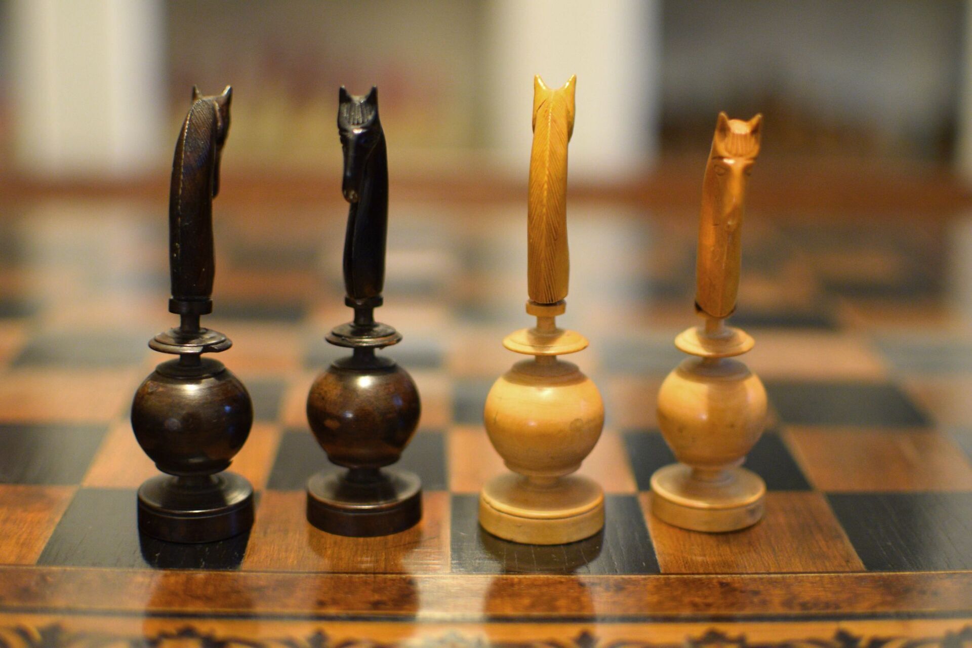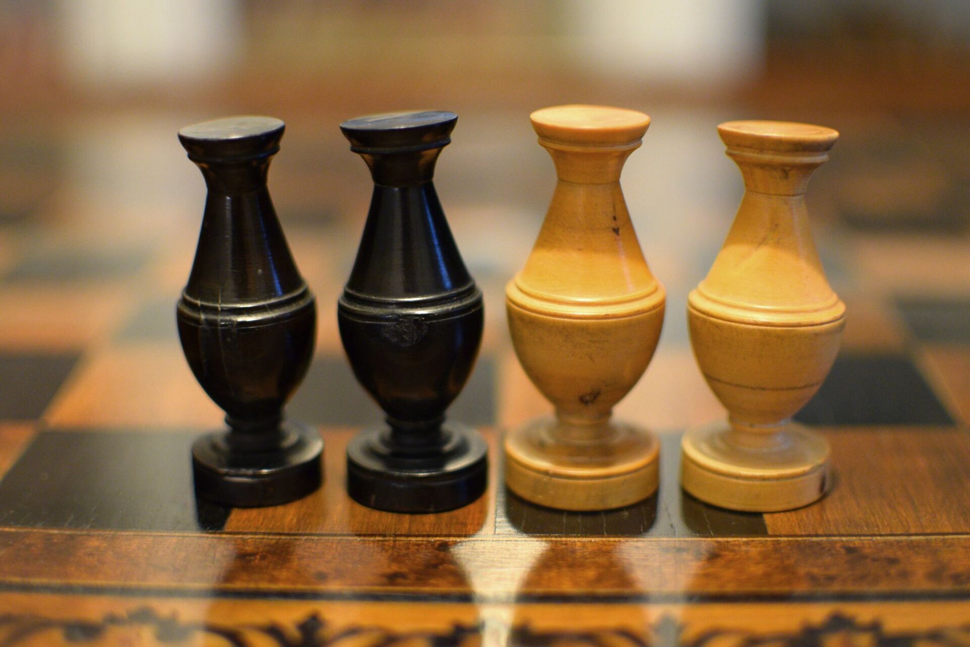 A French chess set made in the "Régence" pattern, named after the famous Café de la Régence in Paris. The pieces are turned from boxwood, one side stained in dark brown, most likely made in the late 18th or early 19th century in the St. Claude region (Jura) in France. Some pieces with the "lean" not untypical for French boxwood pieces. King size is 86 mm. The Kings and Queens with urn shaped bases and circular collars on a slim stem, the Kings with a finely carved "Tulip Crown", typical for this type of set, the Queen with bulb top finials. The Rooks as rather unusual baluster shaped towers on a circular pedestal. The Knights and Bishops with spherical bases on a small circular pedestal. The Knights extremely tall and with a height of 90mm taller than the kings. The Bishops with bulb top finials and circular collars, parts of which were traditionally cut out, allegedly to symbolize the waning influence of the clergy due to the Enlightenment (cf. Kloprogge, Chessmen - Art and History, p. 101). The Pawns with slim stems on broad bases and bulb top finials.
