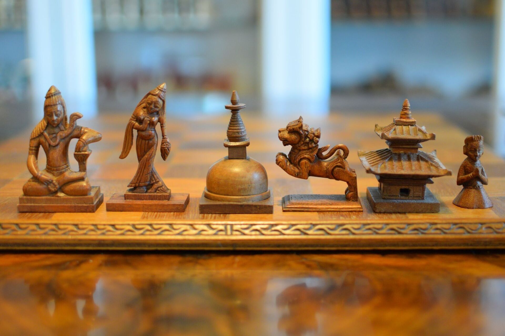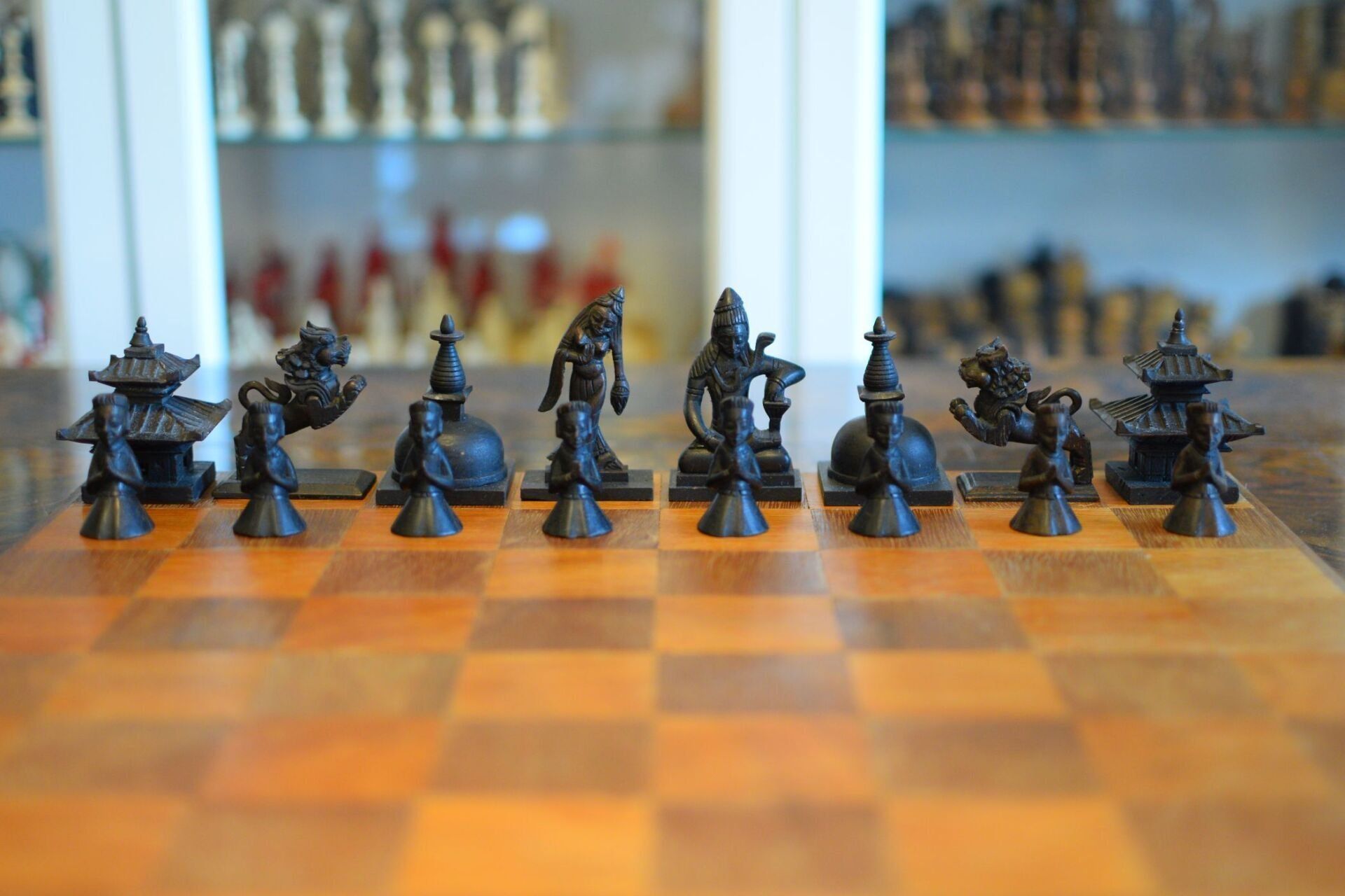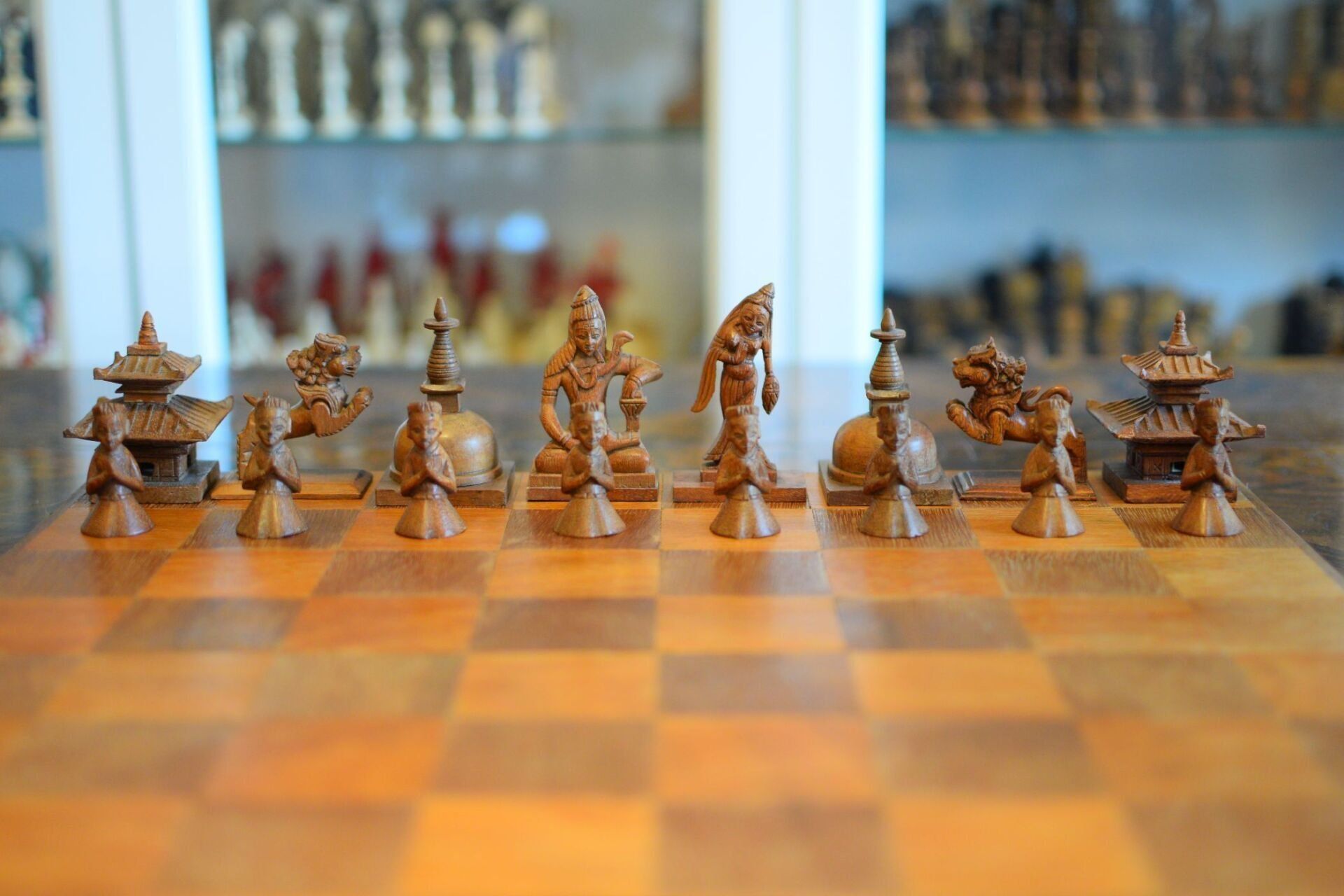 Here is an interesting figural chess set with Asian motifs. The same type of set is shown in Ned Munger's Cultures, Chess & Art - Vol. 3 Pacific Islands & Asia in fig. 75. He attributes this chess set to Cambodia, because the queen in the set is shown as a female dancer, which Ned Munger identifies as an "apsara", a classical female dancer in the Cambodian mythology. I am afraid that this is one of the very few examples, in which Ned Munger is wrong. The set is of Nepalese origin. The rooks and bishops are designed as temples, which show two of the main architectural styles of Nepalese temples. The bishops are temples in the Stupa style, characterised by a typical hemispherical dome shape with a pyramid-like structure on top and a square base. Believed to have been introduced by Emperor Ashoka in Nepal, this style is said to represent the five elements of Buddhism, namely, earth, water, fire, air and space. This one resembles the Stupa of Bodnath in the Kathmandu vicinity in particular. The rooks are temples in the Pagoda style and I believe they are meant to represent the Changu Narayan temple. I come to this conclusion for a specific reason, which is the design of the king. The king is depicted as a seated deity with a snake chain, which bears great resemblance to a statue of the praying Garuda with the snake god Takshaka, which is located in said Changu Narayan temple in the Kathmandu Valley. The queens, as already mentioned, are shown as female dancers, very much resembling Nepalese Maruni dancers, which are characterised by hats with long scarves attached to them. The knights are leaping Nepalese temple lions. The pawns are peasants kneeling in prayer.