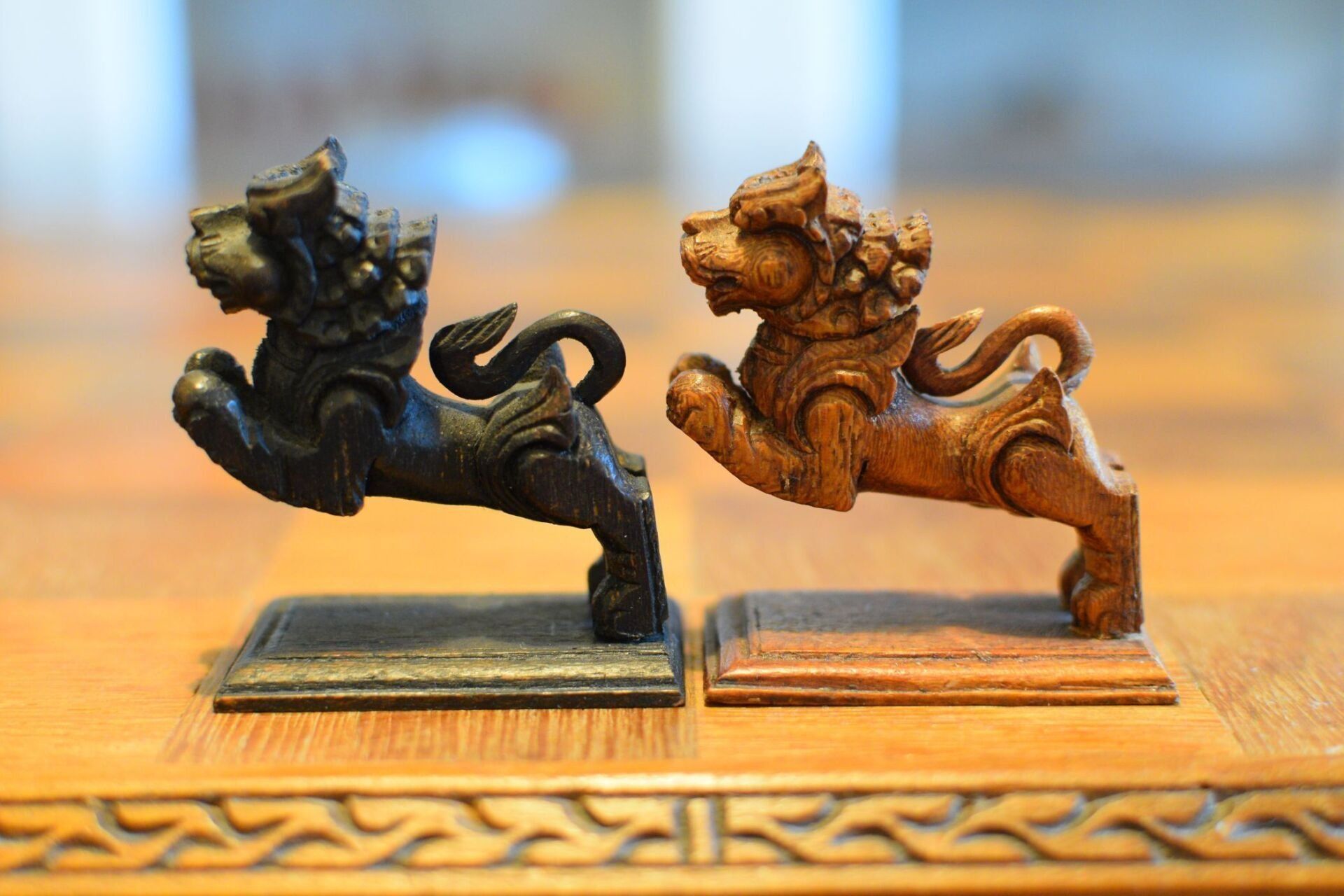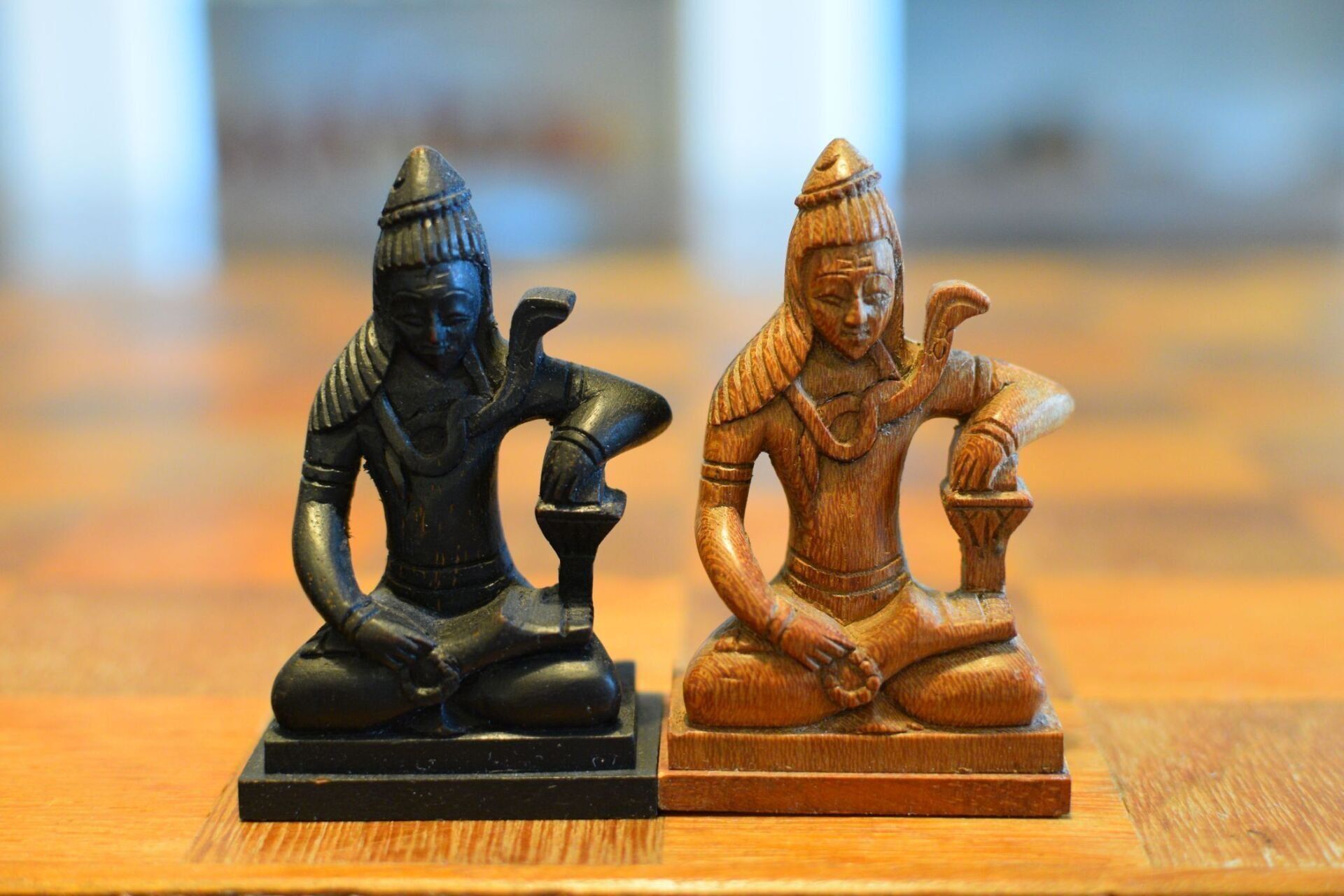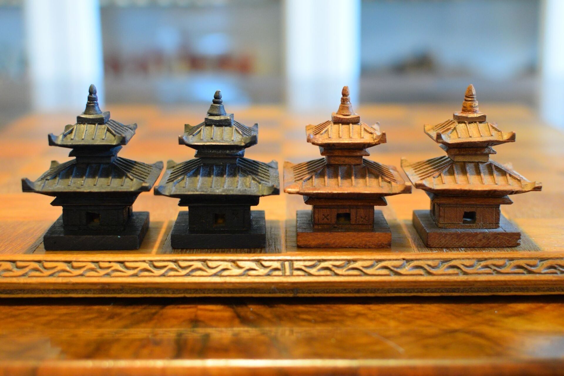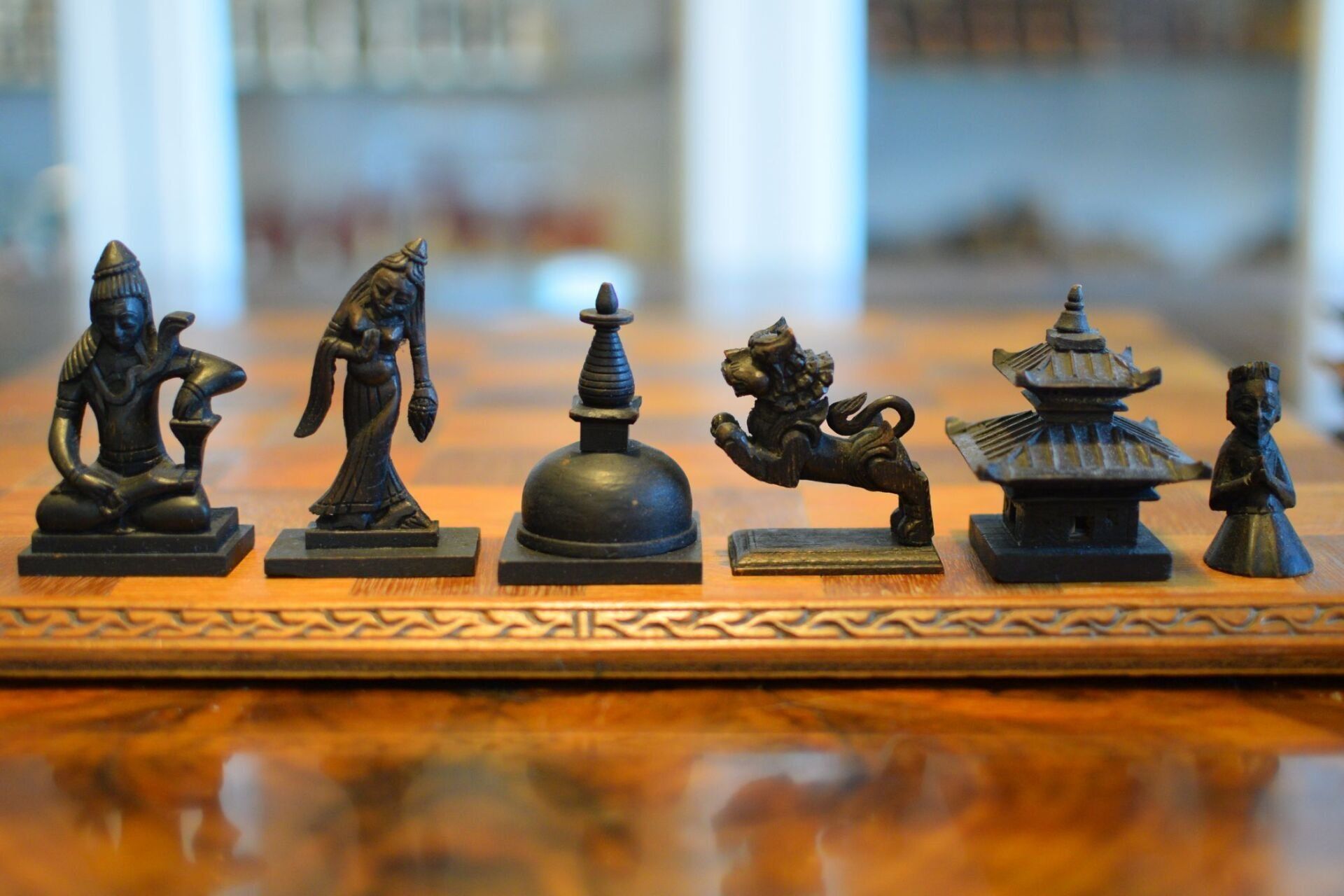 Here is an interesting figural chess set with Asian motifs. The same type of set is shown in Ned Munger's Cultures, Chess & Art - Vol. 3 Pacific Islands & Asia in fig. 75. He attributes this chess set to Cambodia, because the queen in the set is shown as a female dancer, which Ned Munger identifies as an "apsara", a classical female dancer in the Cambodian mythology. I am afraid that this is one of the very few examples, in which Ned Munger is wrong. The set is of Nepalese origin. The rooks and bishops are designed as temples, which show two of the main architectural styles of Nepalese temples. The bishops are temples in the Stupa style, characterised by a typical hemispherical dome shape with a pyramid-like structure on top and a square base. Believed to have been introduced by Emperor Ashoka in Nepal, this style is said to represent the five elements of Buddhism, namely, earth, water, fire, air and space. This one resembles the Stupa of Bodnath in the Kathmandu vicinity in particular. The rooks are temples in the Pagoda style and I believe they are meant to represent the Changu Narayan temple. I come to this conclusion for a specific reason, which is the design of the king. The king is depicted as a seated deity with a snake chain, which bears great resemblance to a statue of the praying Garuda with the snake god Takshaka, which is located in said Changu Narayan temple in the Kathmandu Valley. The queens, as already mentioned, are shown as female dancers, very much resembling Nepalese Maruni dancers, which are characterised by hats with long scarves attached to them. The knights are leaping Nepalese temple lions. The pawns are peasants kneeling in prayer.