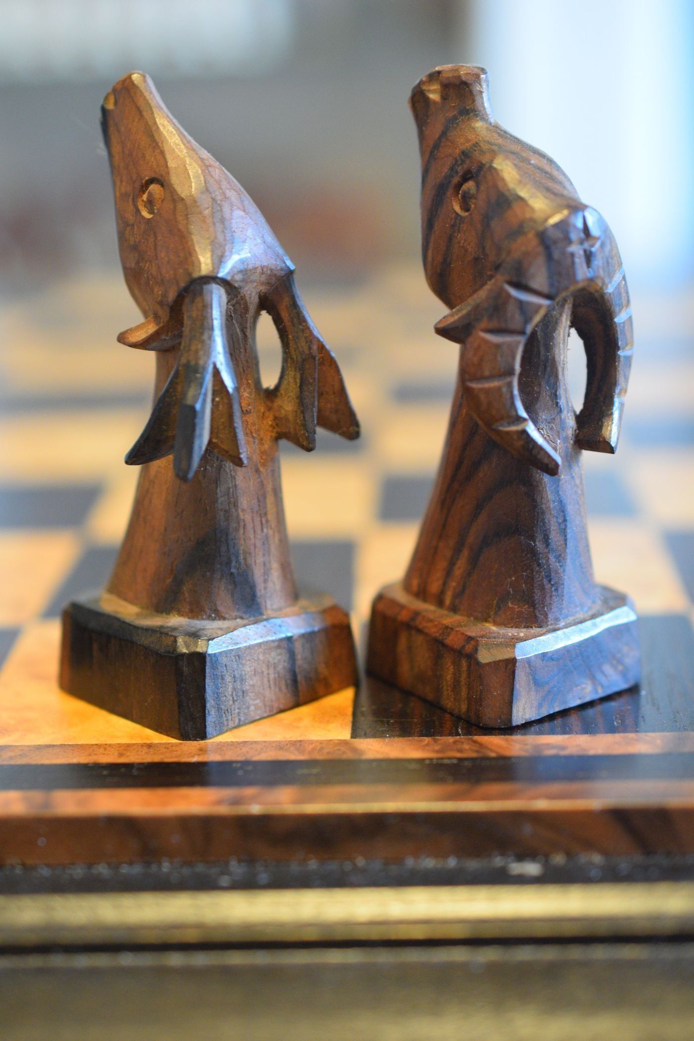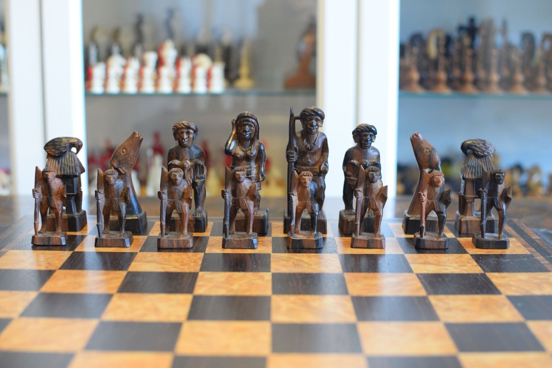Philippine tribal chess set which was made by a local artist in the Banaue region in Northern Luzon. When the set was purchased in the 1970's its maker had recently deceased, as he was a guerilla fighter engaged in combat against the Marcos regime. It was one of the last sets he made and was sold to the last owner by the carver's widow. The pieces are hand carved from local ebony timbers, in particular kamagong for the black pieces and a lighter ebony with a dark grain for the white pieces. Distinguishing the pieces by the colour of the wood is difficult, which is of secondary importance, however, as the set is mainly a decorative one.