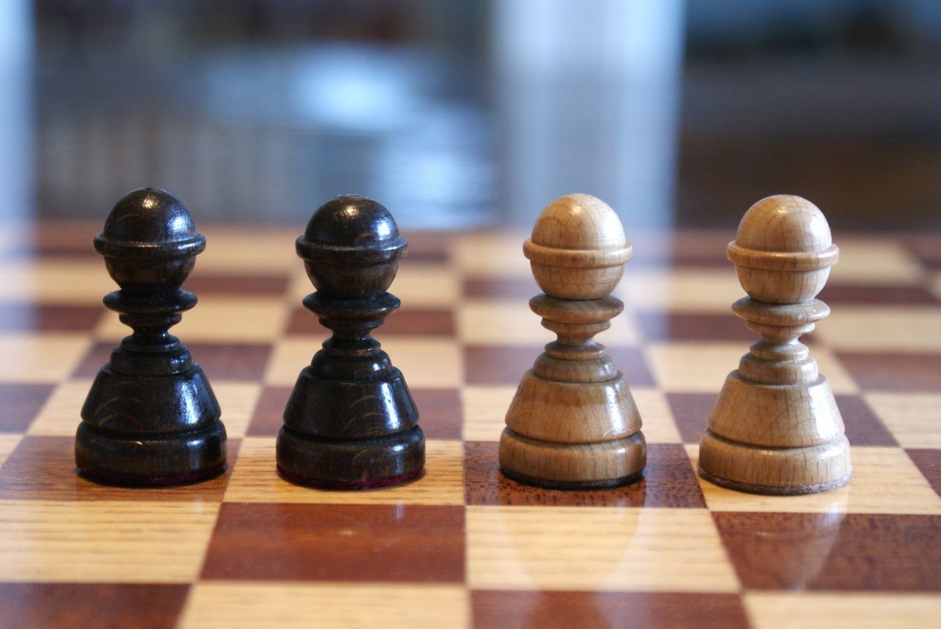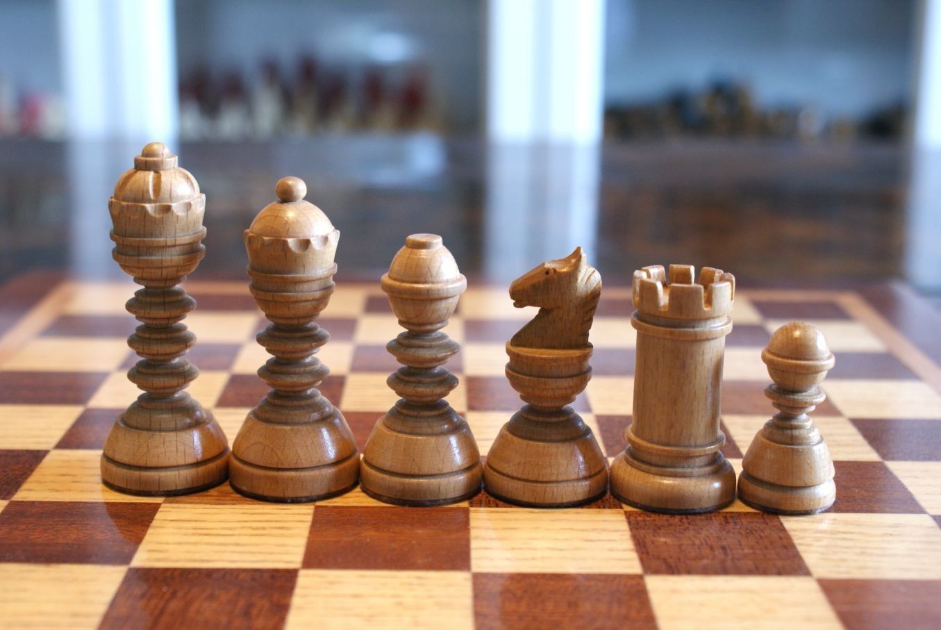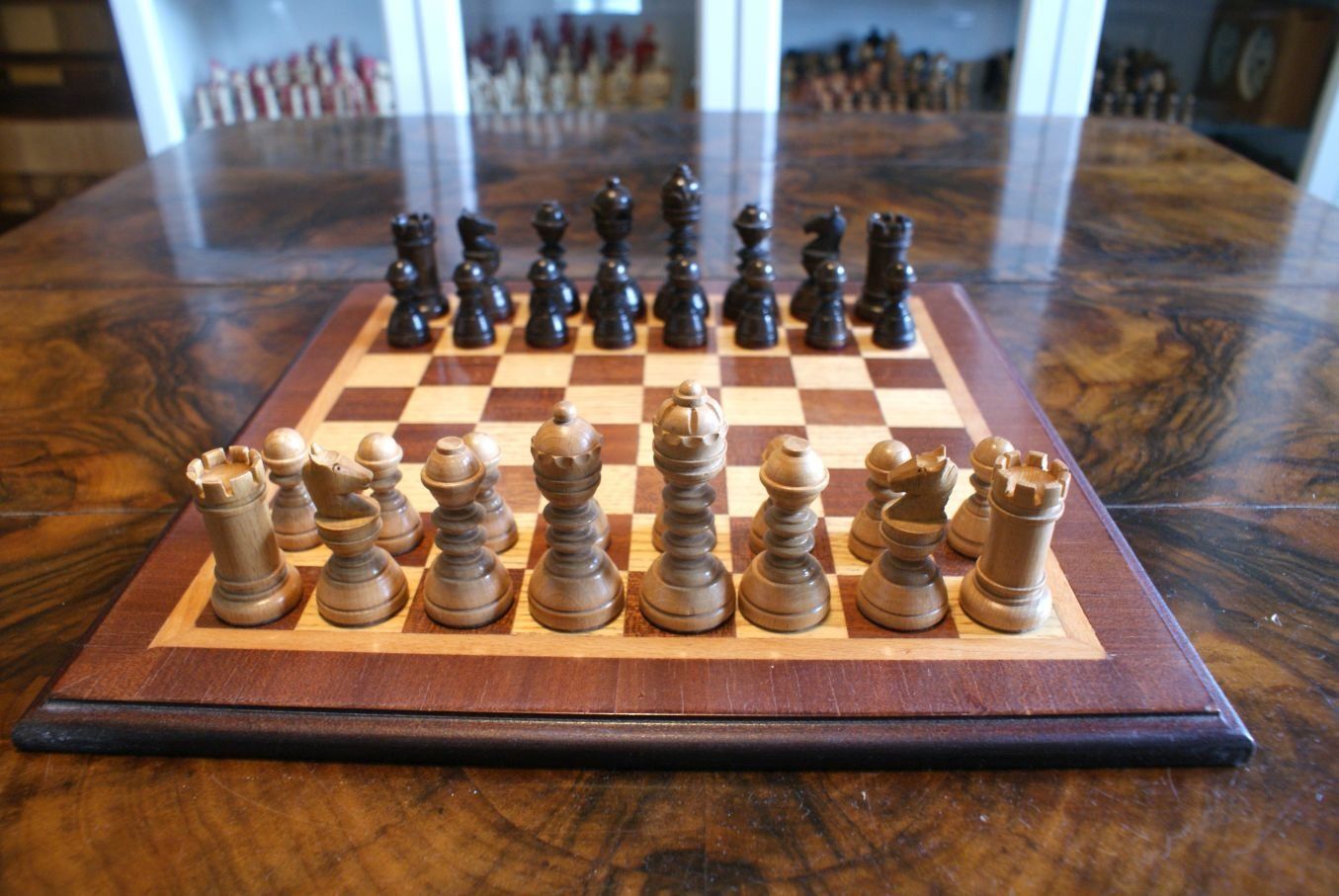 A small chess set made of wood with a king size of 69 mm (2.7"). The pieces are felted with burgundy and beige felts, but not weighted. The set was probably made in Germany in the second half of the 20th century. Apart from the unusual heads of the bishops and pawns and the rooks as tall turrets with eight crenellations, the set shows another peculiarity which is noticeable only on second sight: the kings and queens have different crowns and coronets.