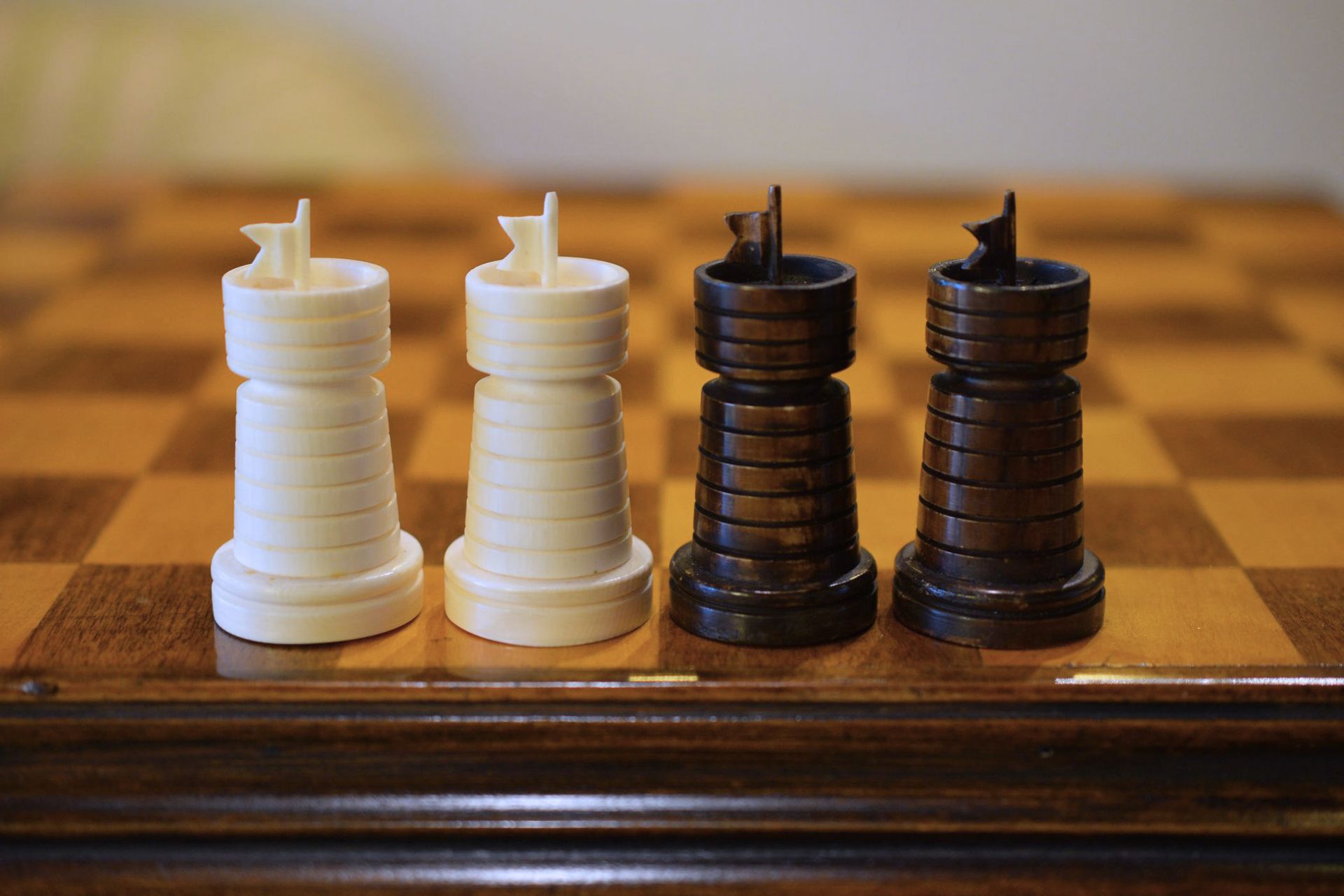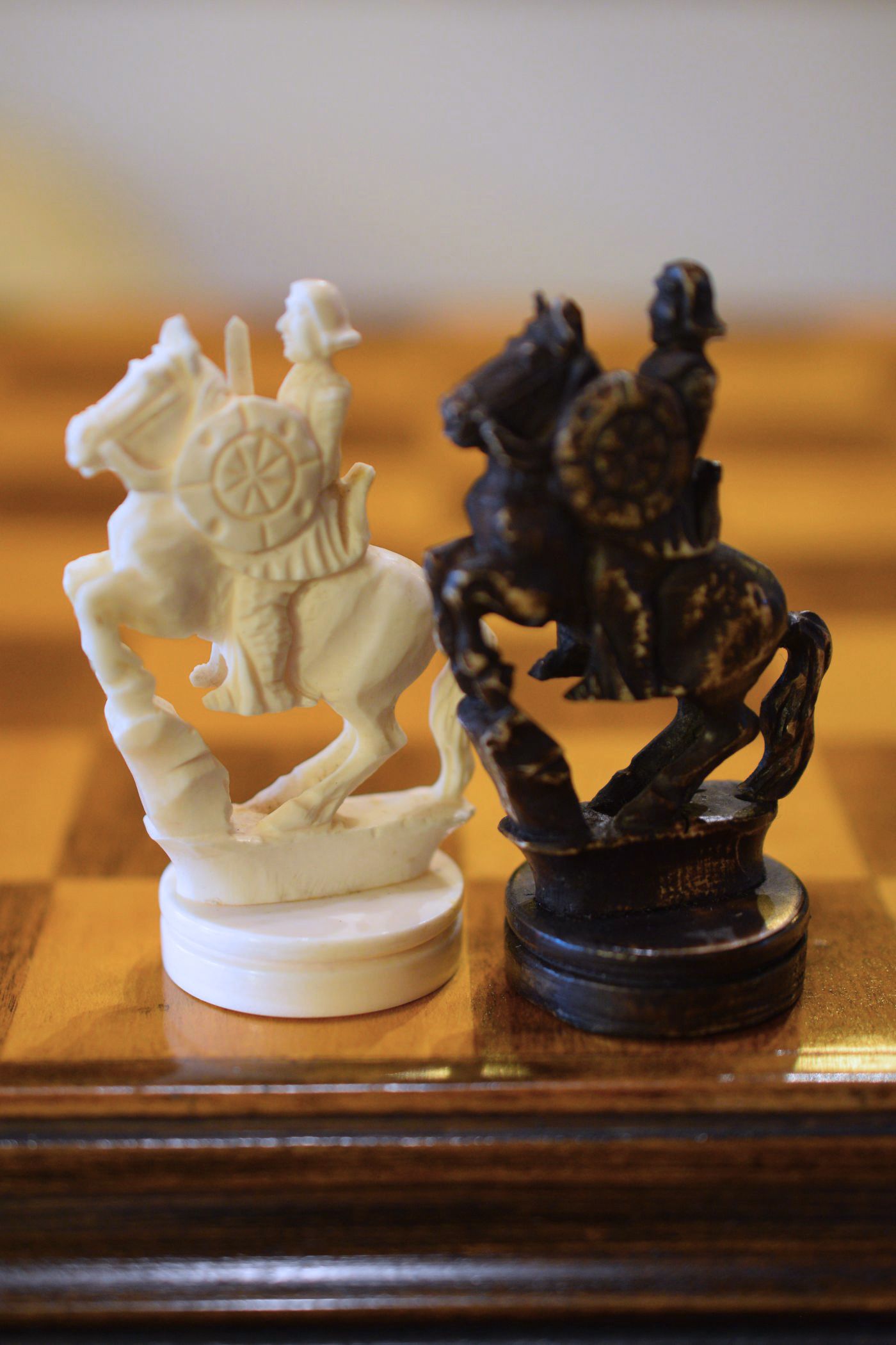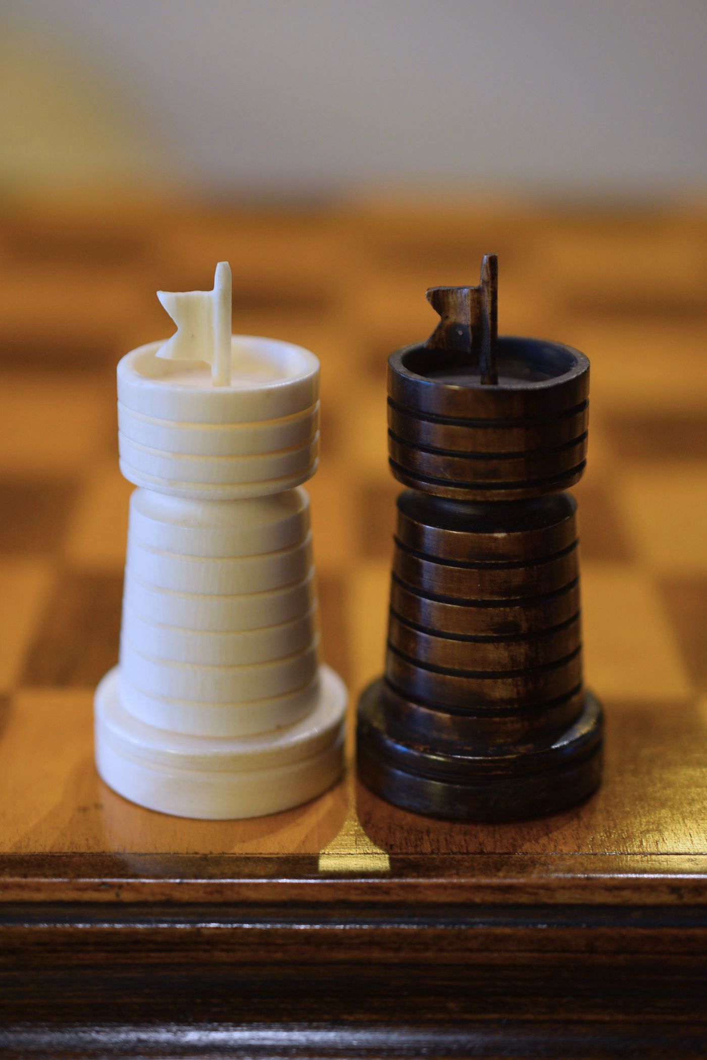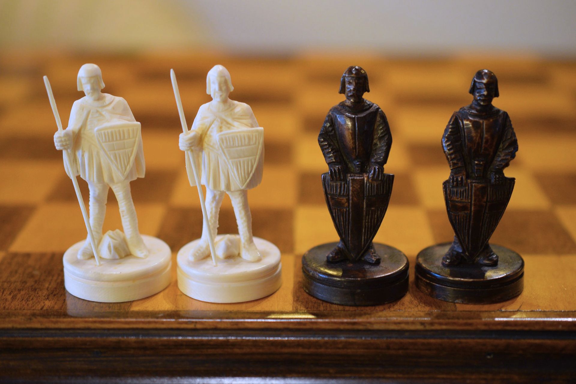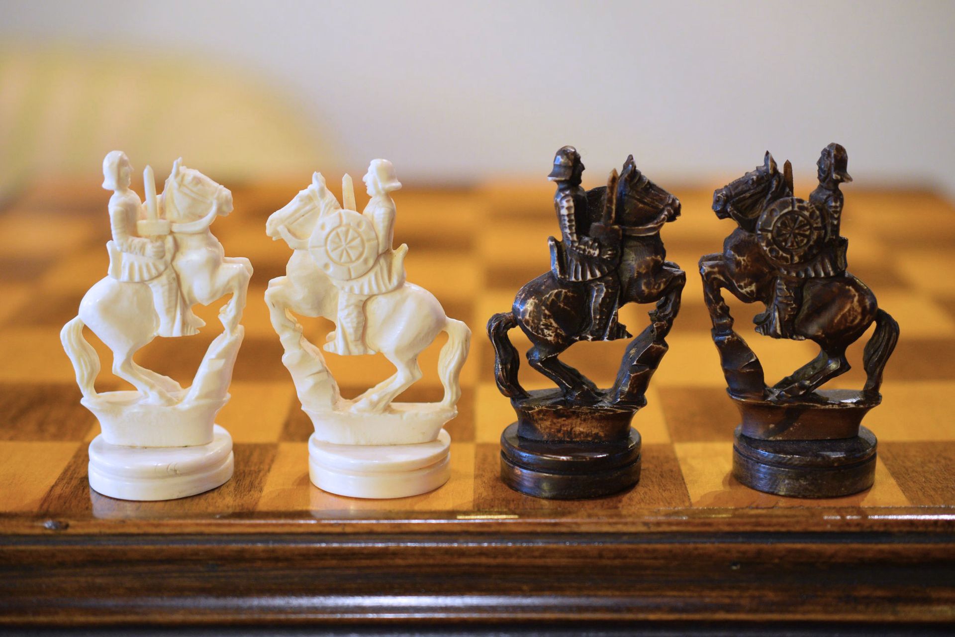 This extraordinary chess set was made in Erbach, Germany, probably in the early 20th century. The pieces are carved from elephant ivory, one side natural, the other stained dark brown. The king size is 7.5 cm. The set seems to be depicting a medieval European court with robed and crowned kings and queens. The rooks as towers in an unusual cylindrical shape with ring-shaped indentations as a hint of masonry with a small flag on top. The knights as rearing horses with a mounted rider armed with sword and shield. The bishops as robed clerics with mitre. The pawns as foot soldiers, the whites armed with lance and small shield, the blacks holding a large shield to the ground, which in my view artistically symbolises the attacking role of the white side and the defensive role of the black side.