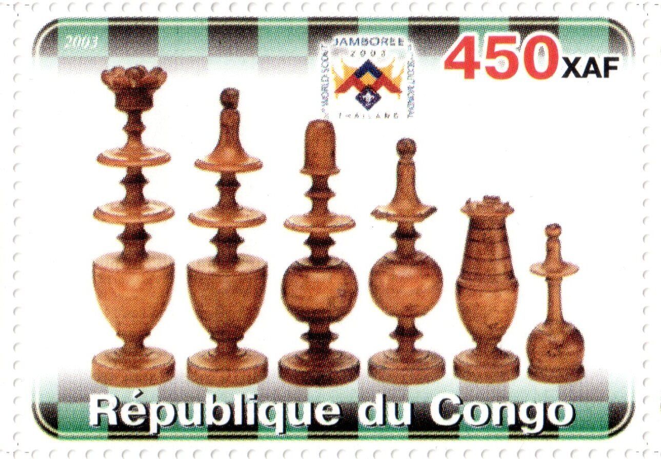 The set is not only famous because it is shown in Gareth Williams' book, but also because it is featured on a stamp of the Republic of the Congo. You can easily see that it the very same set shown there because of the damage to the black queen's collar.