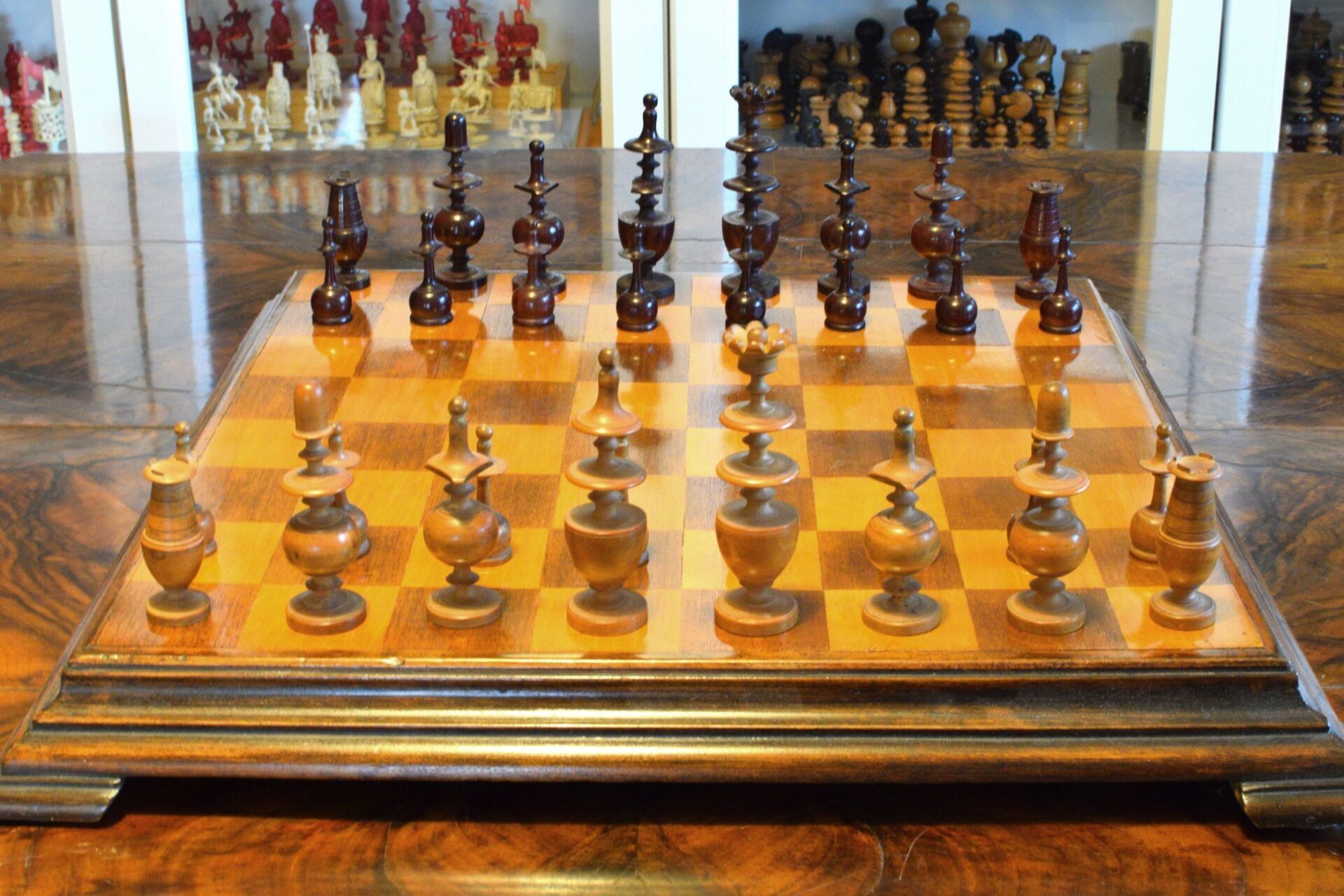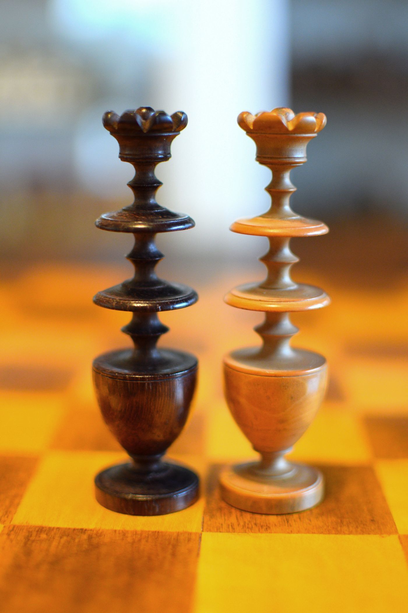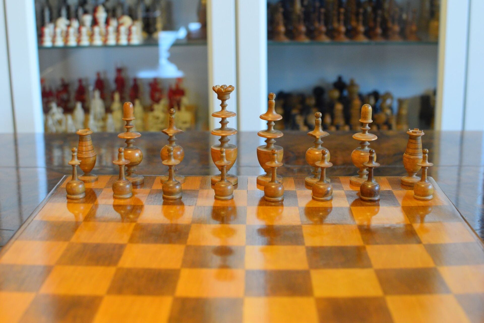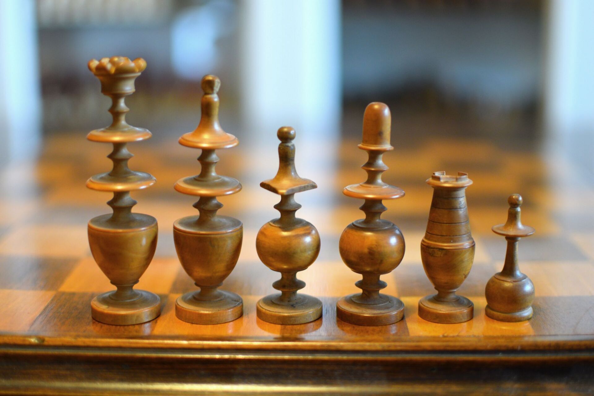 Here is a chess set of a renowned provenance. These chessmen belonged to the Gareth Williams collection. In fact, the exact same set is shown on pages 38/39 of Williams' famous book "Master Pieces". There has been a certain discussion about the distinction between chess sets in the Régence style and those in the Directoire style. In his book, Williams labels this set a Régence set. However, in his excellent article "Régence or Directoire" by Jim Joannou in The Chess Collector Magazine, Vol. XXIX No. 2 2020, p. 9 et seq. Jim gives some good reasons to regard this set as a Directoire set rather than a Régence set. According to Jim Joannou the distinguishing feature of a Régence set is the knight, which must be taller than the bishop and must have a horse's head, while the knight in a Directoire set must be taller than the bishop, but be of abstract design. The latter is the case here, because instead of the horse's head the knight here has some kind of cap shaped head. Apart from that, the overall design is similar to the late 18th / early 19th century Régence sets with tulip crowned kings, bishops with triangular collars and pawns with slim shafts on rounded bases. The pieces are turned from boxwood and rosewood. King size is 90 mm.