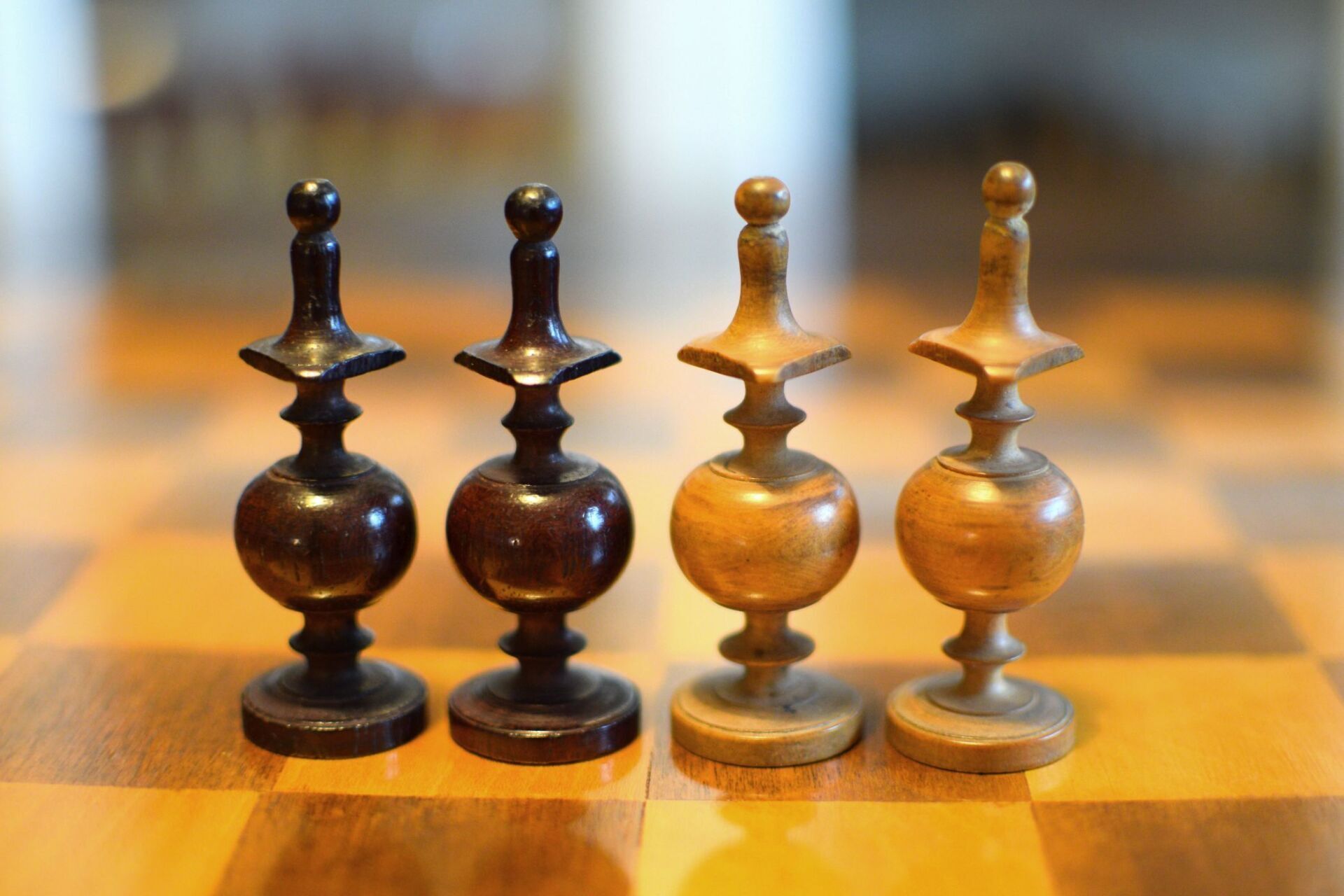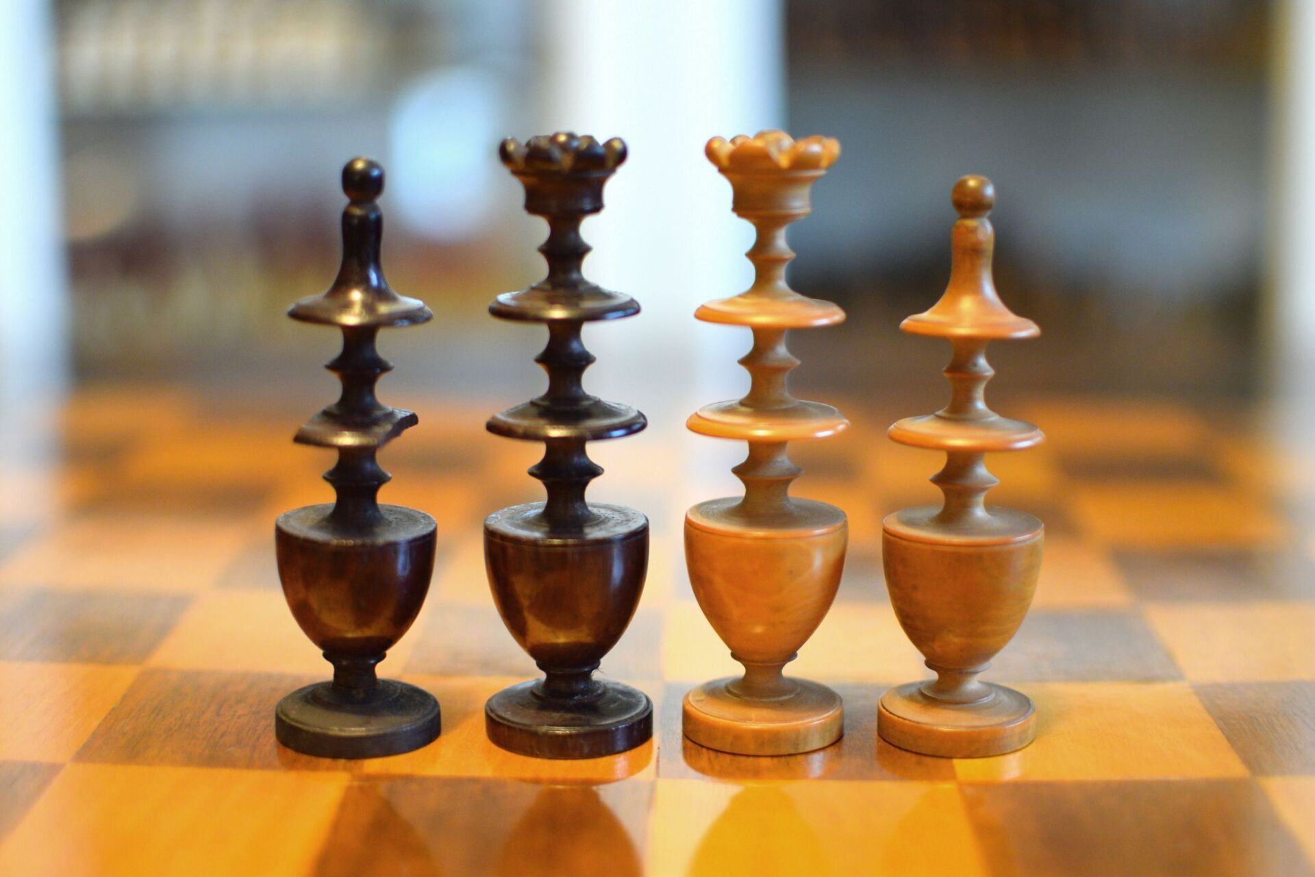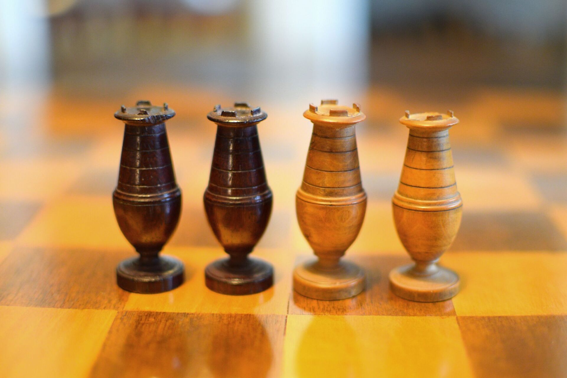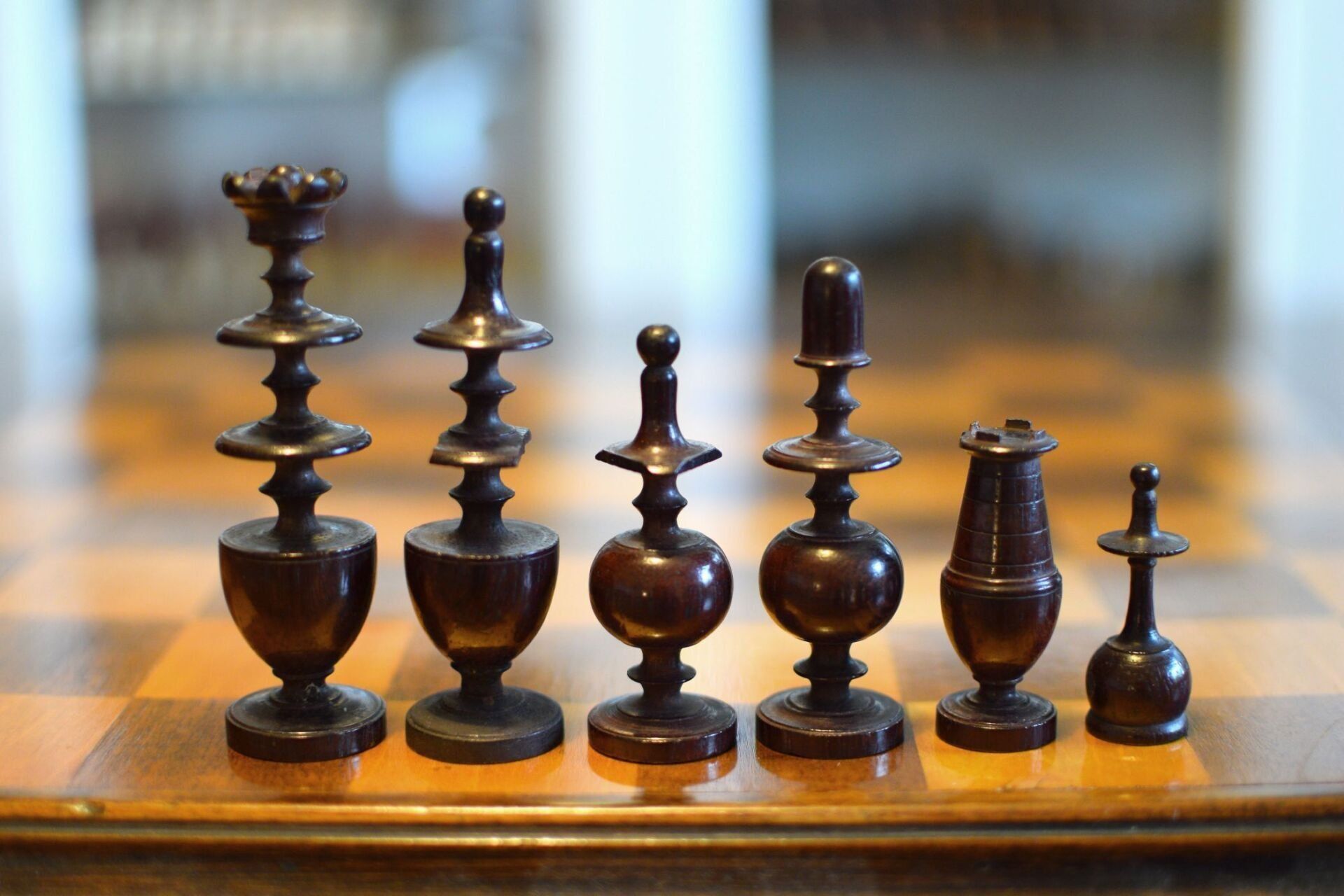 Here is a chess set of a renowned provenance. These chessmen belonged to the Gareth Williams collection. In fact, the exact same set is shown on pages 38/39 of Williams' famous book "Master Pieces". There has been a certain discussion about the distinction between chess sets in the Régence style and those in the Directoire style. In his book, Williams labels this set a Régence set. However, in his excellent article "Régence or Directoire" by Jim Joannou in The Chess Collector Magazine, Vol. XXIX No. 2 2020, p. 9 et seq. Jim gives some good reasons to regard this set as a Directoire set rather than a Régence set. According to Jim Joannou the distinguishing feature of a Régence set is the knight, which must be taller than the bishop and must have a horse's head, while the knight in a Directoire set must be taller than the bishop, but be of abstract design. The latter is the case here, because instead of the horse's head the knight here has some kind of cap shaped head. Apart from that, the overall design is similar to the late 18th / early 19th century Régence sets with tulip crowned kings, bishops with triangular collars and pawns with slim shafts on rounded bases. The pieces are turned from boxwood and rosewood. King size is 90 mm.
