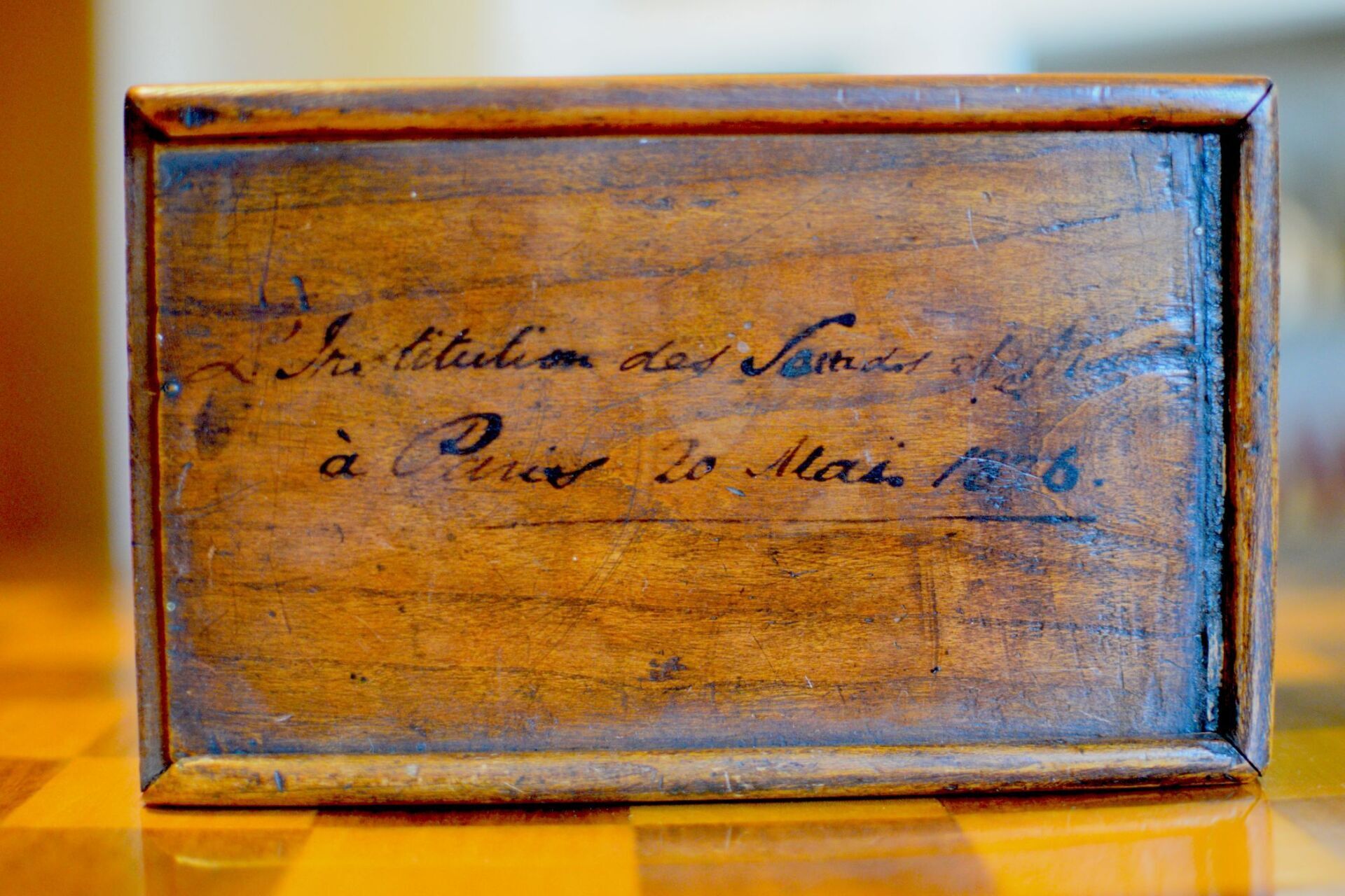 Without any further evidence, I would have probably dated this set late 18th century. However, the set came in a box with a sliding lid, which is inscribed with black ink. The inscription is not entirely legible, but from what I can read, it says "L'Institution des [...] et les [...]" and below "à Paris 20 Mai 1826". Assuming that the box is original to the set and was not added later, the set therefore dates to the early 19th century rather than the late 18th century.