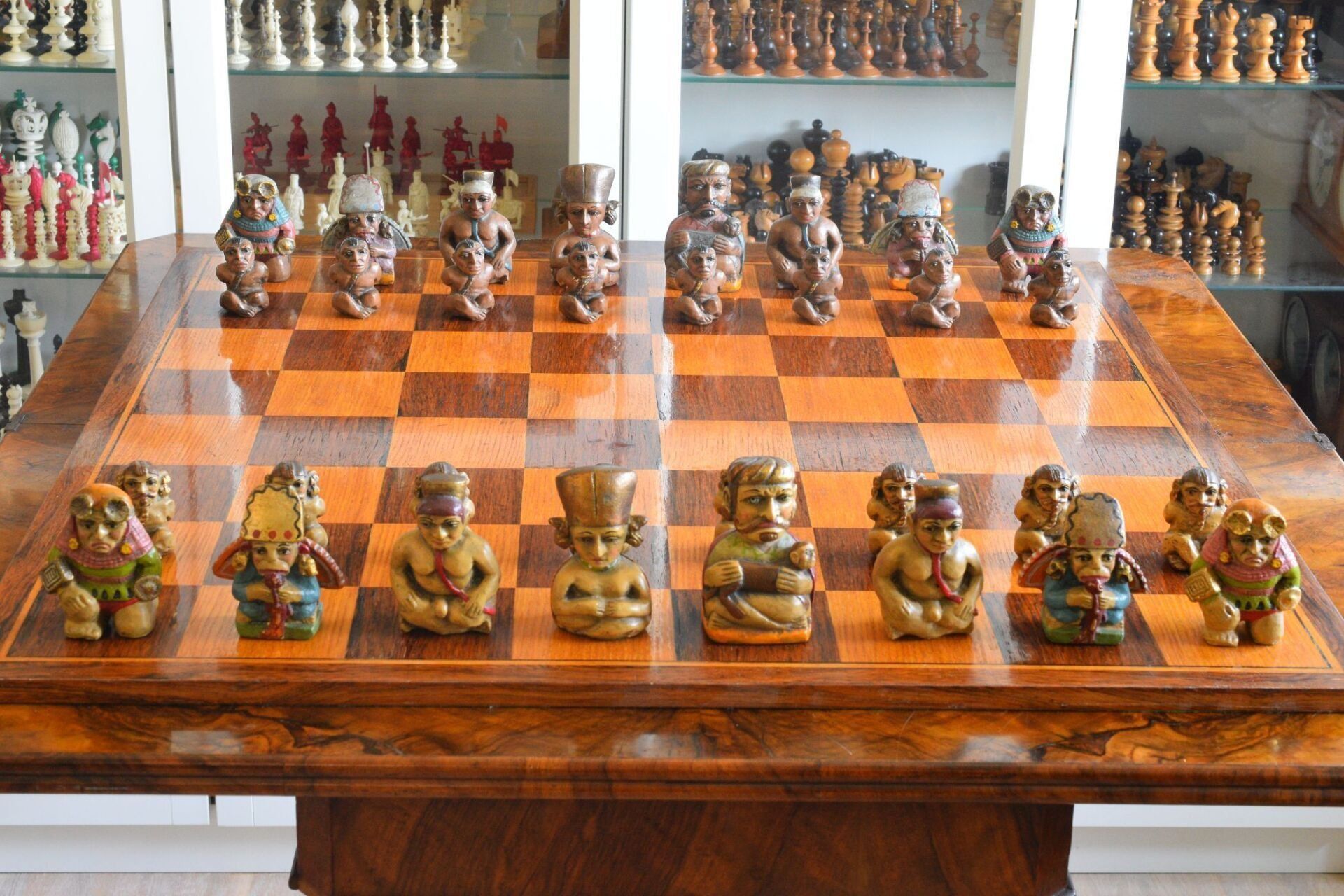 A figural chess set presumably from the second half of the 20th century and made in Middle or South America. The set is very large with a king size of 10 cm and massive and very heavy pieces (shown here on a chess board with squares of 8.5 cm / 3.35"). But apart from that I know little to nothing about it. The motifs seem to relate to the Aztec or Mayan culture. The pieces are - at least partly - made of wood and colourfully lacquered. I am not sure, however, if wood is the only material. It could be a material mix including also parts made of terracotta or clay. Further, I have no idea if my setup is correct, i.e. if all the pieces are associated with the right position.