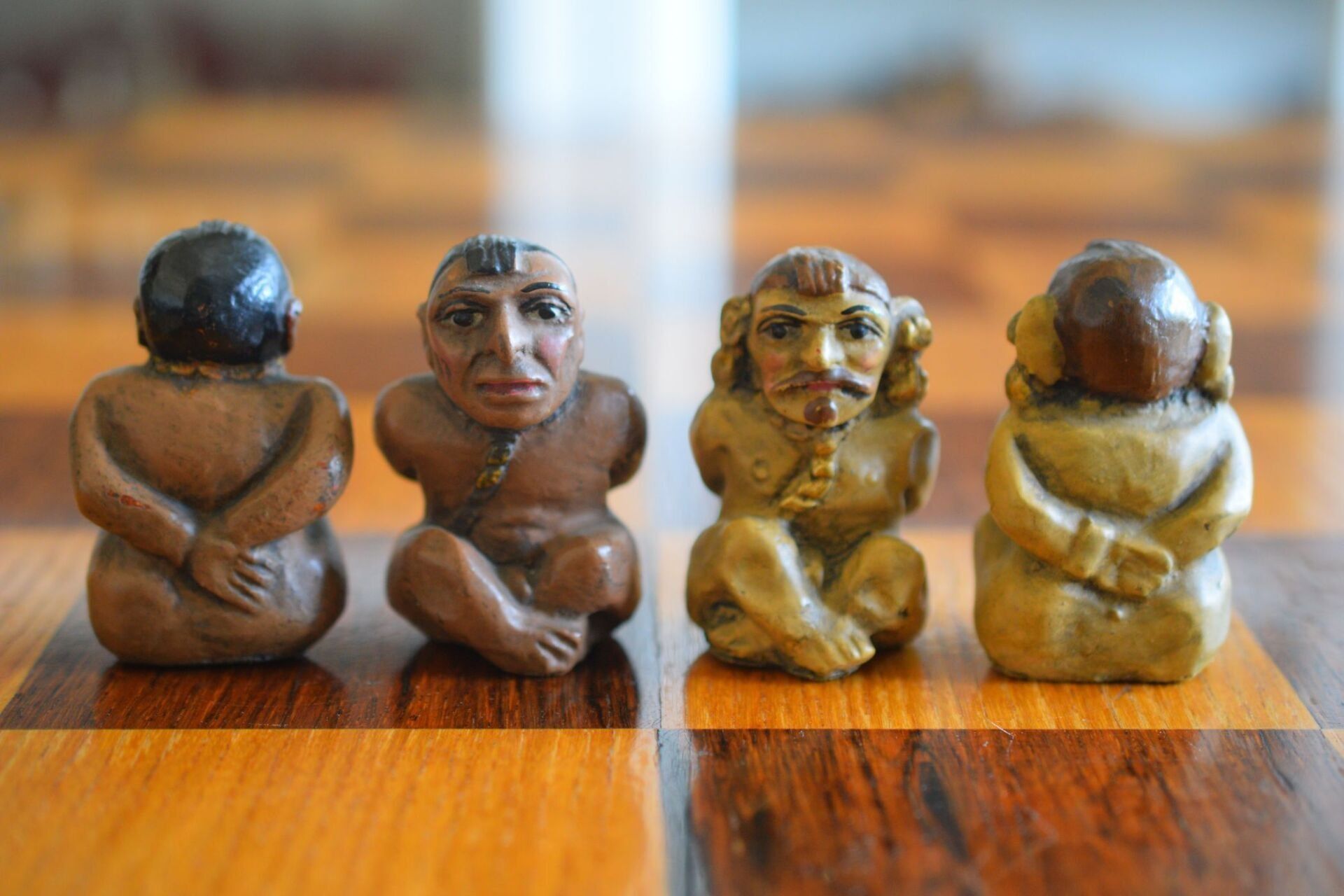 All pieces are shown in a kneeling or sitting position. The kings are wearing a flat cap and are holding what seems to be a monkey. The queens are wearing a high helmet crown and ear jewellery. The bishops nude with erect penis wearing a traditional headdress and a rope around their neck. The knights very colourfully decorated wearing a high headdress with a sun symbol and a cape on their back in the shape of a bird spreading its wings as well as a fish hanging from their lower lips. The rooks as sturdy warriors wearing what seems to be a chain mail helmet and golden arm rings. The pawns as prisoners with a rope around their neck and their arms rope bound behind their back.