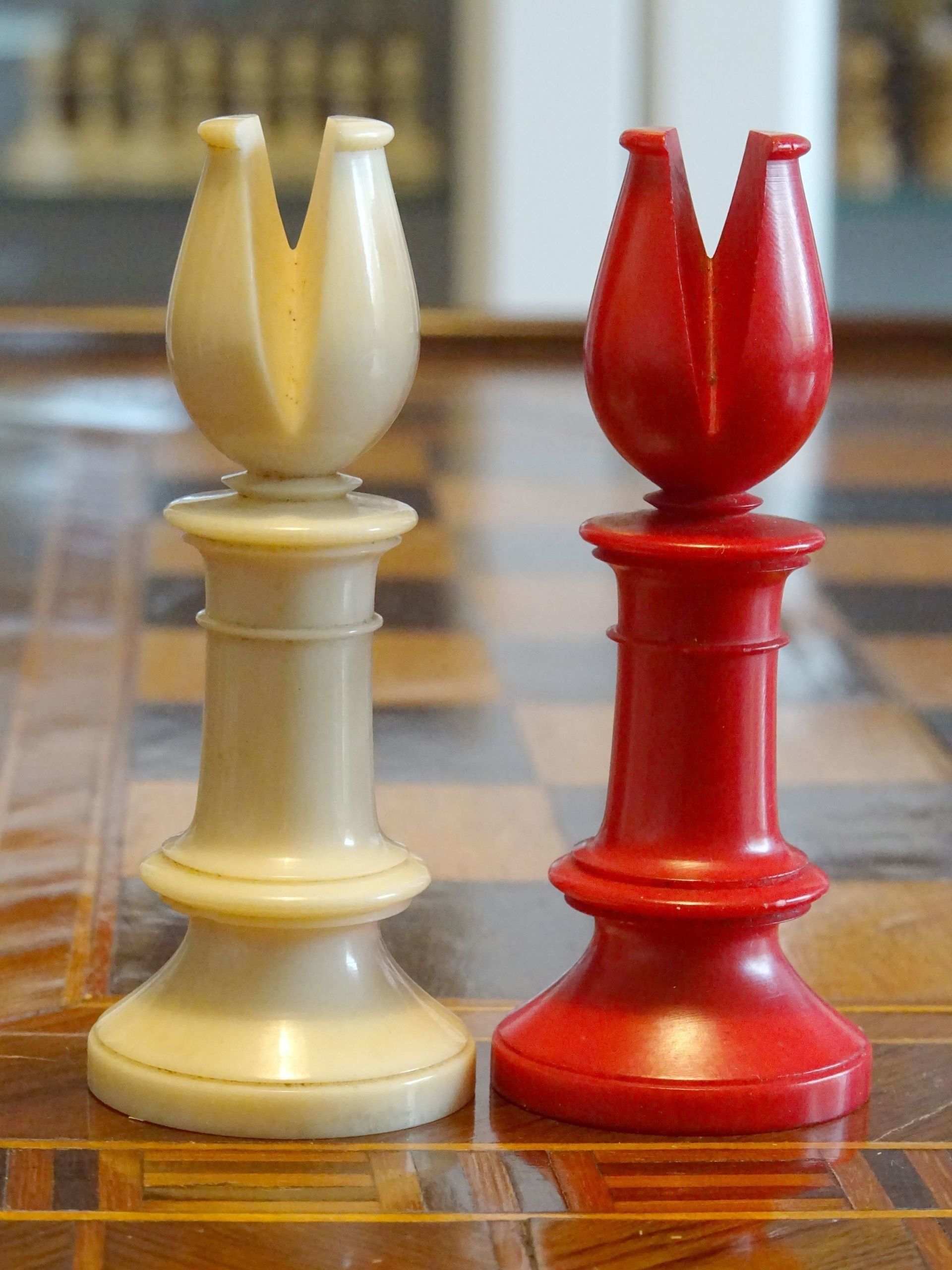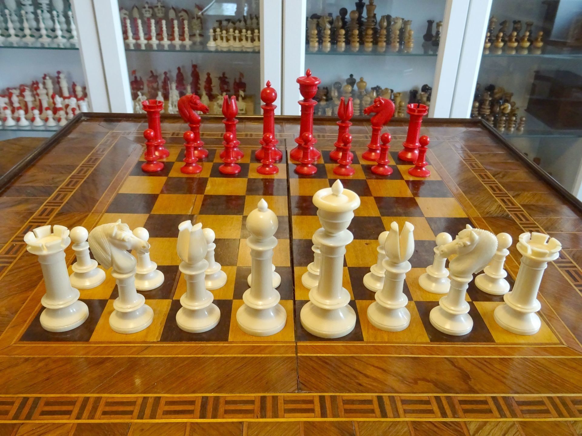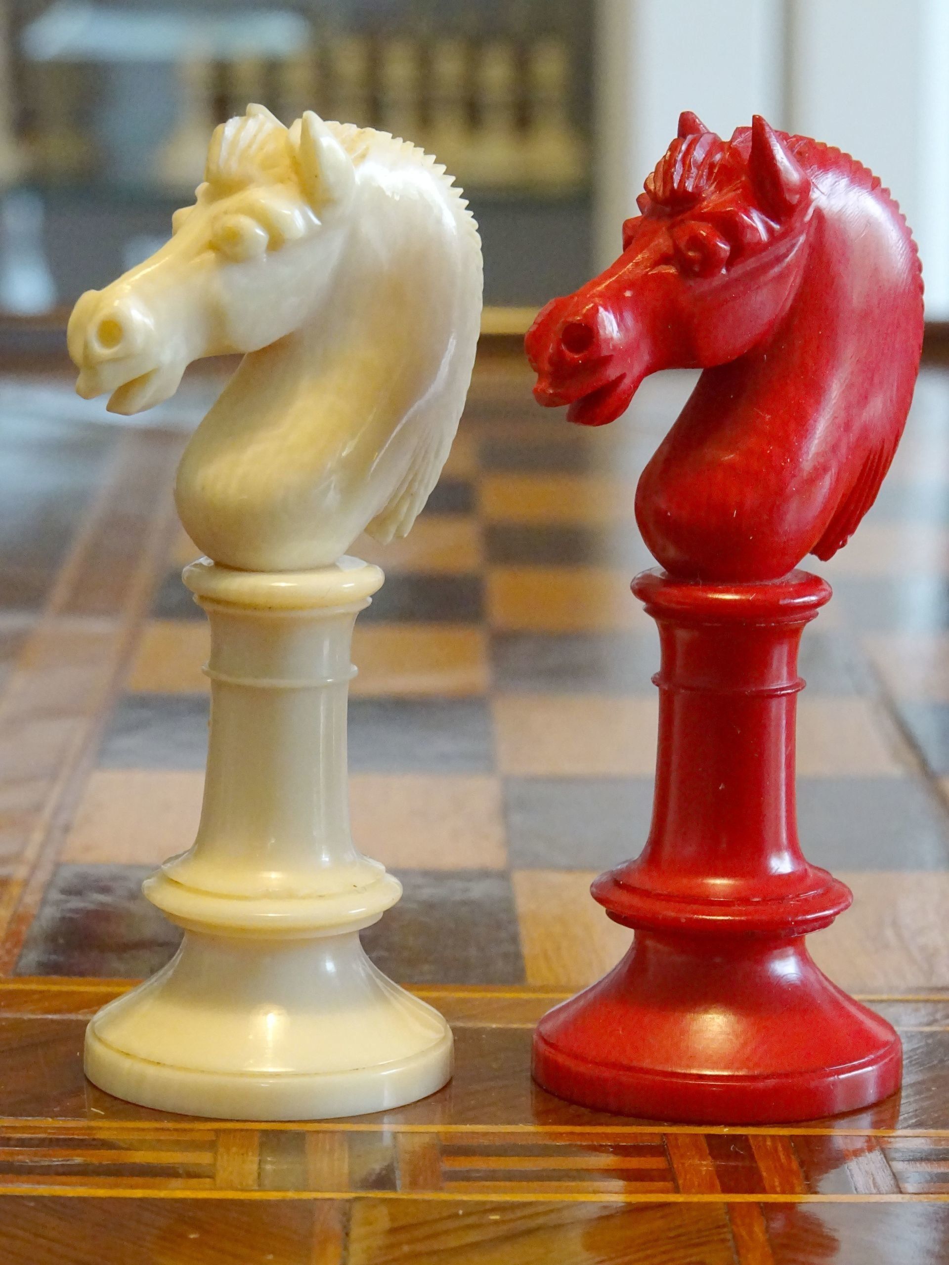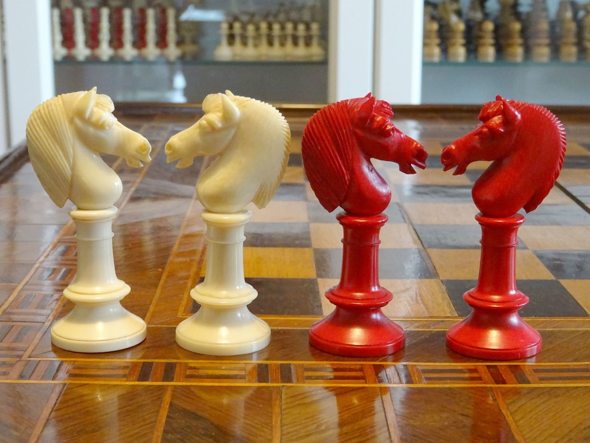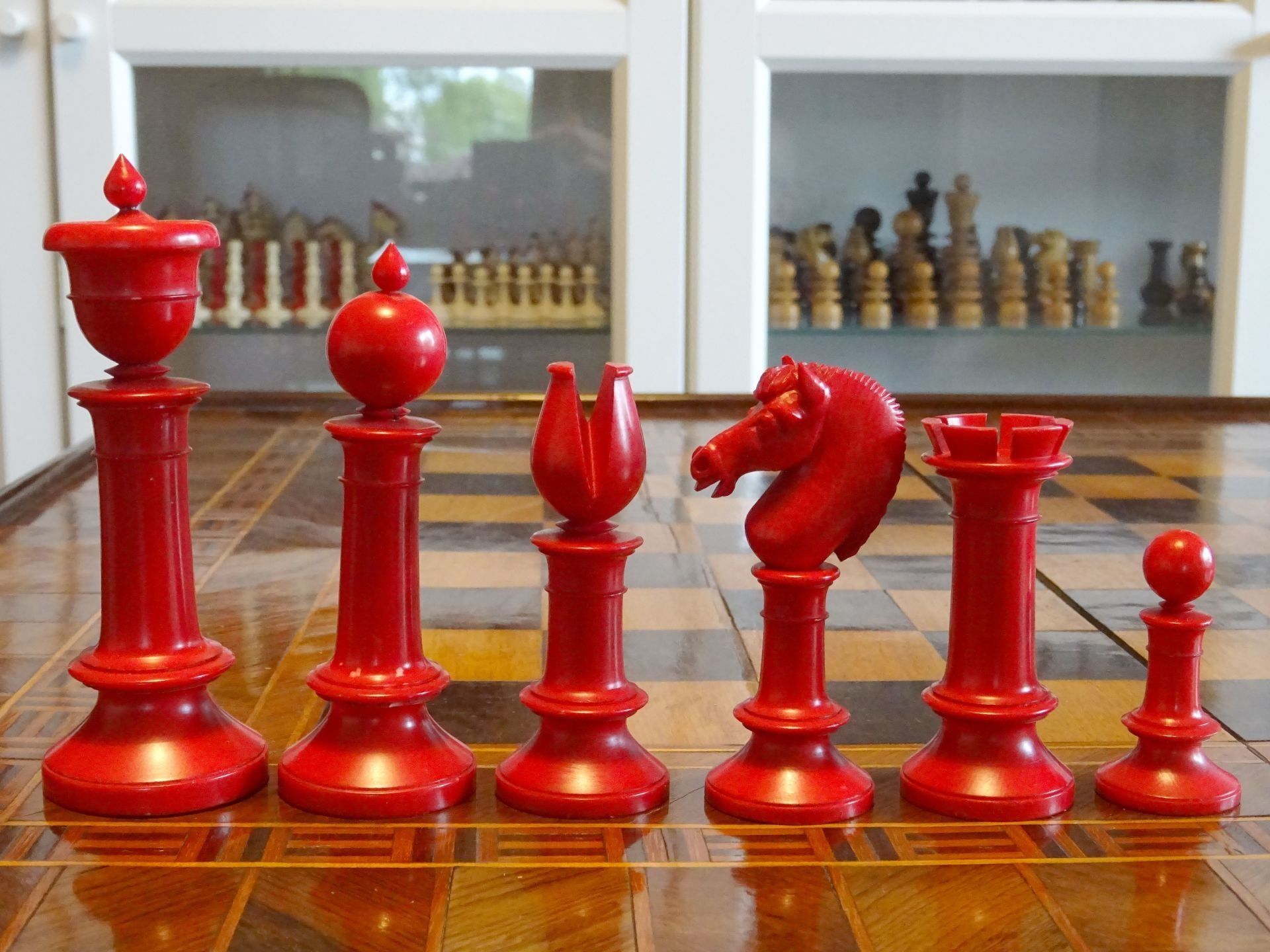 English chess set in the "Northern Upright" pattern. The pieces are turned and carved from ivory, one side natural, the opposing side stained red. All pieces on elongated stems with sloping bases. The Kings with urn-shaped finials, the Queens with ball finials, both with drop shaped tops, the Knights as carved horses' heads, the Bishops with split mitres, the Rooks with six crenellations, the Pawns with ball finials. King size is 3.6".