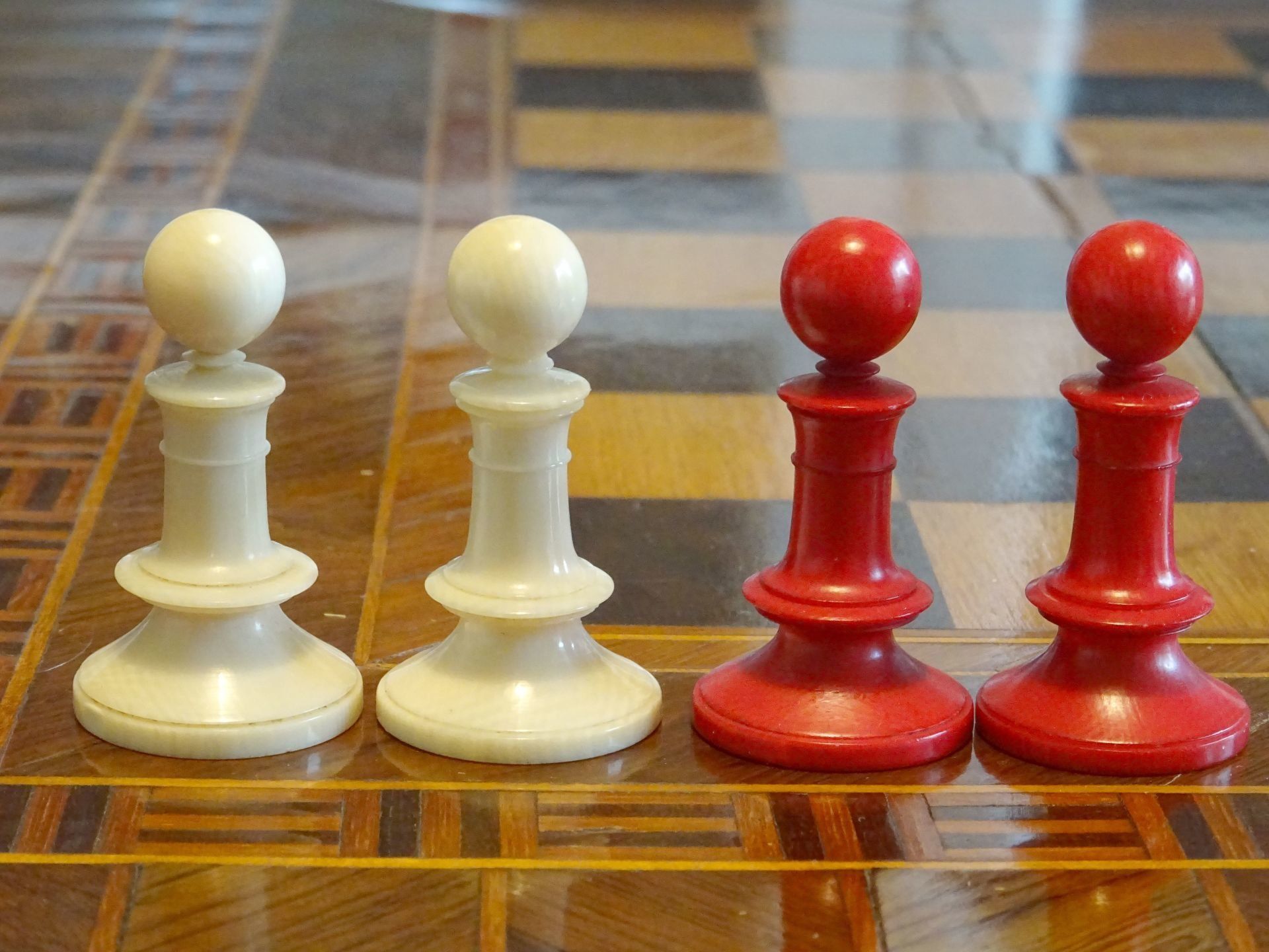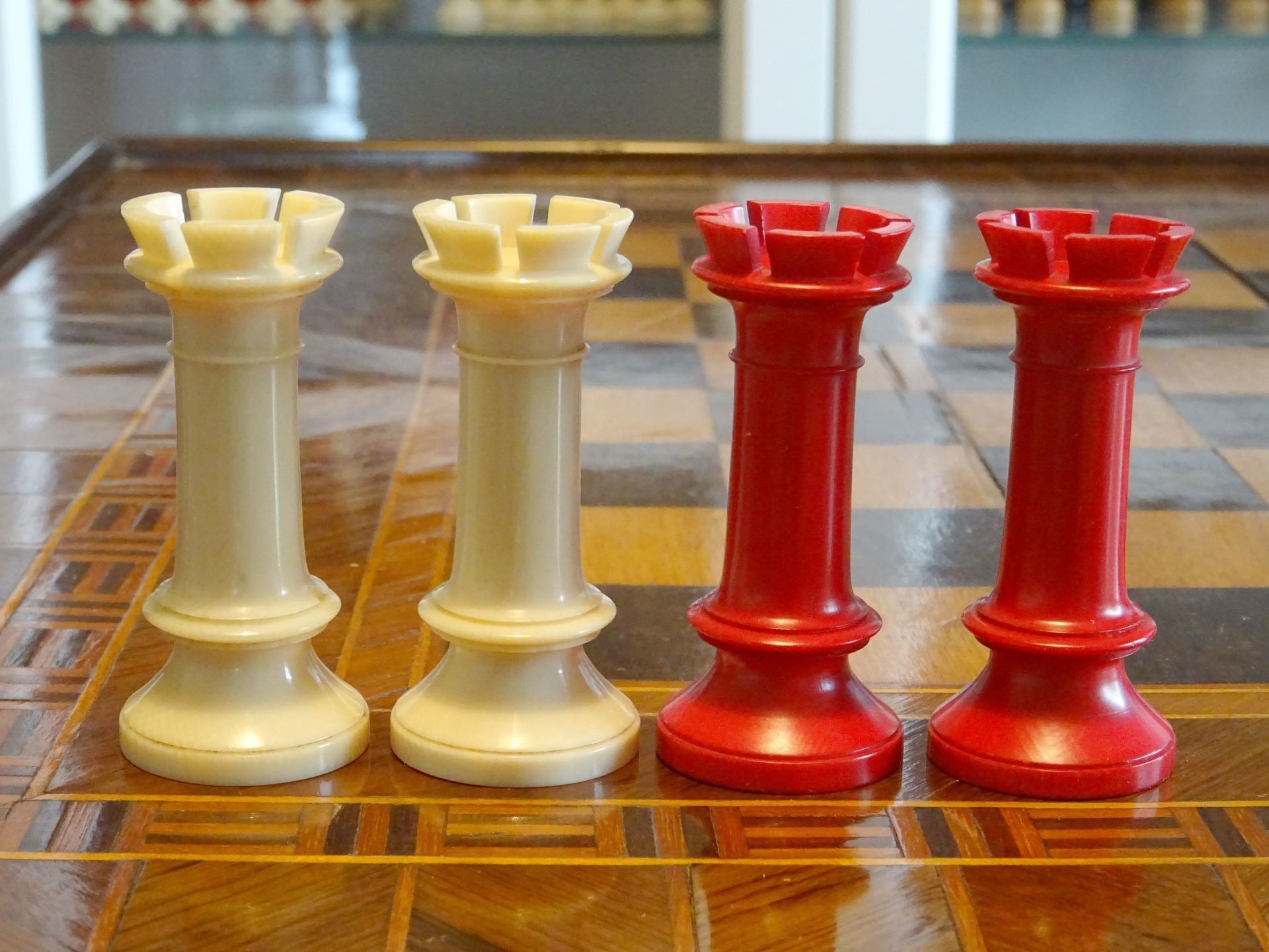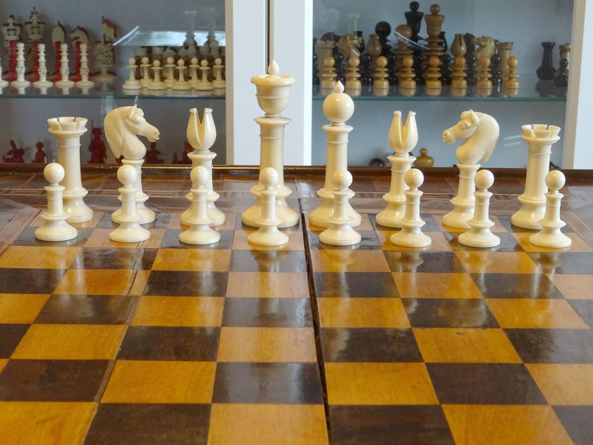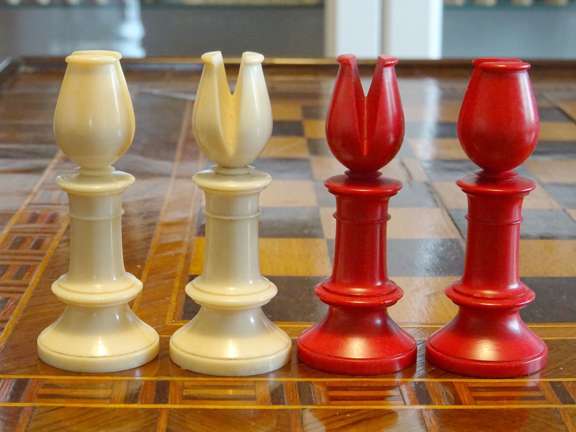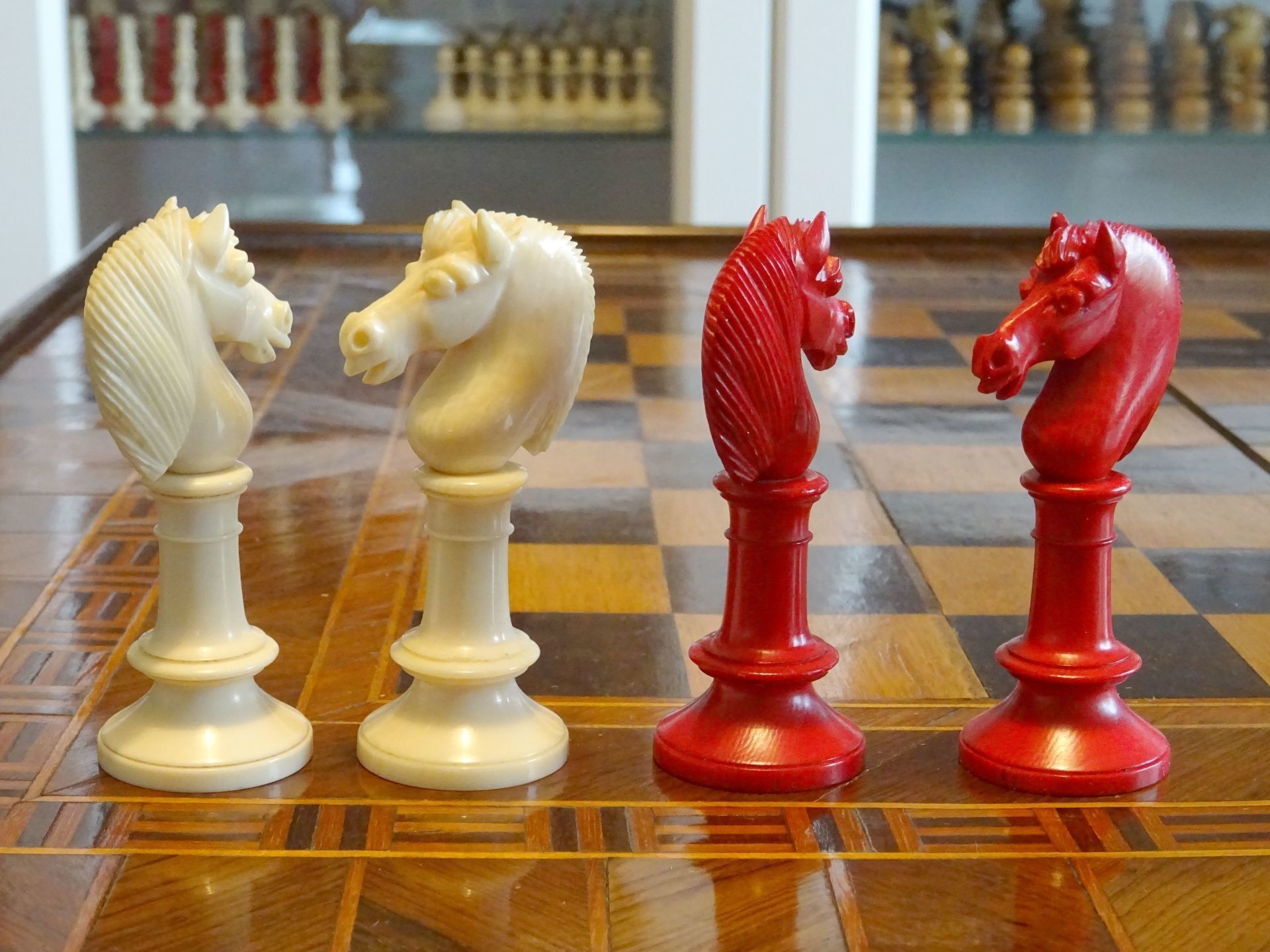 English chess set in the "Northern Upright" pattern. The pieces are turned and carved from ivory, one side natural, the opposing side stained red. All pieces on elongated stems with sloping bases. The Kings with urn-shaped finials, the Queens with ball finials, both with drop shaped tops, the Knights as carved horses' heads, the Bishops with split mitres, the Rooks with six crenellations, the Pawns with ball finials. King size is 3.6".
