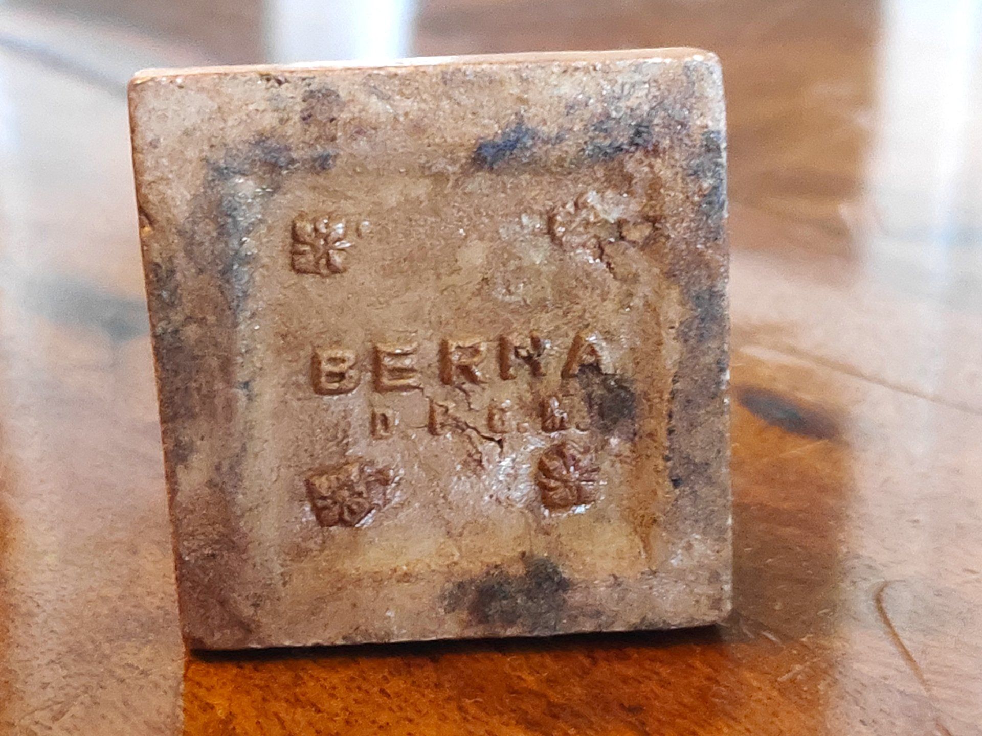 Mass figures were essentially toy figures, like animals or toy soldiers. Chessmen made of mass are extremely rare. An imprint can be seen on the bottom of the figures. There the name "Berna" as well as the abbreviation "D.R.G.M." is written. The latter makes a dating of the pieces at least roughly possible, because the abbreviation stands for "Deutsches Reichs-Gebrauchsmuster", a special utility model protected by statutes of the German Reich, which were introduced on 1 October 1891 and which existed until the end of the war in 1945. However, the imprint "Berna" could not be clarified so far. It can be assumed that it is the name of the manufacturer or the brand name of the material. However, no evidence can be found for either one or the other.