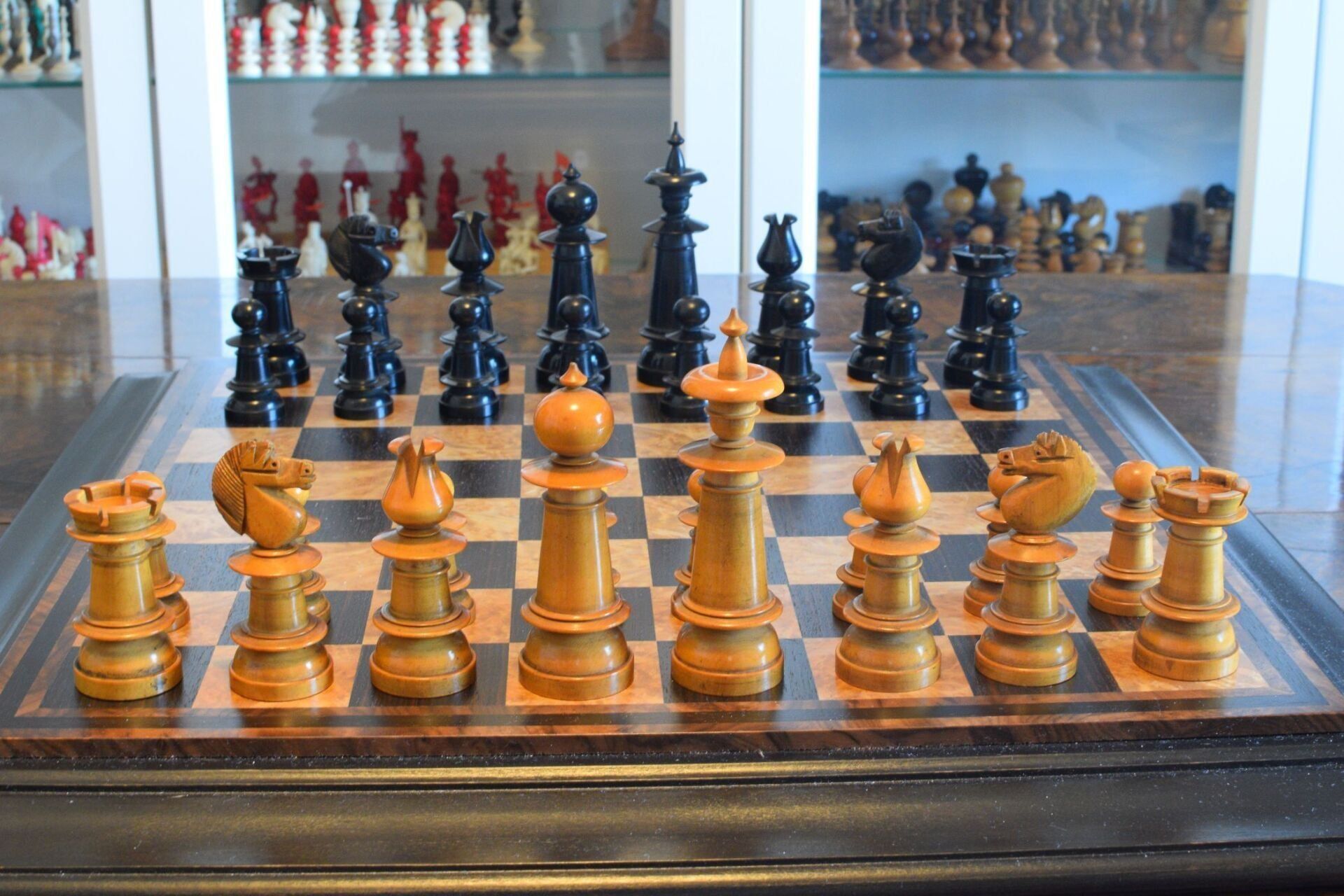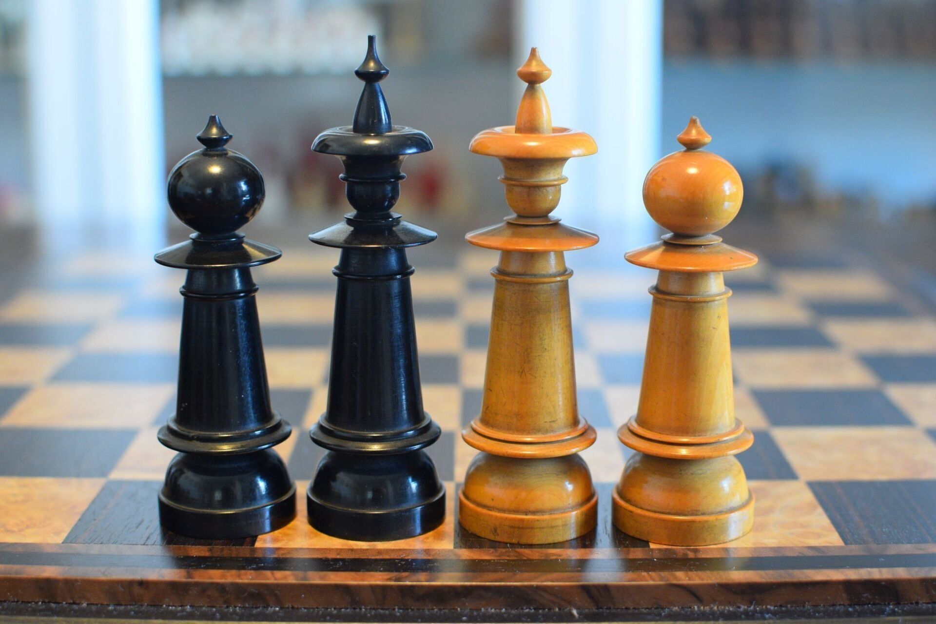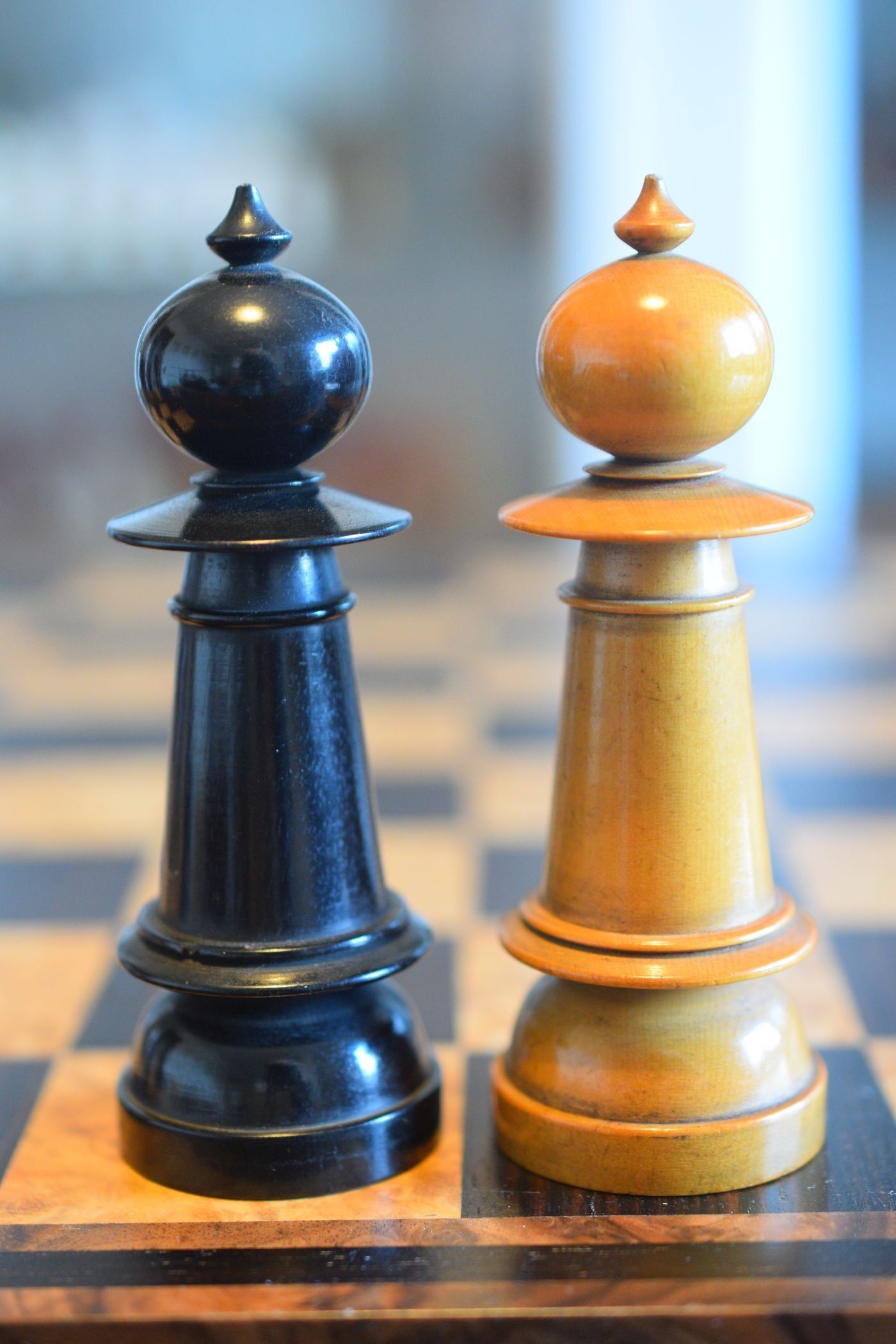 The pieces are turned and carved from boxwood and ebony. King size is 11cm. The pieces have a straight but upwardly tapering shaft and are very similar in style to the set shown in Peter Armit's article in image 8, a set which Peter attributes to F.H. Ayres.
