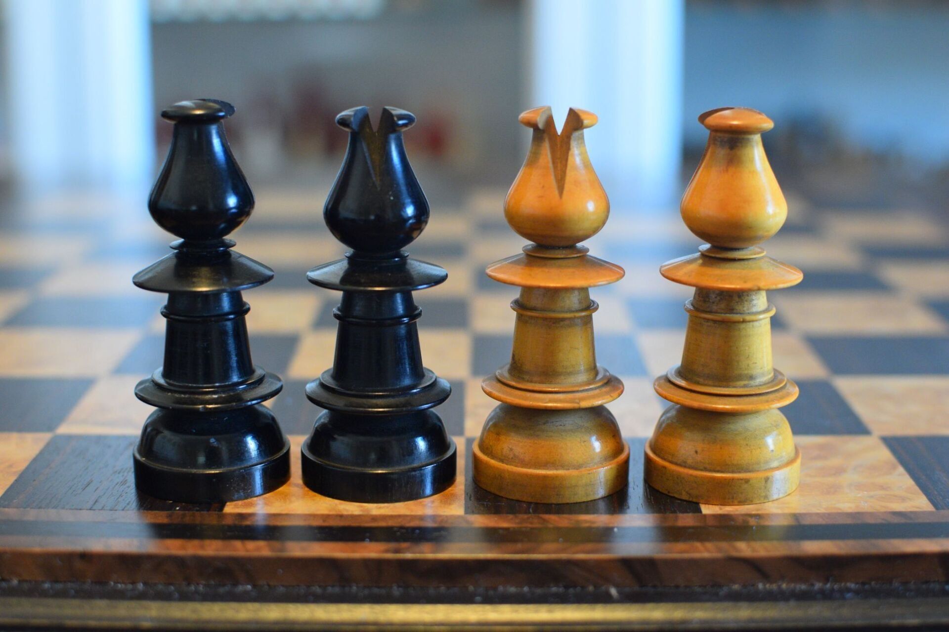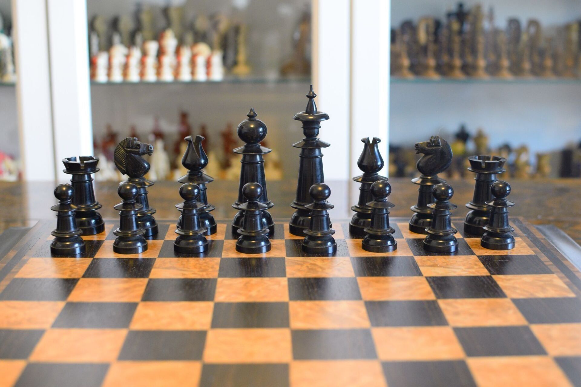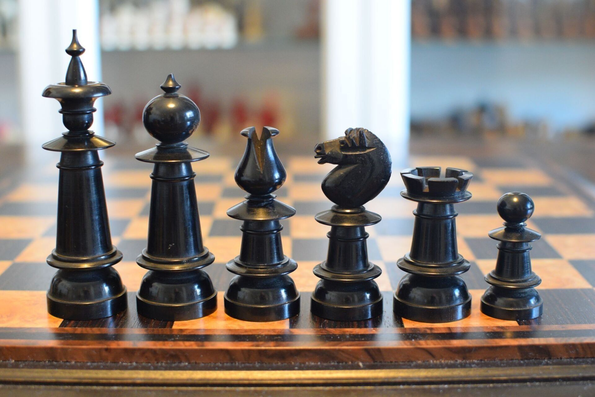 The pieces are turned and carved from boxwood and ebony. King size is 11cm. The pieces have a straight but upwardly tapering shaft and are very similar in style to the set shown in Peter Armit's article in image 8, a set which Peter attributes to F.H. Ayres.