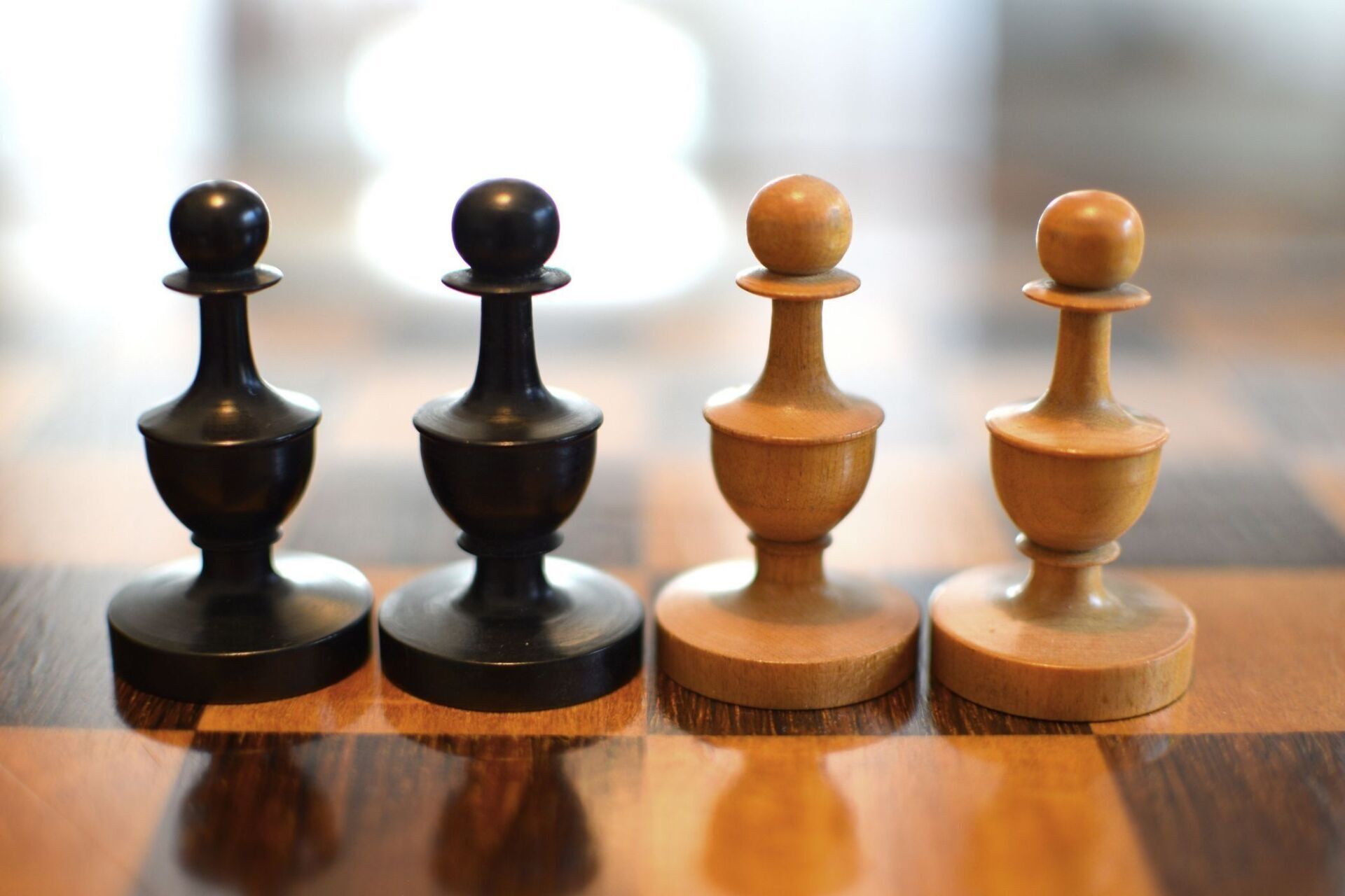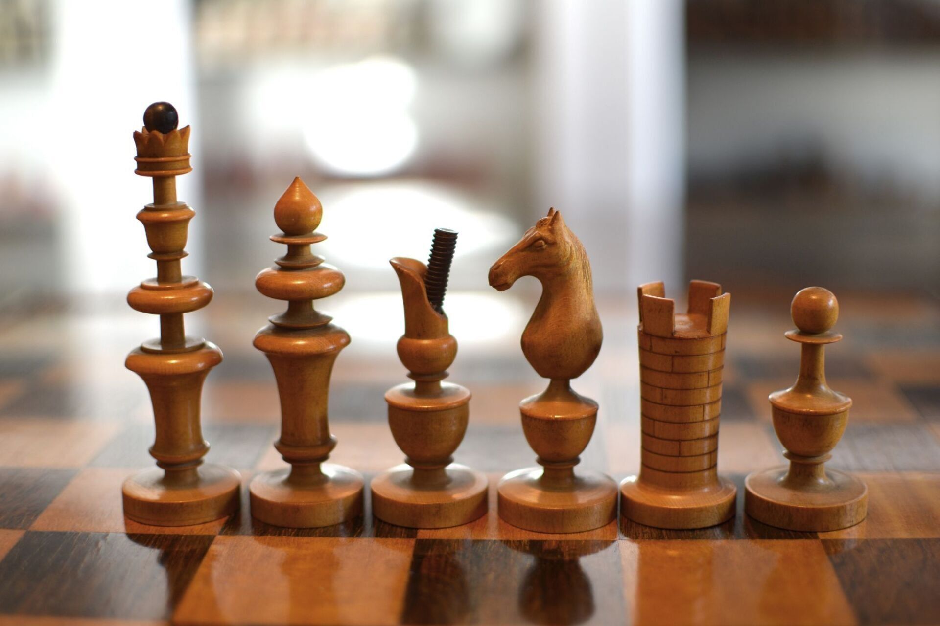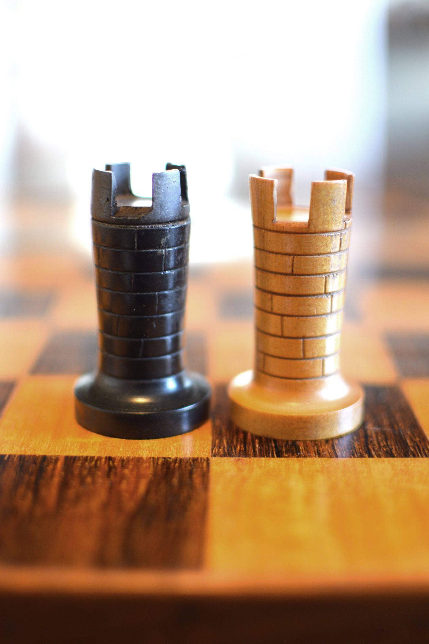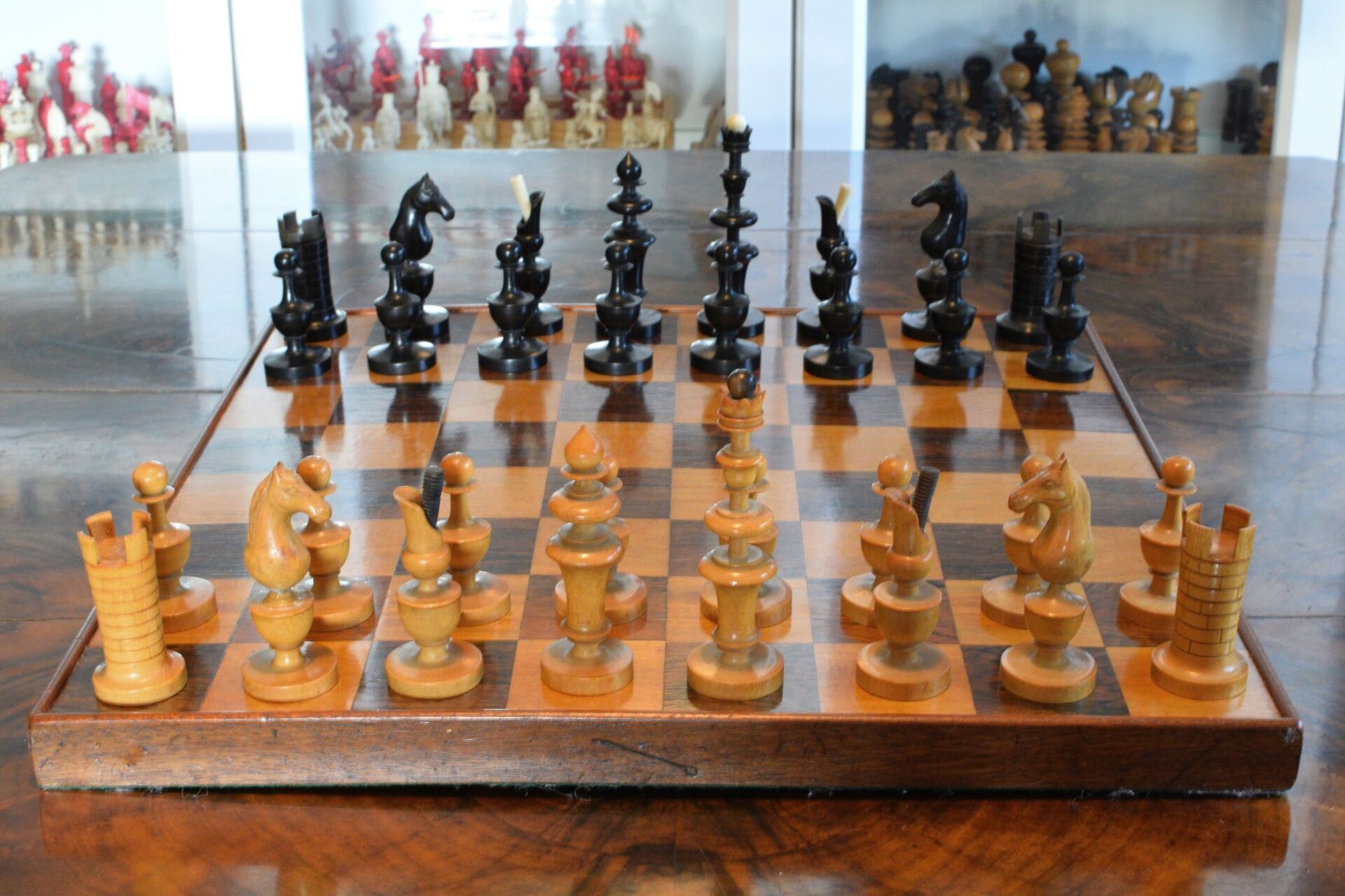 A wooden chess set, presumably from South Germany or Austria. The white pieces are made of boxwood, the black pieces of ebony. The king size is 97 mm (3.8"). The kings of unusual shape with slender shafts on an elongated baluster base topped with a circular crown and a ball finial in the opposite colour, on the white king made of wood dyed in dark brown, on the black king made of bone. The queens of smaller size and with a drop shaped head instead of a crown. The bishops show a very close resemblance with bishops from the early Biedermeier period, i.e. with lyre shaped heads and an elongated feather (in this also resembling feathered high hats common for certain officers in the 19th century military, see here). The knights as elegantly carved horses. The rooks as turrets with carved brickwork and four elongated crenellations. The pawns with baluster bases and a ball finial. All pieces on circular bases.