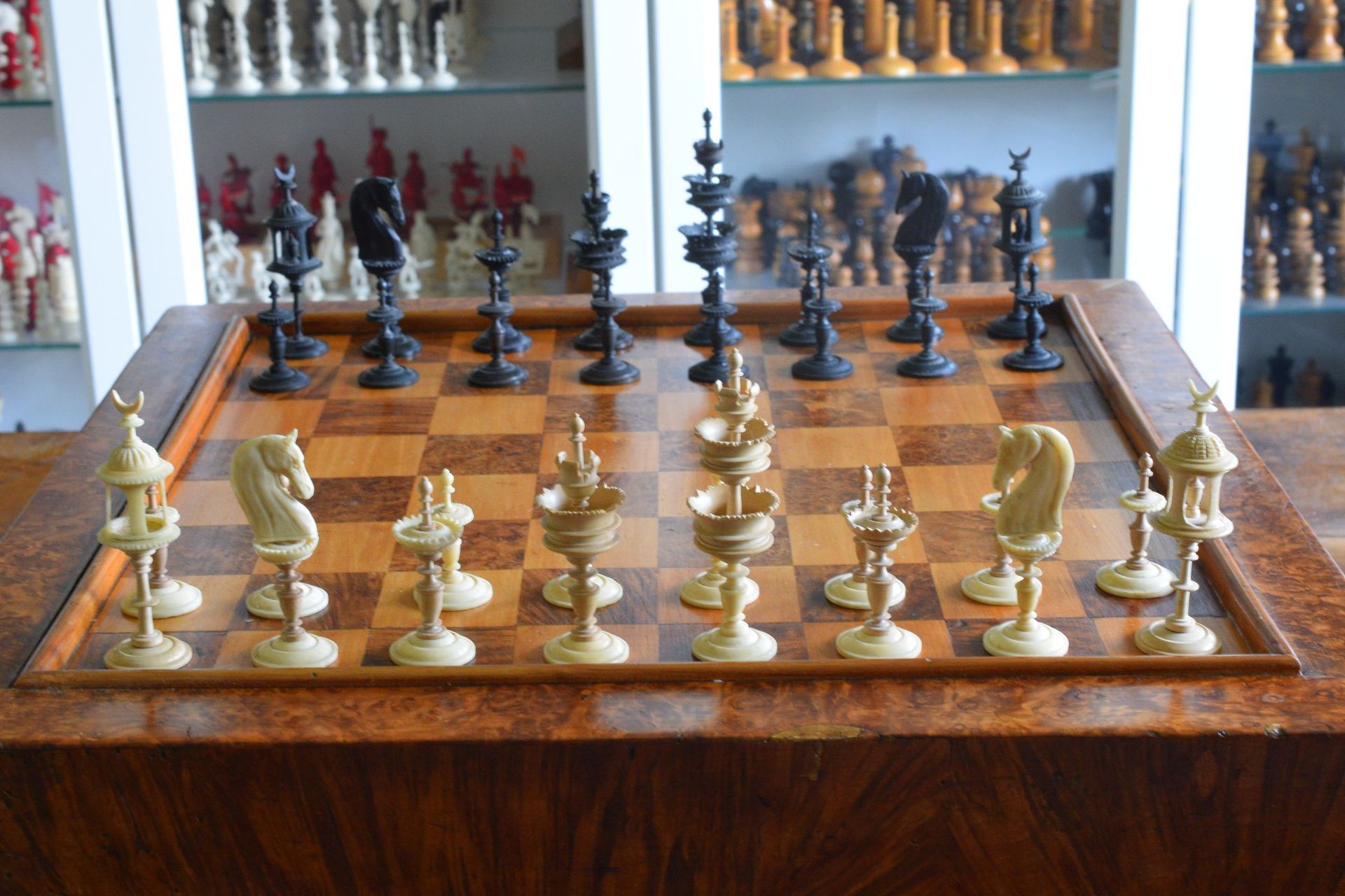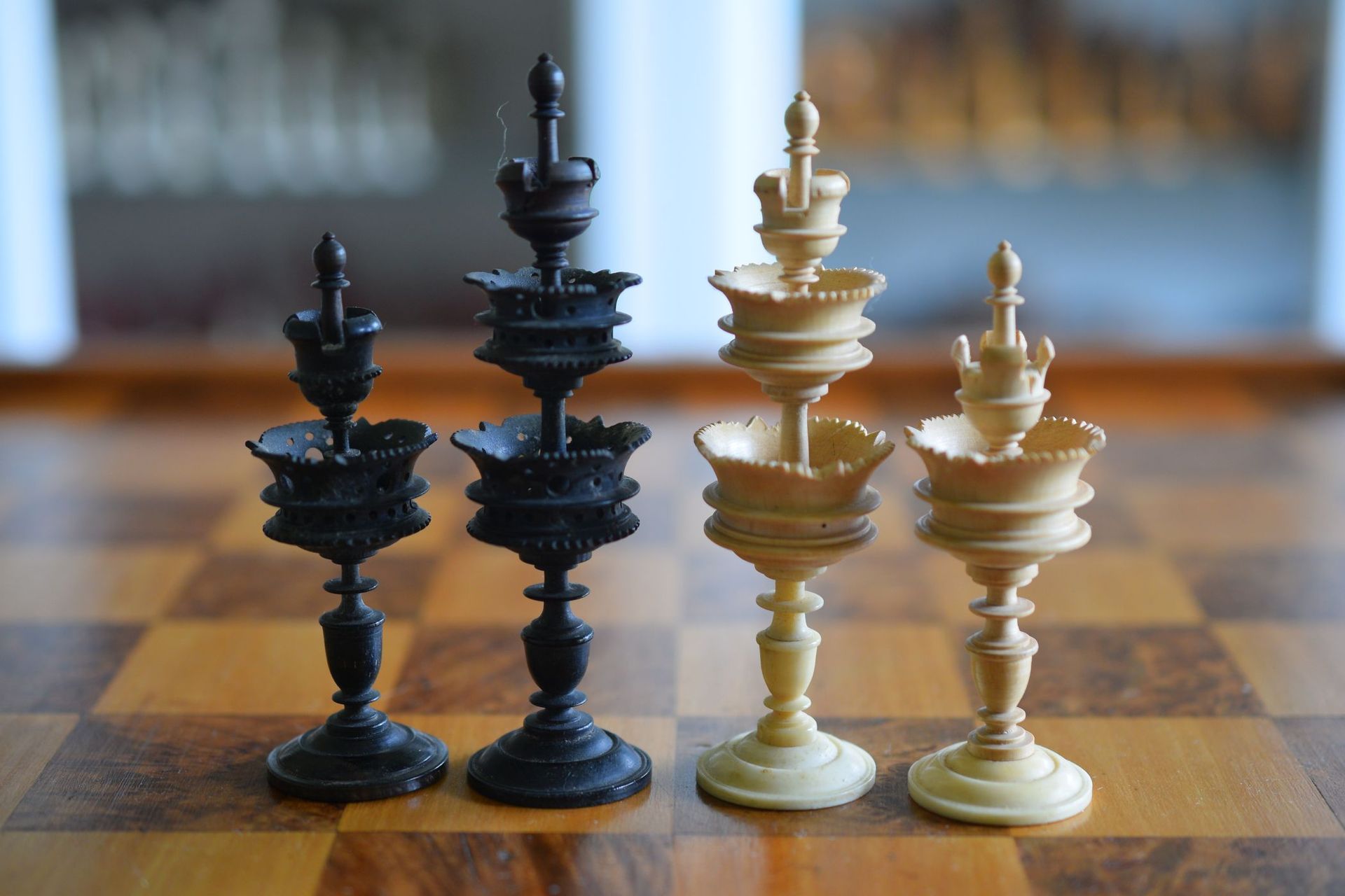 A rare mid-19th century German chess set of the "Selenus" type with a king size of 10.2 cm. The set is very unusual as this is a set which apparently was repaired at some stage. While I would normally stay away from sets with a large number of repairs, this one is different. The white side pieces are made of high quality bone (in fact, the auctioneer thought this to be ivory, but I am convinced it is bone), but some parts were replaced with wooden parts. These wooden parts were made in such a high quality themselves from what appears to be fruitwood that it would be difficult to distinguish them from the original were it not for the obvious differences in the material. The black side is turned from ebony. The kings with two pierced galleries, the queens with one.