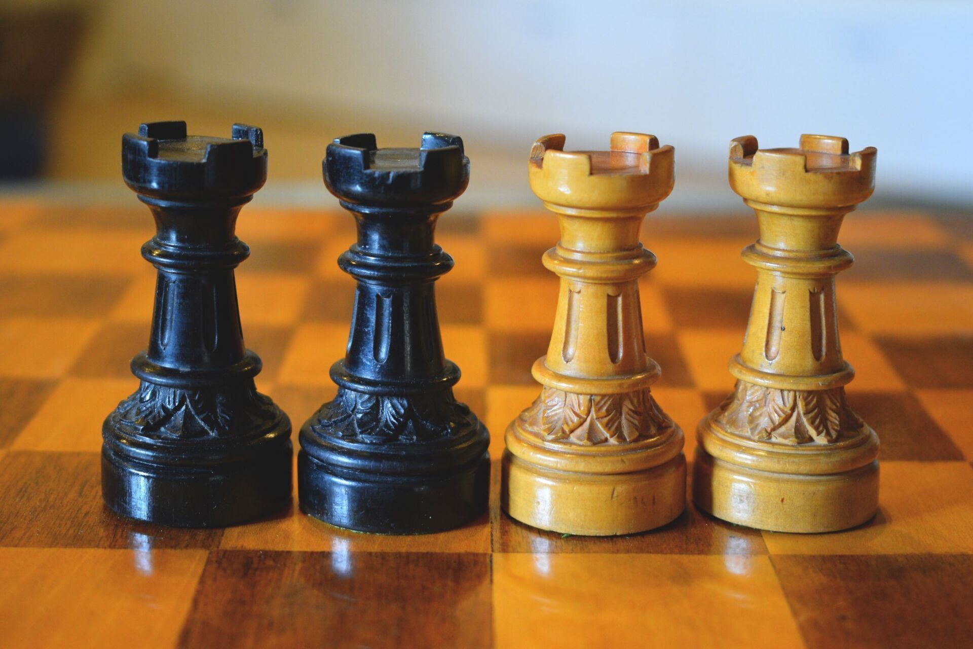 A beautifully turned and carved tournament chess set, the pieces made of boxwood and ebony. The king size is 97 mm (3.8"). All pieces are heavily weighted. The kings with long slender shafts topped with a leaf ornamented crown and a drop shaped finial in the opposite colour. The queens of similar shape but smaller, the crown with a ring of pearls and a small ball finial in the opposite colour. The bishops with a crown similar to the kings' crown, but smaller and with a pointed elipsoid inlay in the opposite colour instead of a mitre cut. The knights as elegantly carved horses with very detailed carving of the mane. The rooks as slender turrets with four crenellations. The pawns of slender, conical shape with a ball finial. All pieces on circular bases topped with leaf ornaments and (with the exception of the knights) with vertical indentations in the shafts.
