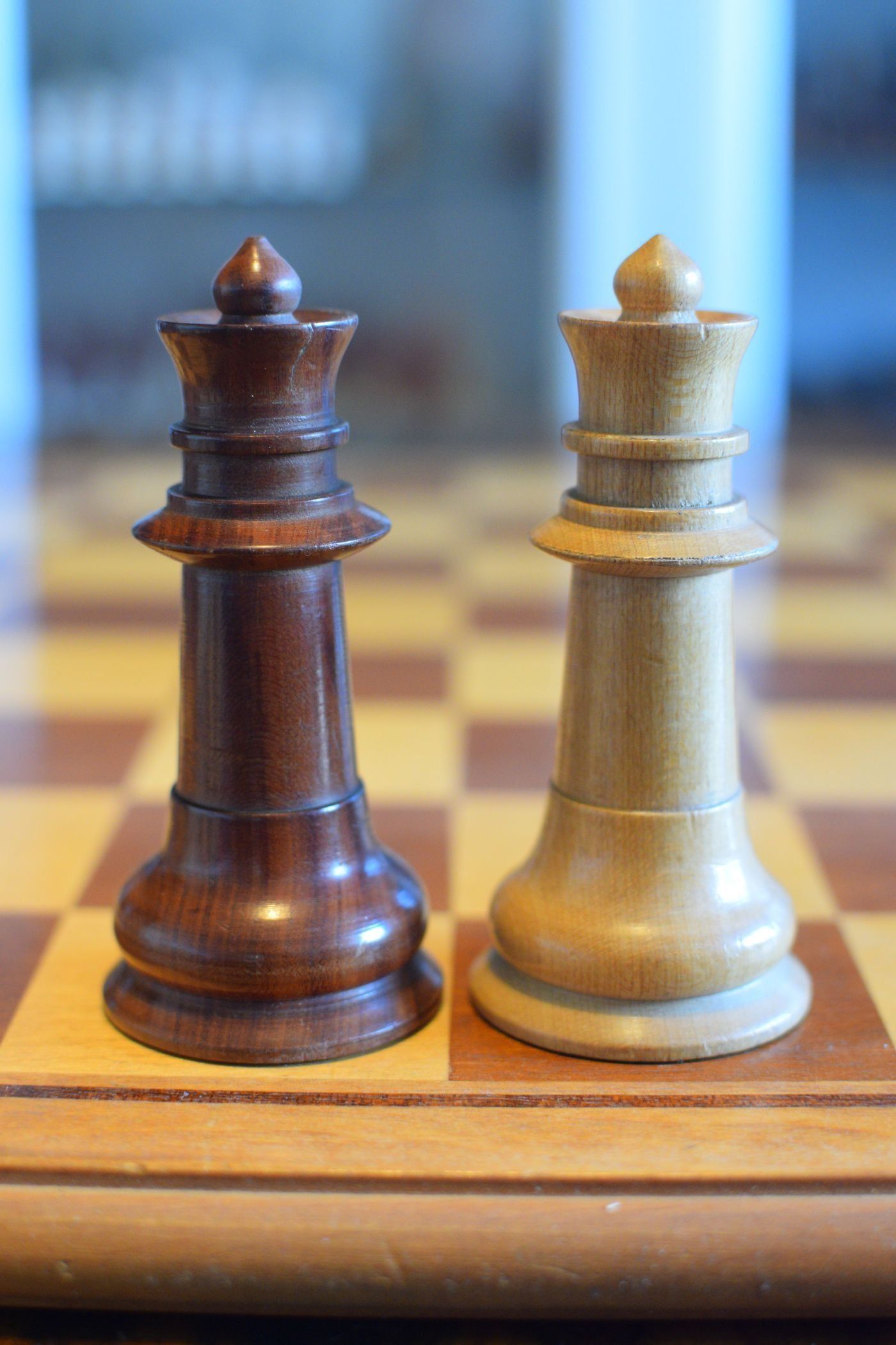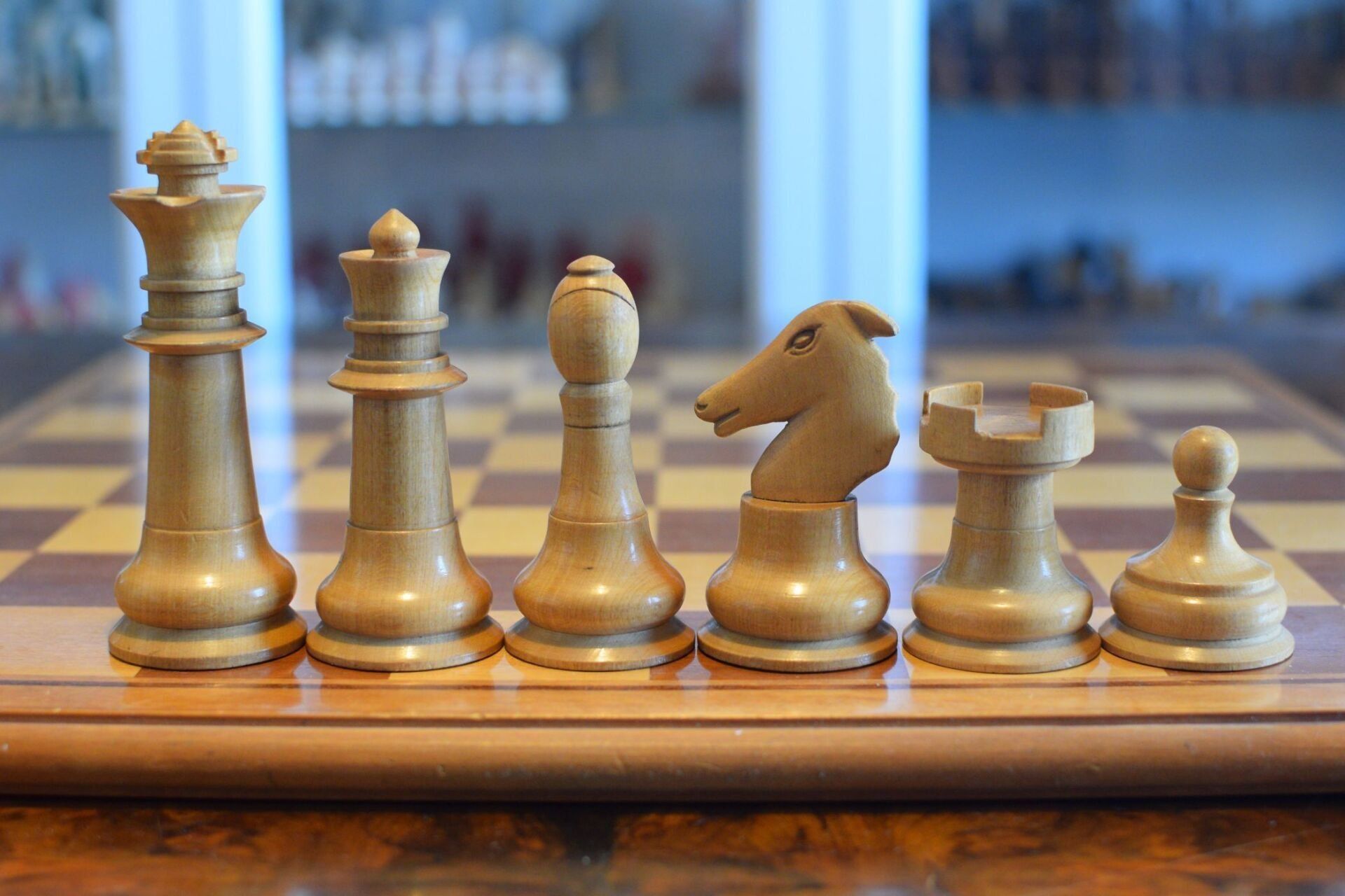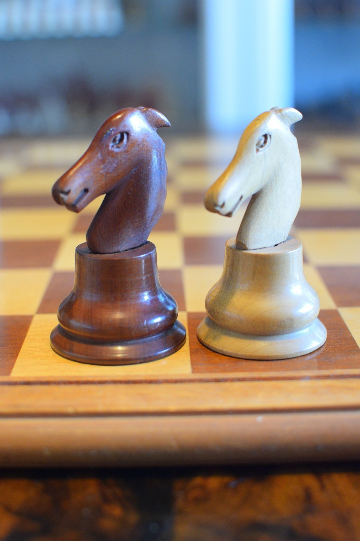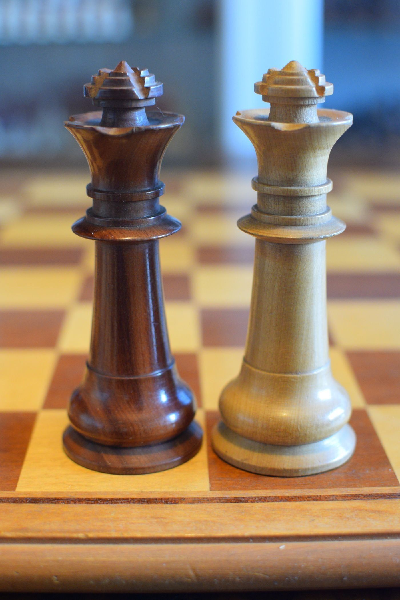 The kings have a height of 11 cm and do not have a cross finial but rather some tiered turned disks resembling a blossom. Queens with a drop finial. The rooks with overhanging crenellated top resembling those typical for chess sets from South Germany or Austria. The knights cut from flat wood in the shape of horses' heads. The bishops with thin mitre cuts. The pawns with unusually wide bases, which make the pawns almost as tall as wide (39mm diameter, 44 mm height), thus slightly reminding in shape of the pawns in German Knubbel sets.