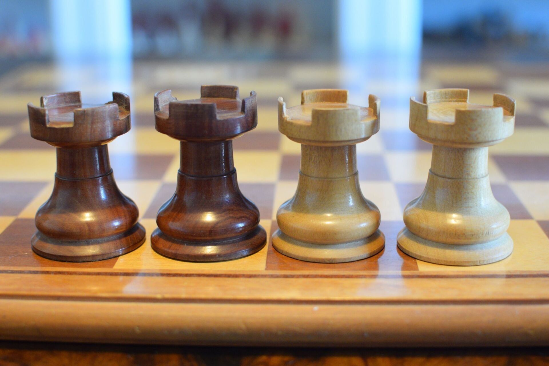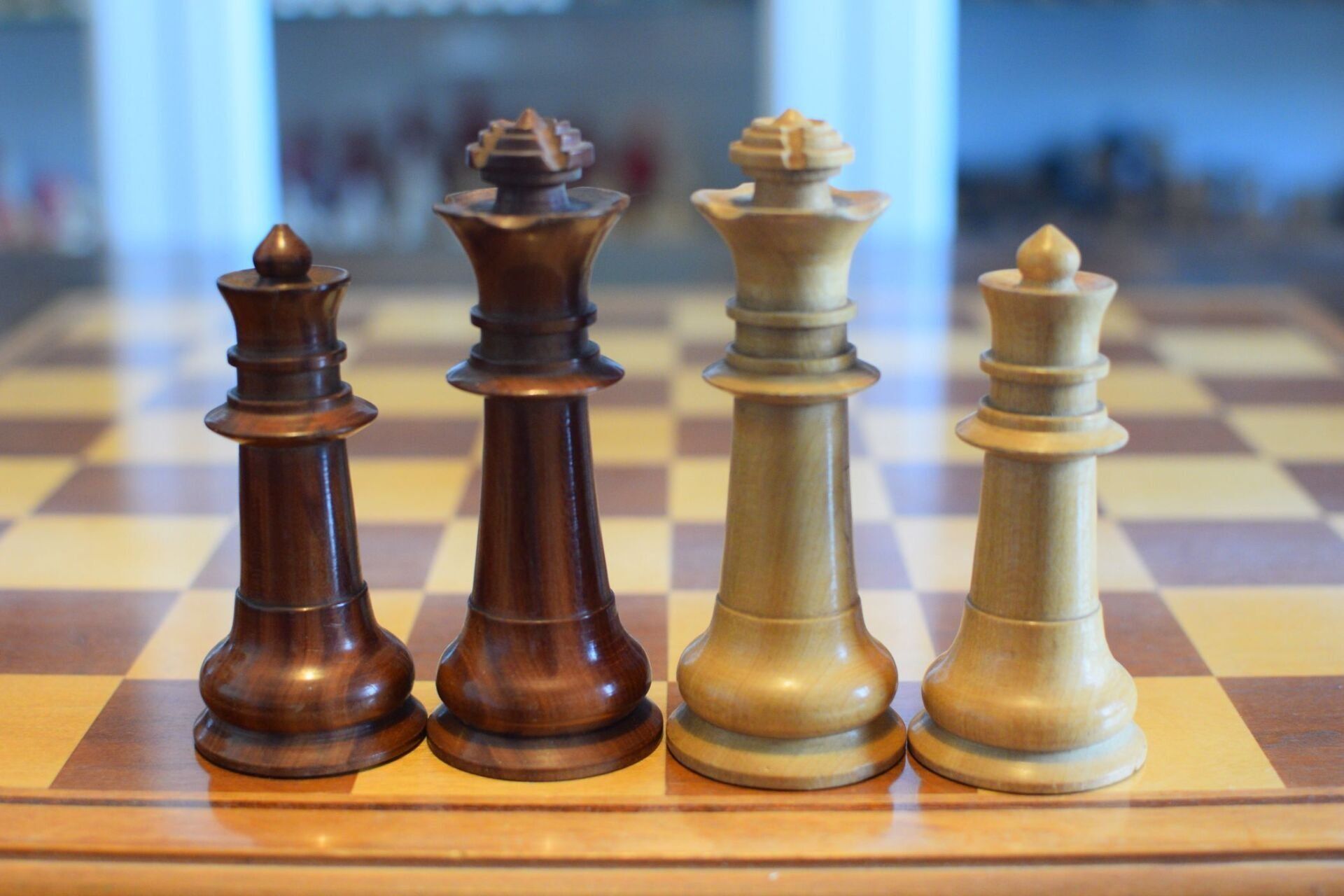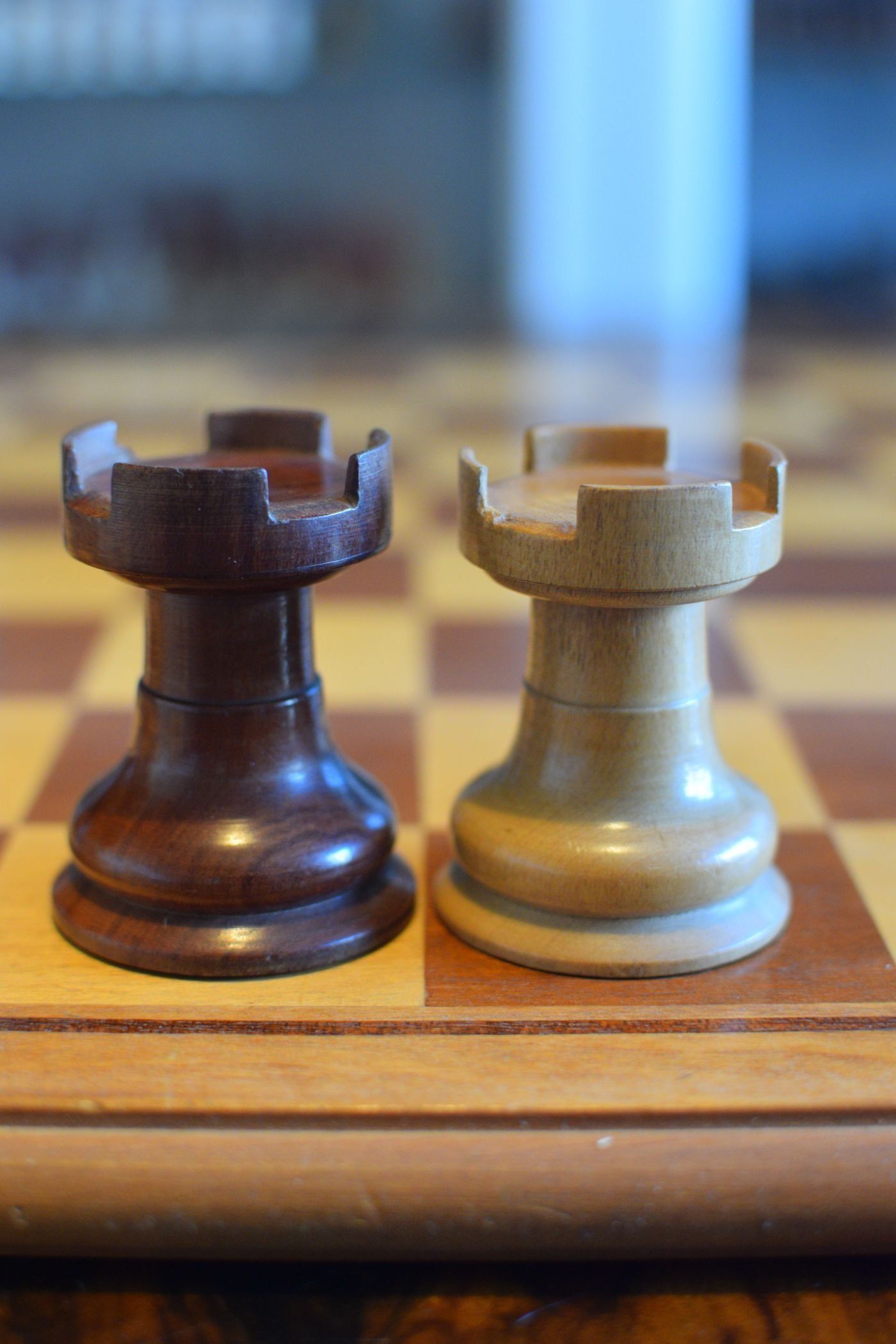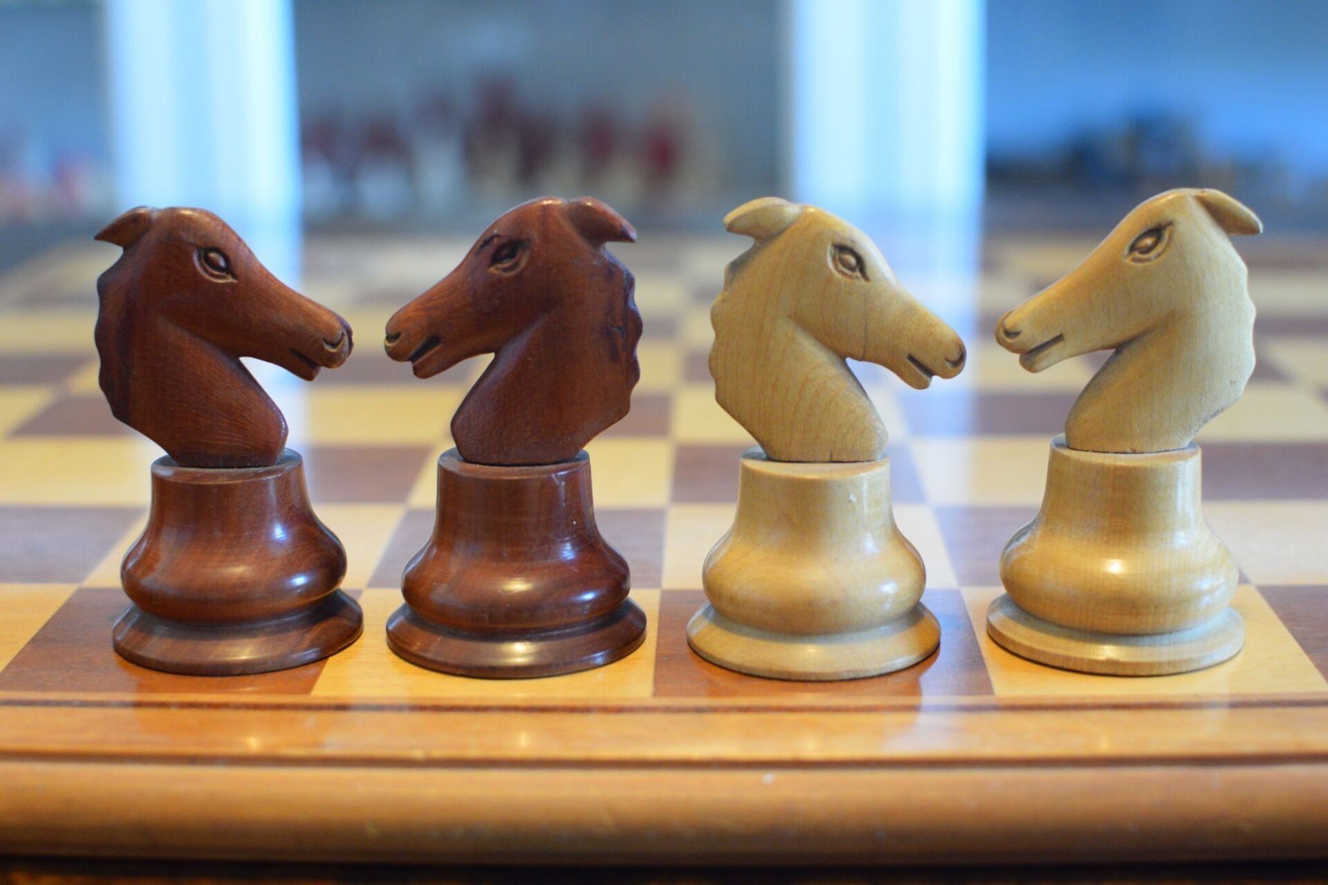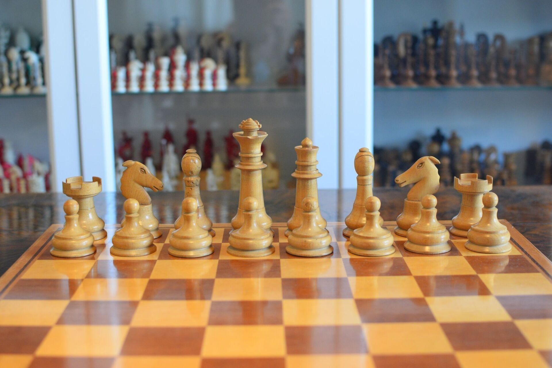 The kings have a height of 11 cm and do not have a cross finial but rather some tiered turned disks resembling a blossom. Queens with a drop finial. The rooks with overhanging crenellated top resembling those typical for chess sets from South Germany or Austria. The knights cut from flat wood in the shape of horses' heads. The bishops with thin mitre cuts. The pawns with unusually wide bases, which make the pawns almost as tall as wide (39mm diameter, 44 mm height), thus slightly reminding in shape of the pawns in German Knubbel sets.