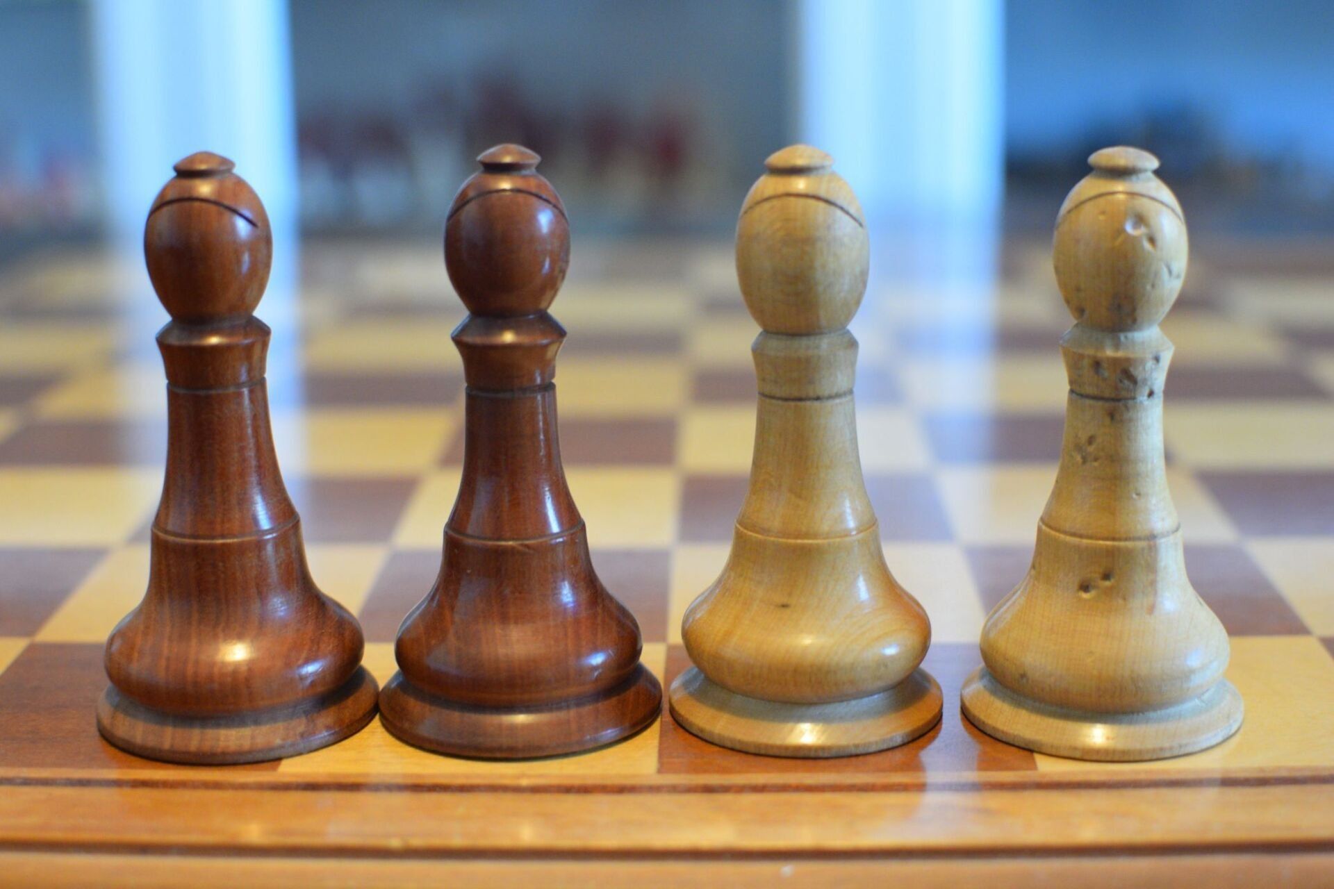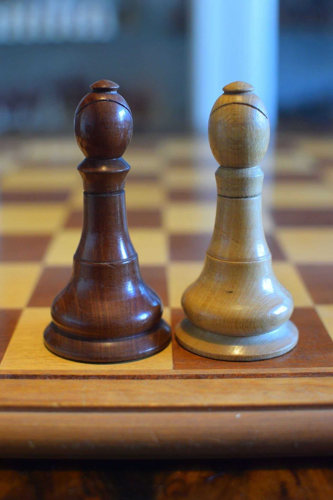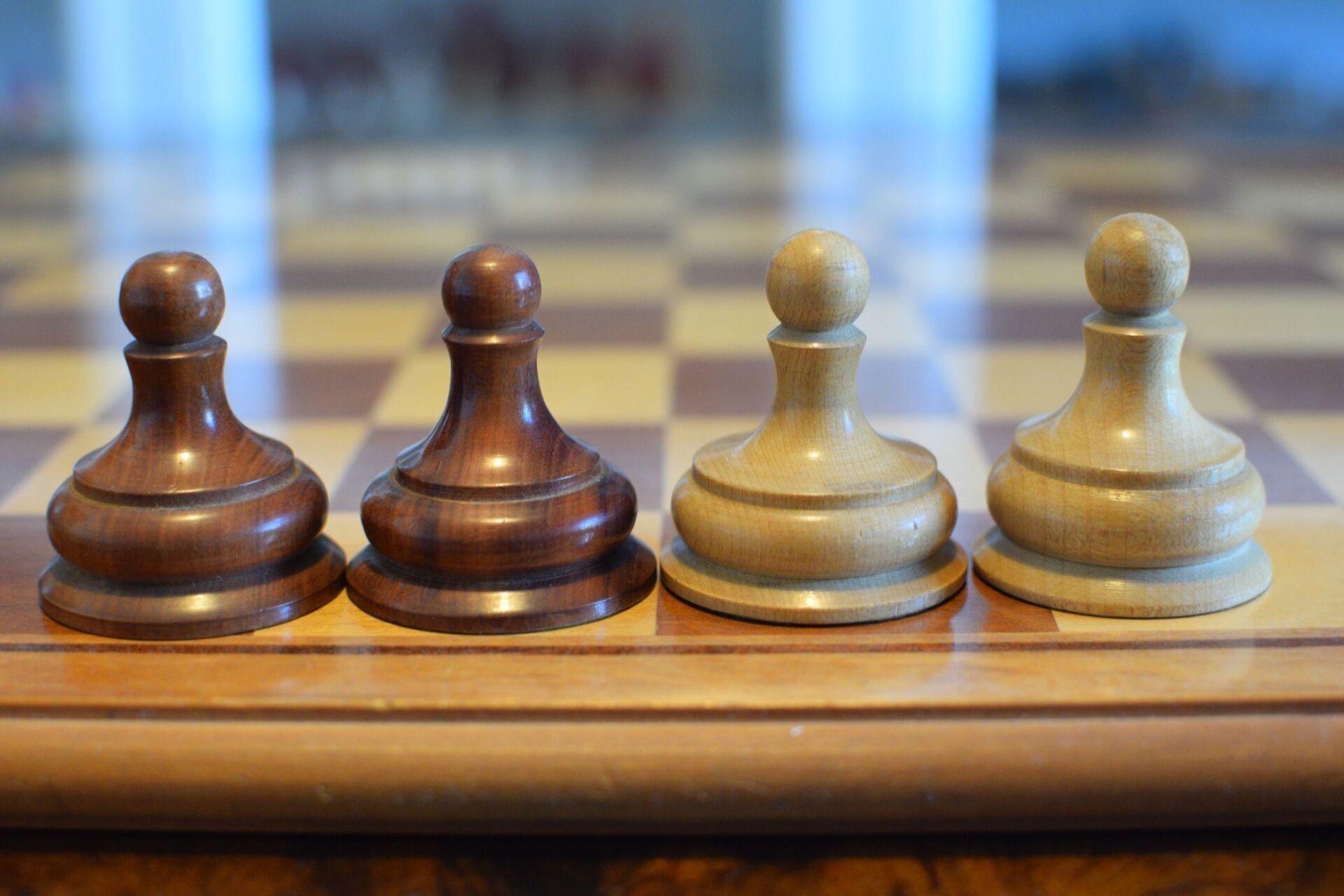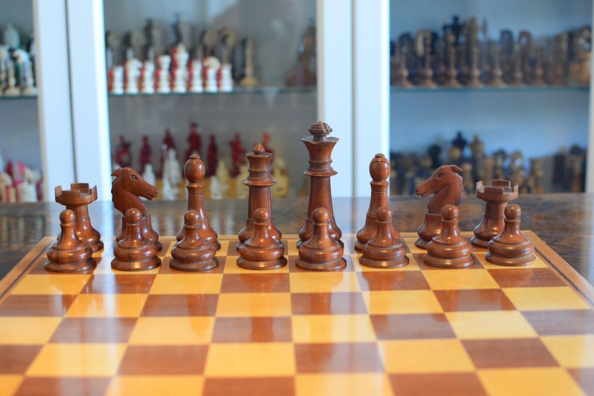 The kings have a height of 11 cm and do not have a cross finial but rather some tiered turned disks resembling a blossom. Queens with a drop finial. The rooks with overhanging crenellated top resembling those typical for chess sets from South Germany or Austria. The knights cut from flat wood in the shape of horses' heads. The bishops with thin mitre cuts. The pawns with unusually wide bases, which make the pawns almost as tall as wide (39mm diameter, 44 mm height), thus slightly reminding in shape of the pawns in German Knubbel sets.
