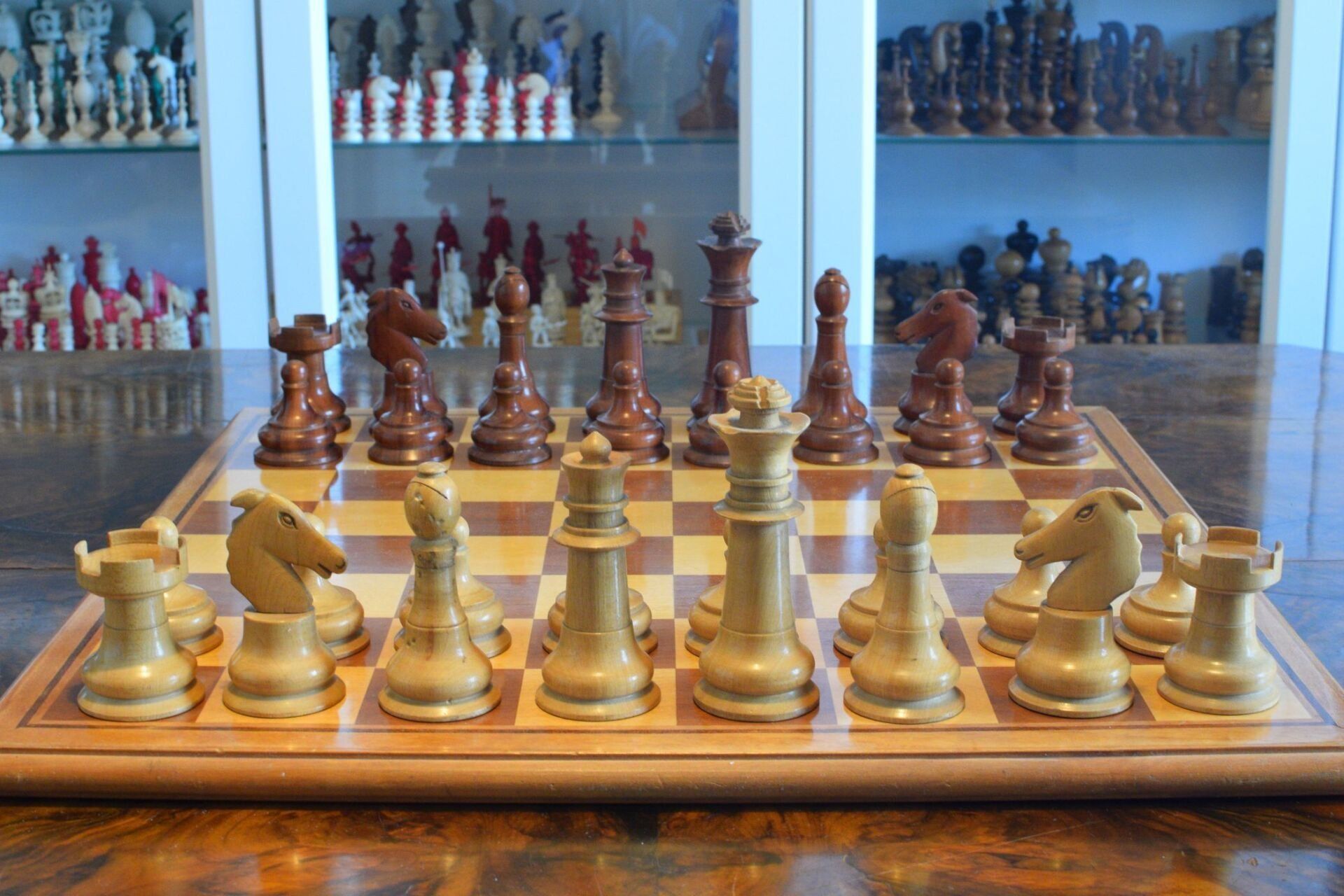 An interesting and unusual chess set, one side made of boxwood, the other side made of a darker wood with clearly visible grain, probably walnut. I have no information on this set whatsoever, but it was probably made in Germany in the early 20th century. The pieces are covered on the underside with an almost paperlike thin felt in a faded green, which I have seen on several sets from the 1910's and 1920's.