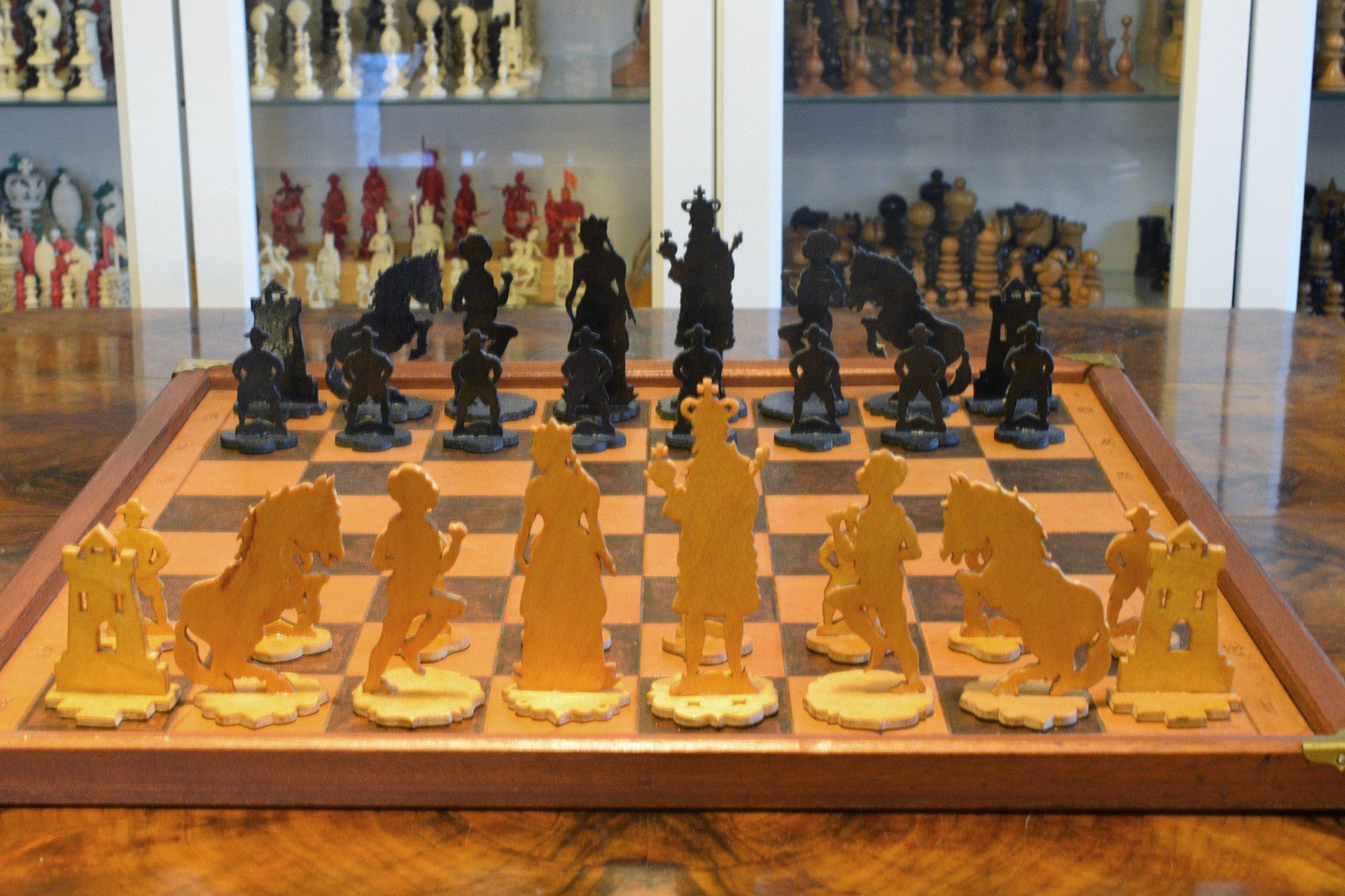 This is a somewhat unusual chess set, in which the pieces are silhouettes of a medieval court. The pieces are fretworked from plywood. On the underside are pale green thin felts similar to those used in southern Germany and Austria in the late 19th or early 20th century. The kings have a height of 12 cm and are depicted with sceptre and orb. The queens are court ladies with long braids. The bishops are depicted as runners, which indicates a German origin, as this is the literal meaning of the term "Läufer" used in German. The knights as rearing horses. The rooks are relatively small and depicted as a silhouette of a fortified tower. The type of sawing resembles the handicrafts from the Ore Mountain and Nuremberg region, the German strongholds of toy production in the late 19th century. Similar patterns were used, for example, for the production of wooden Christmas ornaments. A most unusual and rare type of chess set.
