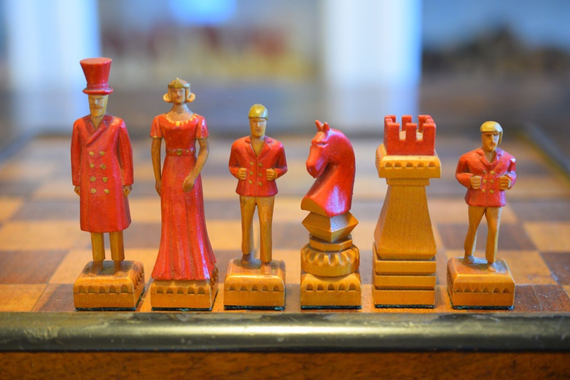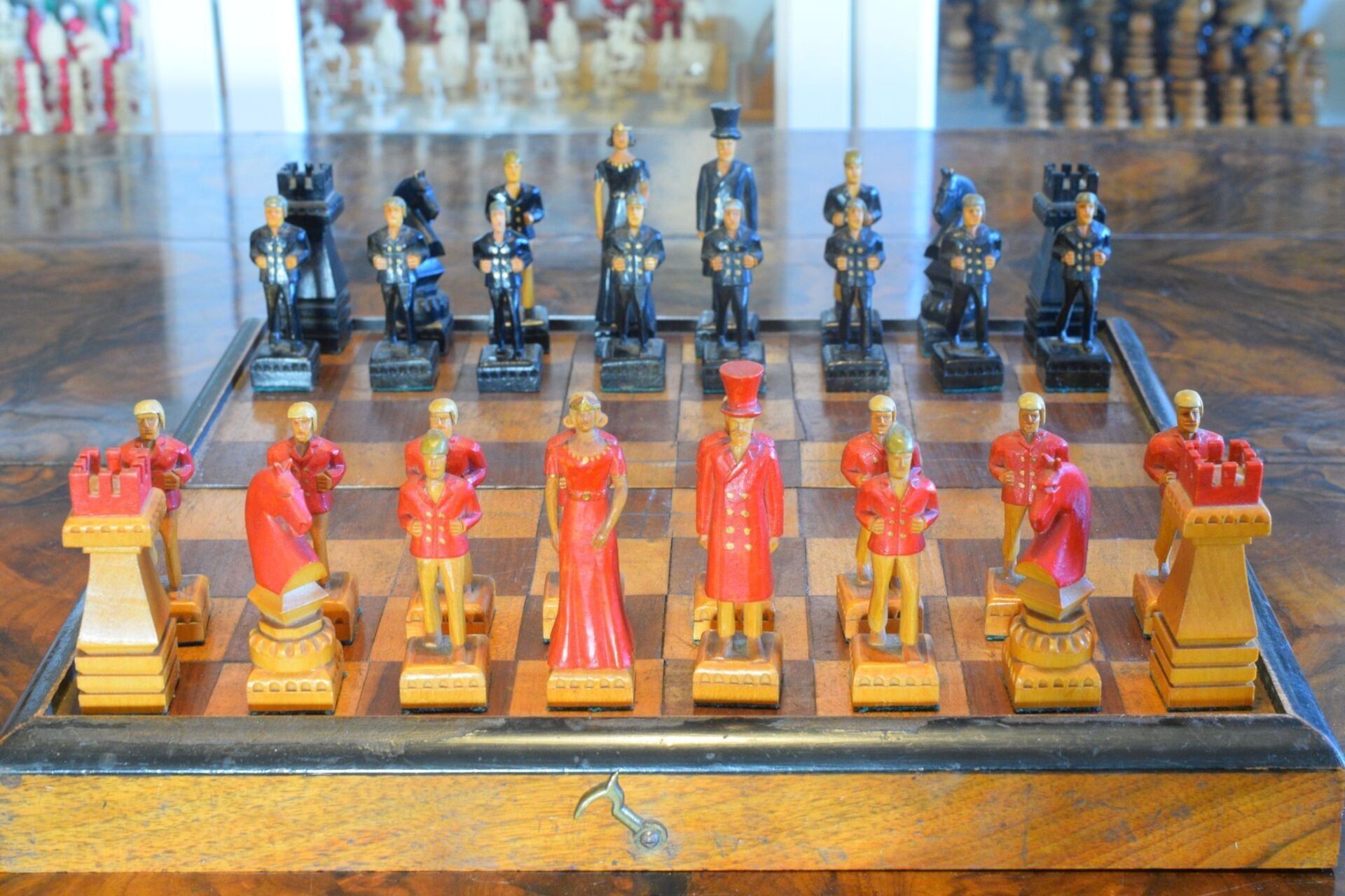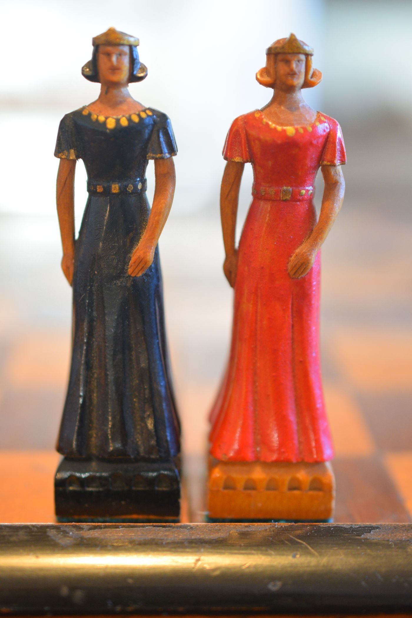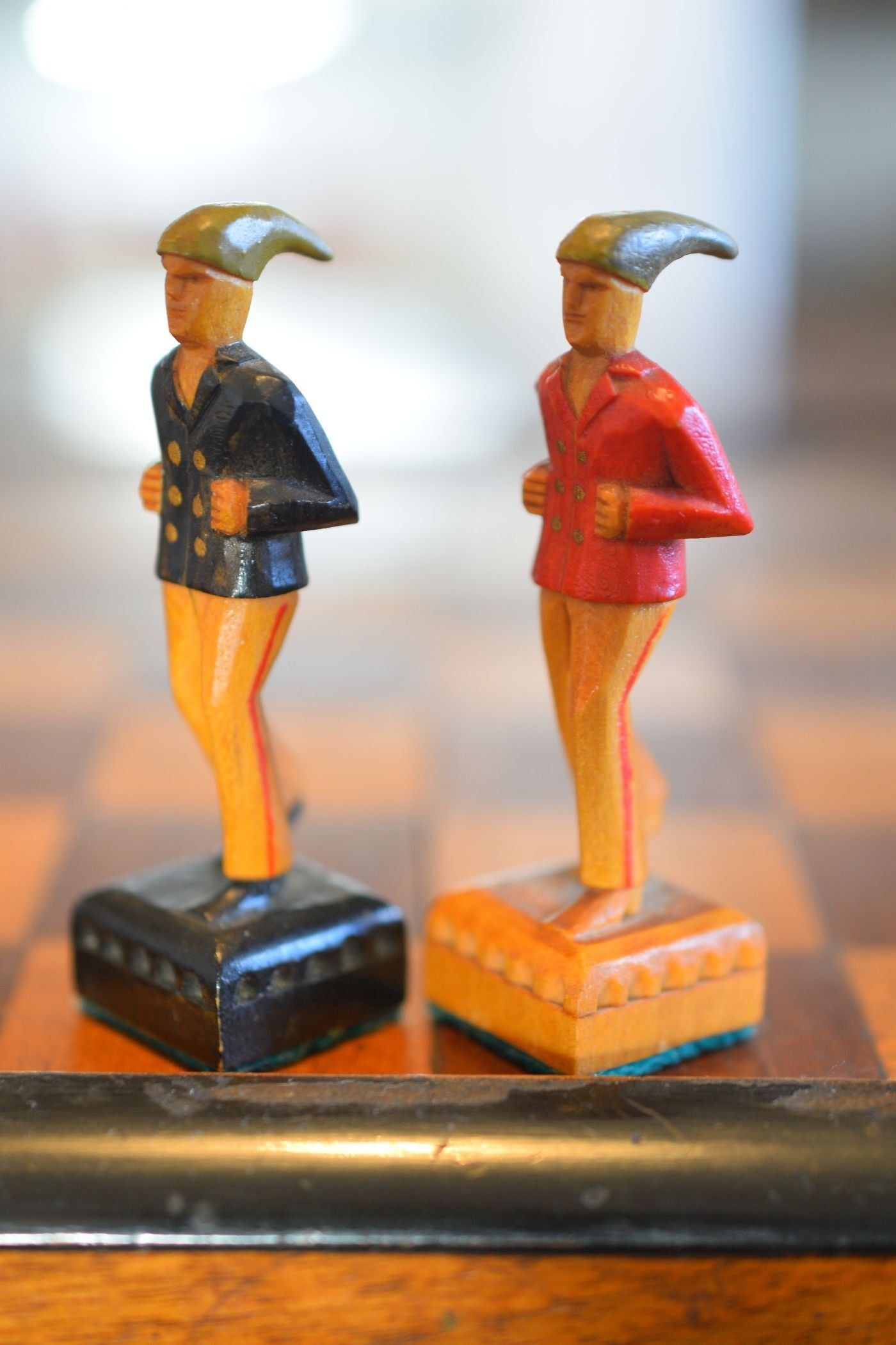 An unusual figural folk art chess set with a king size of 8.2 cm. The pieces are carved from wood, one side predominantly in red, the other side predominantly in black. The kings are depicted as wealthy citizens or aristocrats in a long coat with a double row of buttons and a tall top hat (somewhat reminiscent of kings in "Capitalist" themed chess sets). The queens wear a ball gown as well as a 1920s-style tiara on their heads. The bishops are depicted as German "Läufer", i.e. runners. They wear a long pointed cap sticking out backwards. The knights are depicted as horses' heads, diagonally shifted on an otherwise square base. The rooks are shown as high fortified towers with strongly pronounced battlement. The pawns are also depicted as running figures wearing a cap hanging down at one side.