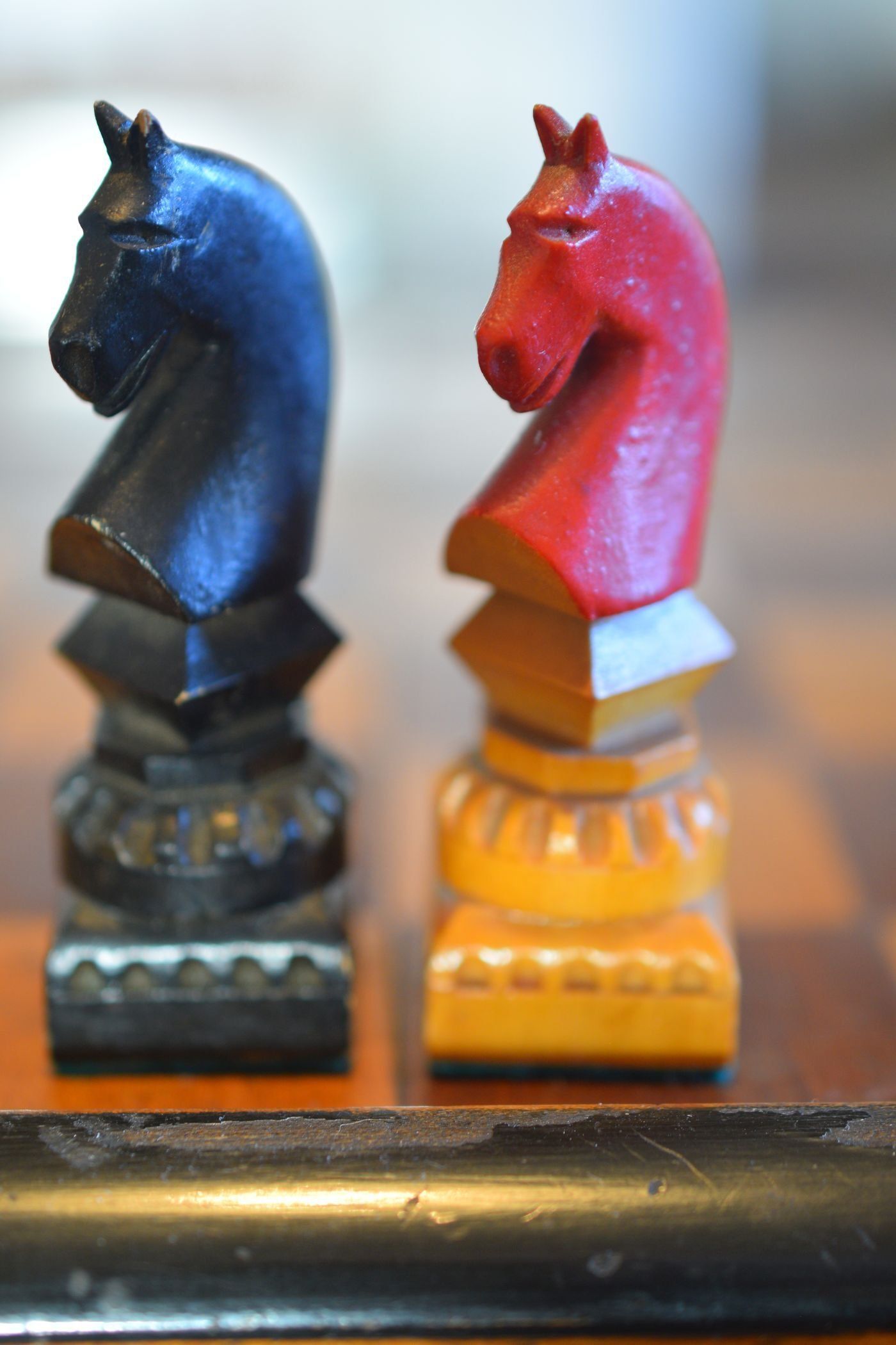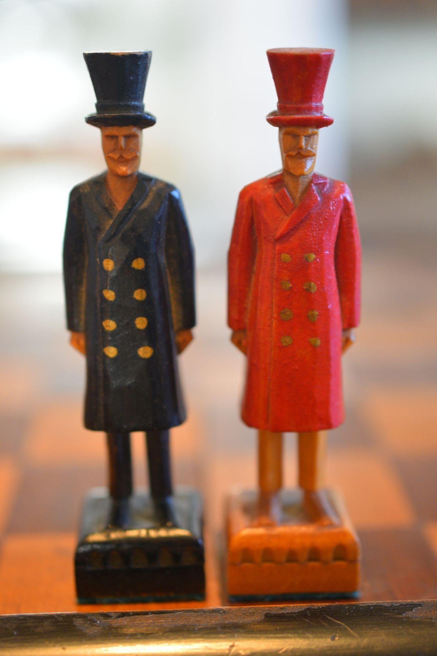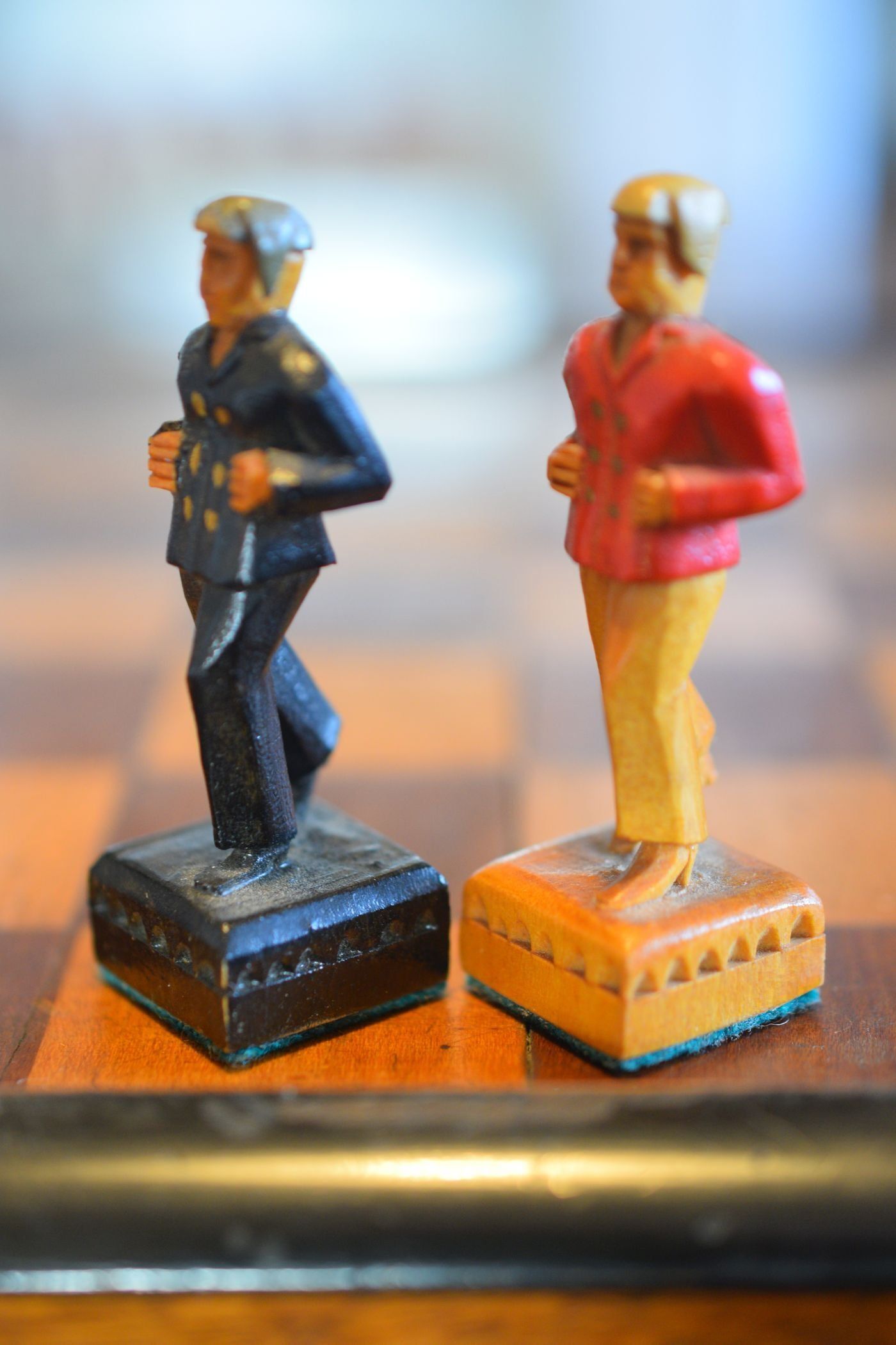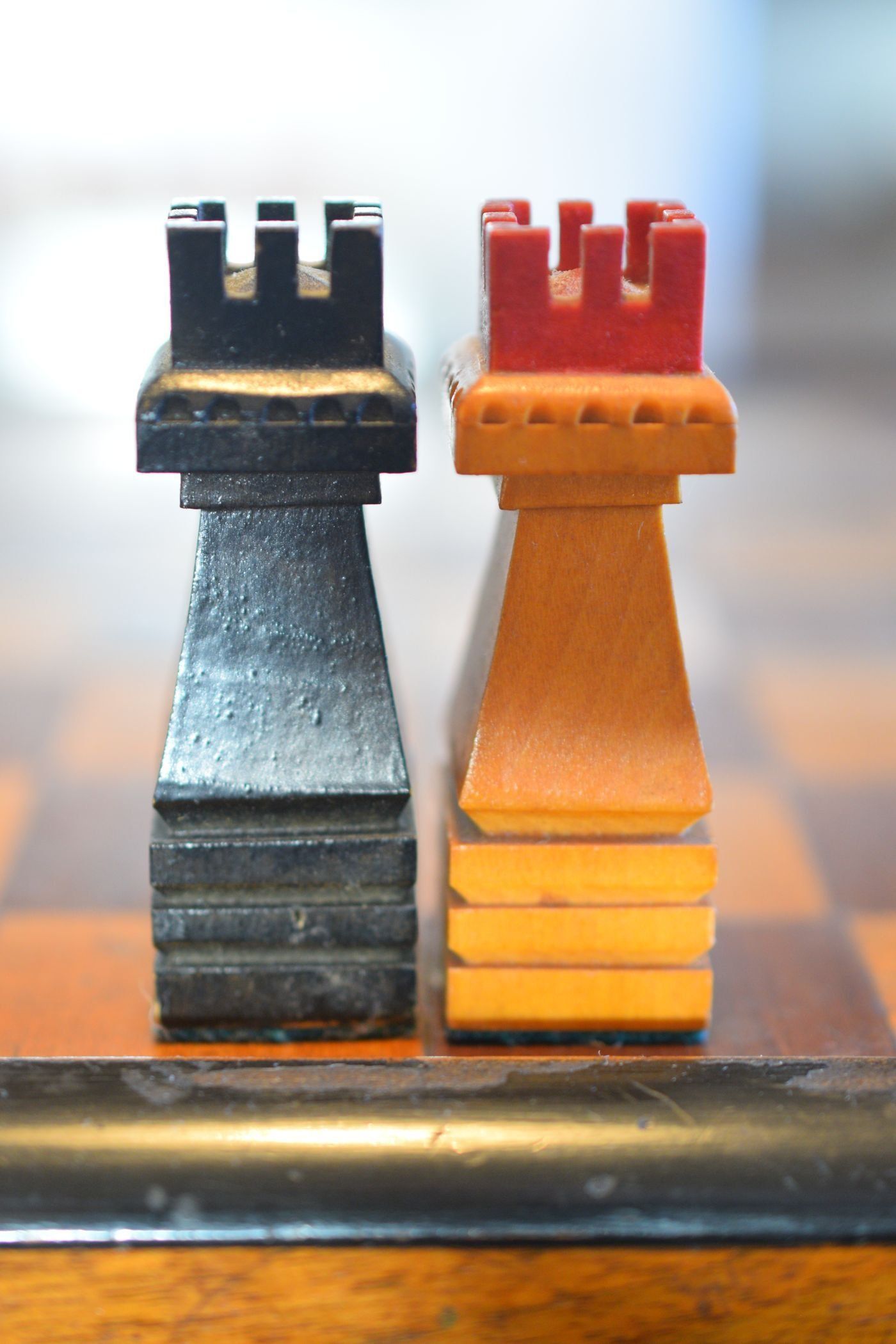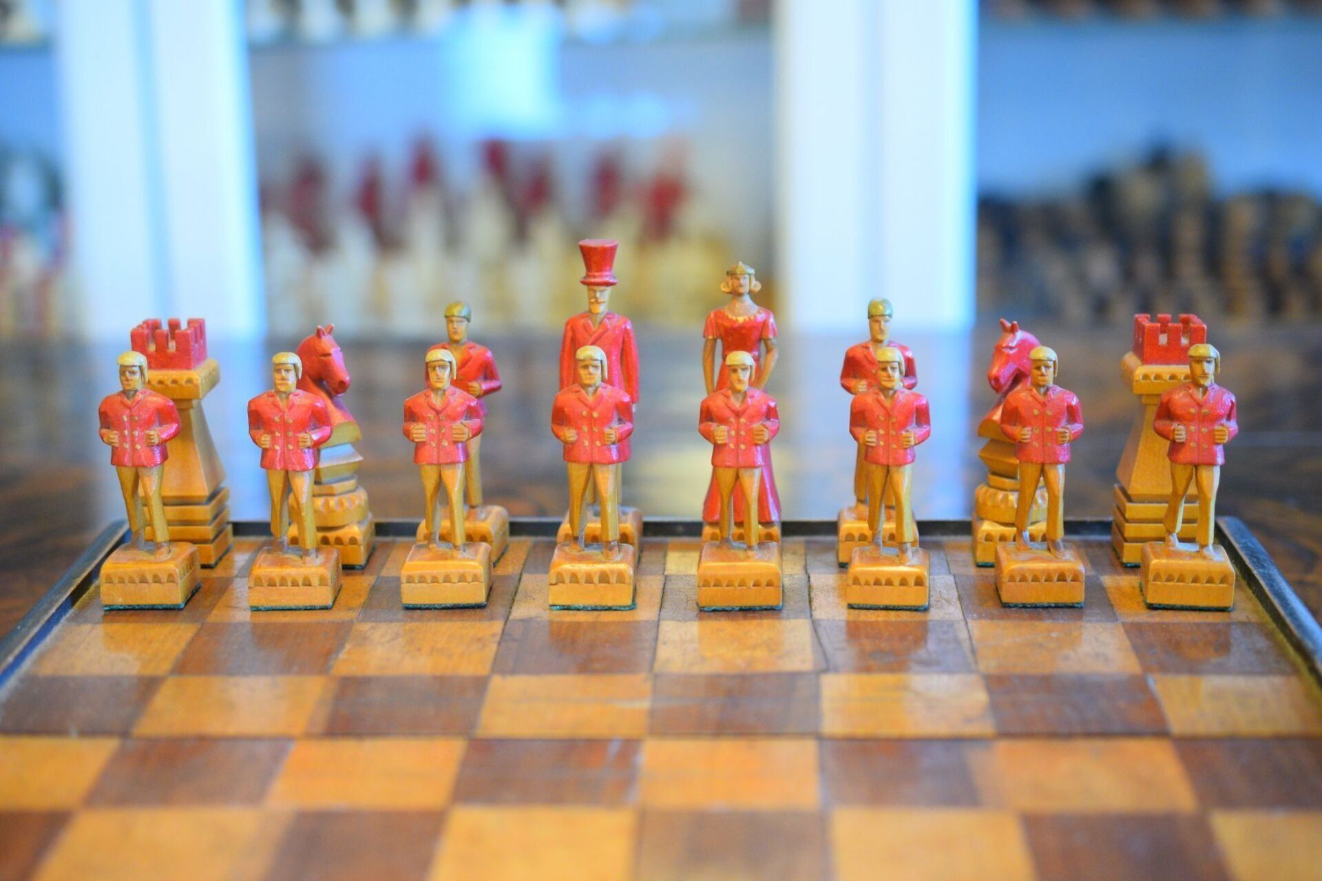 An unusual figural folk art chess set with a king size of 8.2 cm. The pieces are carved from wood, one side predominantly in red, the other side predominantly in black. The kings are depicted as wealthy citizens or aristocrats in a long coat with a double row of buttons and a tall top hat (somewhat reminiscent of kings in "Capitalist" themed chess sets). The queens wear a ball gown as well as a 1920s-style tiara on their heads. The bishops are depicted as German "Läufer", i.e. runners. They wear a long pointed cap sticking out backwards. The knights are depicted as horses' heads, diagonally shifted on an otherwise square base. The rooks are shown as high fortified towers with strongly pronounced battlement. The pawns are also depicted as running figures wearing a cap hanging down at one side.