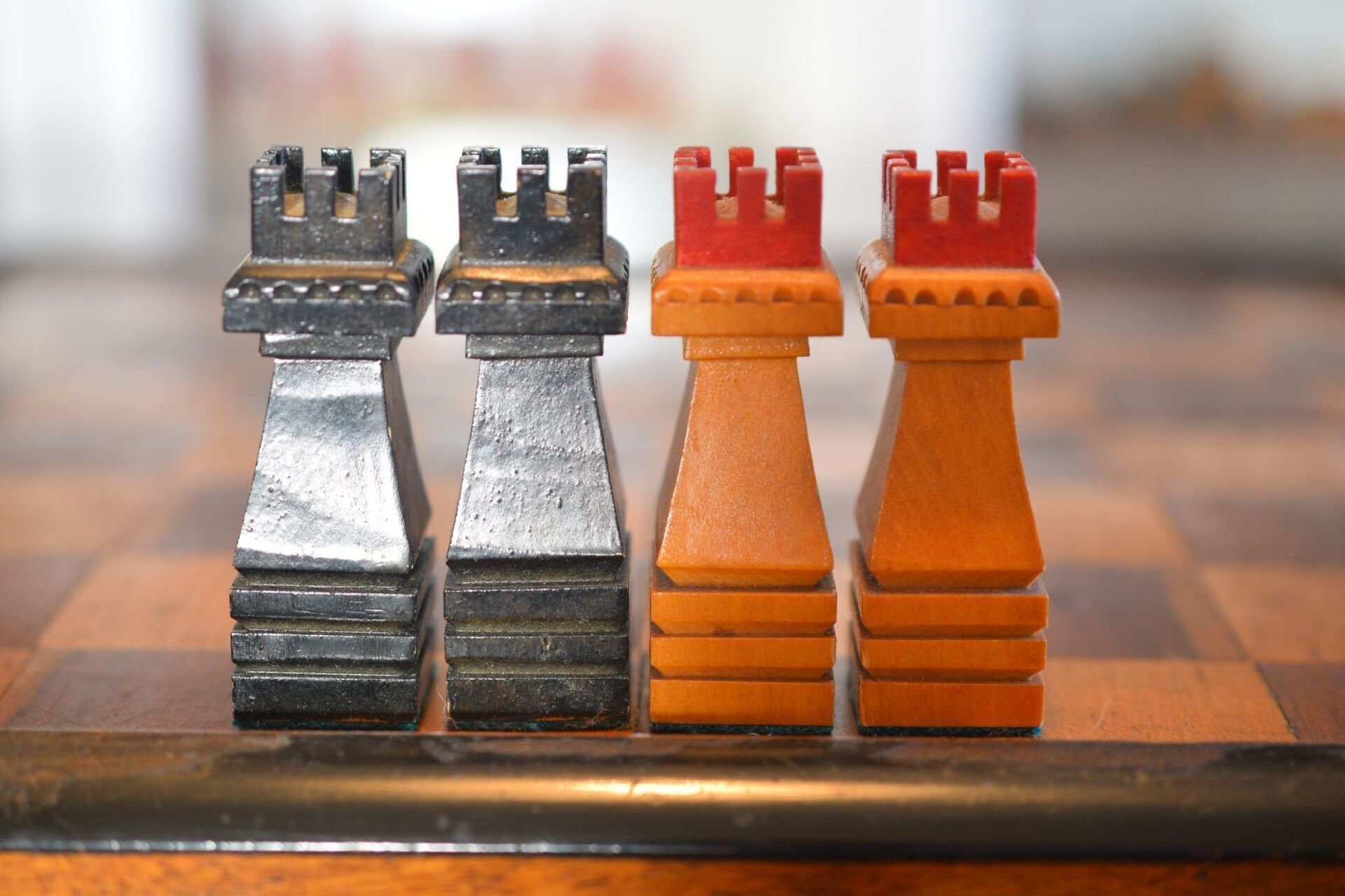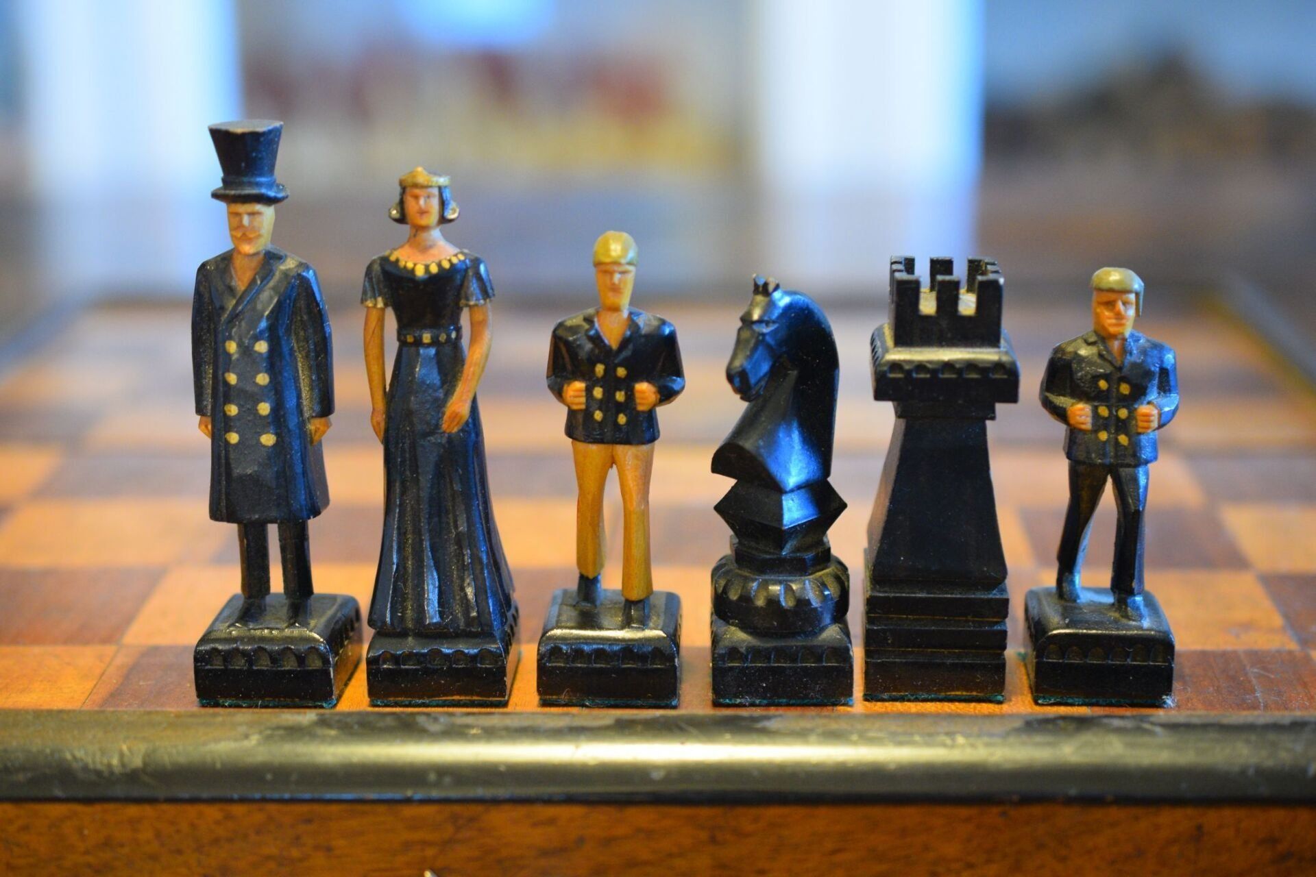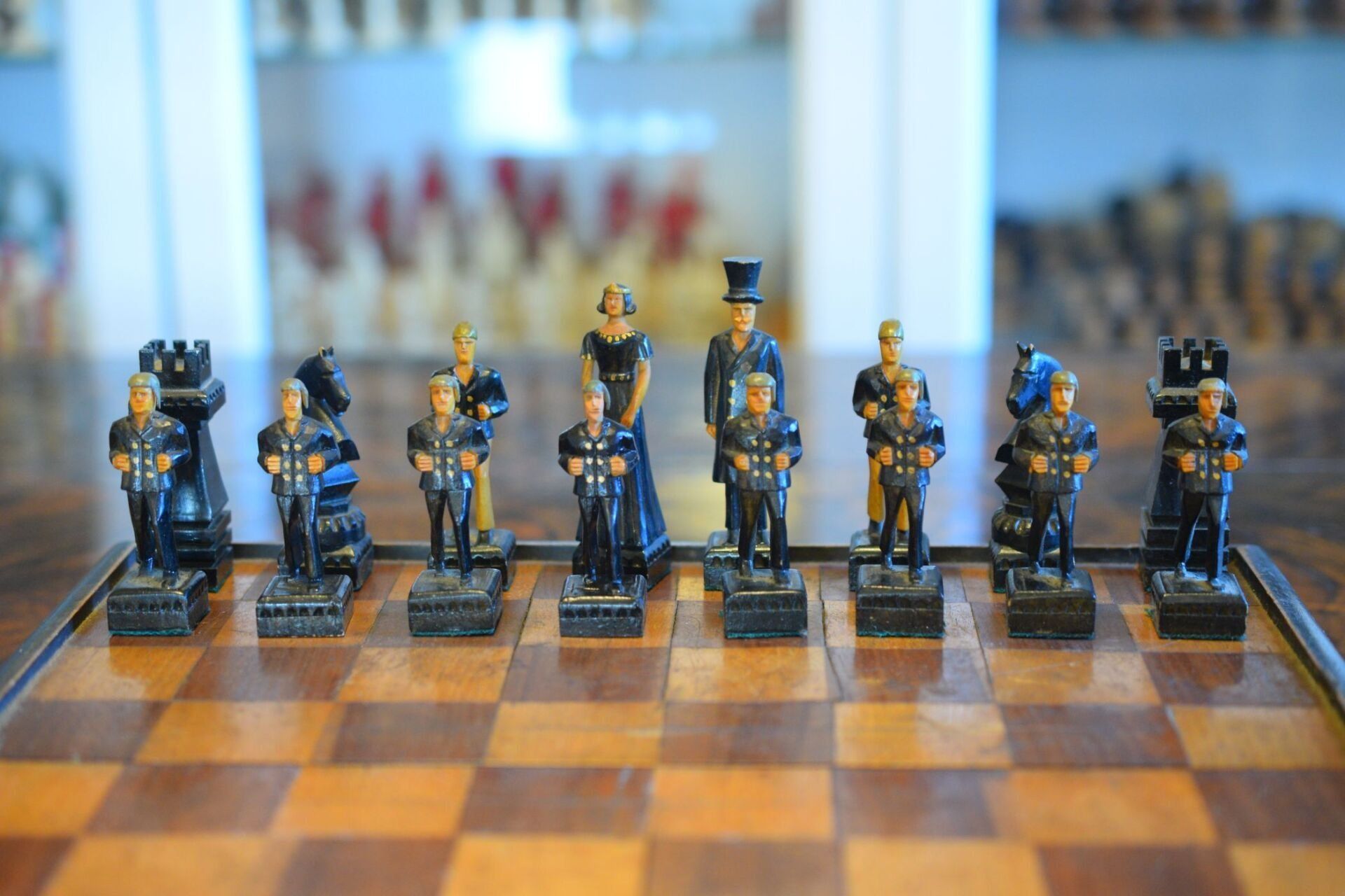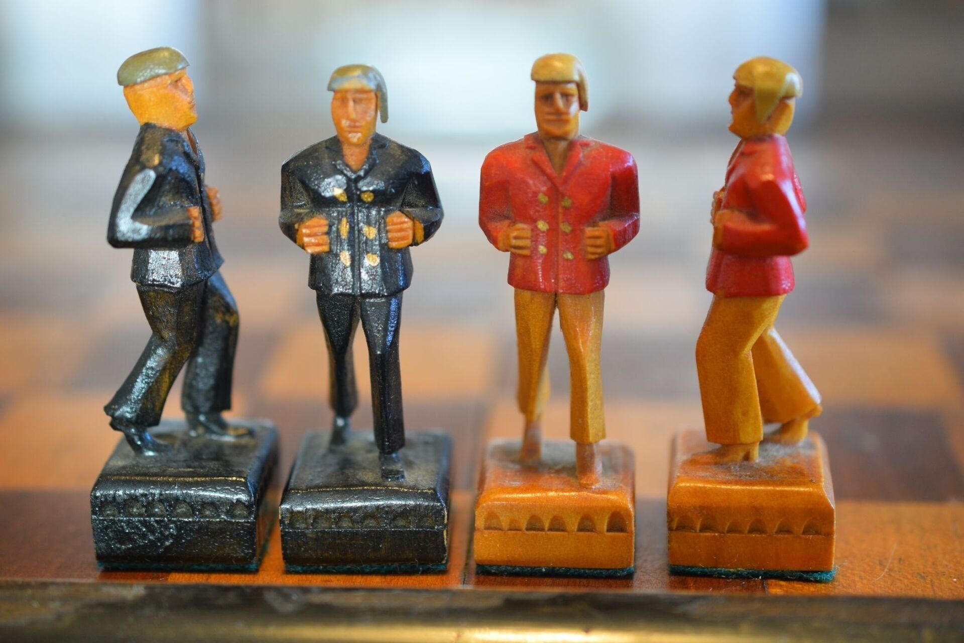 An unusual figural folk art chess set with a king size of 8.2 cm. The pieces are carved from wood, one side predominantly in red, the other side predominantly in black. The kings are depicted as wealthy citizens or aristocrats in a long coat with a double row of buttons and a tall top hat (somewhat reminiscent of kings in "Capitalist" themed chess sets). The queens wear a ball gown as well as a 1920s-style tiara on their heads. The bishops are depicted as German "Läufer", i.e. runners. They wear a long pointed cap sticking out backwards. The knights are depicted as horses' heads, diagonally shifted on an otherwise square base. The rooks are shown as high fortified towers with strongly pronounced battlement. The pawns are also depicted as running figures wearing a cap hanging down at one side.