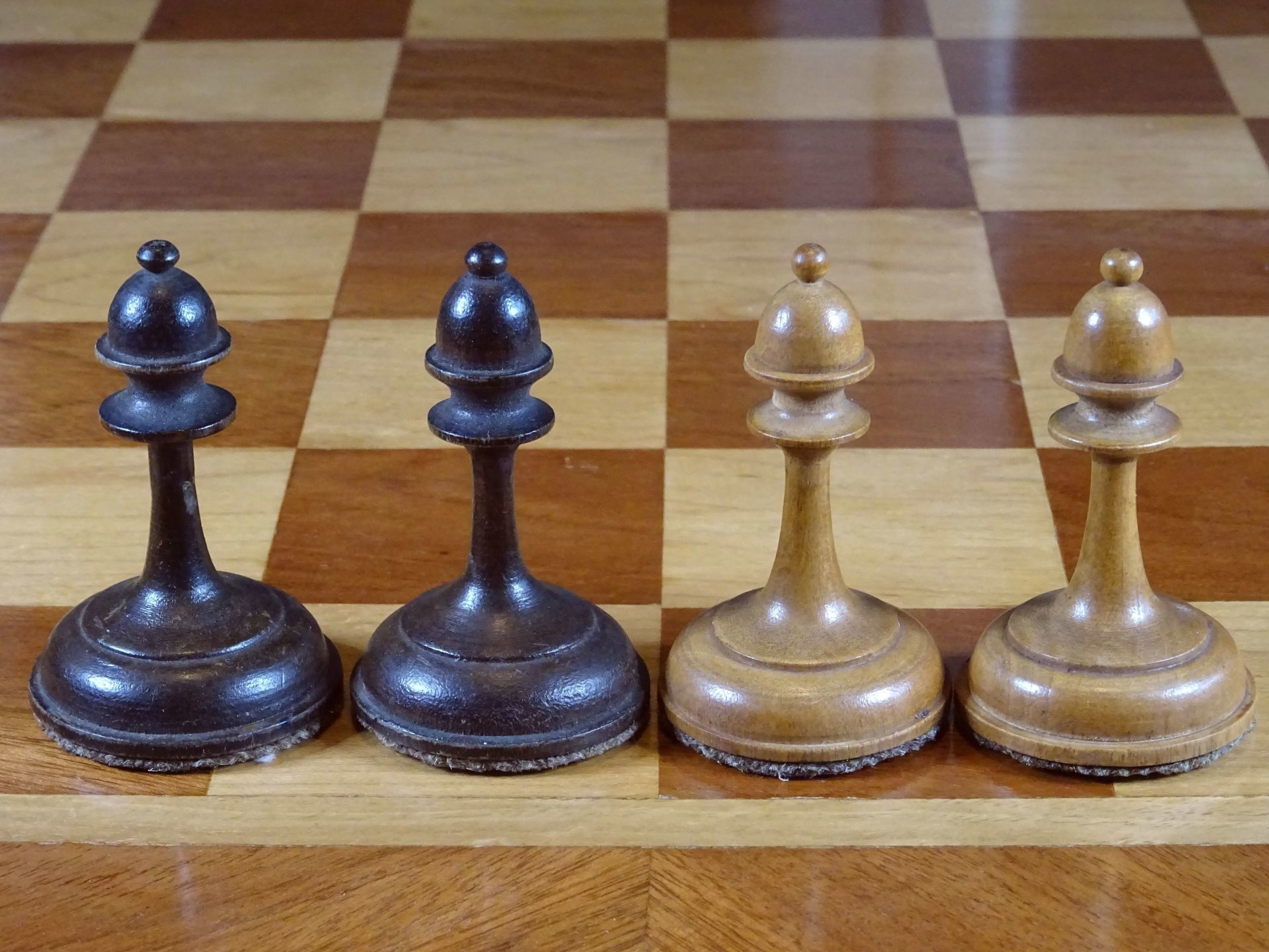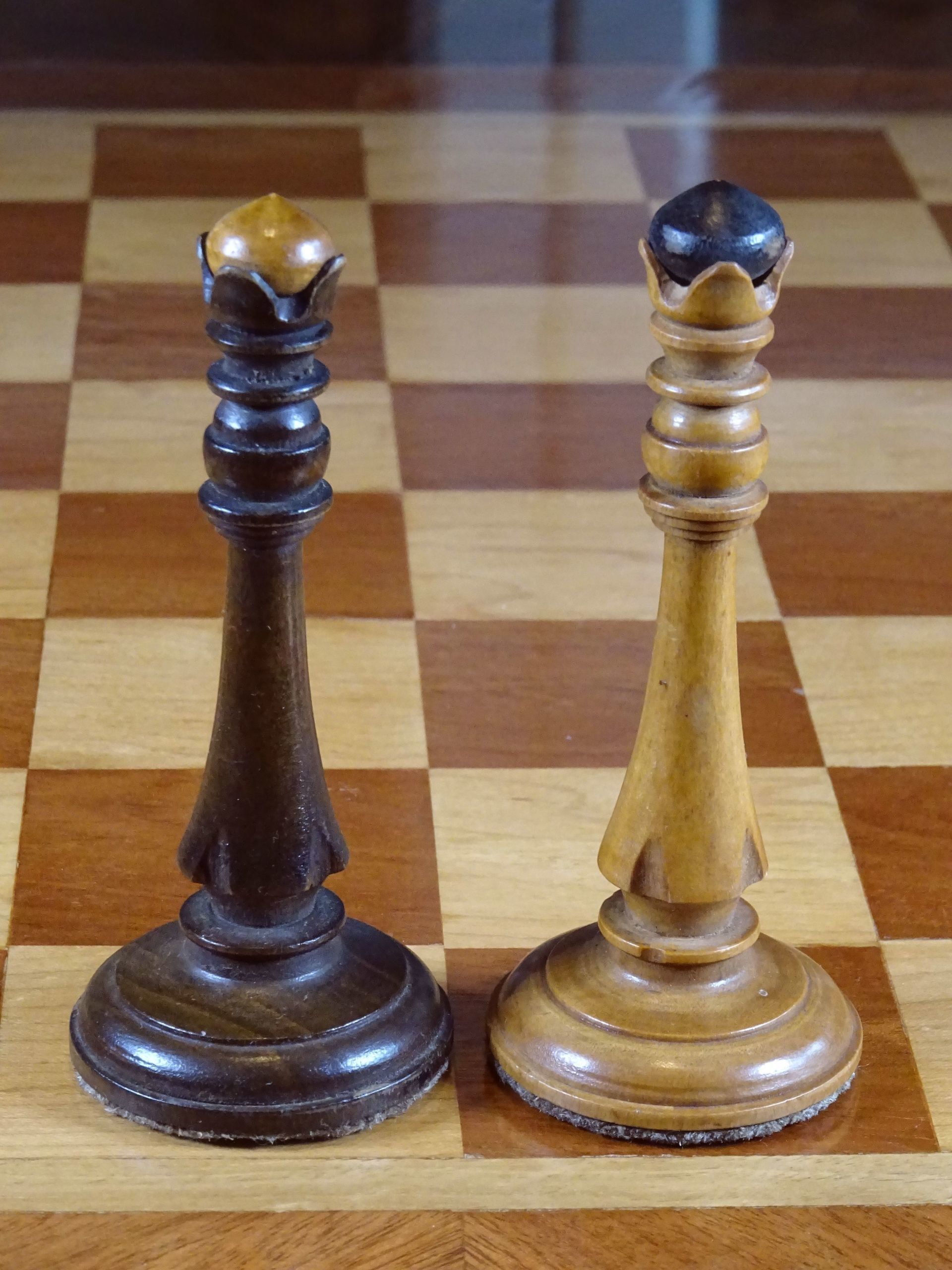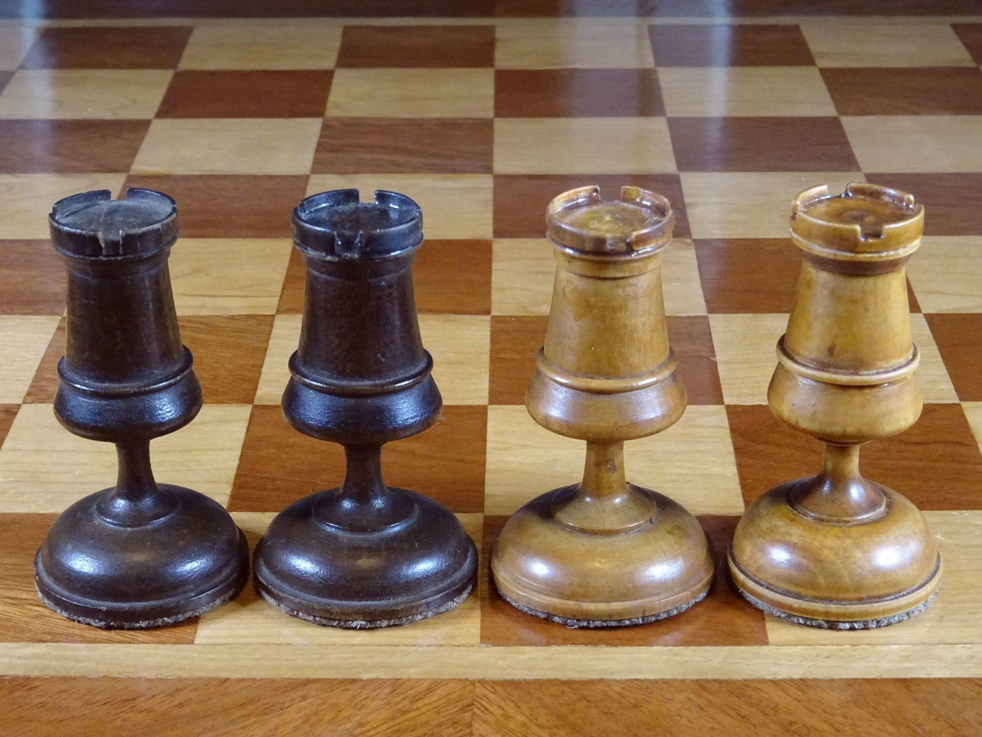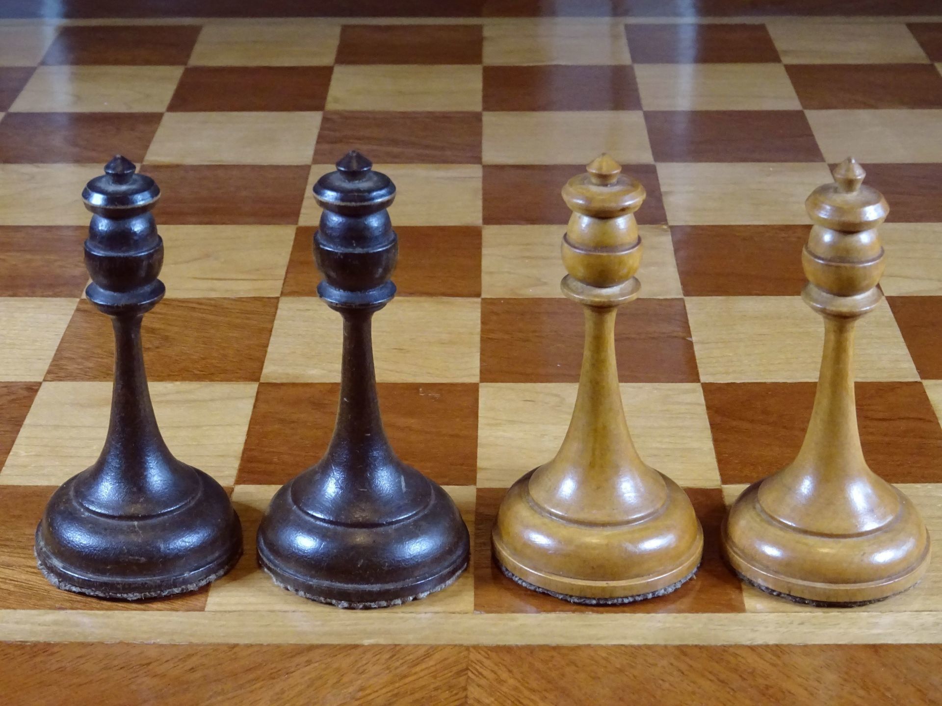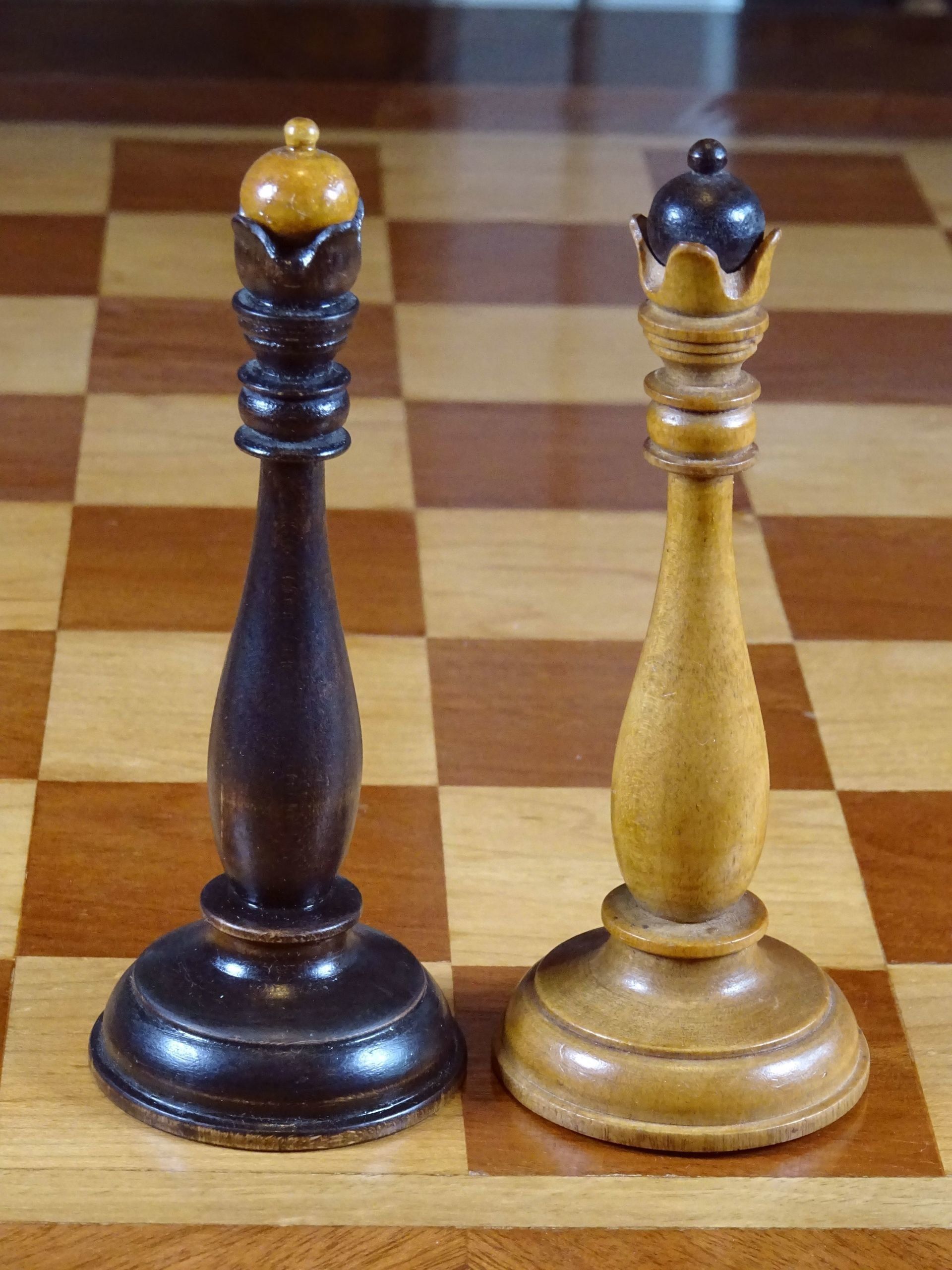Russian chess set presumably from the late 19th or early 20th century. Pieces made of wood, one side natural with a beautiful patina gained by age, the other stained in dark brown. Despite the very slim shapes with elongated stems, the pieces are very playable due to the broad bases, which are weighted with lead. King size is 10.5 cm.