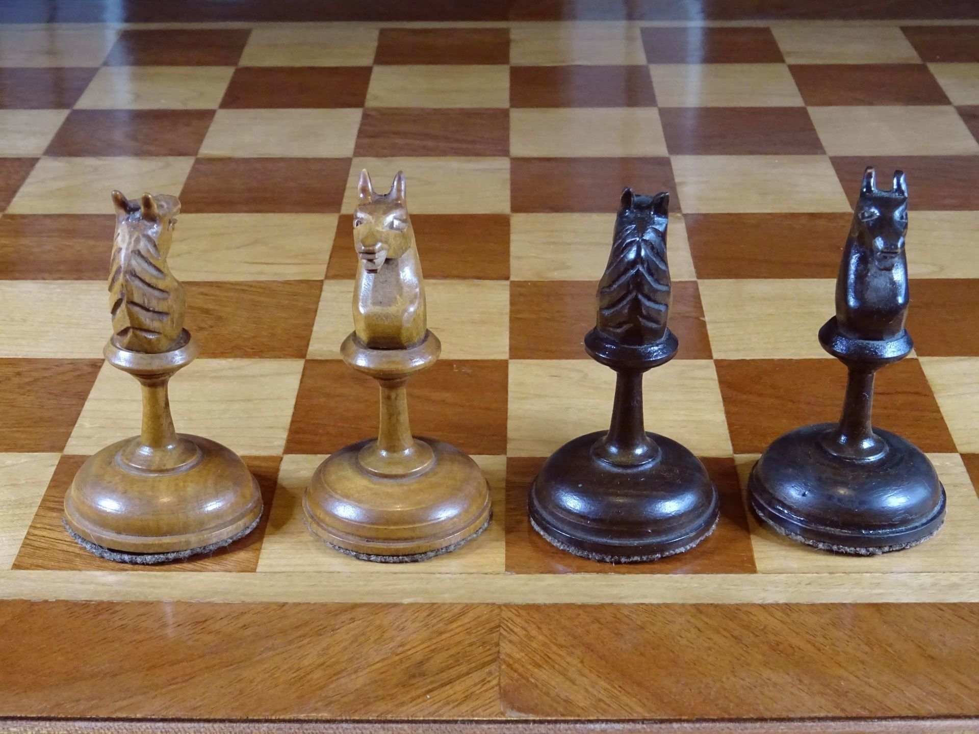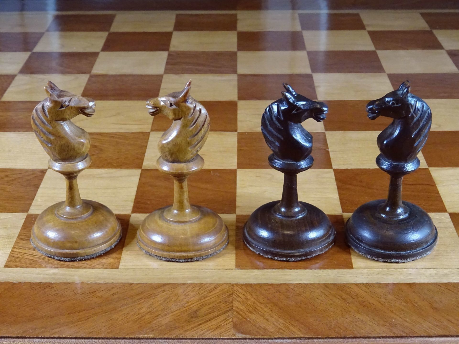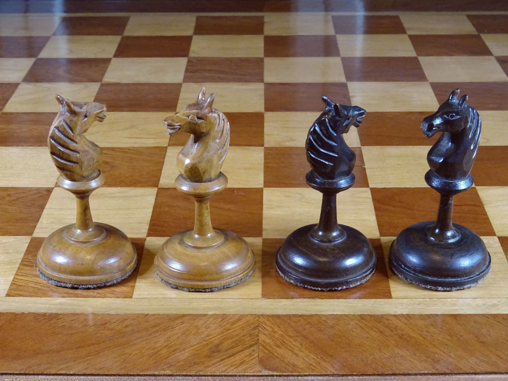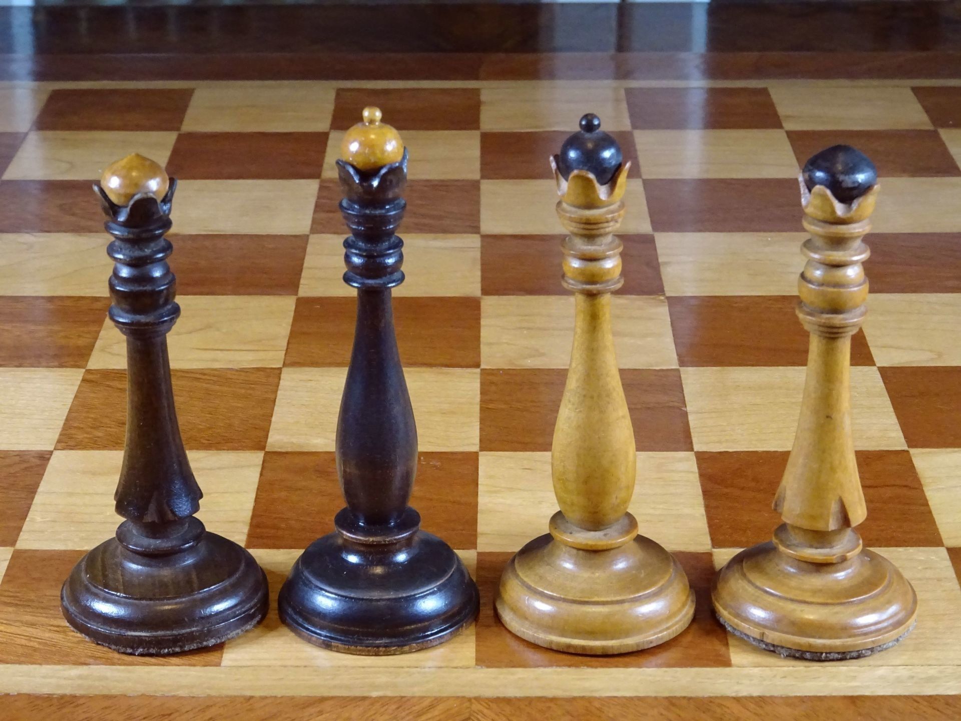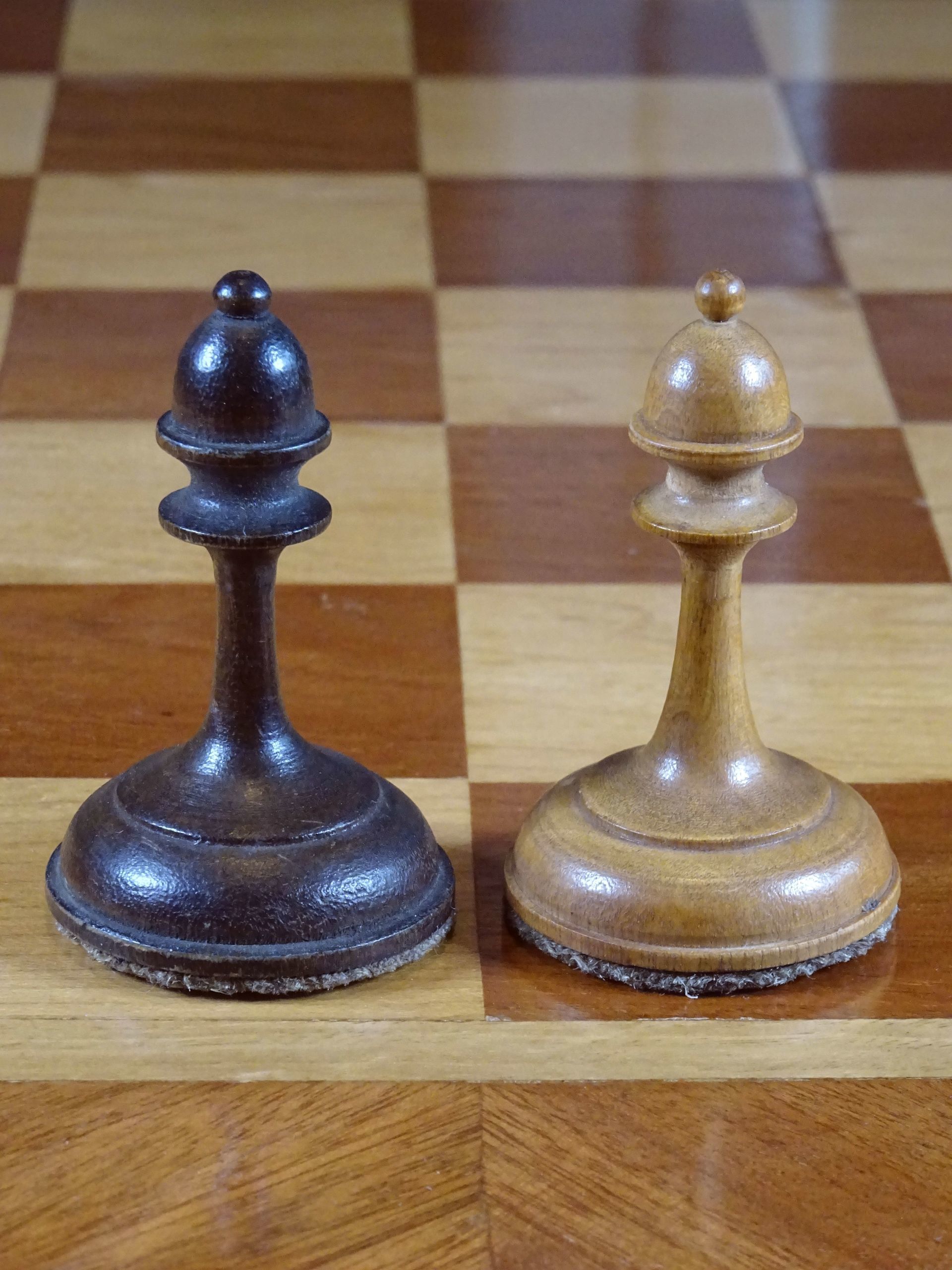 Russian chess set presumably from the late 19th or early 20th century. Pieces made of wood, one side natural with a beautiful patina gained by age, the other stained in dark brown. Despite the very slim shapes with elongated stems, the pieces are very playable due to the broad bases, which are weighted with lead. King size is 10.5 cm.